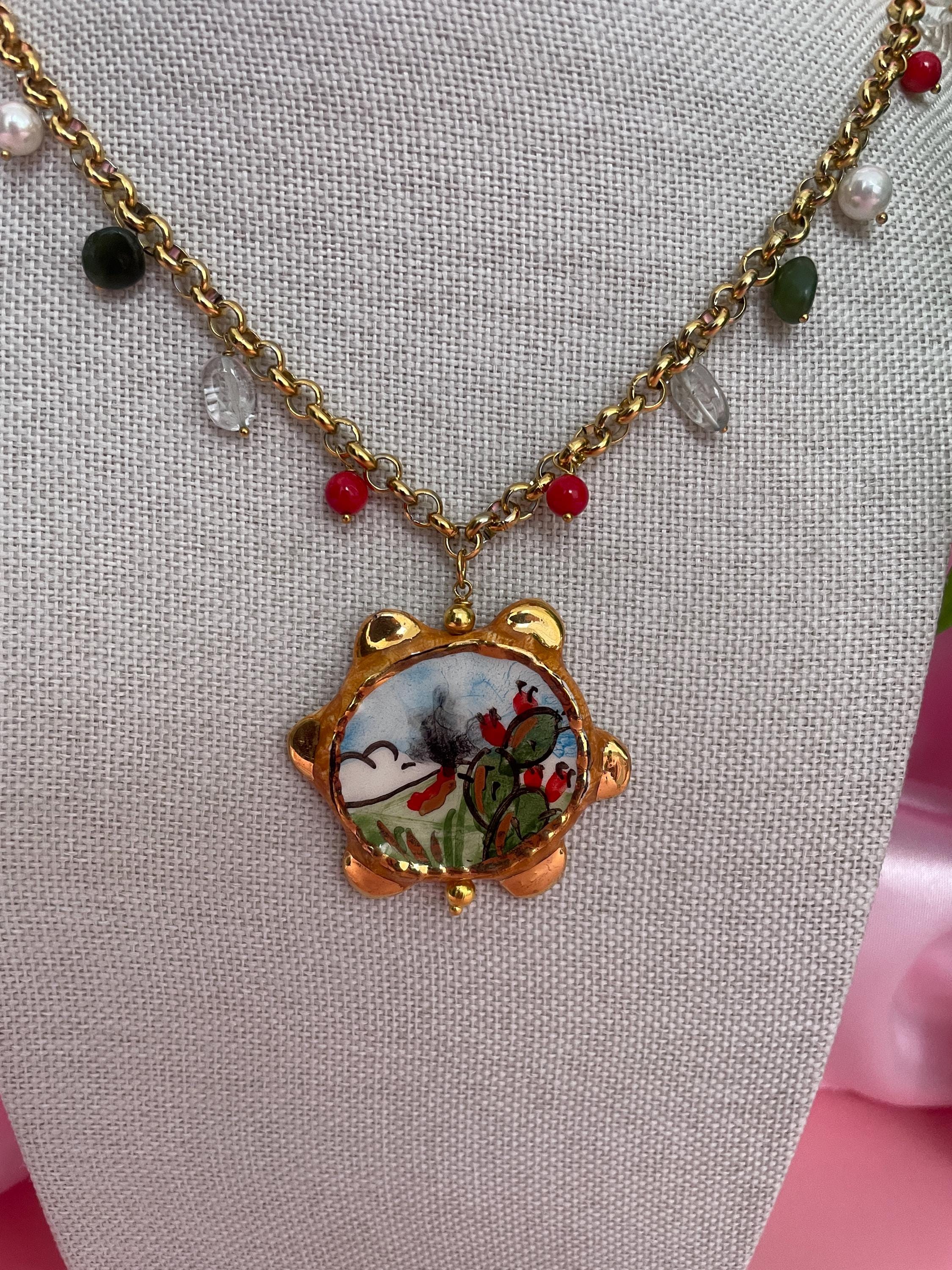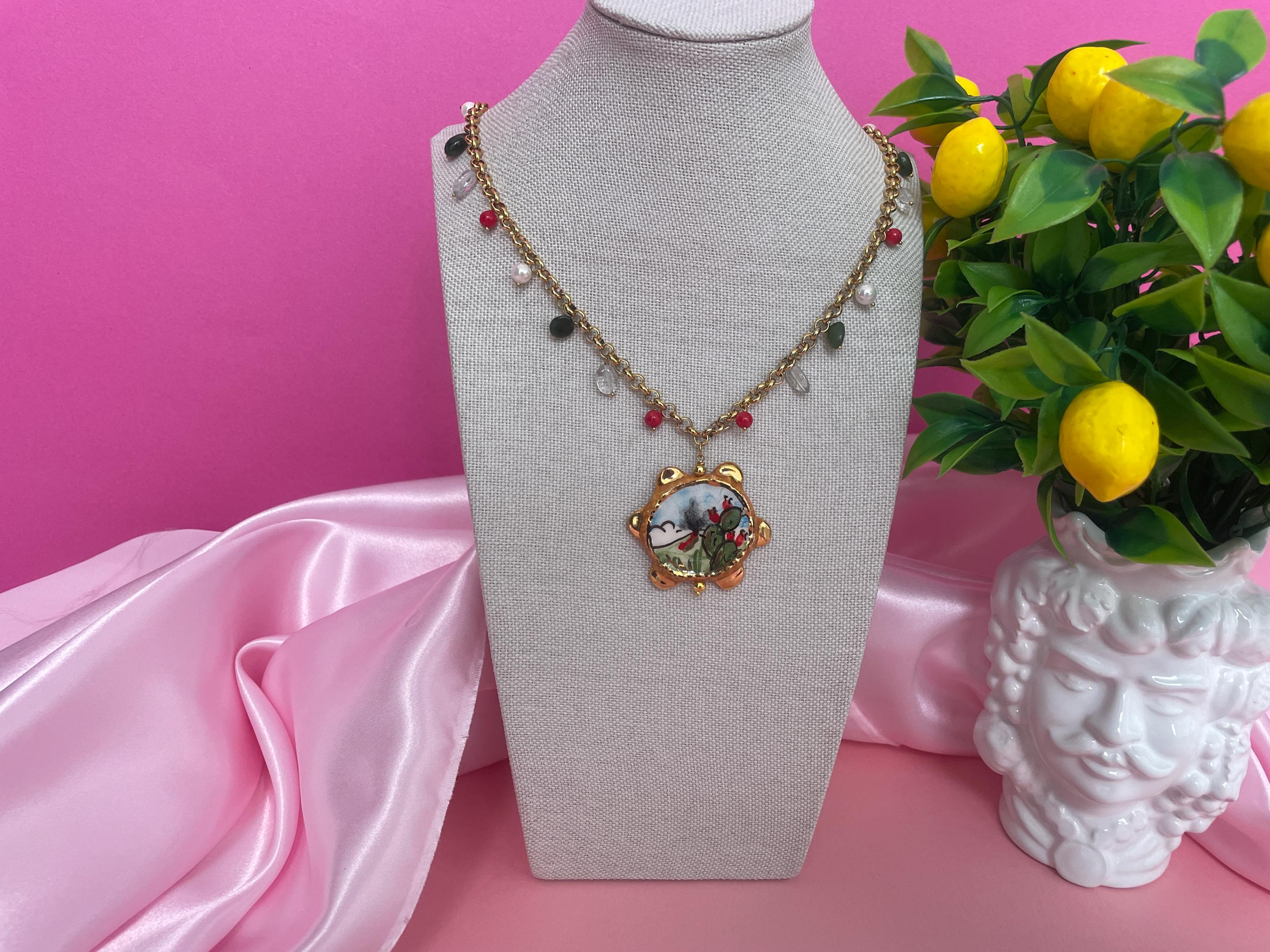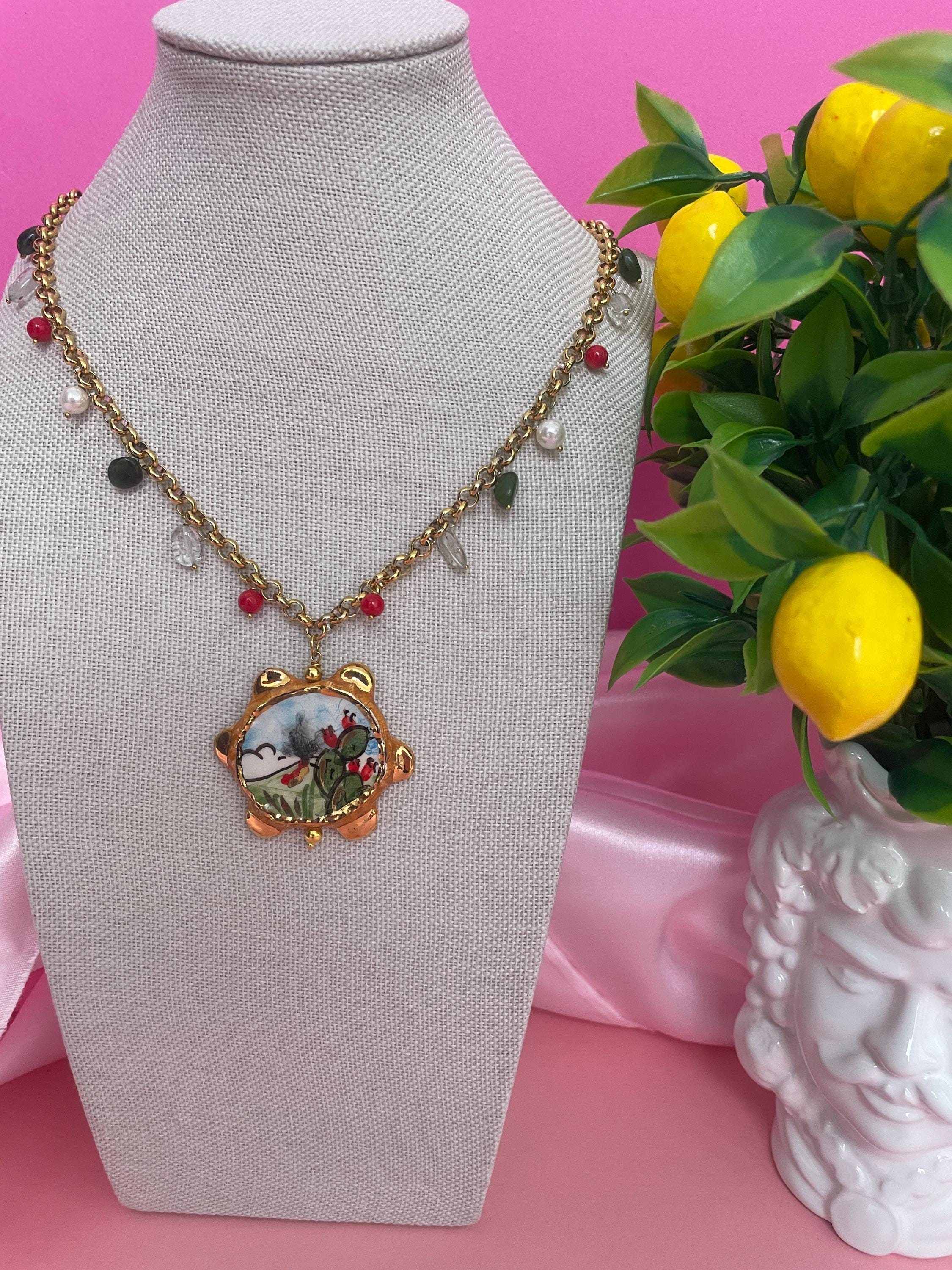 Collana siciliana girocollo realizzata con catena in acciaio inossidabile placcata oro 14k a maglia rolò, Tamburello centrale in ceramica di Caltagirone, dipinto a mano, raffigurante l’Etna e perle assortite di varie colori e forme.