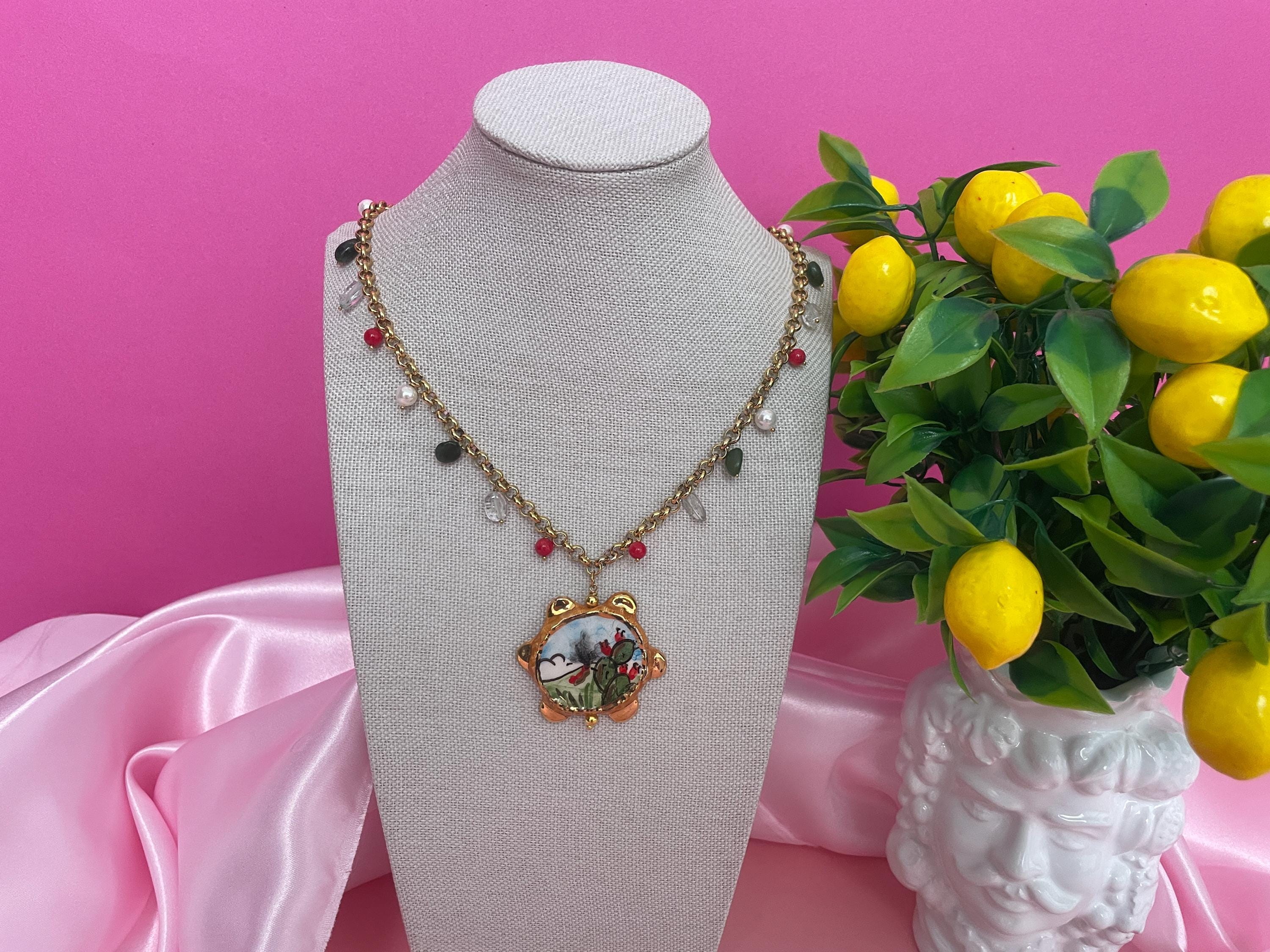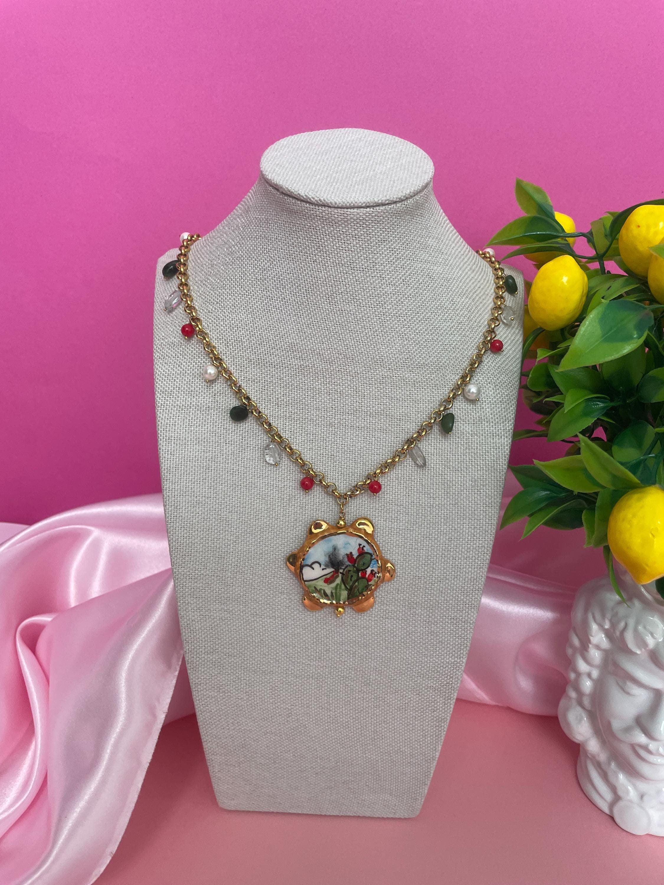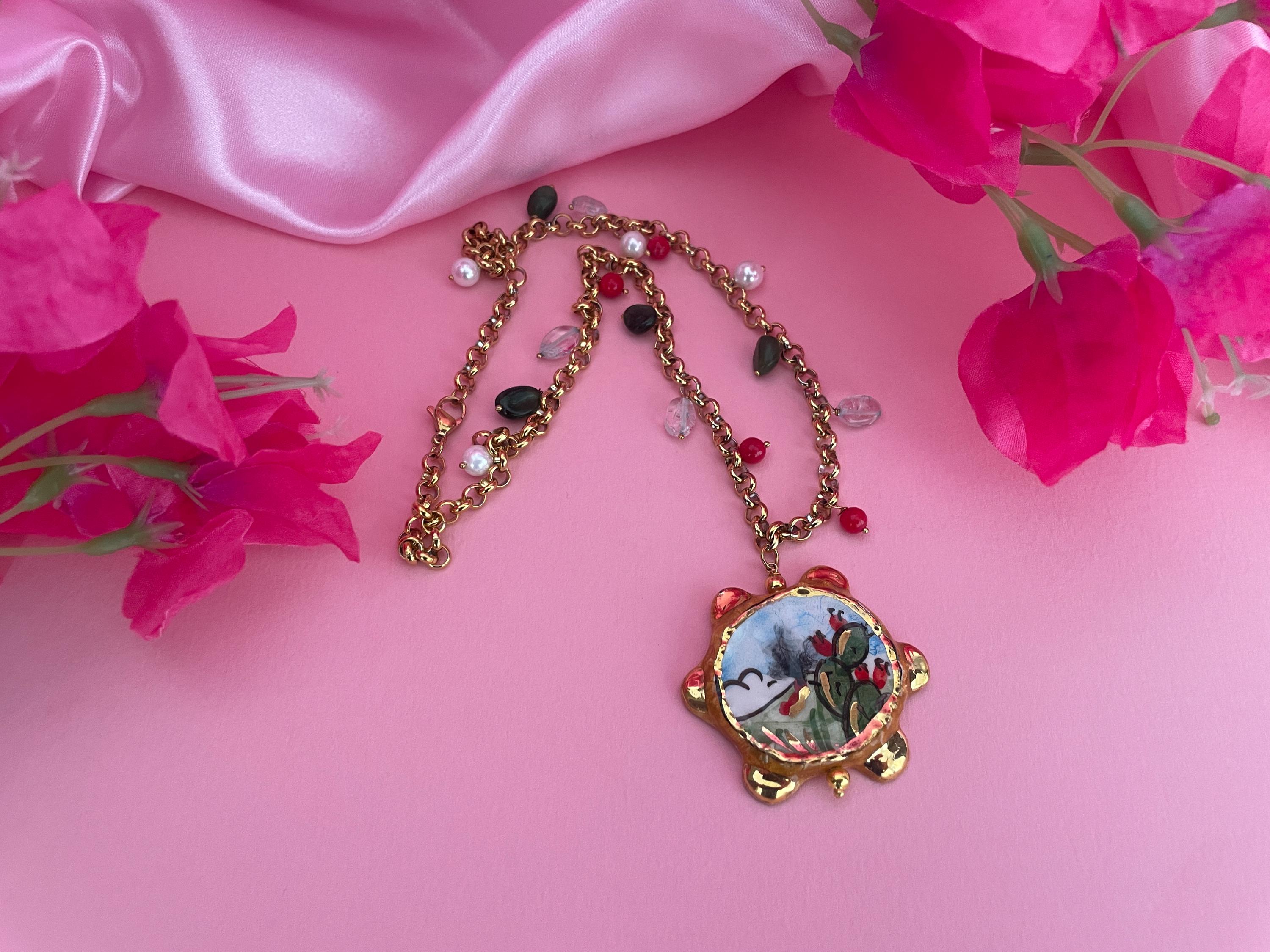 Collana siciliana girocollo realizzata con catena in acciaio inossidabile placcata oro 14k a maglia rolò, Tamburello centrale in ceramica di Caltagirone, dipinto a mano, raffigurante l’Etna e perle assortite di varie colori e forme.