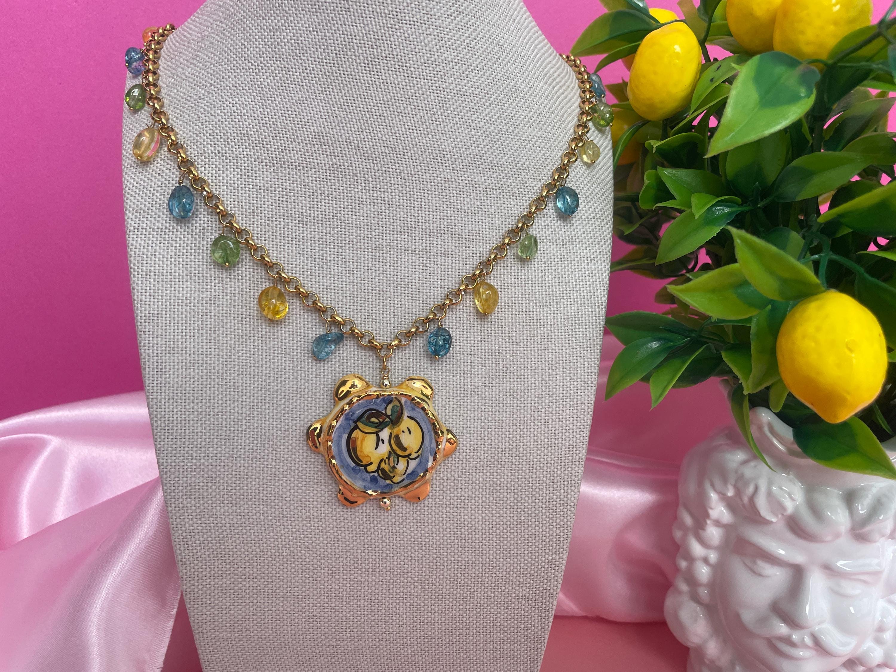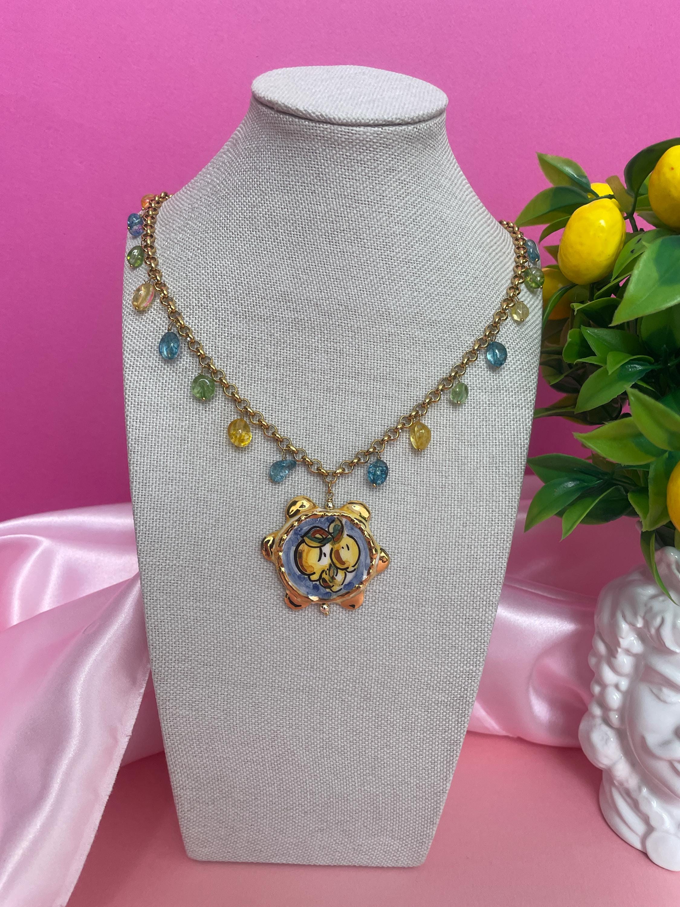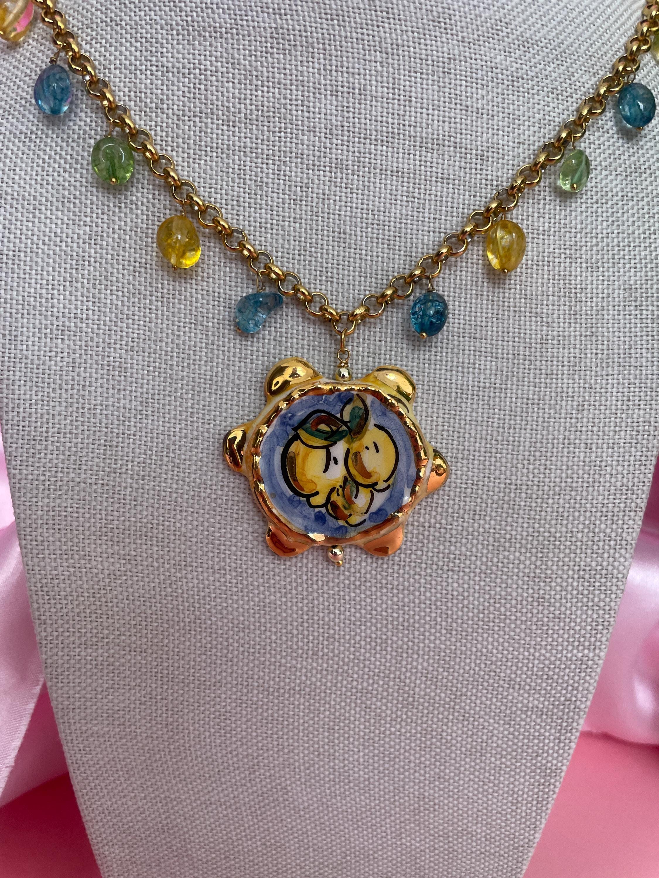 Collana siciliana girocollo realizzata con catena in acciaio inossidabile placcata oro 14k a maglia rolò, Tamburello centrale in ceramica di Caltagirone, dipinto a mano, raffigurante Limoni e sassi burattati di Tormalina di vari colori.
