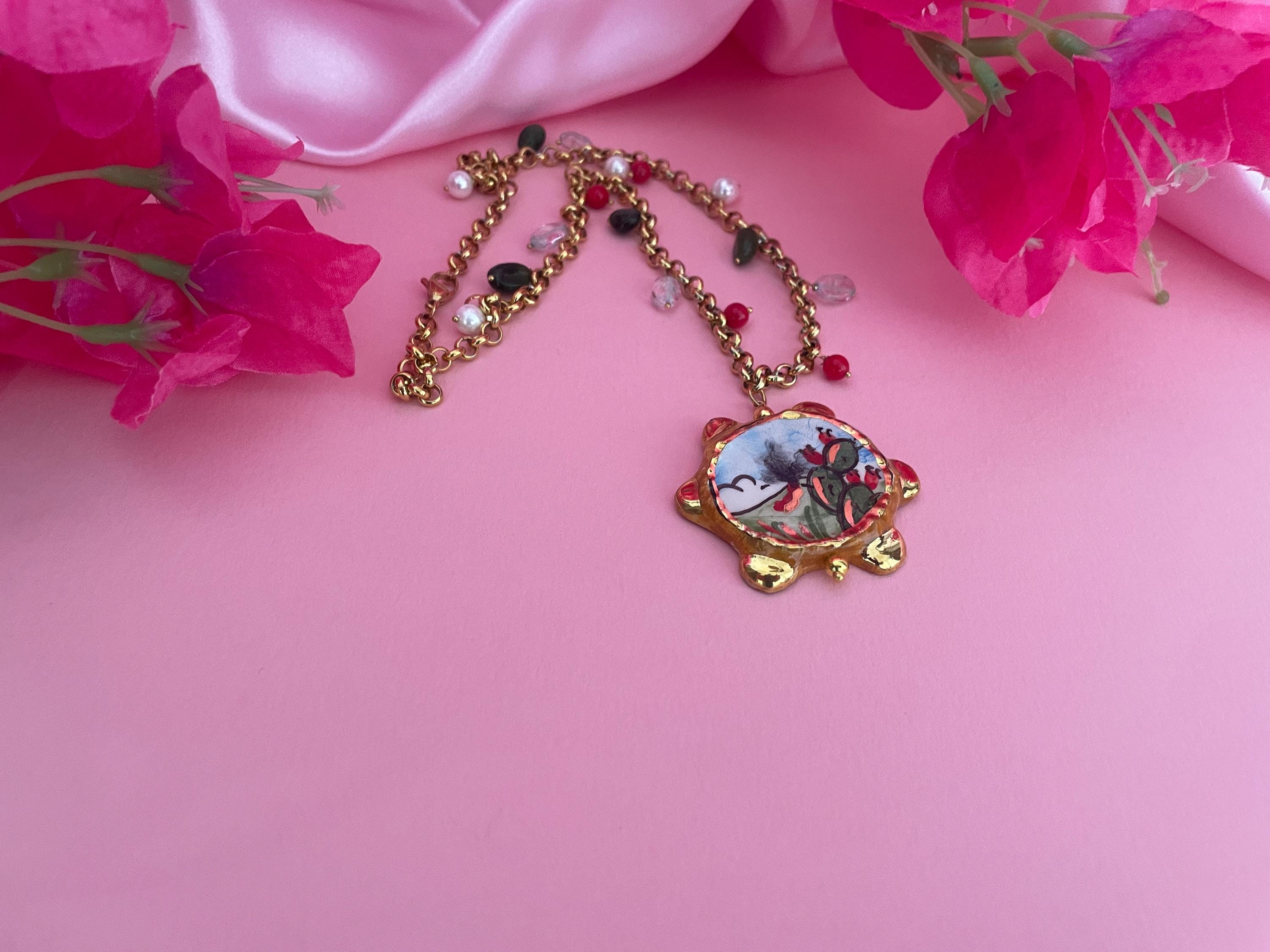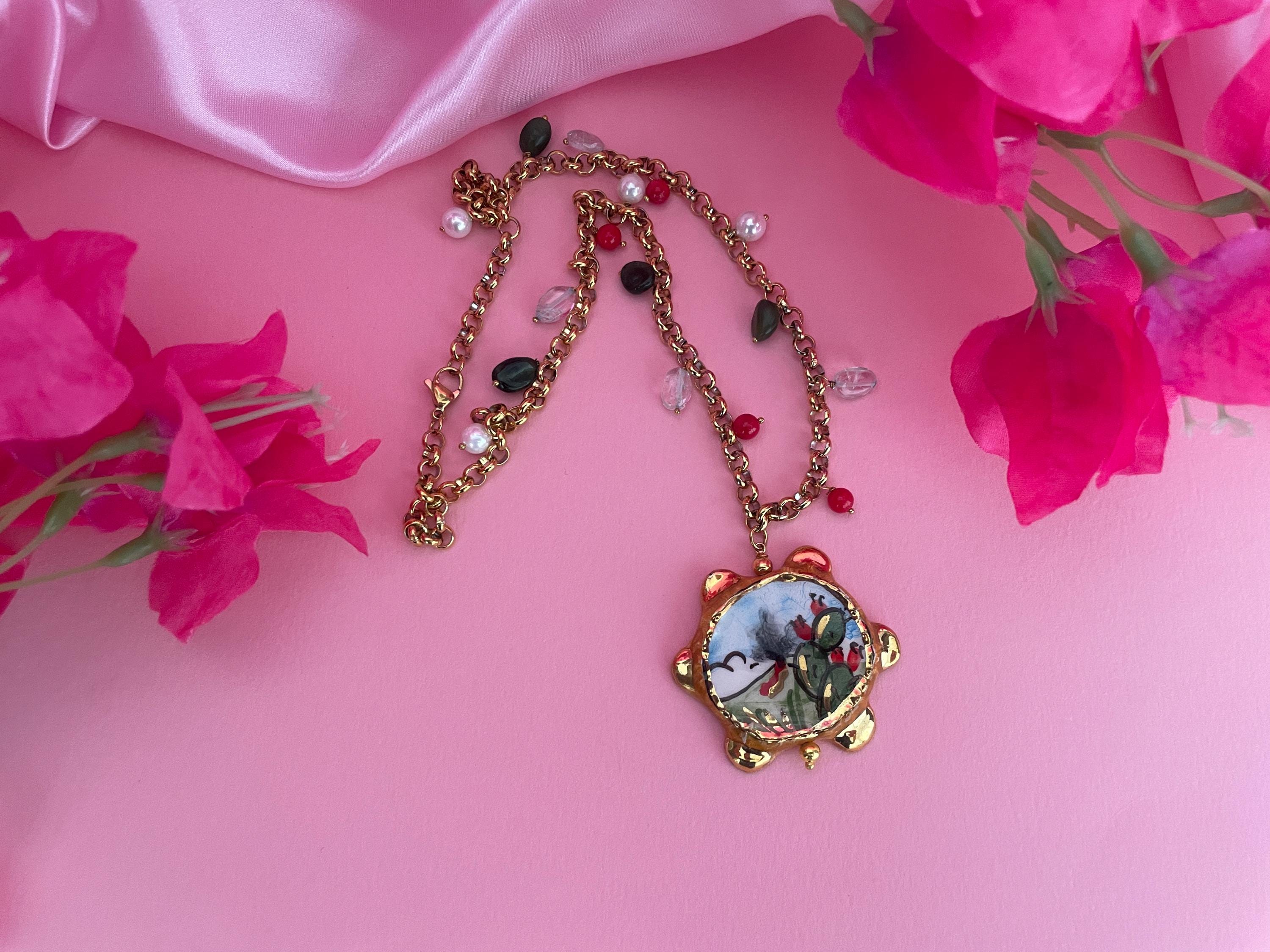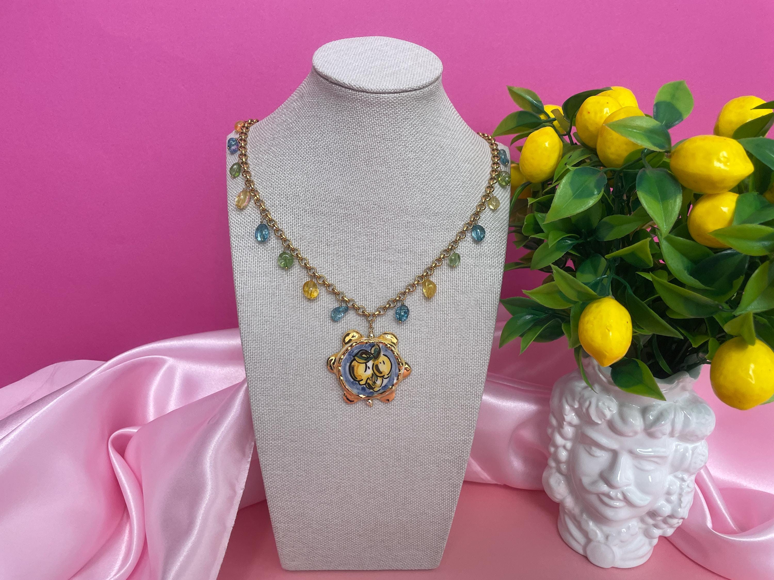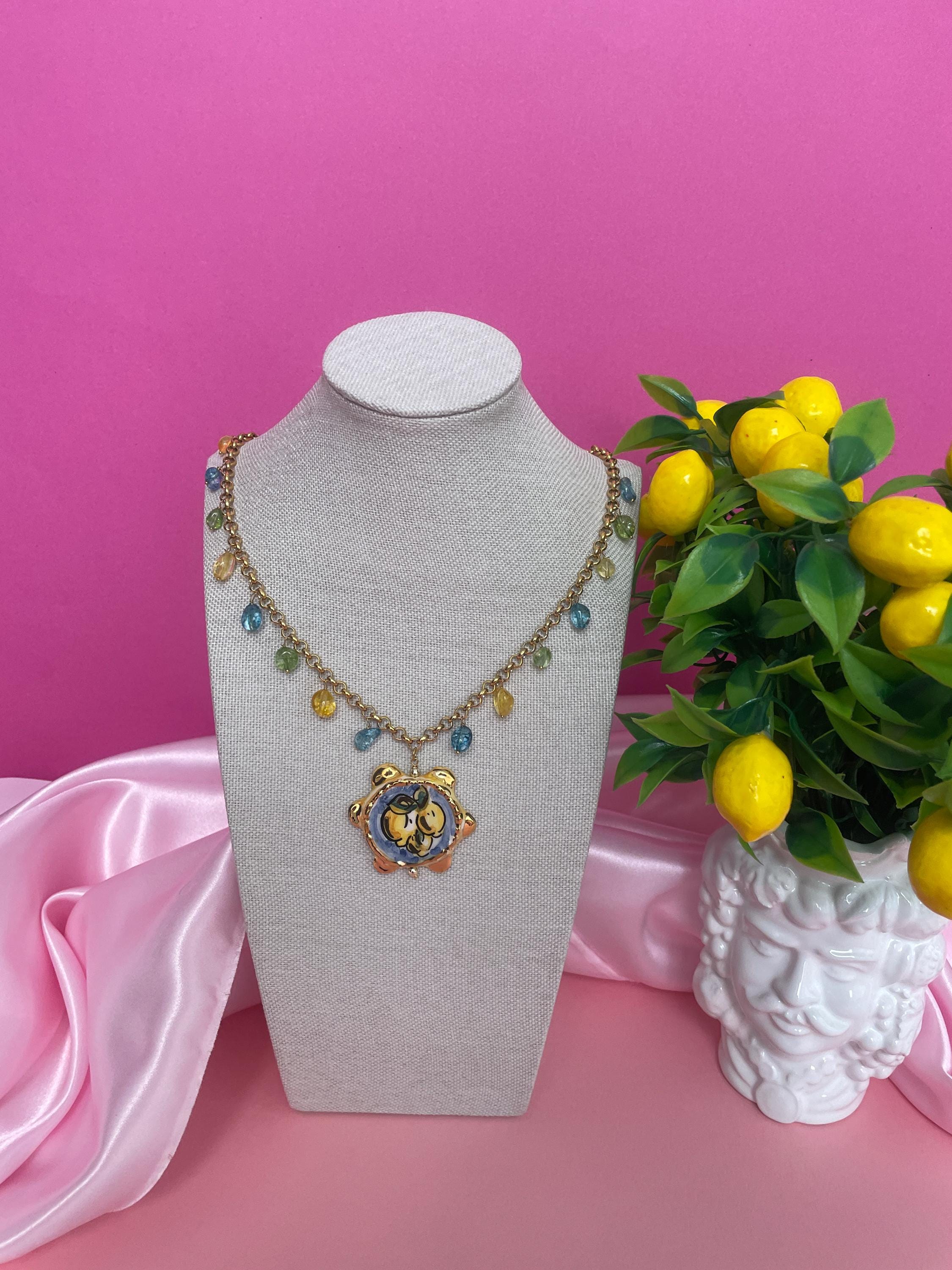 Collana siciliana girocollo realizzata con catena in acciaio inossidabile placcata oro 14k a maglia rolò, Tamburello centrale in ceramica di Caltagirone, dipinto a mano, raffigurante Limoni e sassi burattati di Tormalina di vari colori.