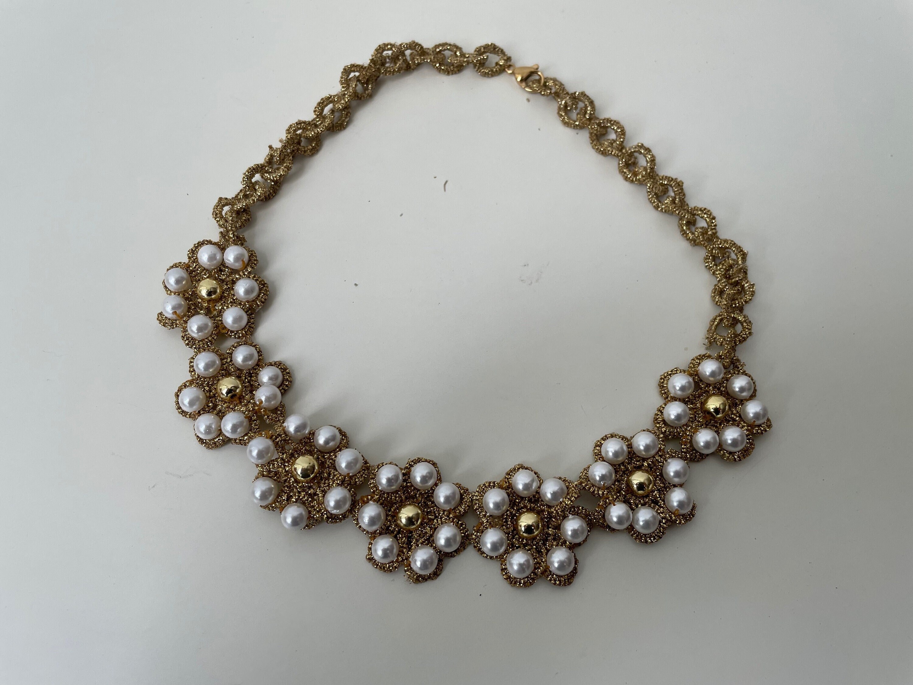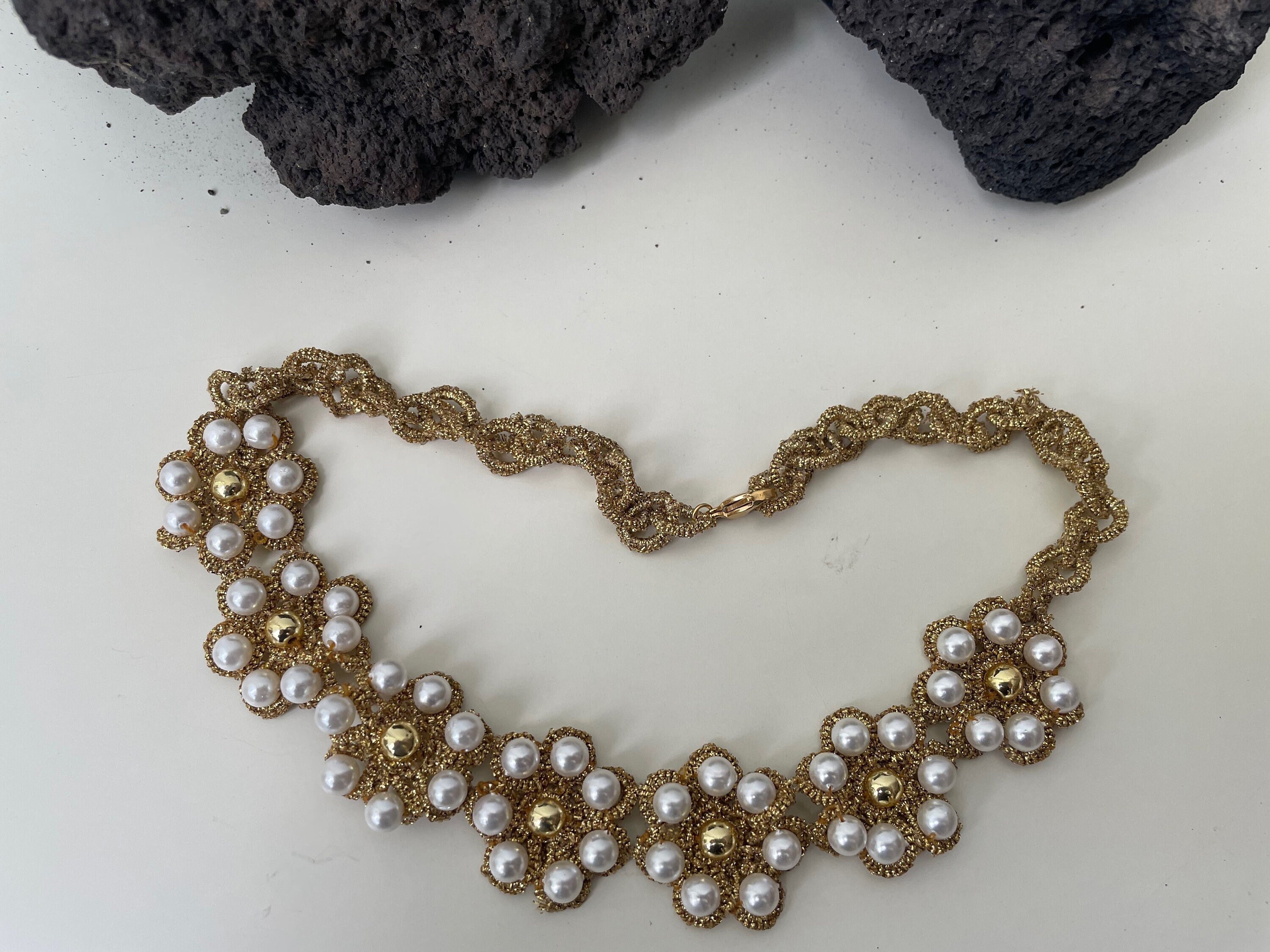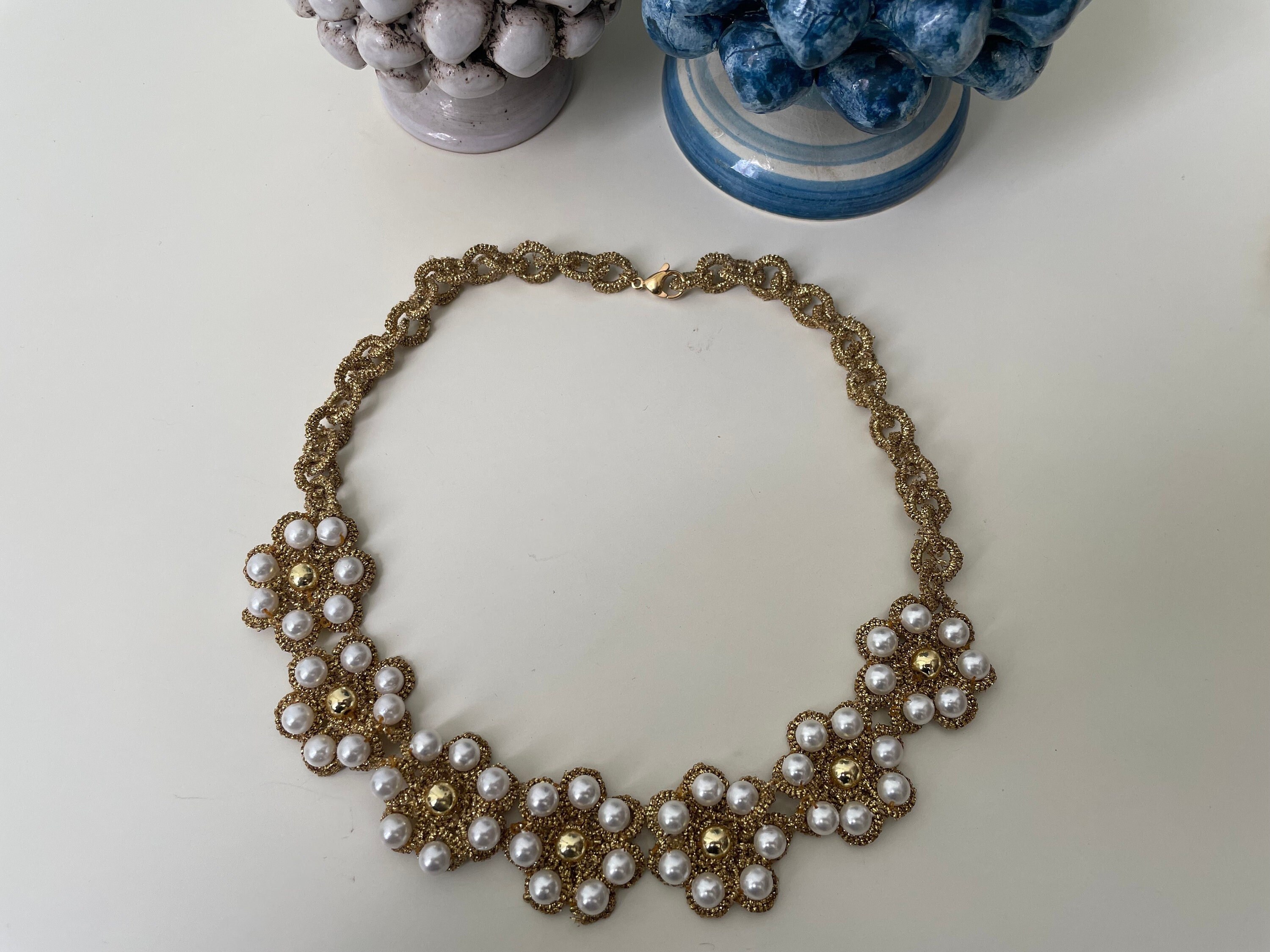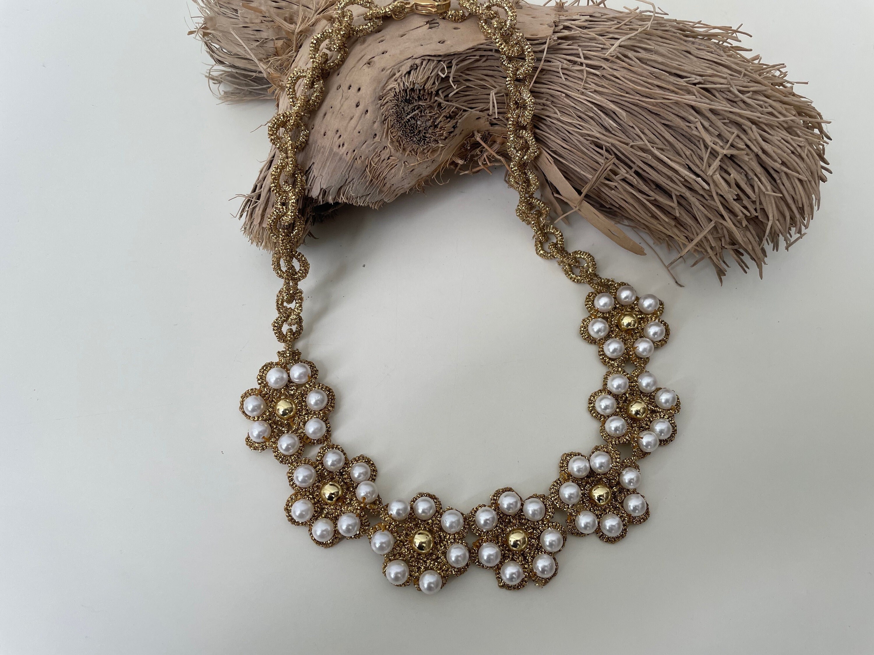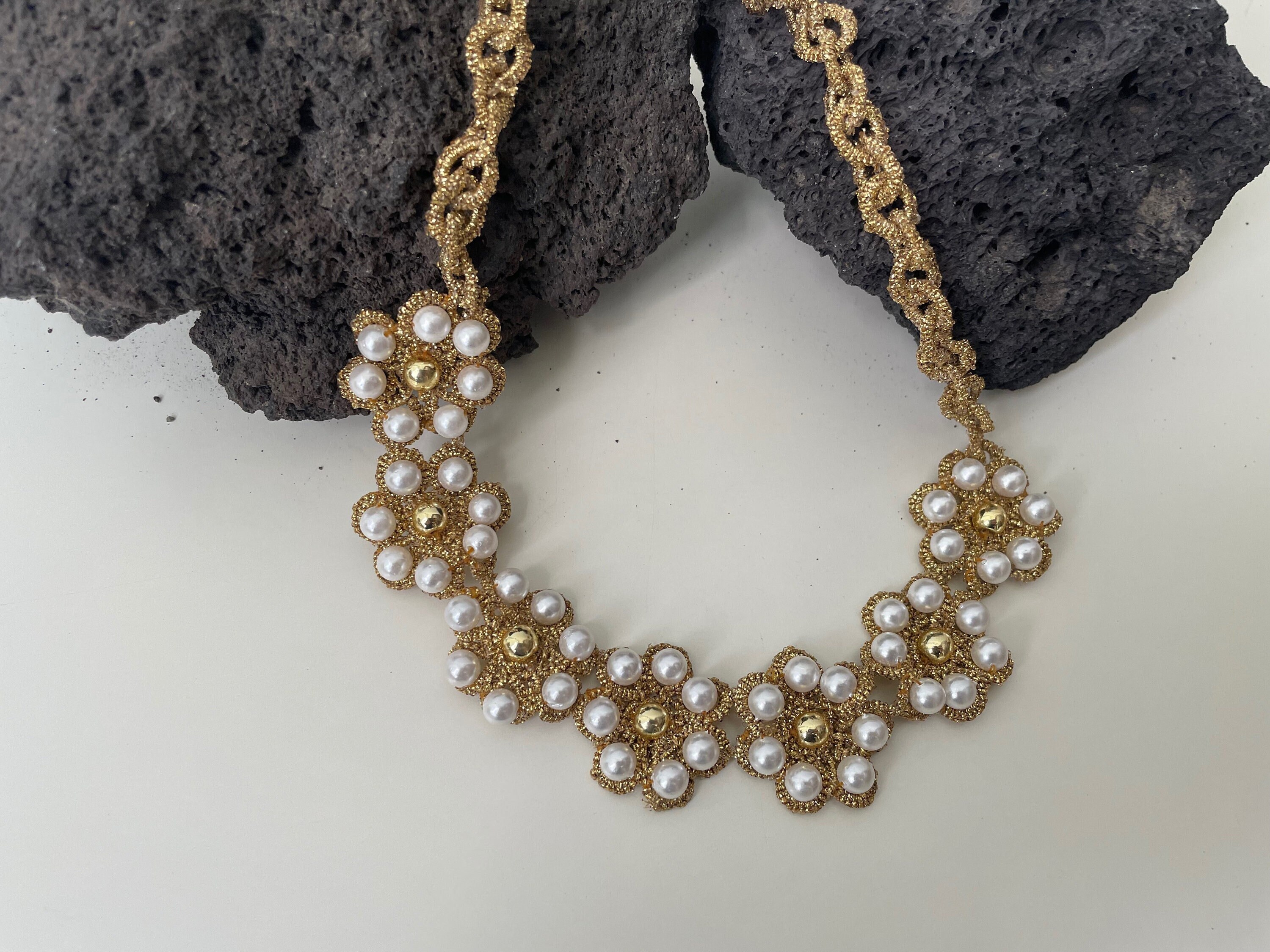 Realizzata interamente in pizzo chiacchierino dorato costituita da maglie rotonde e fiori impreziositi da perle Maiorca bianche e perle centrali di ematite dorata.