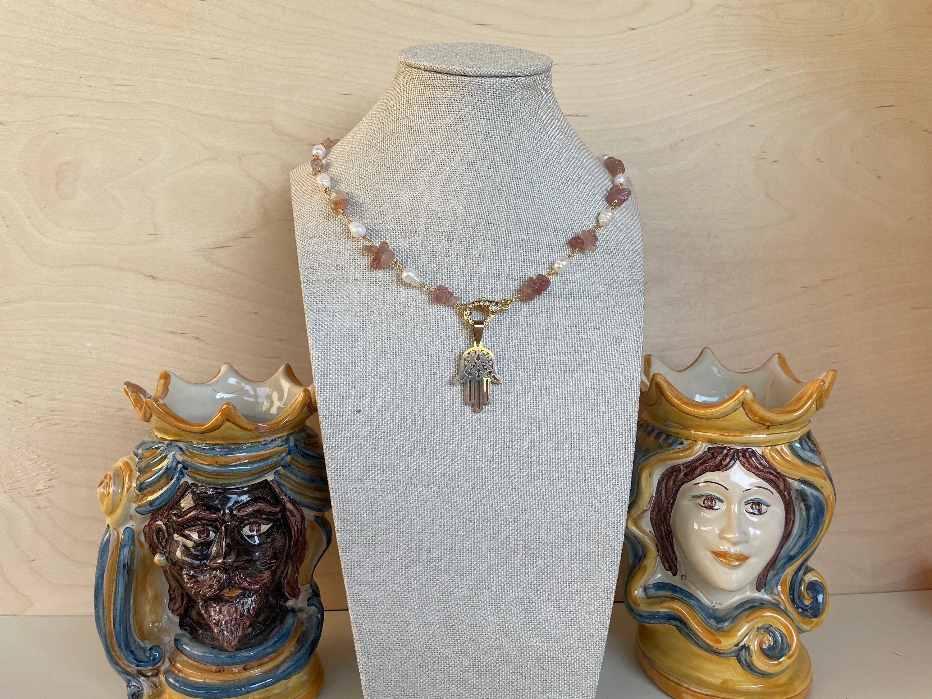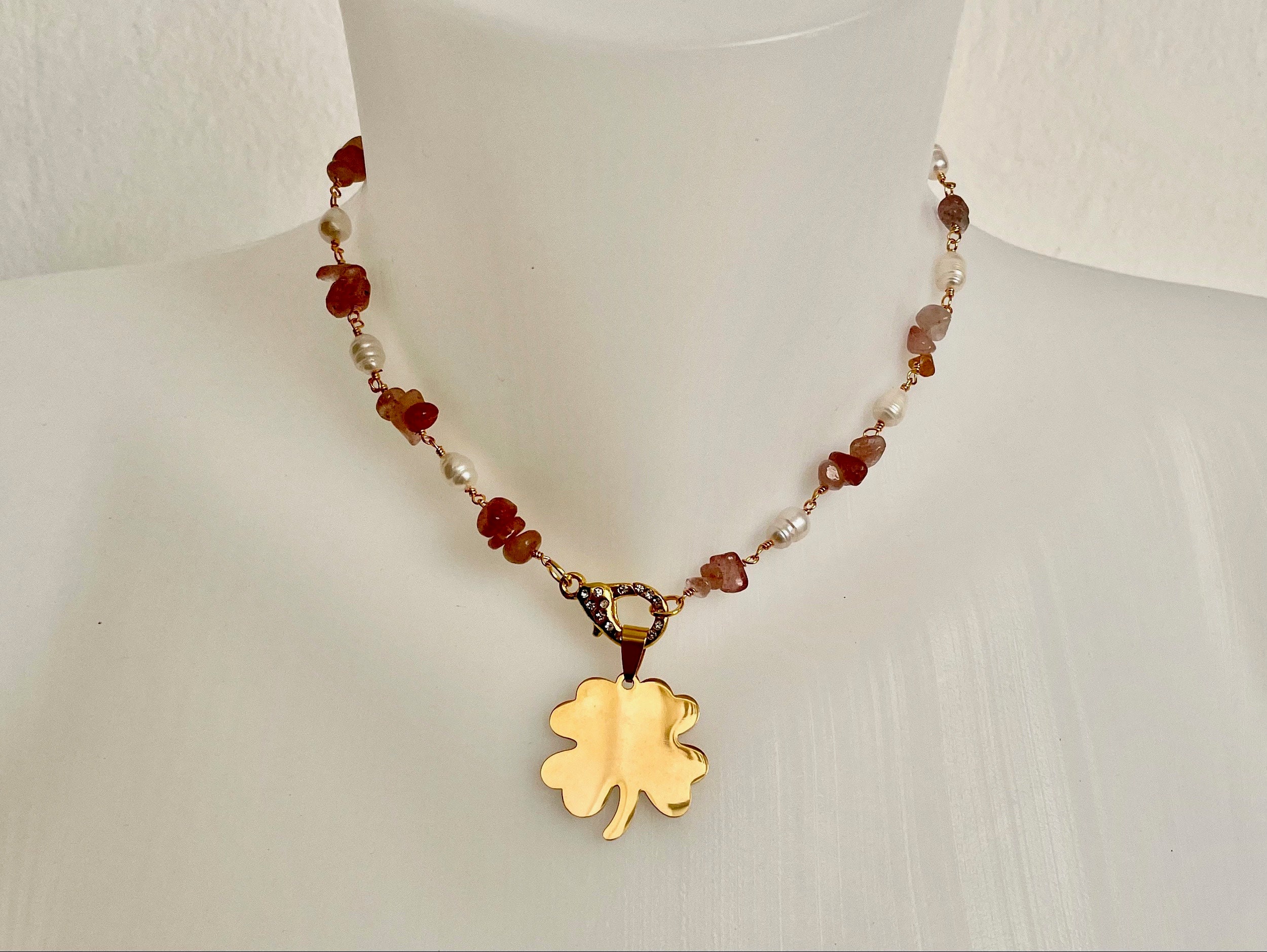 Collana girocollo, Collana con catena Rosario, collana perle di fiume e Corniola, chiusura gioiello di acciaio inox, oro e zirconi.
