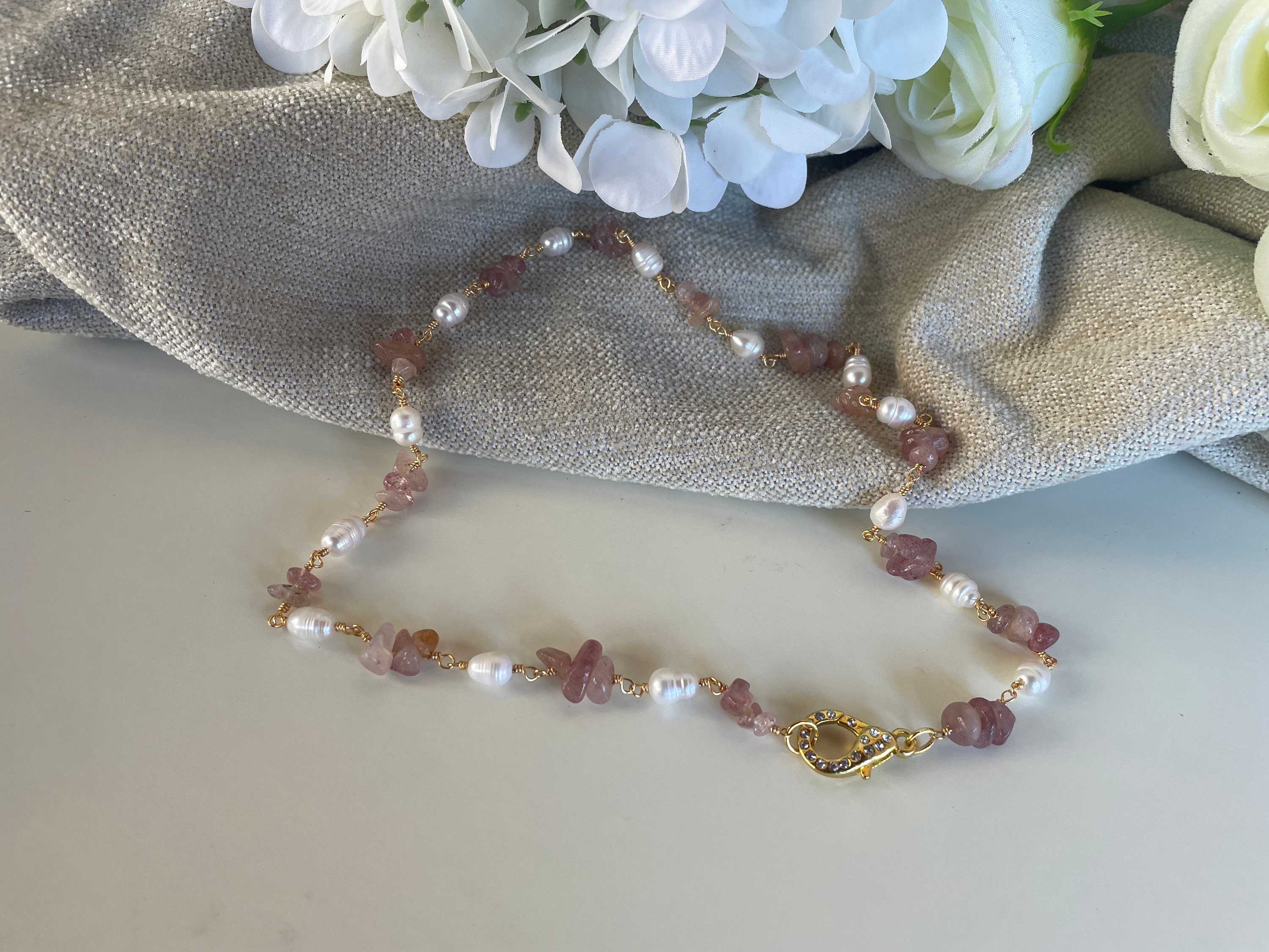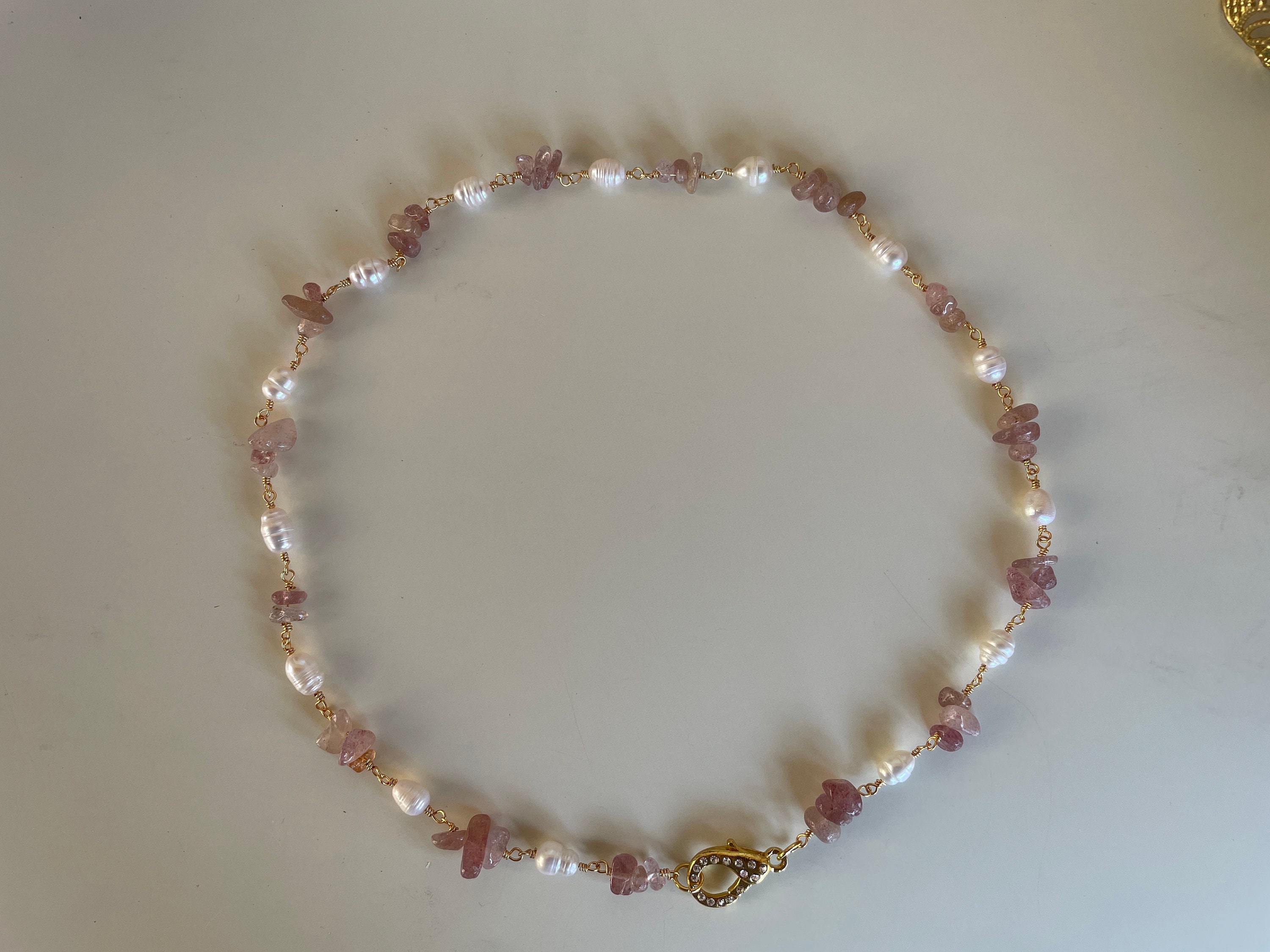 Collana girocollo semplice ma di buon gusto realizzata con perle di fiume e chips di Corniola rosa, legati da un filo di ottone dorato.