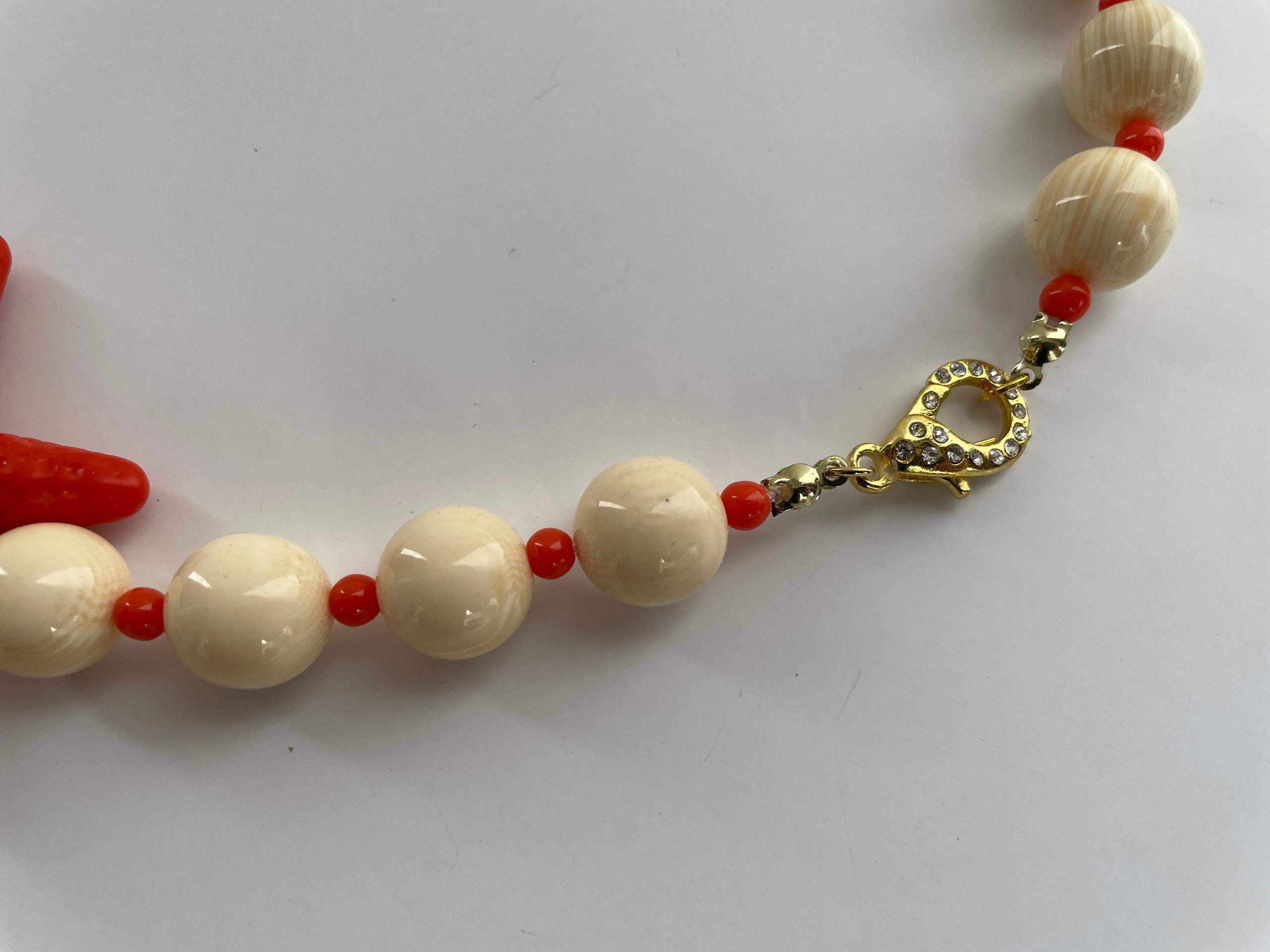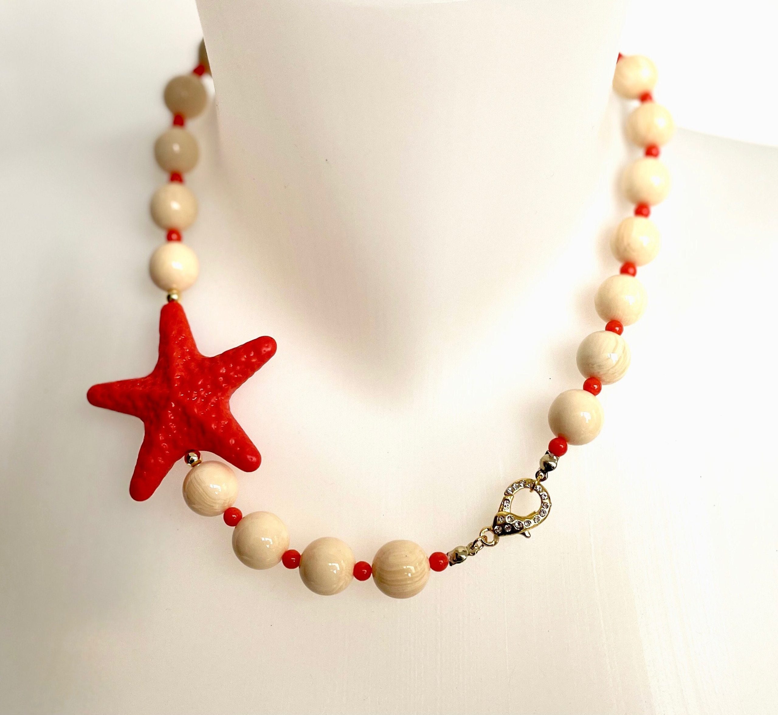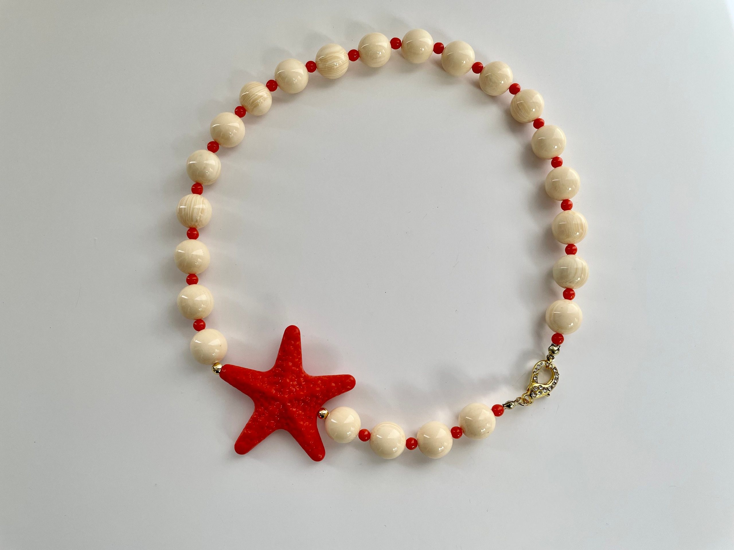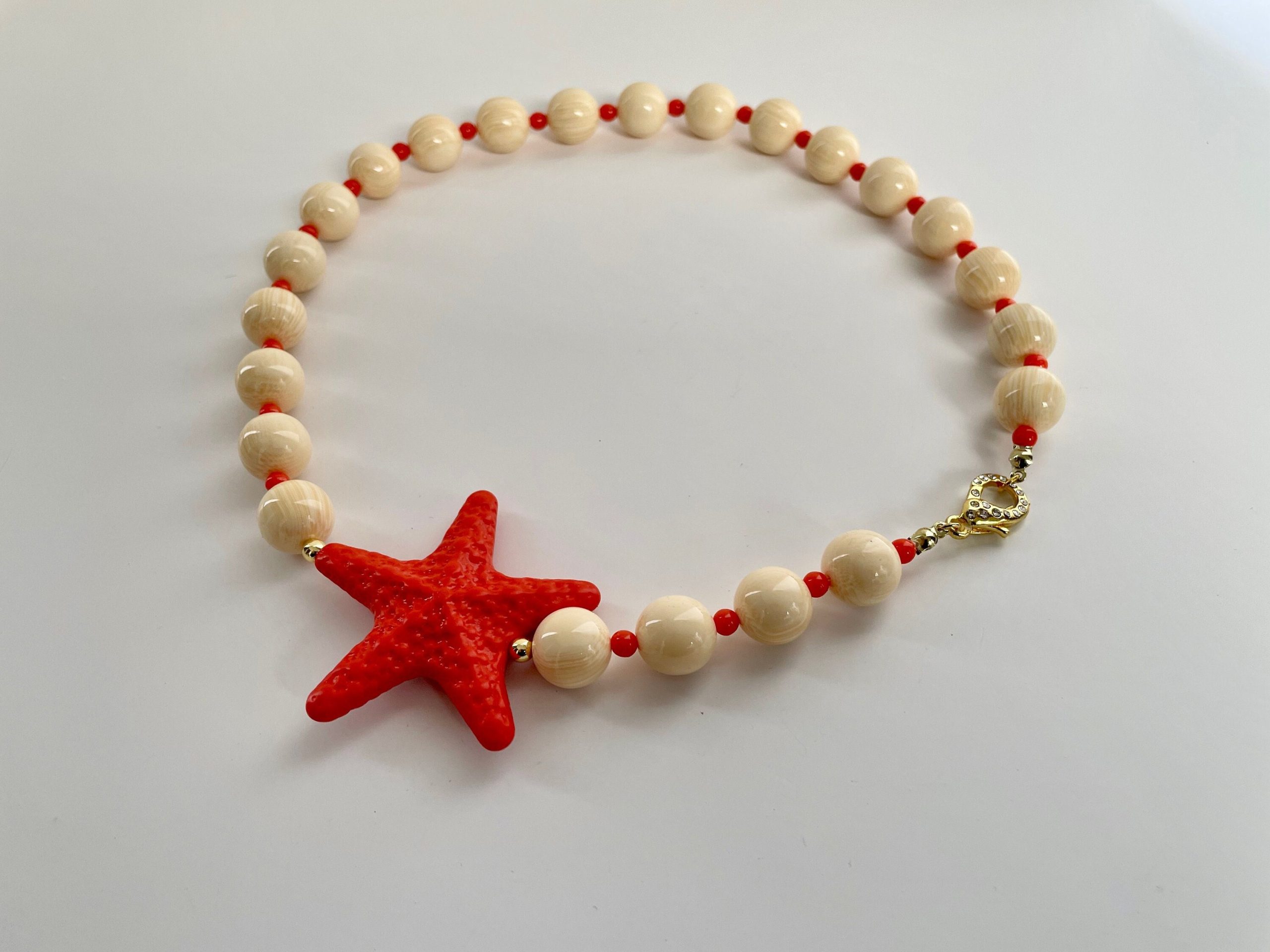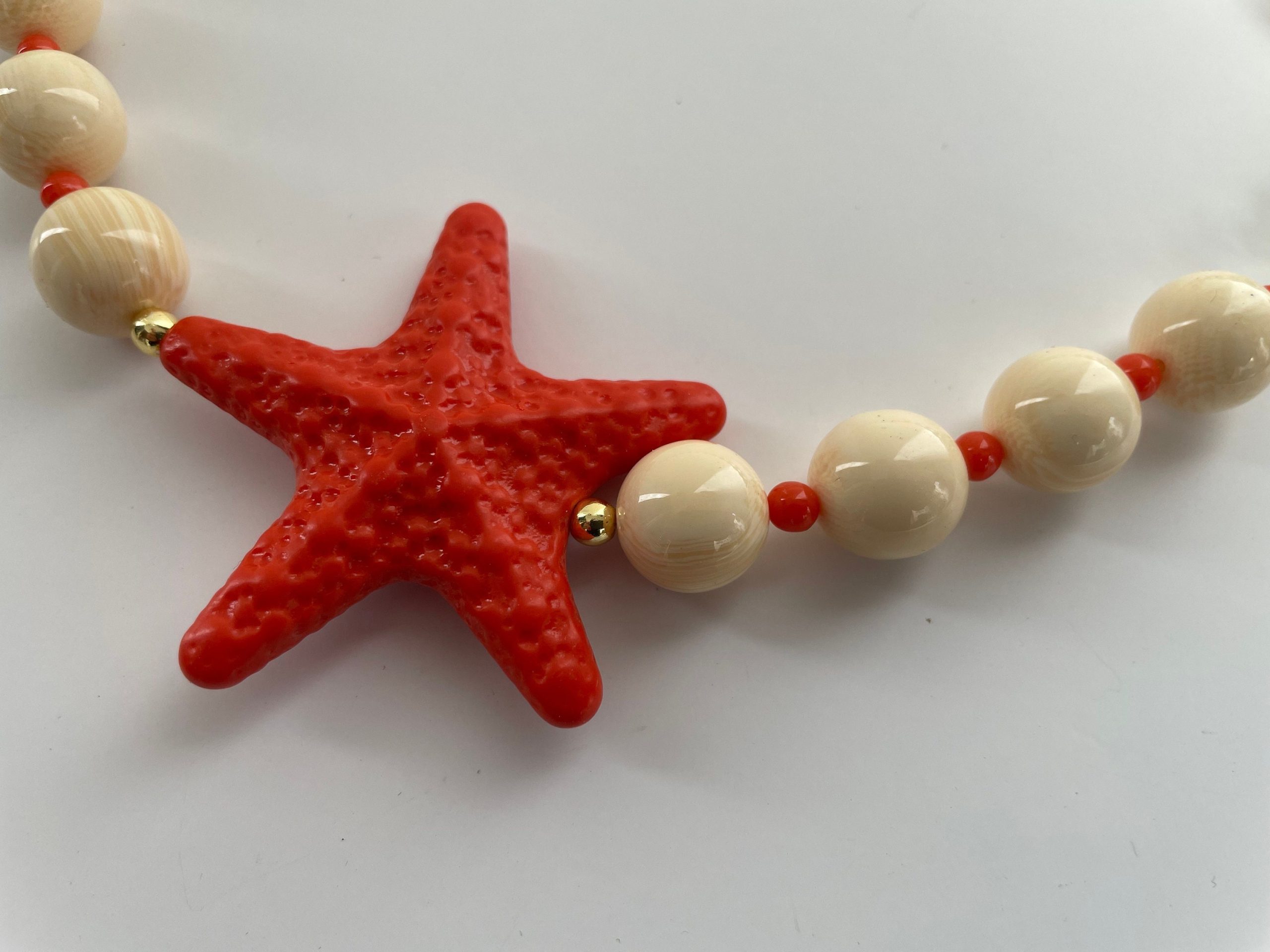 Belle perle grosse di resina di prima qualità italiana colore osso e piccole perle di resina arancione si combinano con un grande connettore a forma di stella marina in resina arancione.