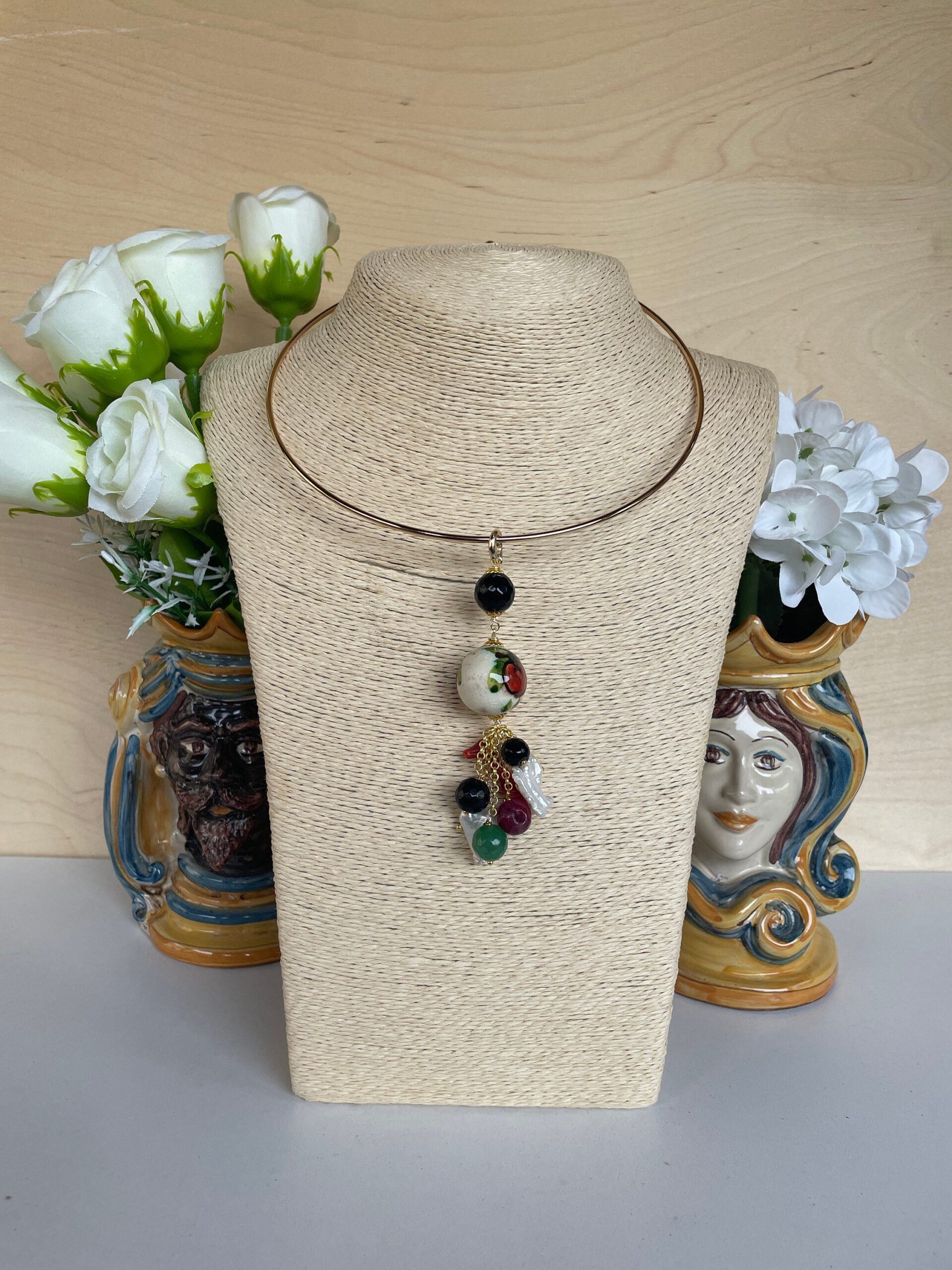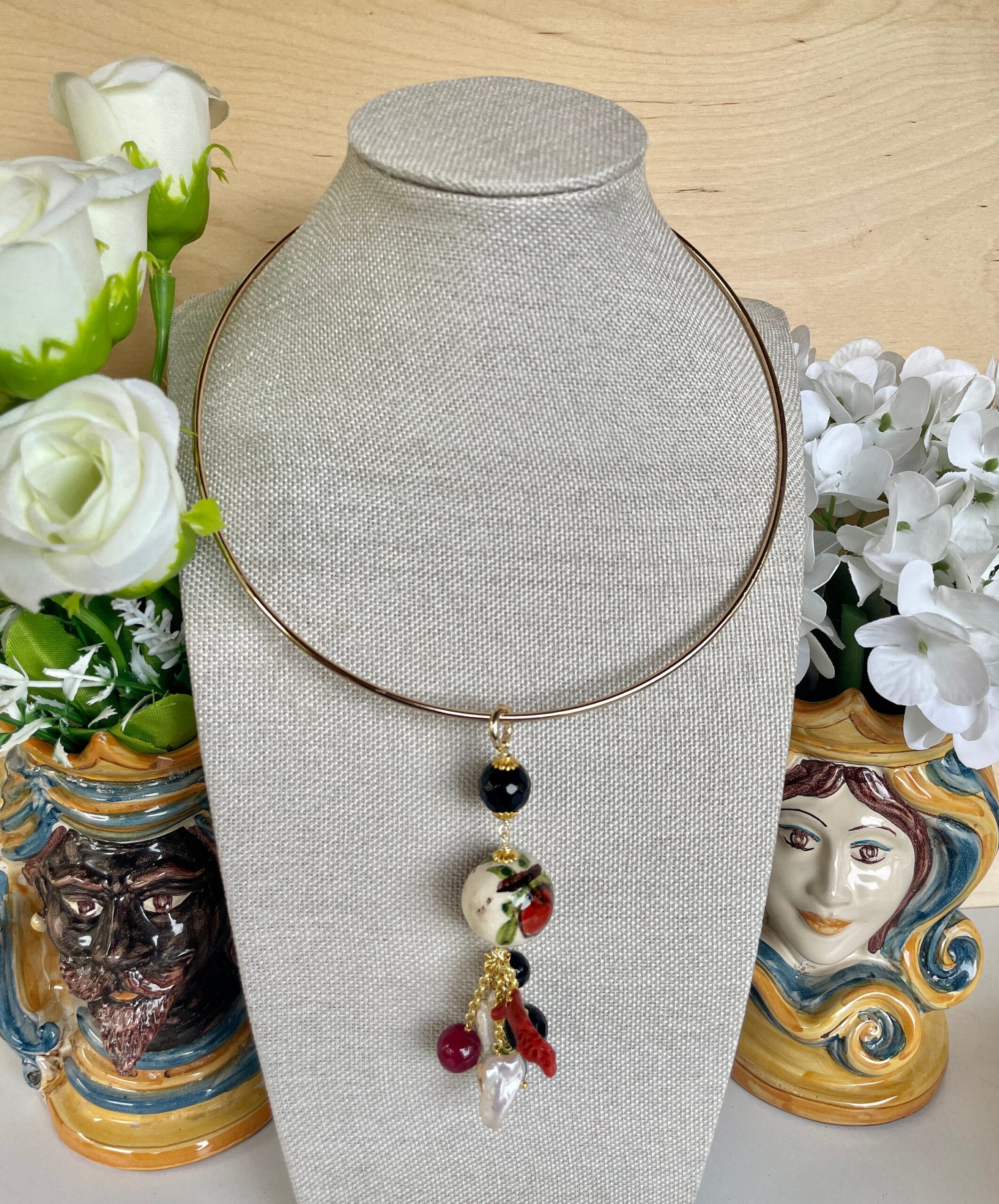 Collana girocollo rigida, collana cerchio a collare, collana con pendente palla di Ceramica di Caltagirone e grappolo perle e pietre dure.