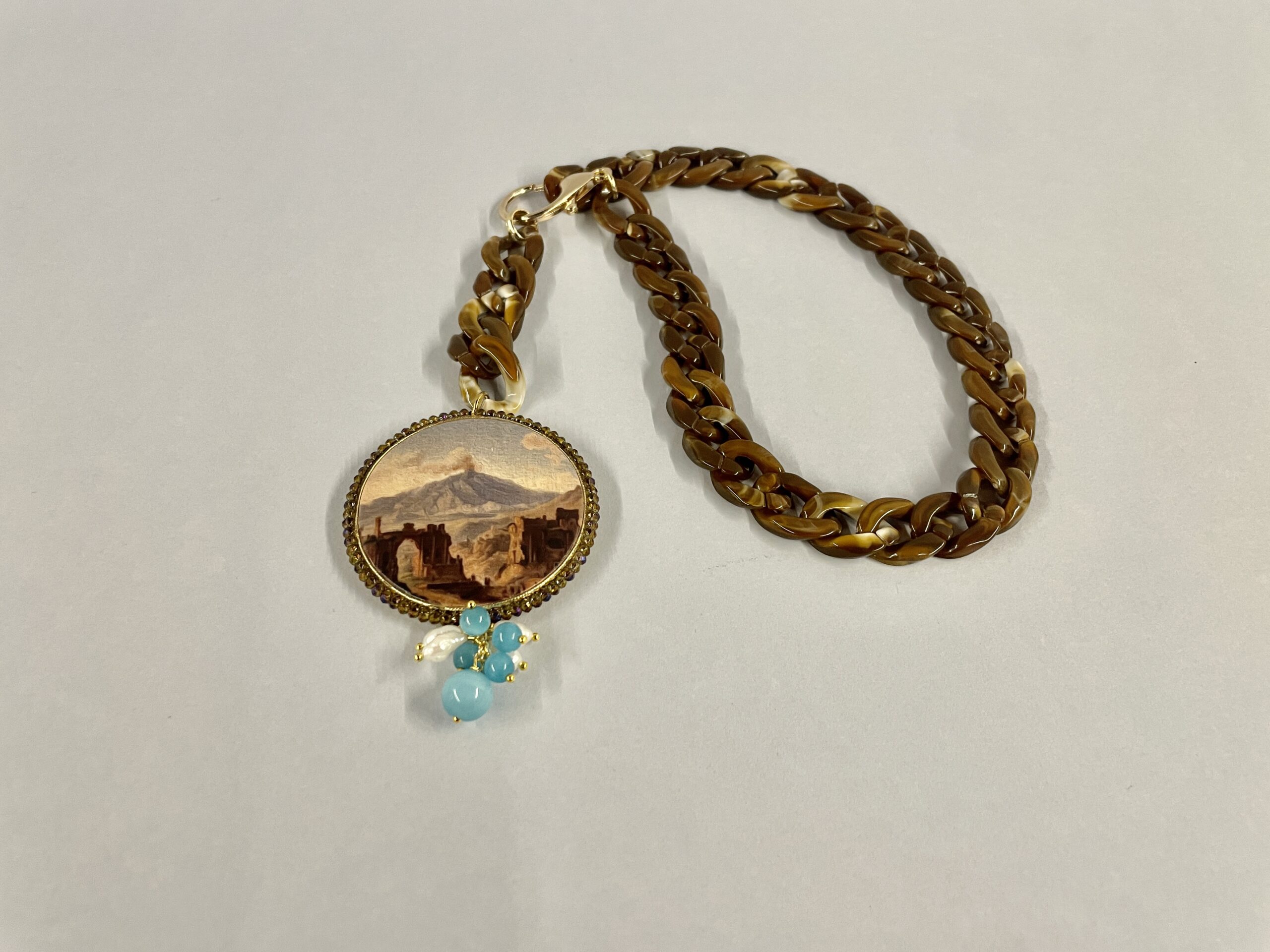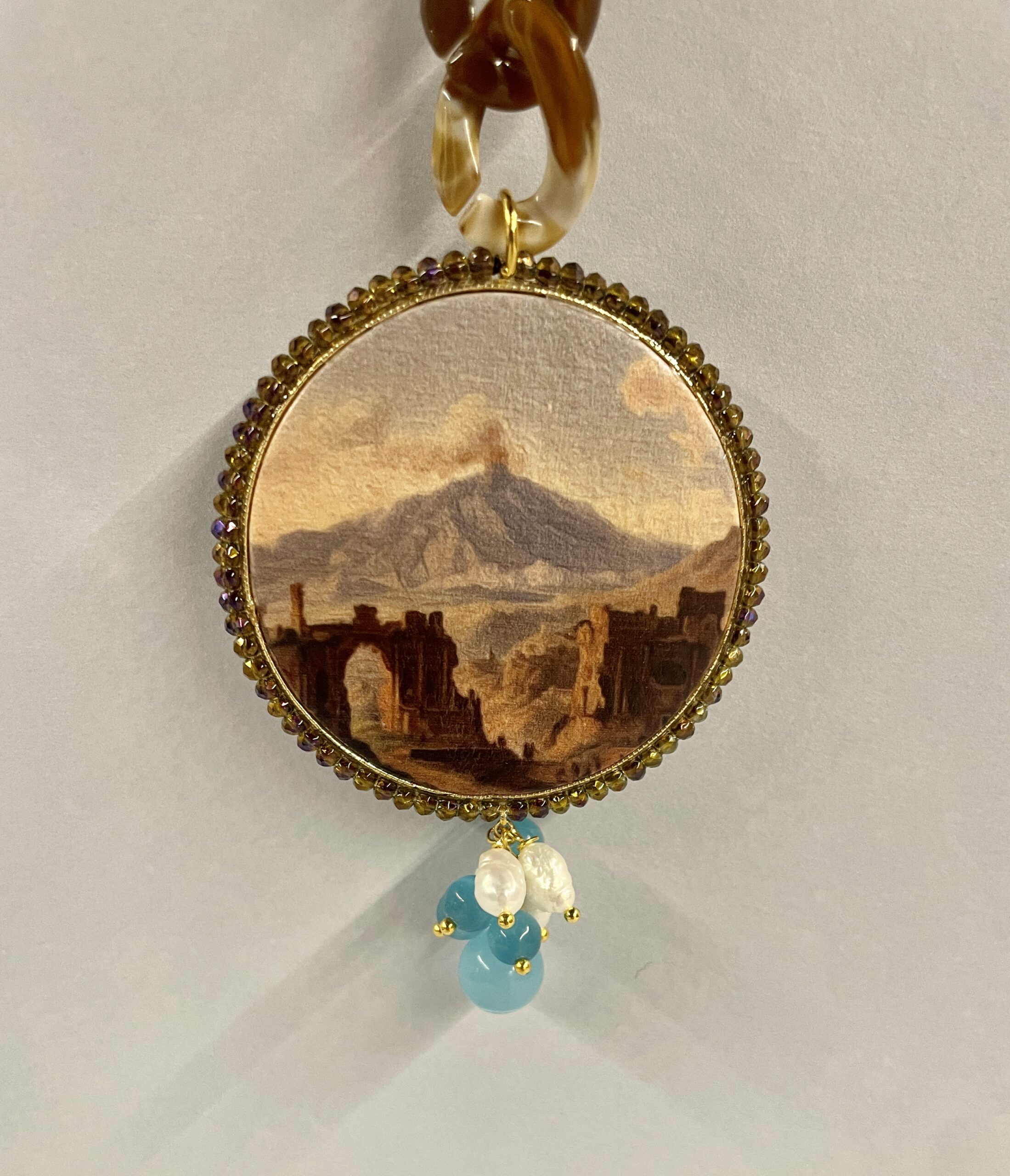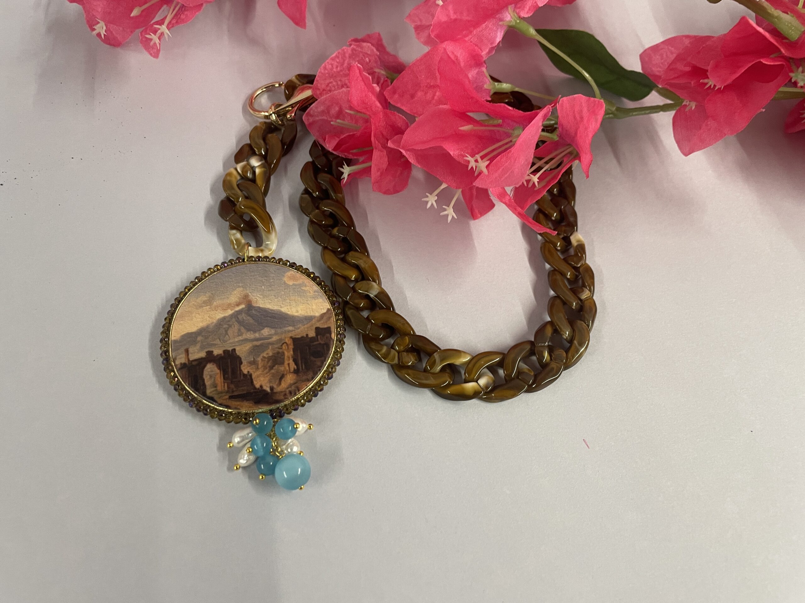 Il ciondolo è realizzato in legno e stampato su entrambi i lati con un’immagine effetto acquarello, risultando elegante e curato in ogni dettaglio. La cornice di microcristalli valorizza l’immagine centrale, mentre il grappolo di perle dona movimento e luminosità; inoltre, le perle di fiume si combinano armoniosamente con le perle di occhio di gatto azzurre, creando un contrasto delicato ma distintivo. Grazie alla sua lunghezza girocollo, questa collana incornicia il viso e completa perfettamente outfit sia casual che eleganti; infine, la chiusura grande a moschettone in ottone aggiunge un dettaglio funzionale e decorativo.