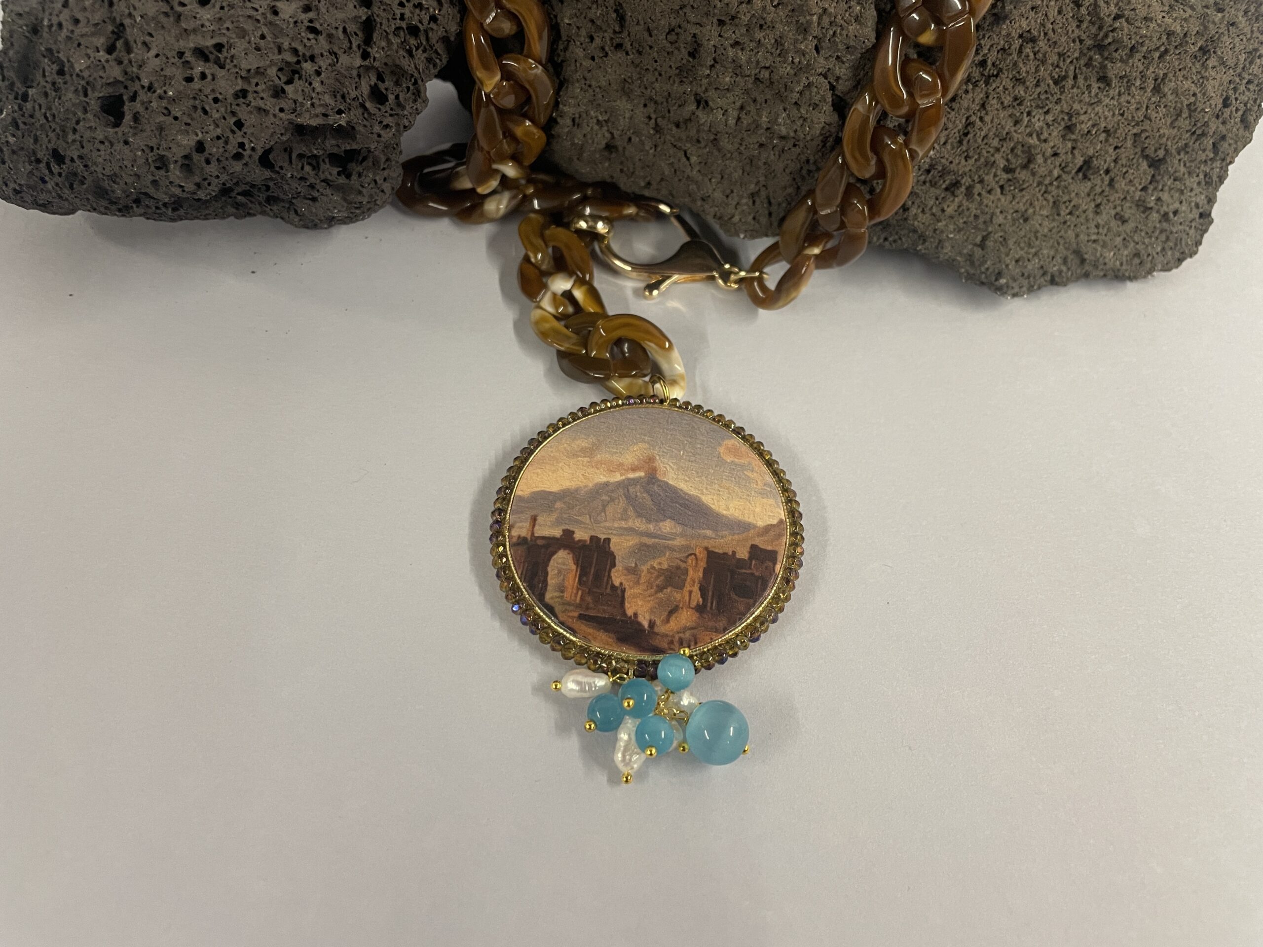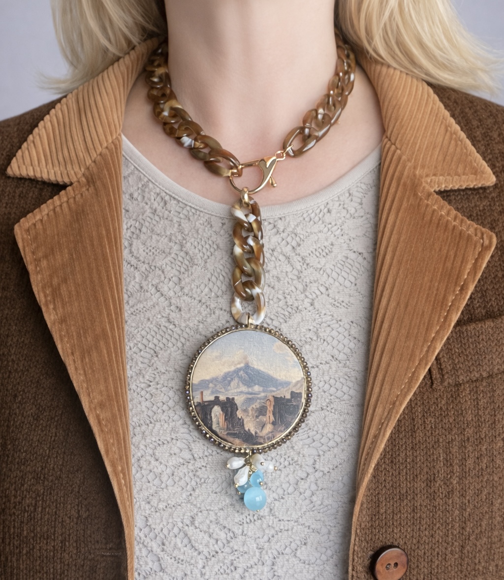 Collana girocollo dal design contemporaneo e deciso, ispirata ai paesaggi iconici della Sicilia. Un gioiello artigianale che unisce materiali moderni e dettagli preziosi, perfetto per chi ama uno stile distintivo e raffinato. La collana è realizzata con una catena girocollo composta interamente da maglie in resina marrone, leggere ma visivamente importanti; inoltre, la forma corta valorizza il décolleté e rende il gioiello ideale sia per look quotidiani sia per occasioni speciali. Il design è arricchito da elementi che ne definiscono lo stile: