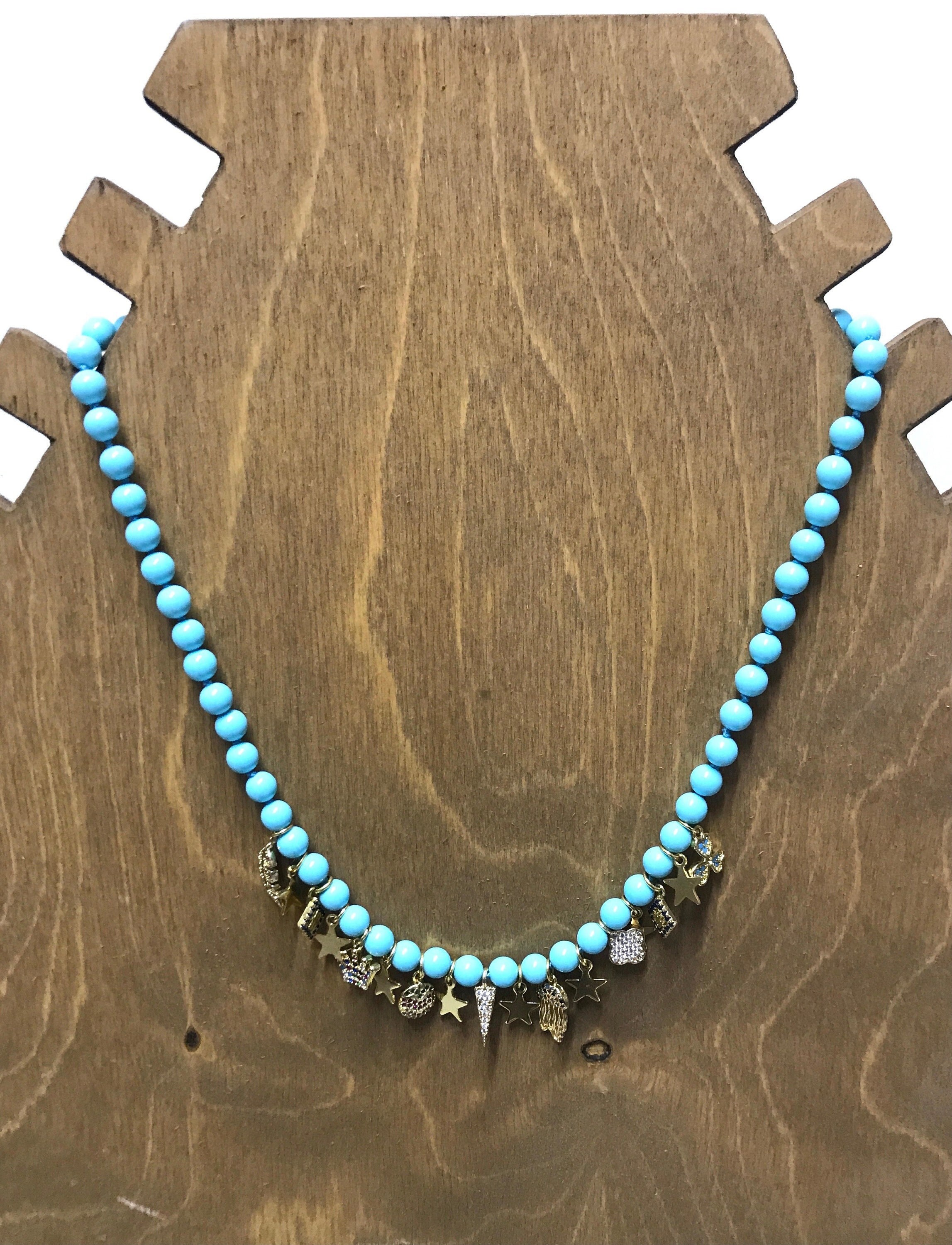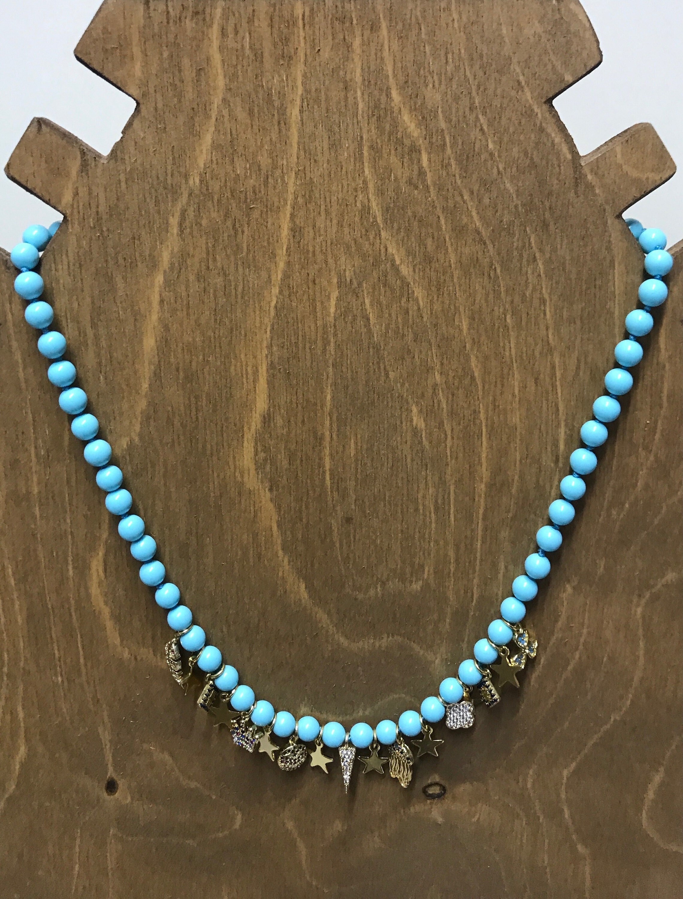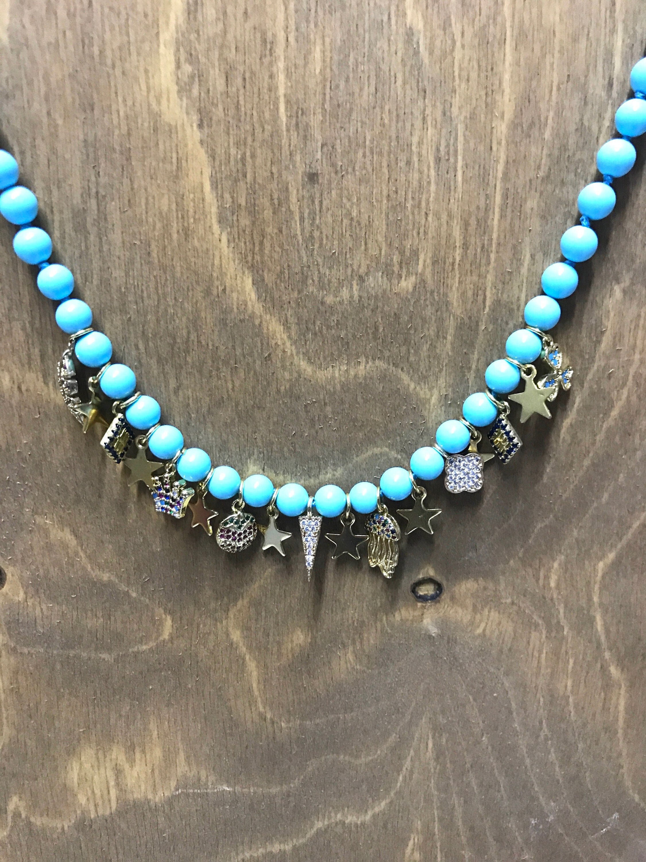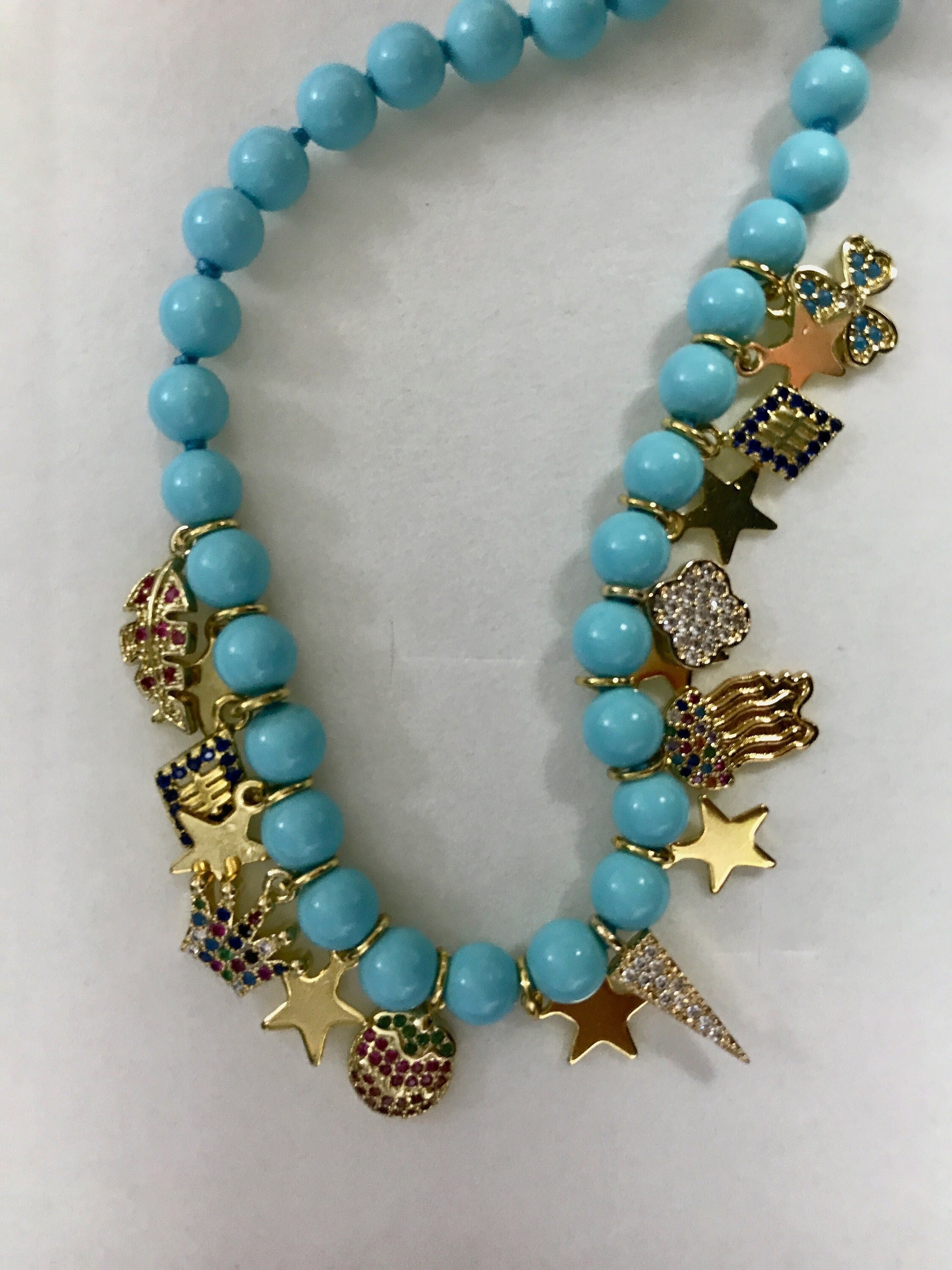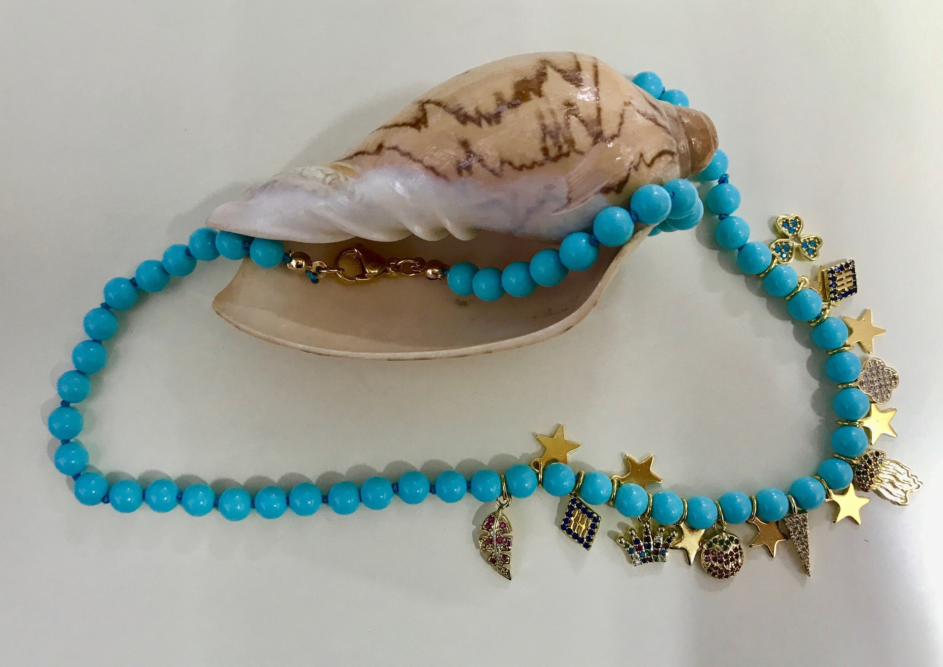 Composta da perle di pasta di turchese singolarmente annodate e vari charms assortiti.