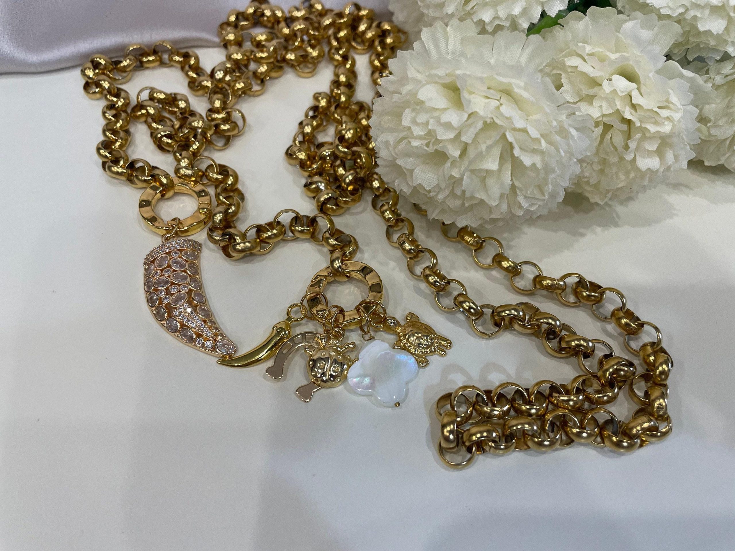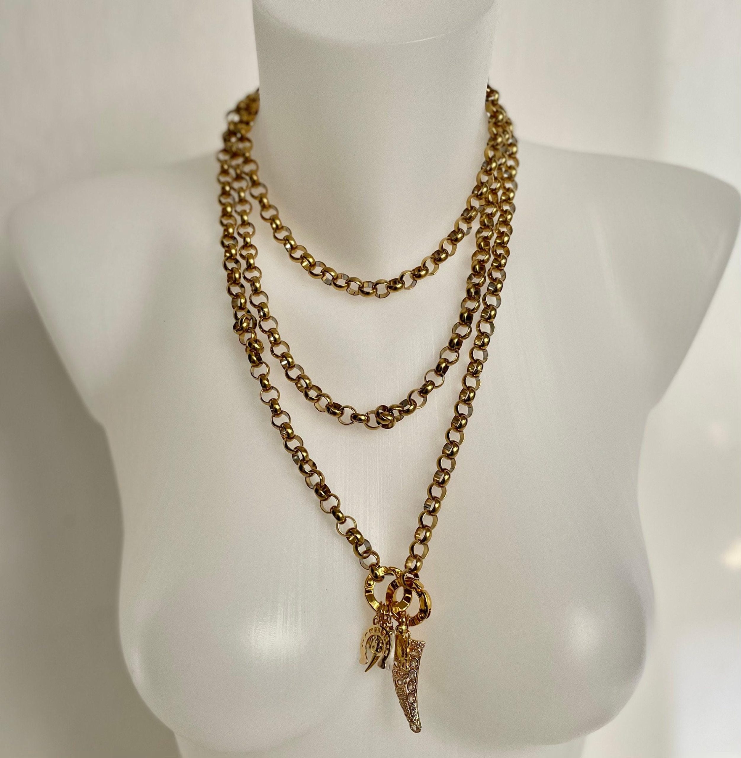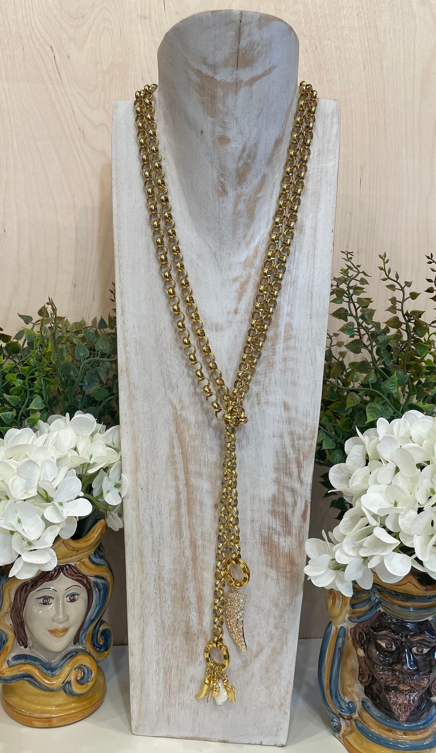 Collana lariat con catena spessa in oro, collana lunga, ciondoli portafortuna in oro, collana lunghissima, collana in oro con catena rolo.