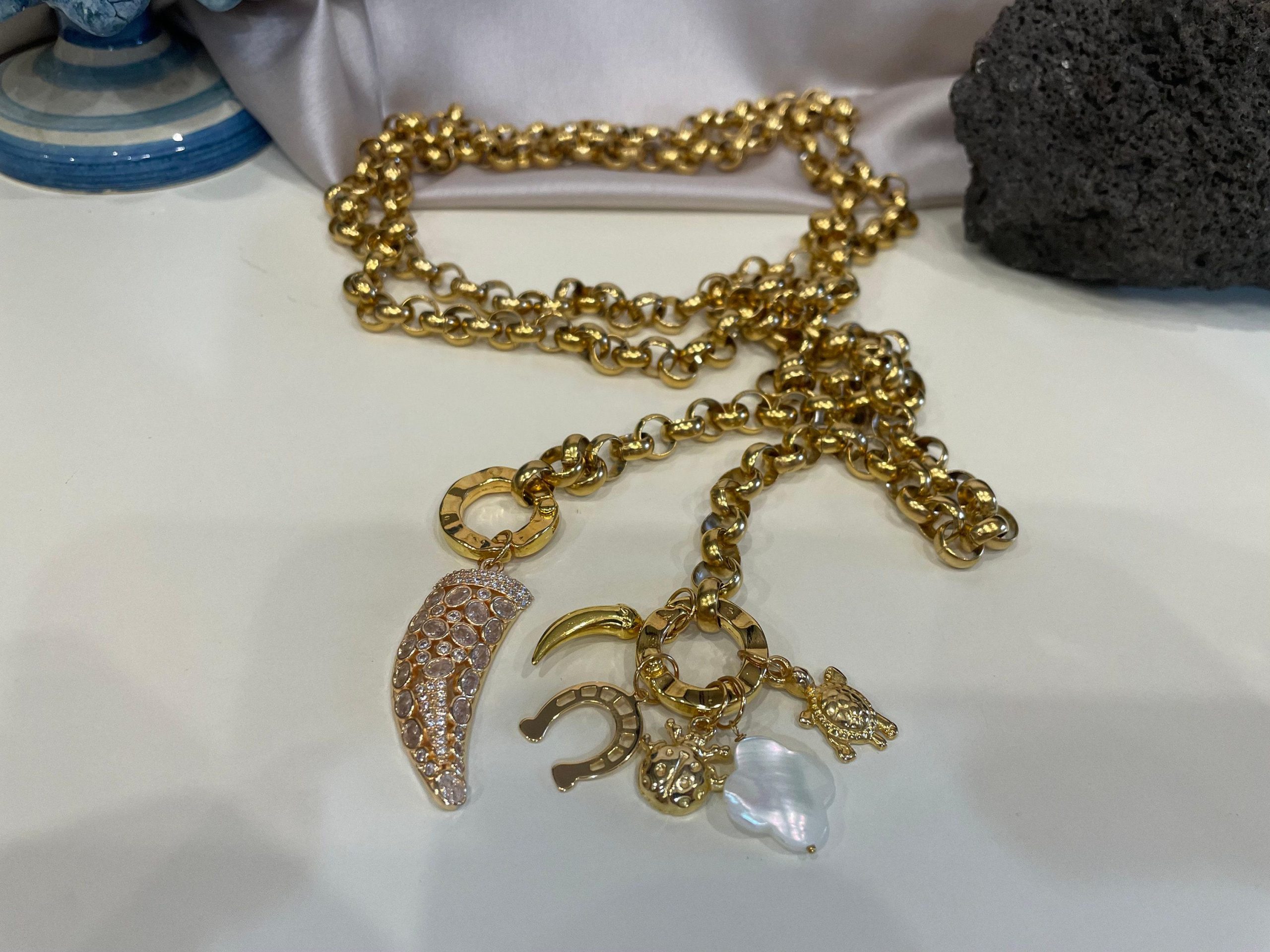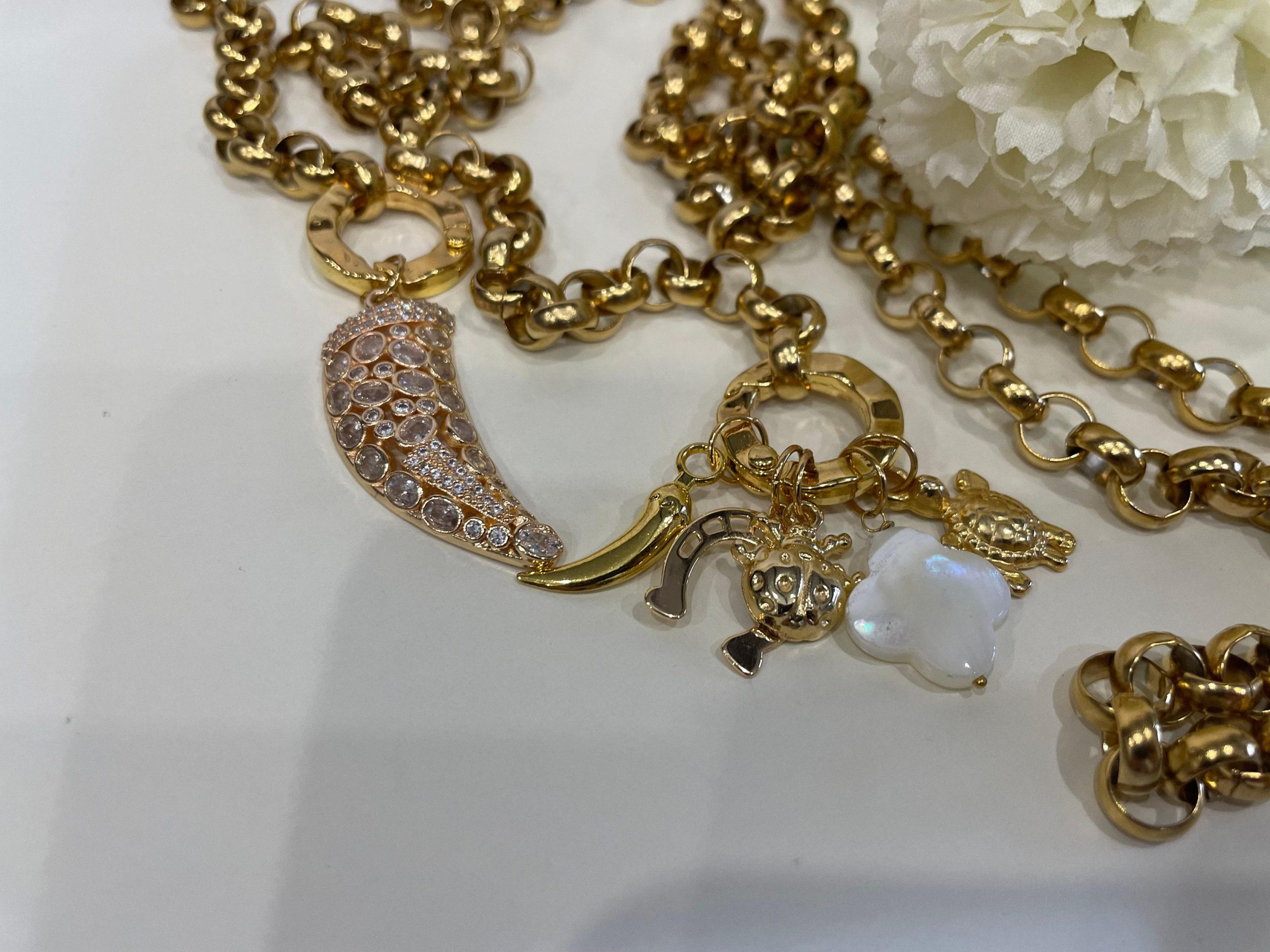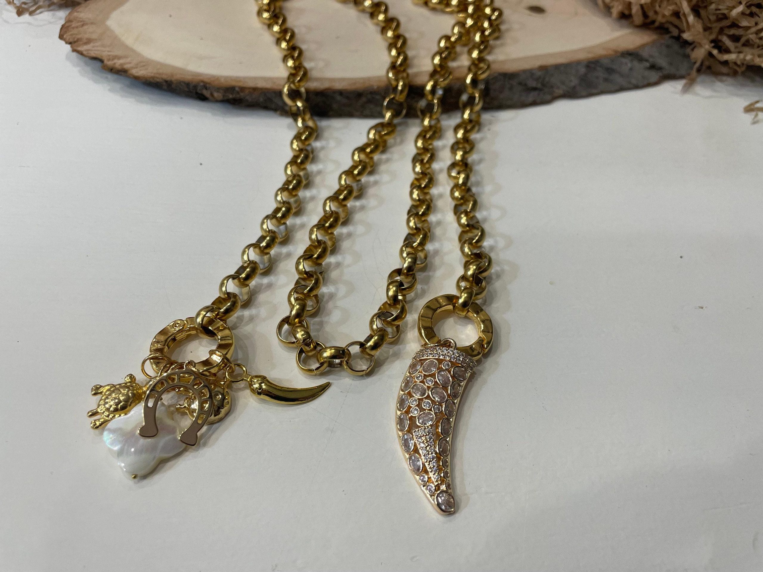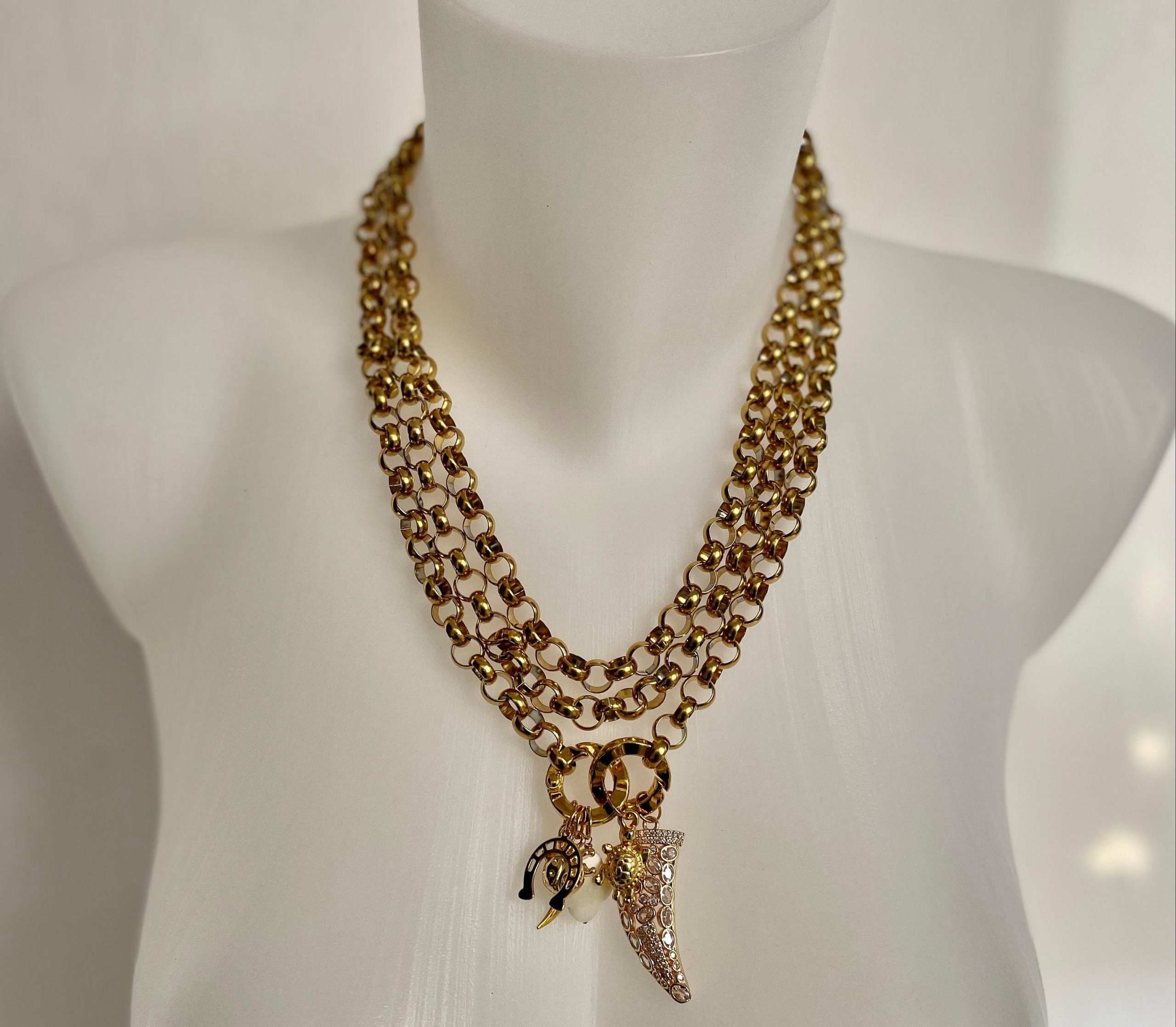 Collana lariat con catena spessa in oro, collana lunga, ciondoli portafortuna in oro, collana lunghissima, collana in oro con catena rolo.