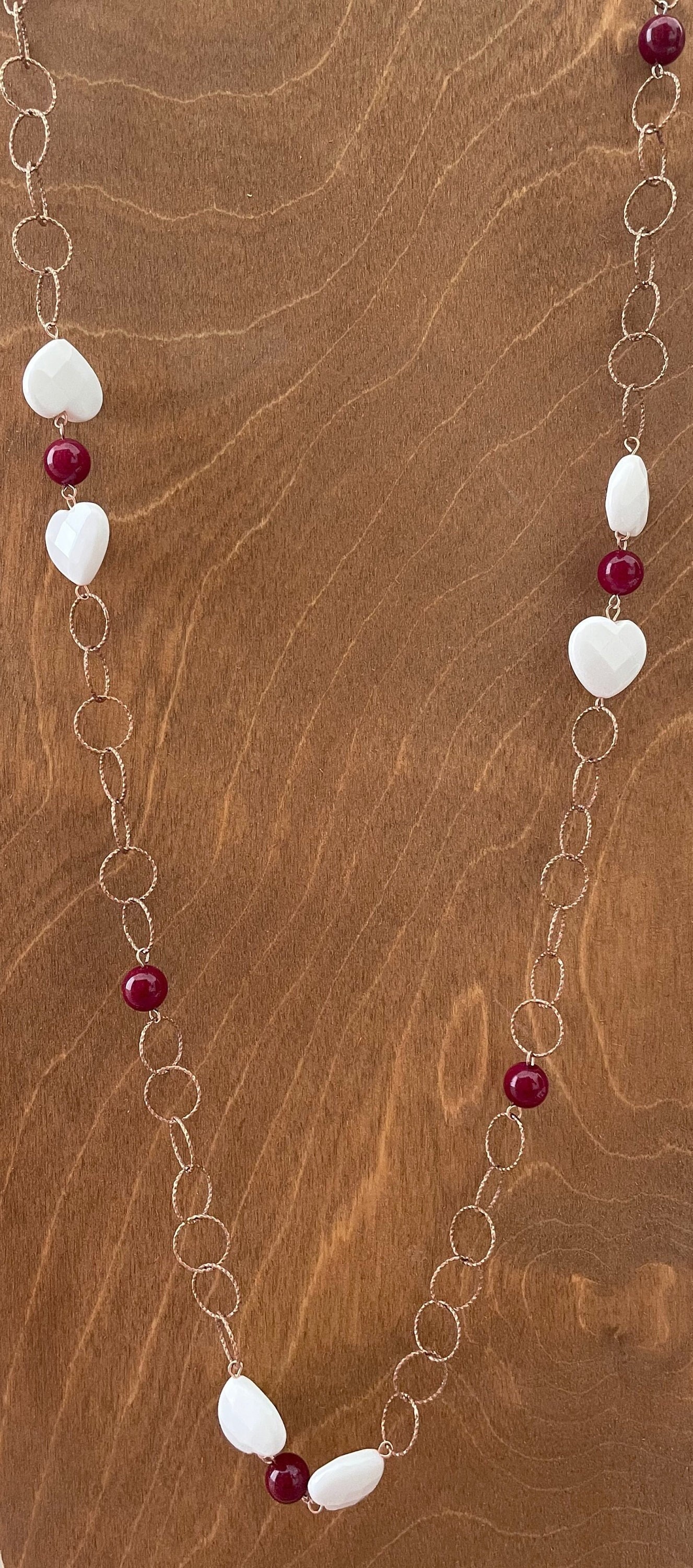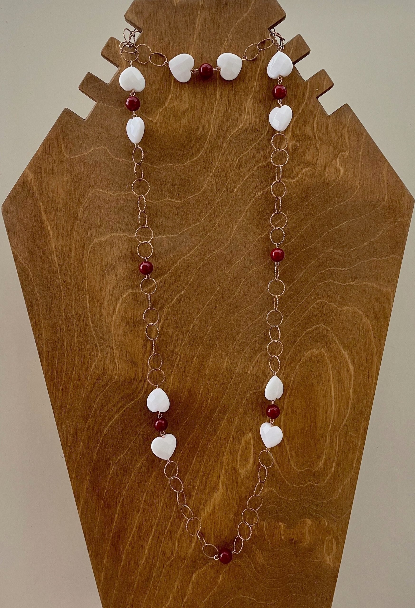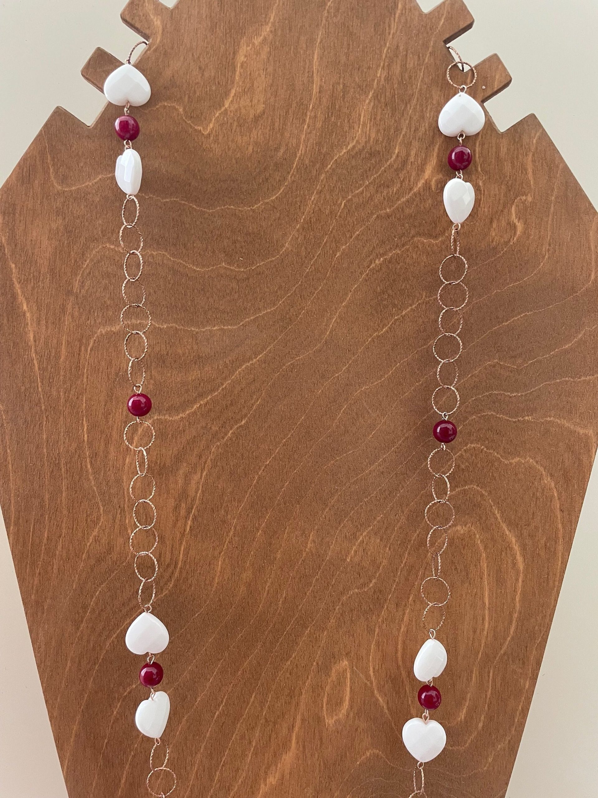 Collana lunga a maglia larga con cuori bianchi e perle rosse.
