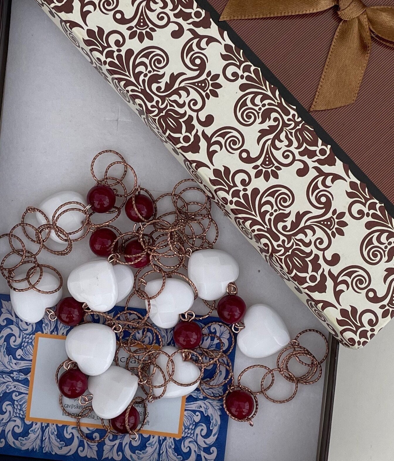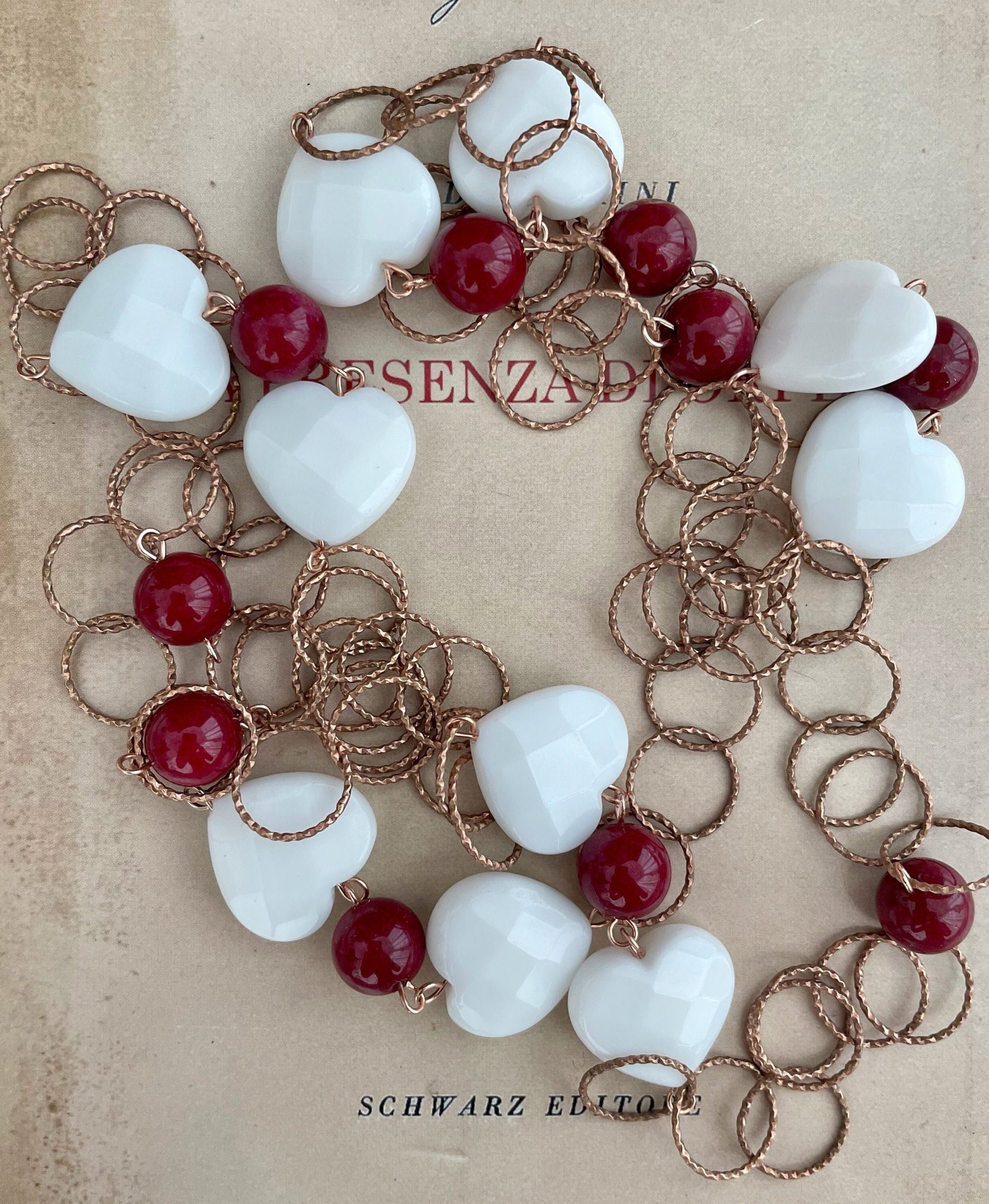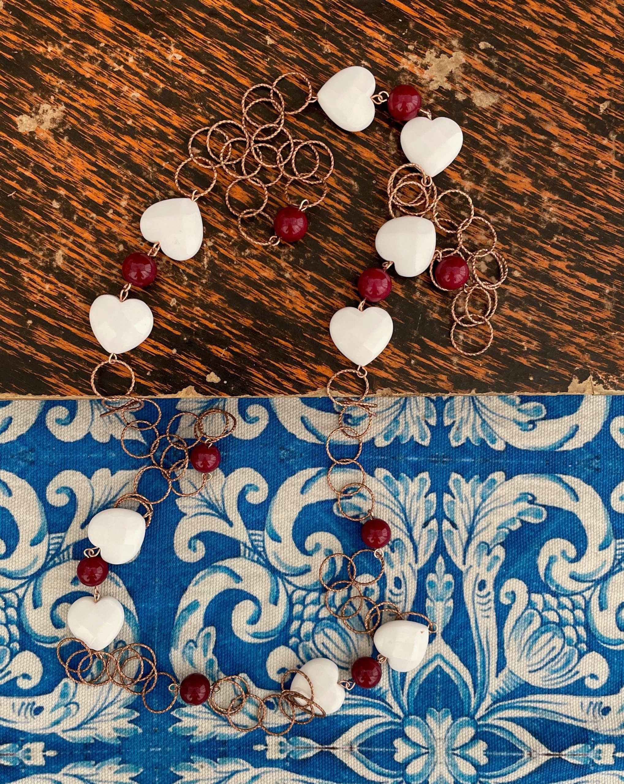 Realizzata con catena a maglia larga tonda in alluminio effetto rame interrotta da cuori in agata bianca e perle di agata rossa bordeaux.