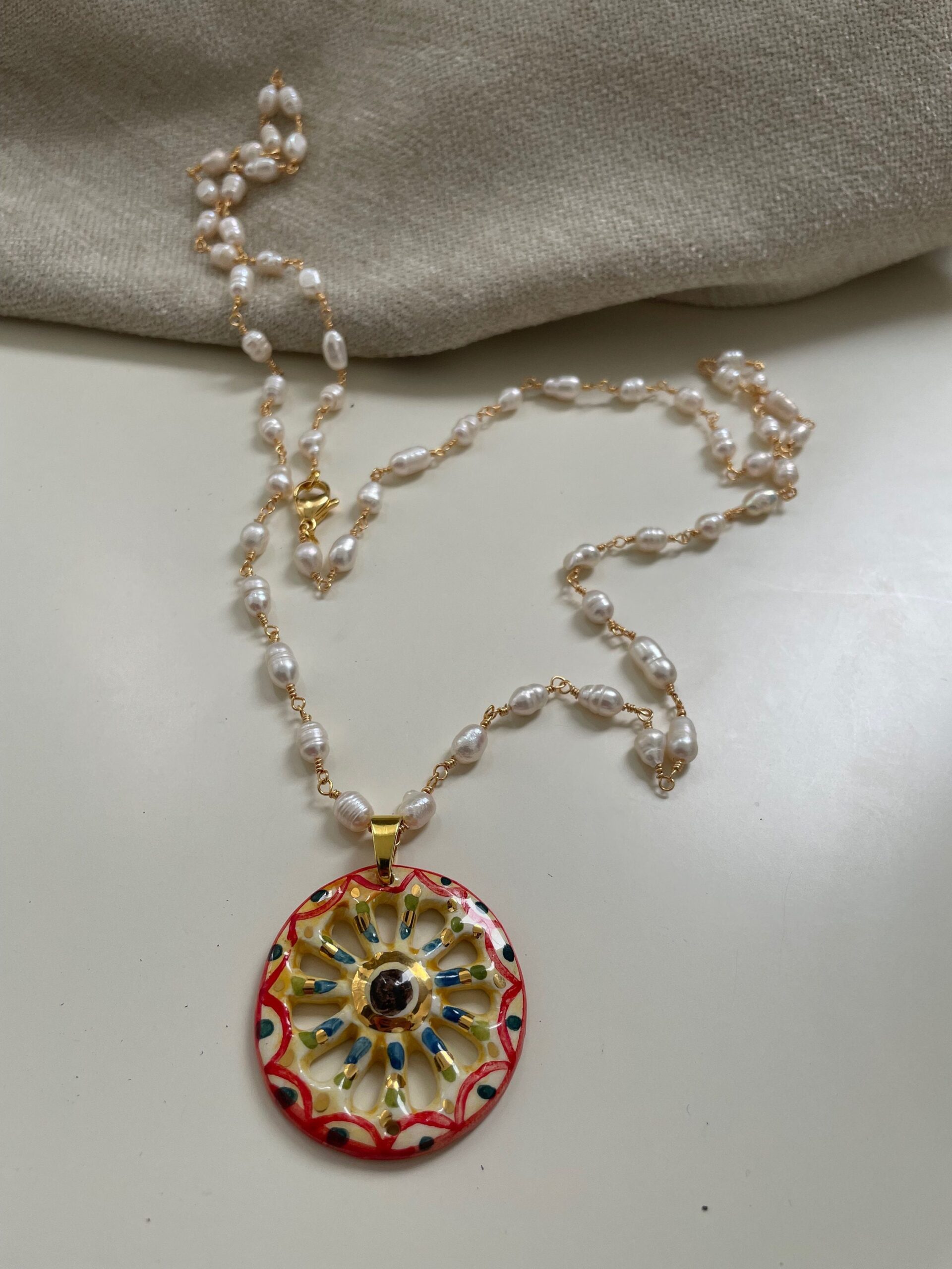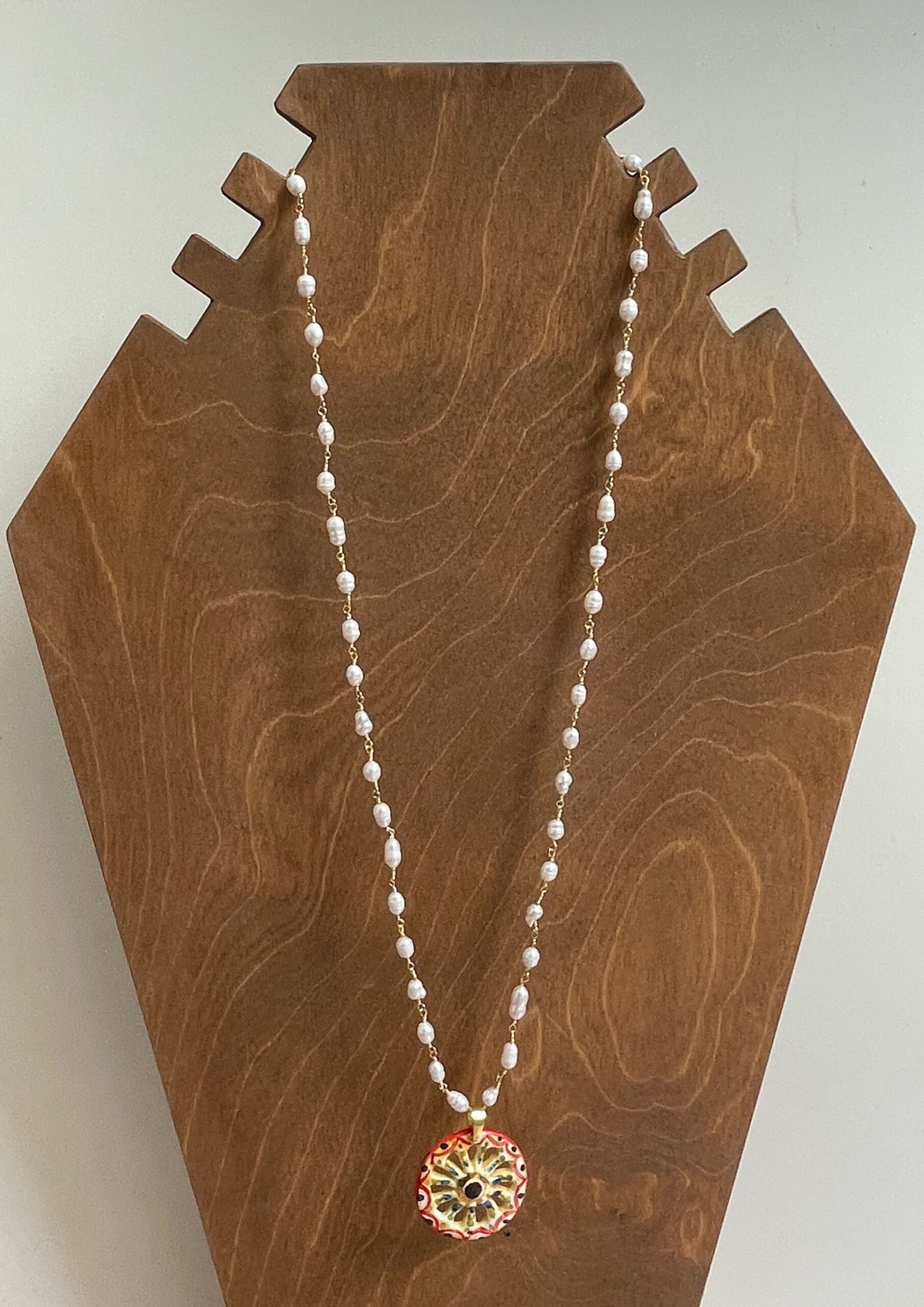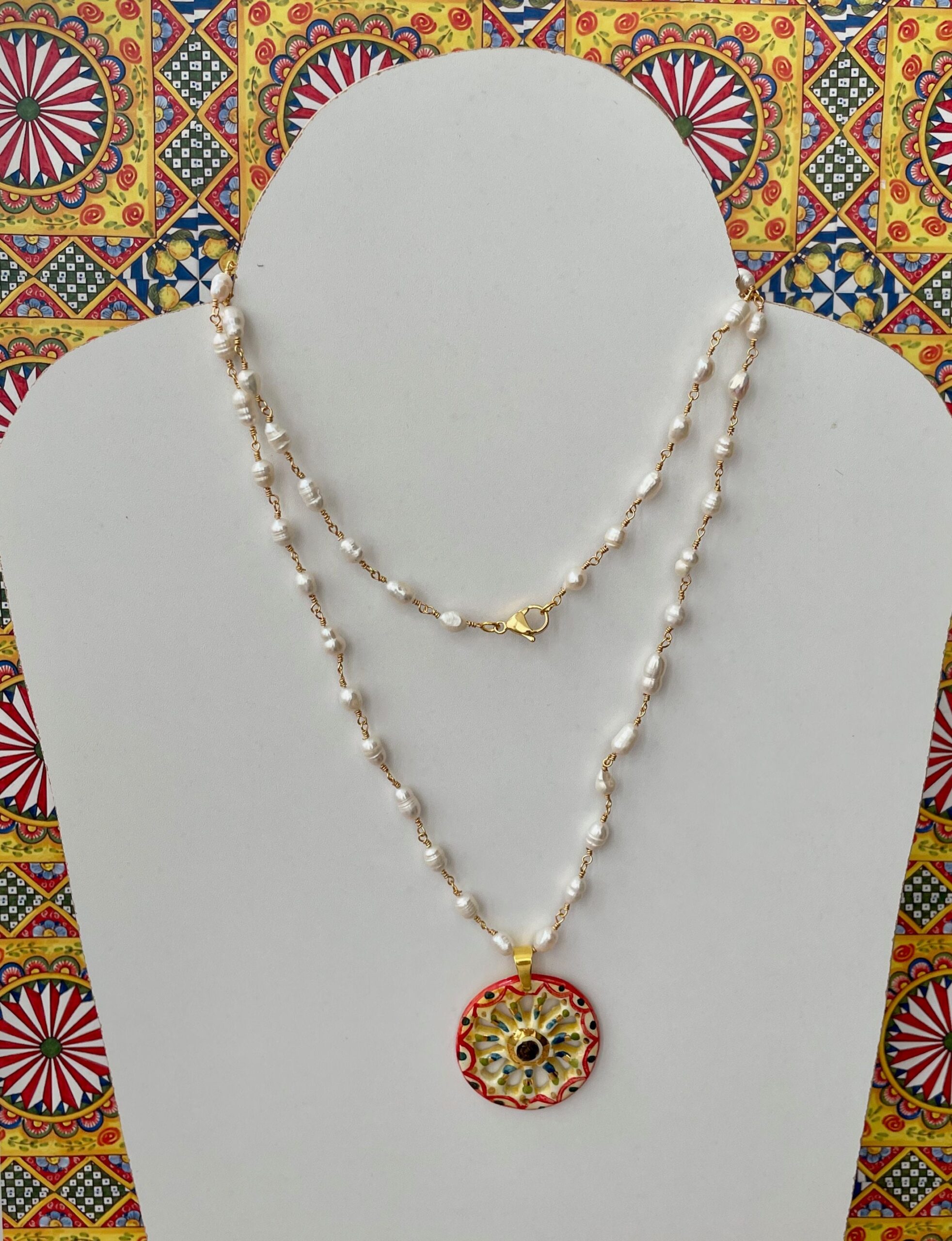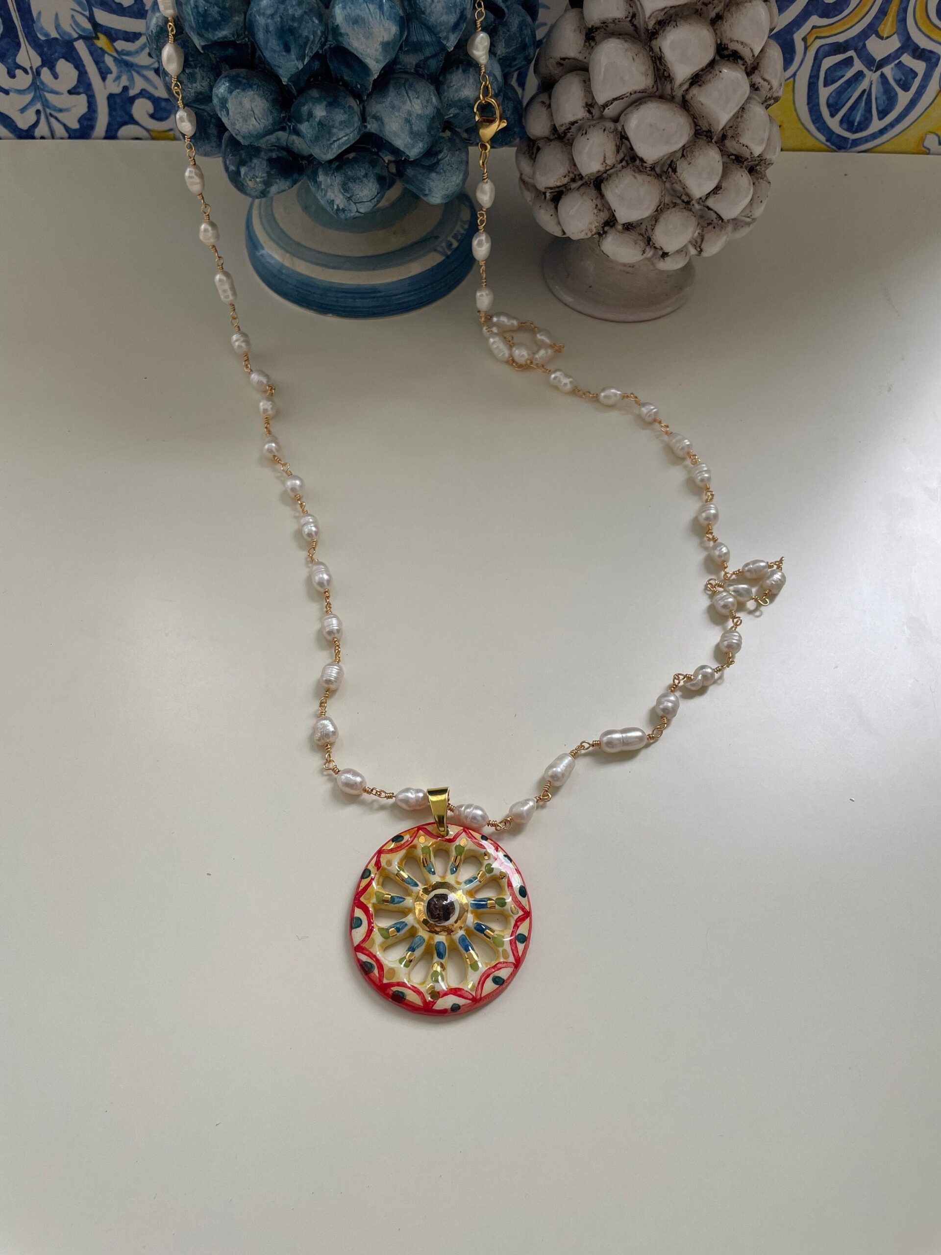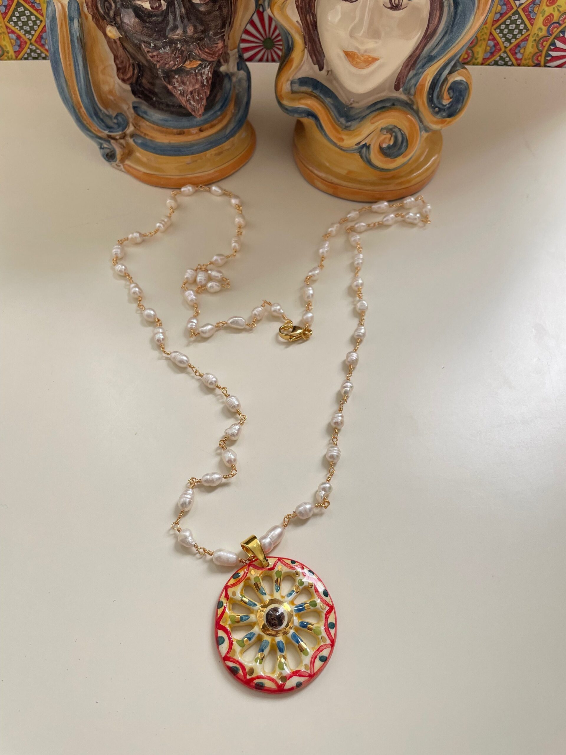 Collana lunga, catena rosario, collana con ciondolo, collana perle di fiume, pendente ruota di carretto di ceramica di Caltagirone.