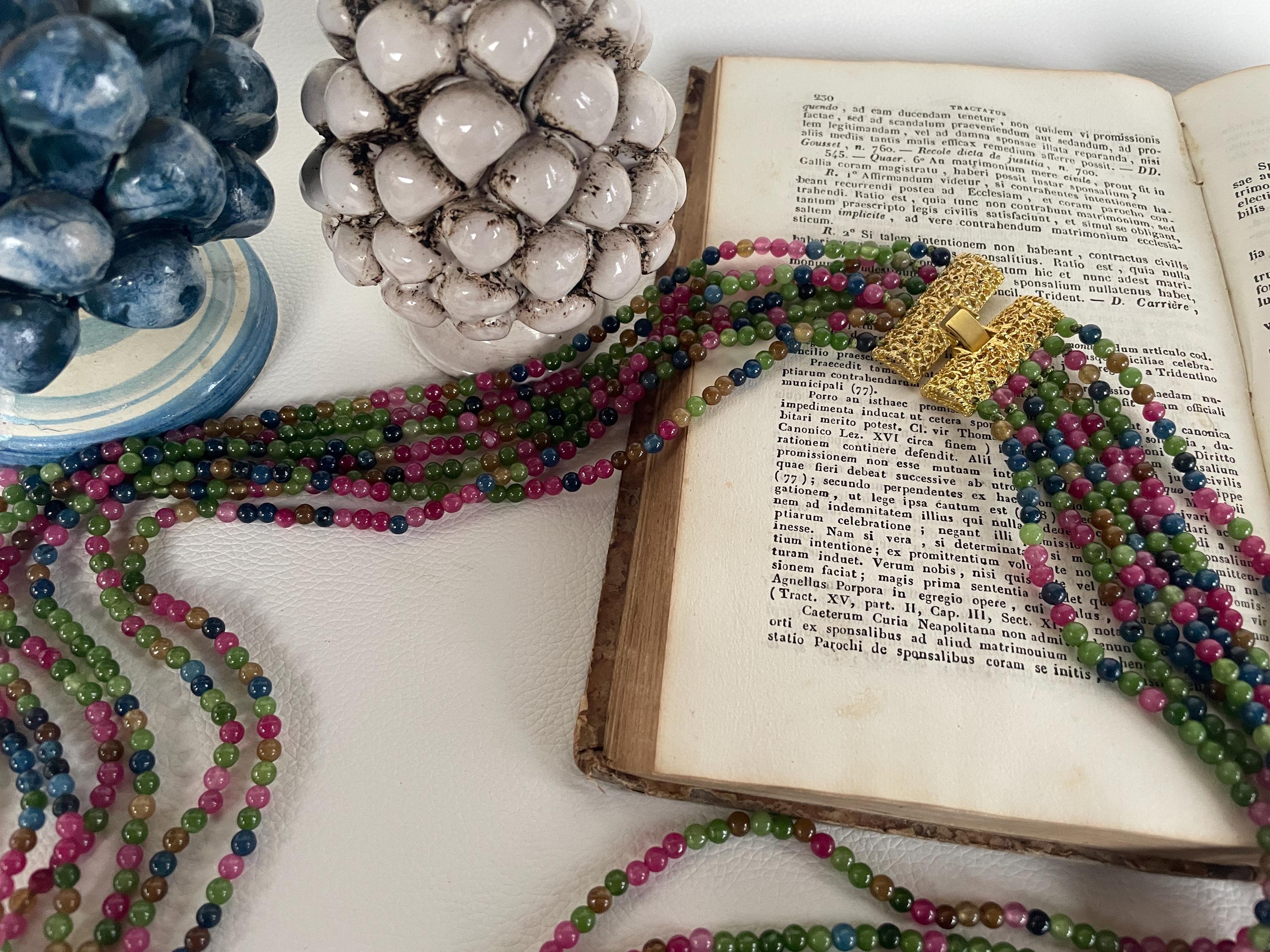I sette fili di perle si uniscono ad una chiusura a fibbia in filigrana d’ottone.