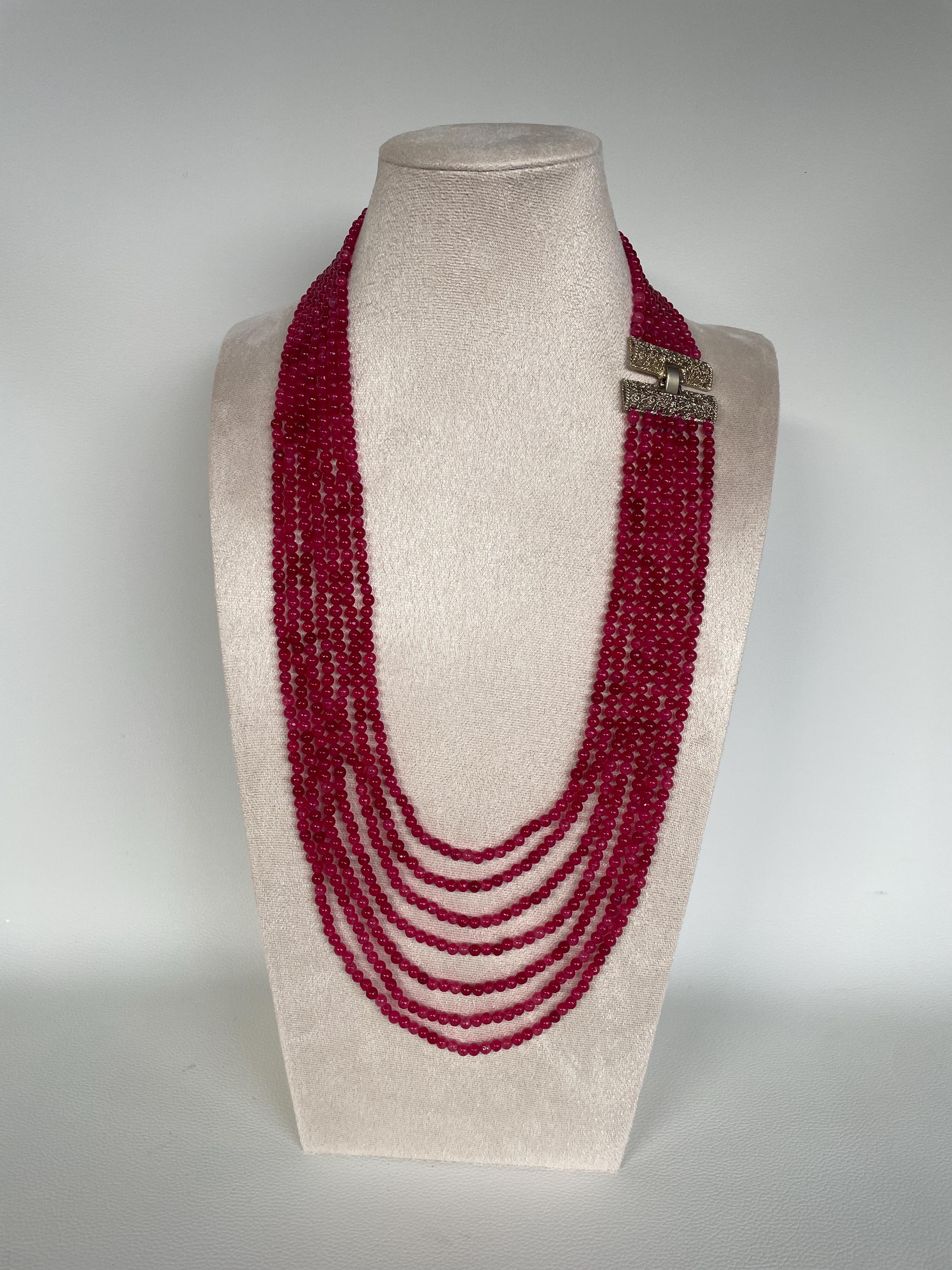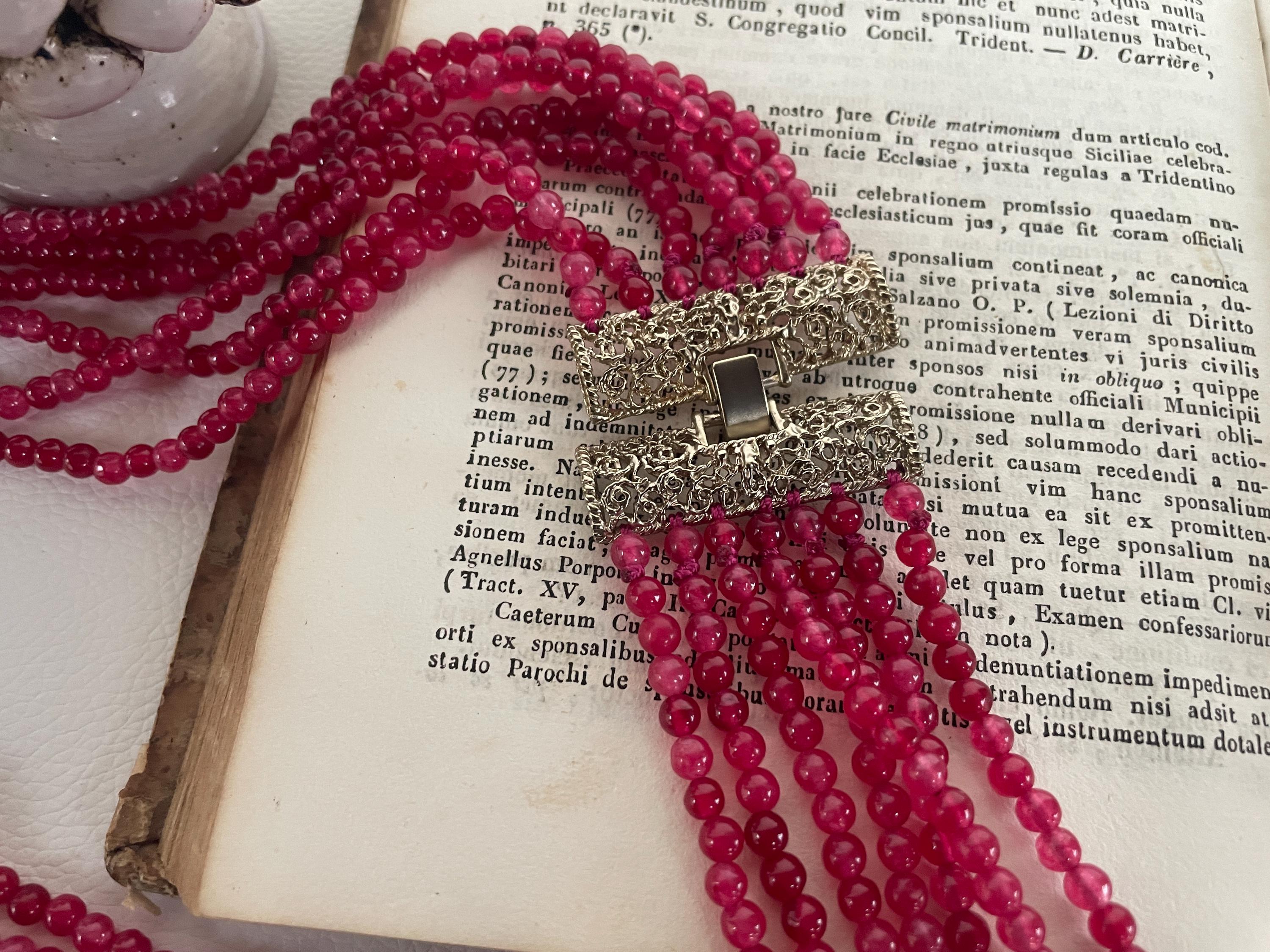 I sette fili di perle si uniscono ad una chiusura a fibbia in filigrana d’ottone.