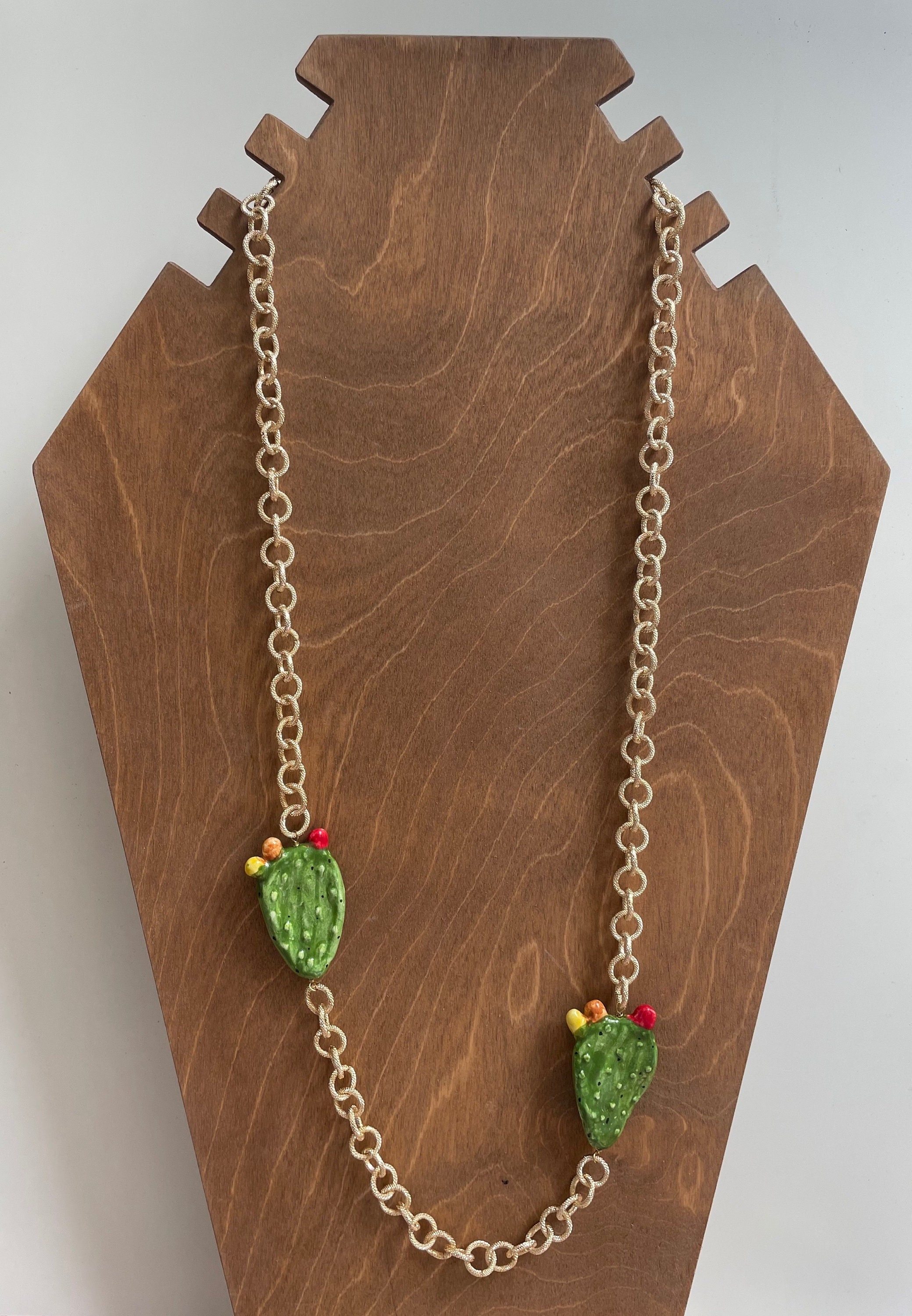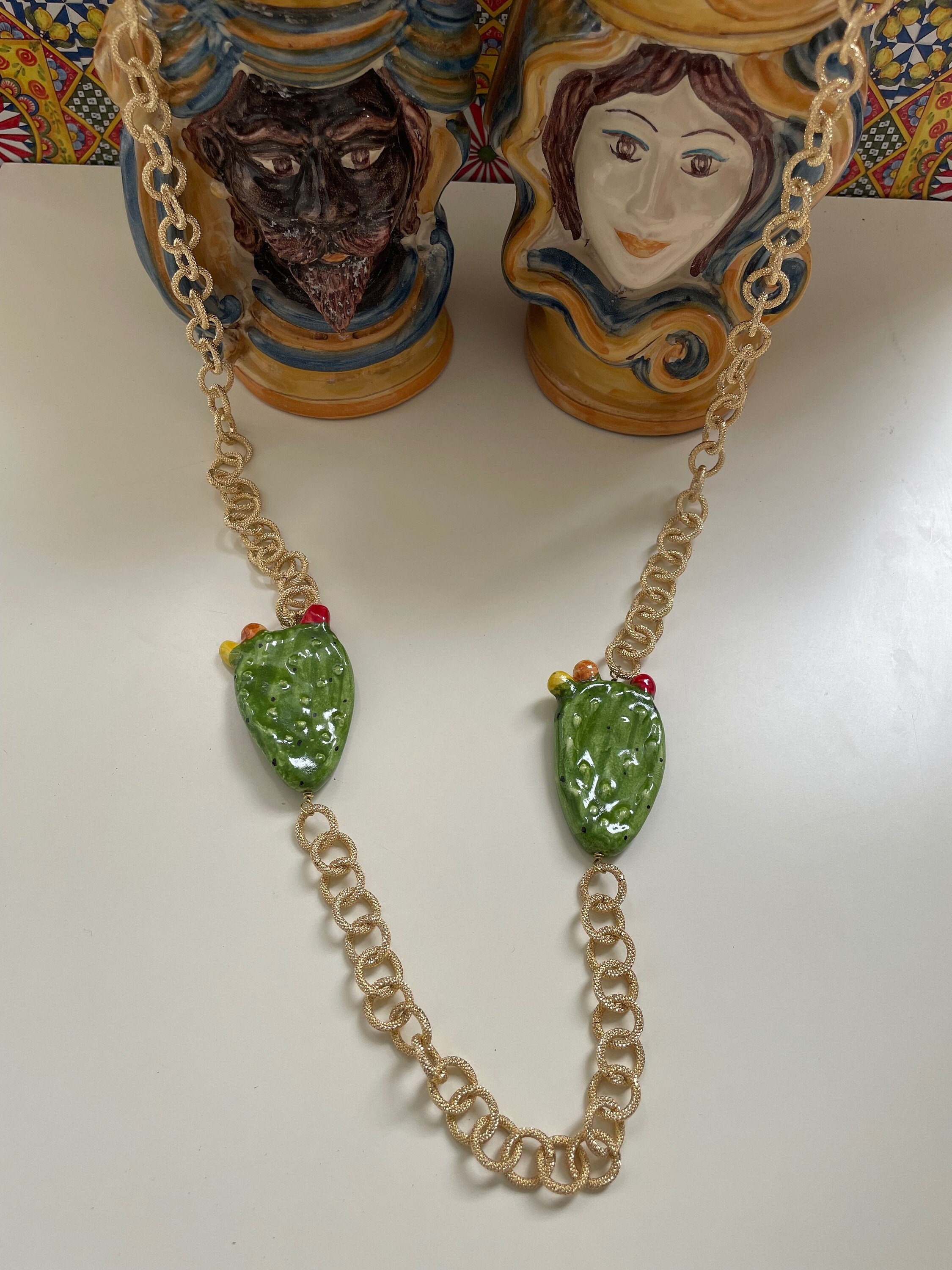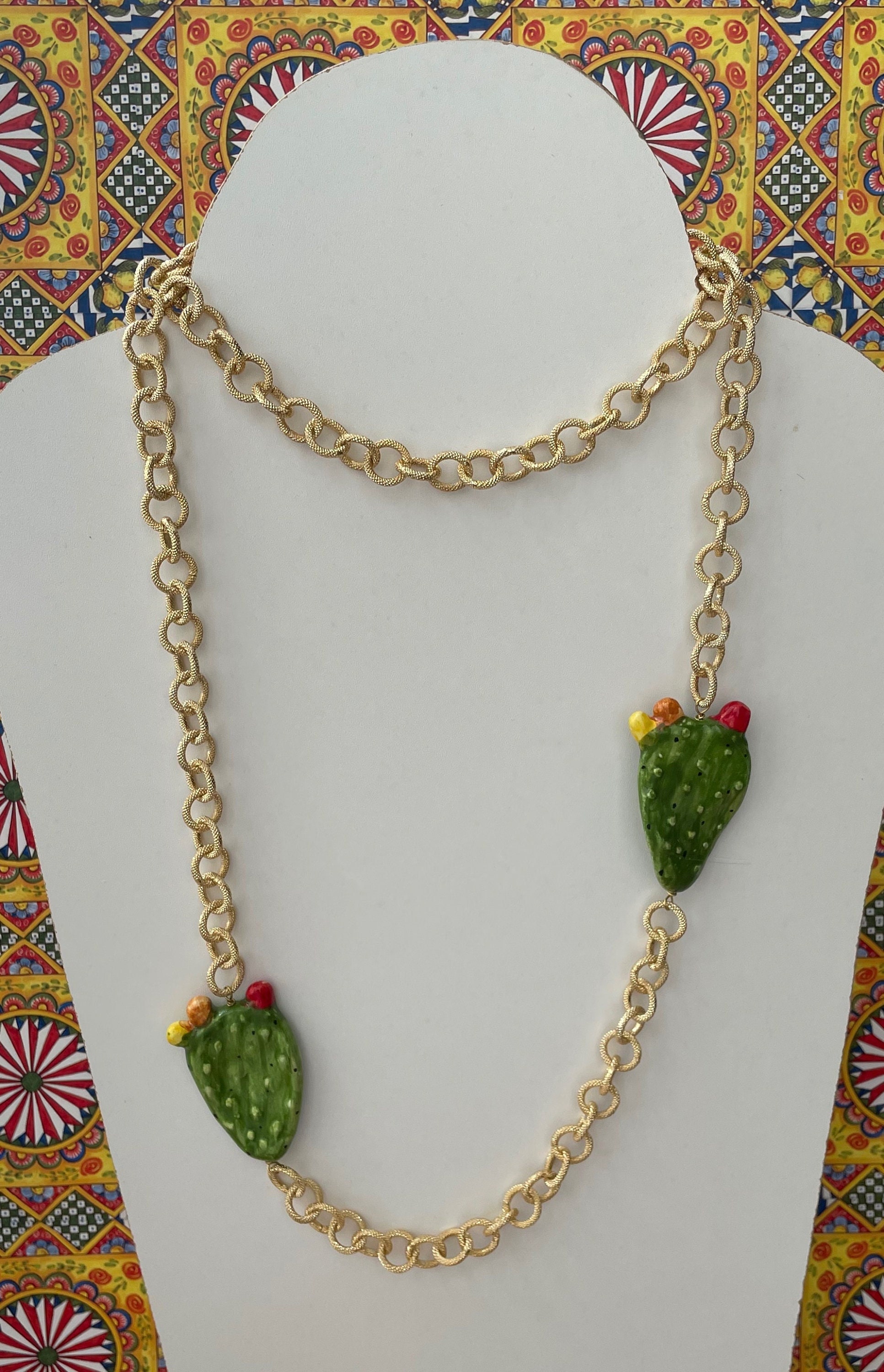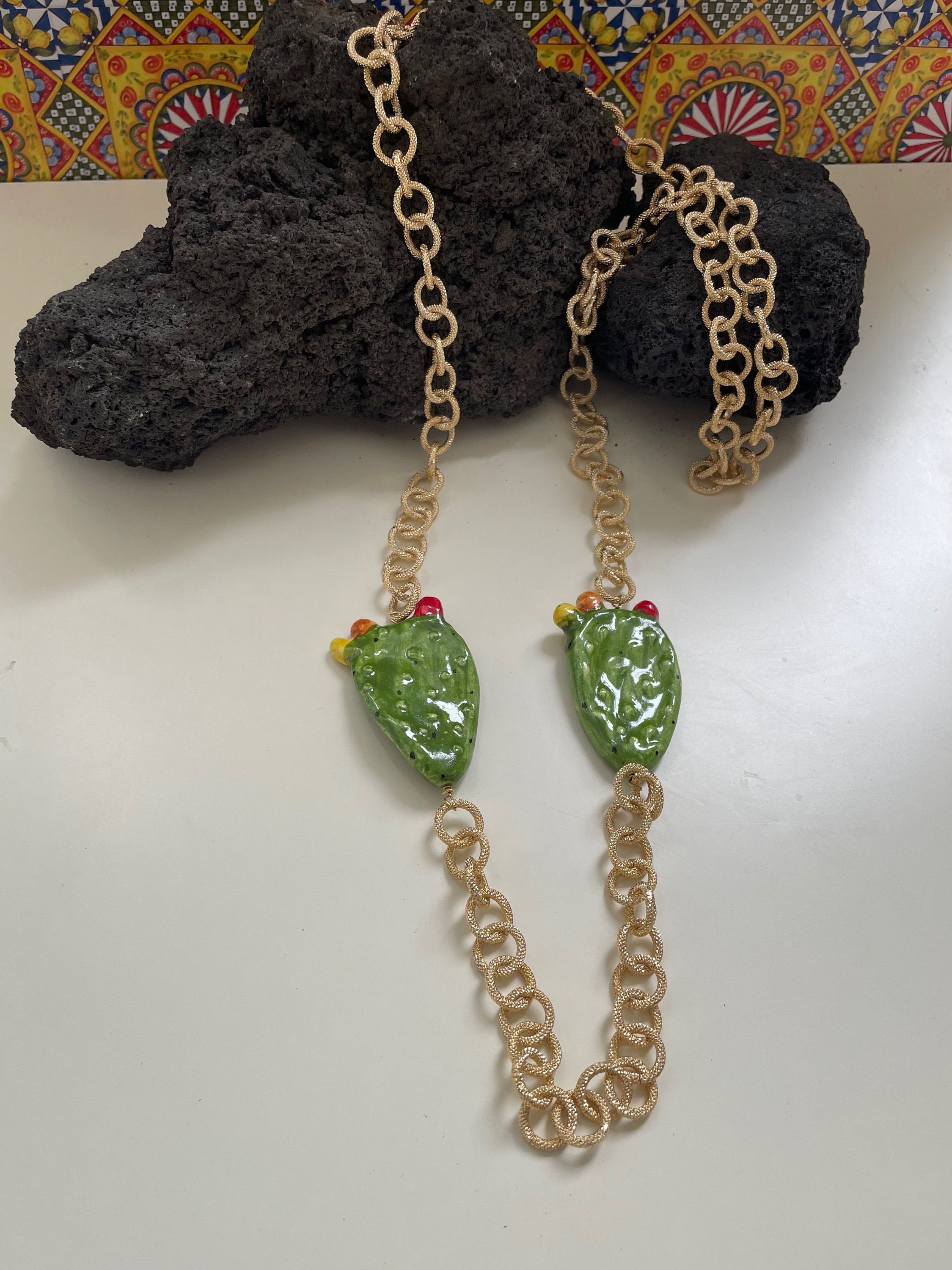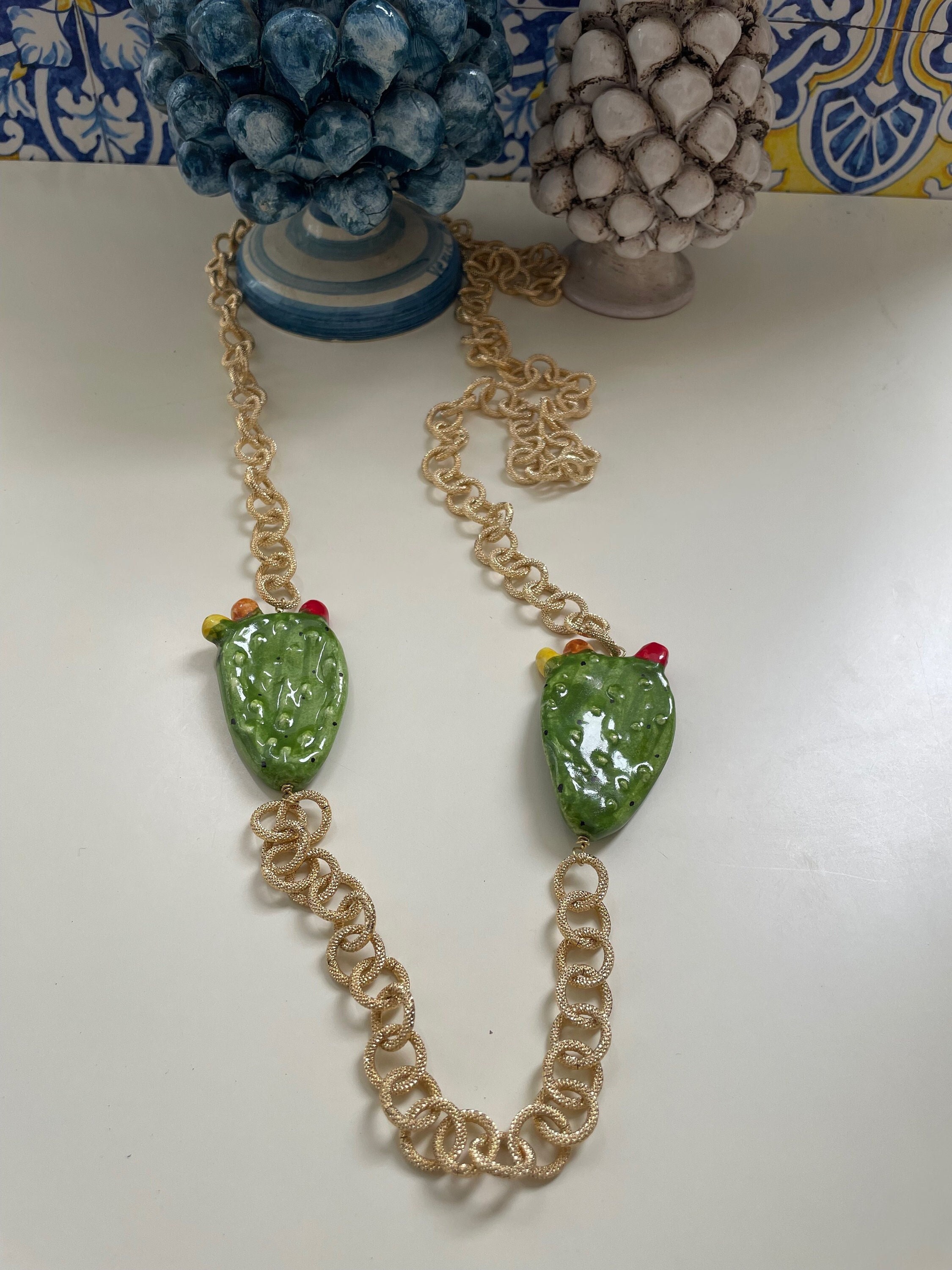 Realizzata con due Fichi d’India in ceramica di Caltagirone montati su catena in alluminio anallergico satinato a maglia larga.