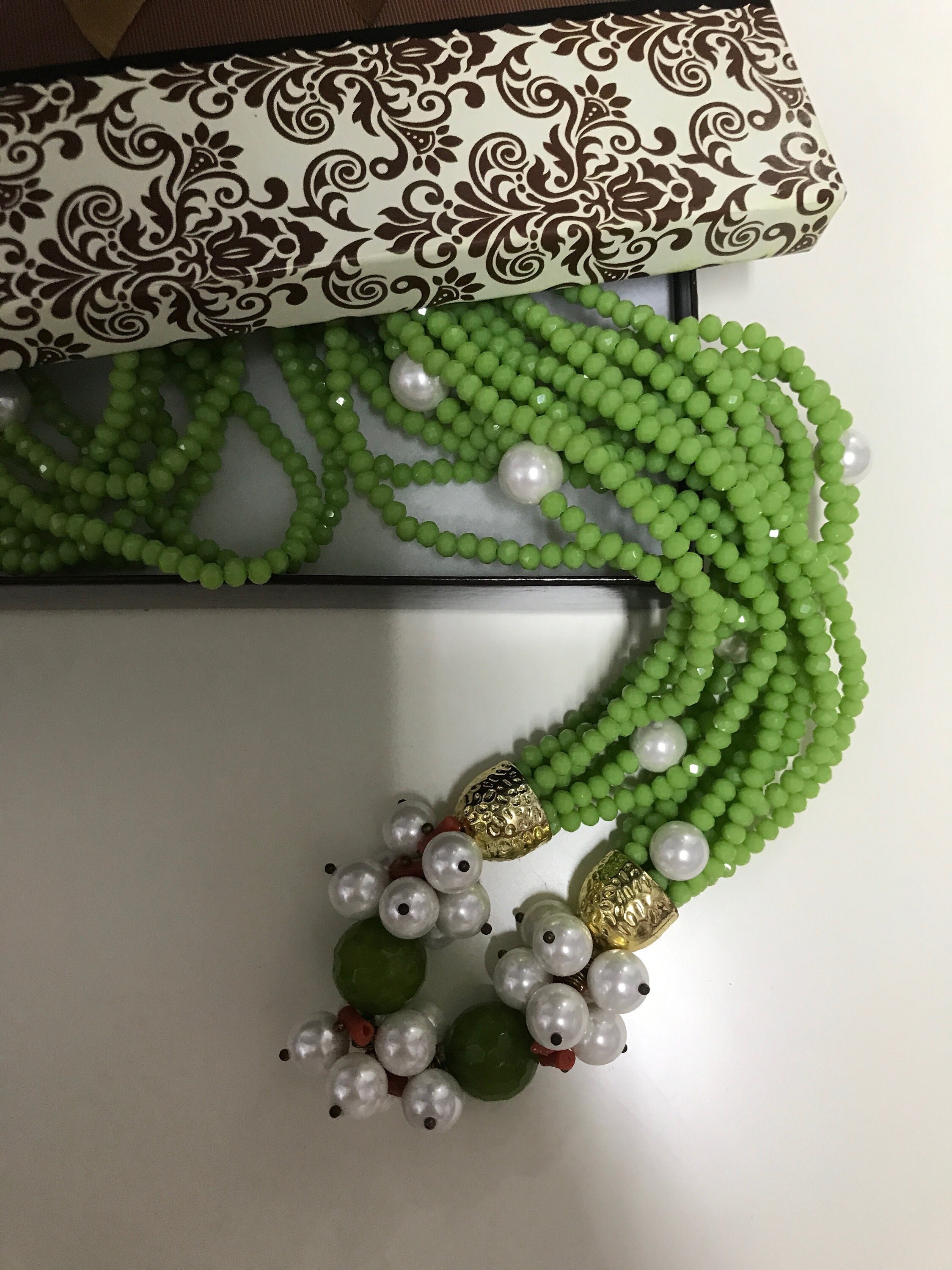 Realizzata con sette fili di cristalli verdi e intreccio di perle di fiume e due perle grandi di agata verde, tenuto da borchie di ottone.