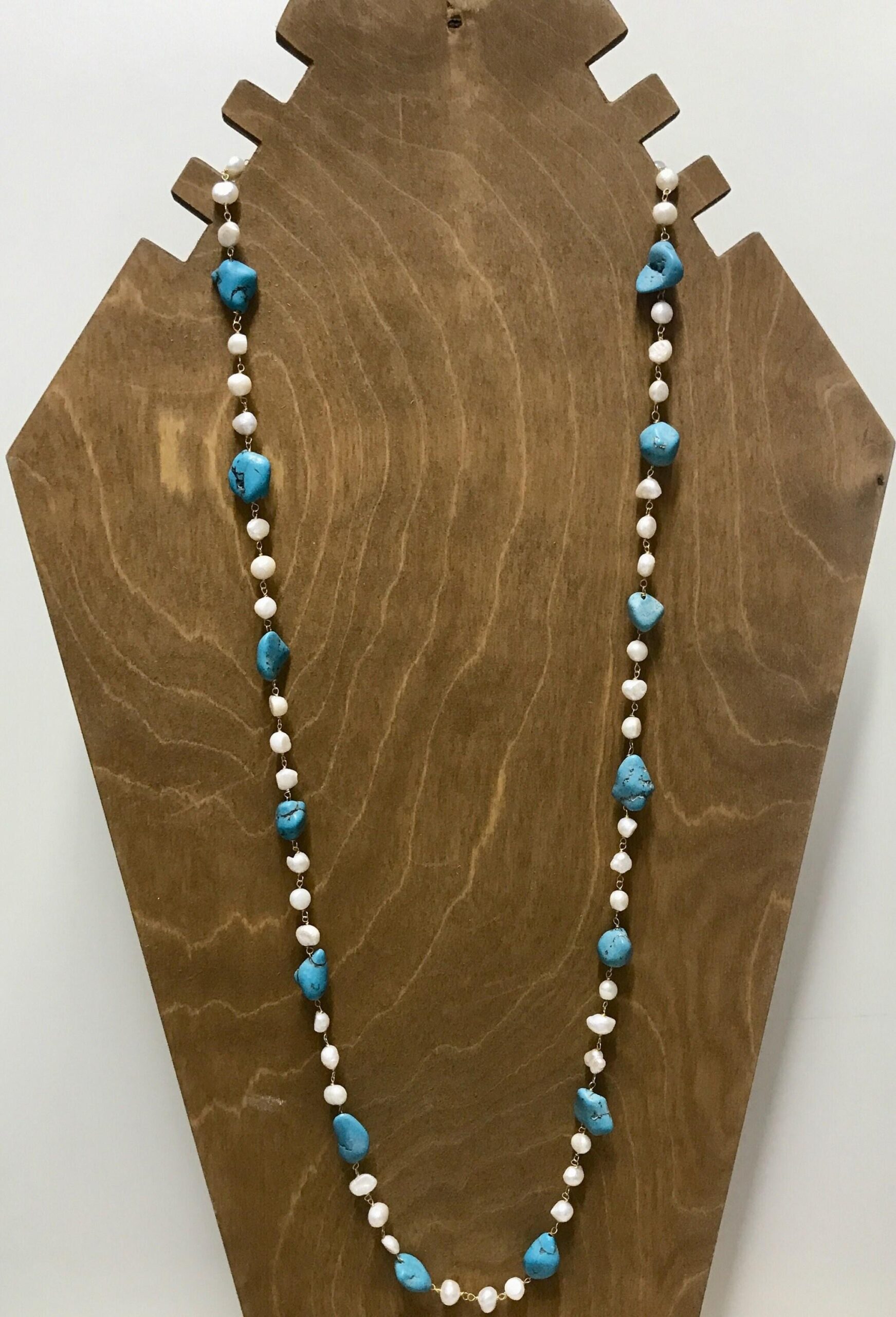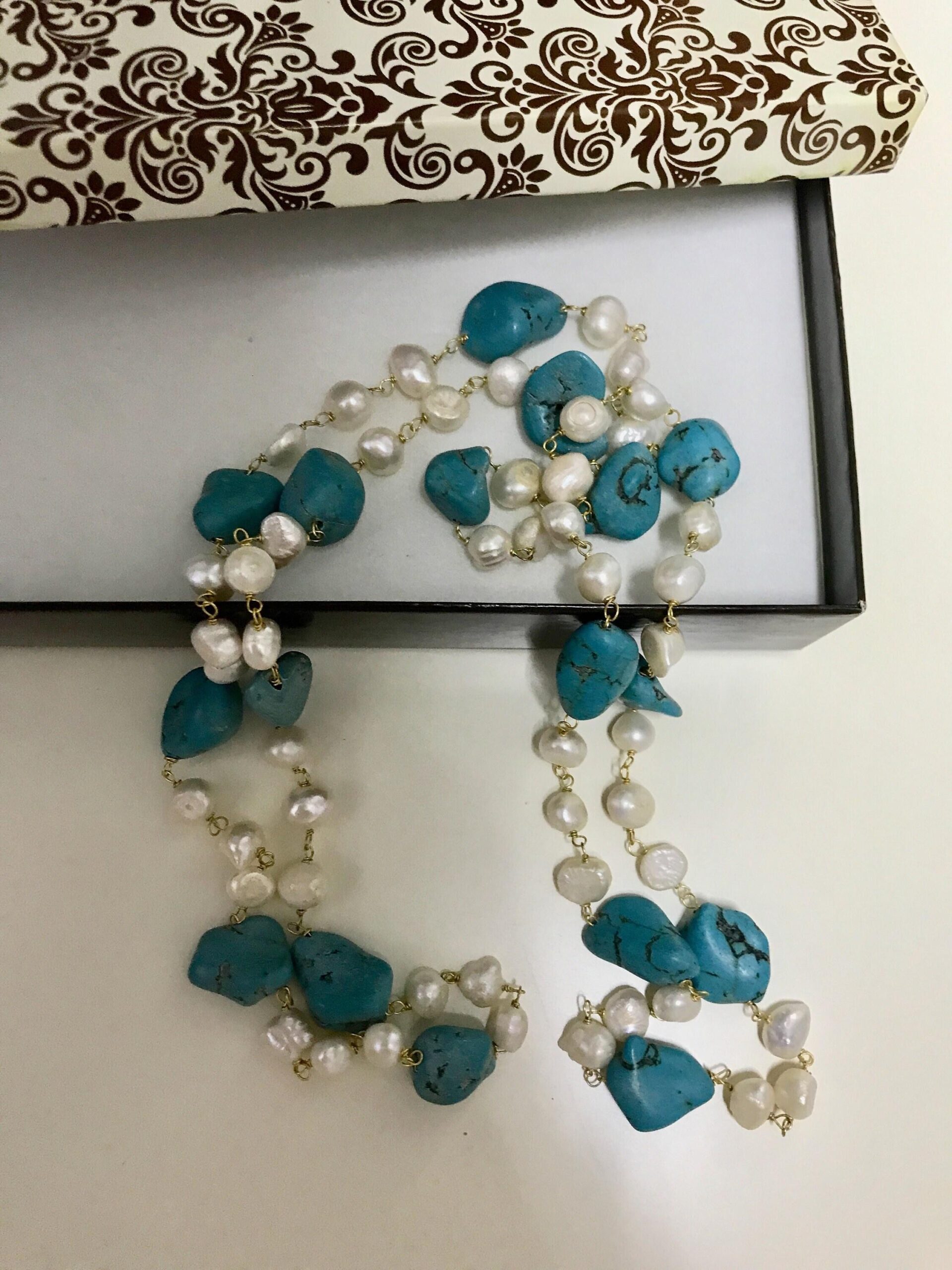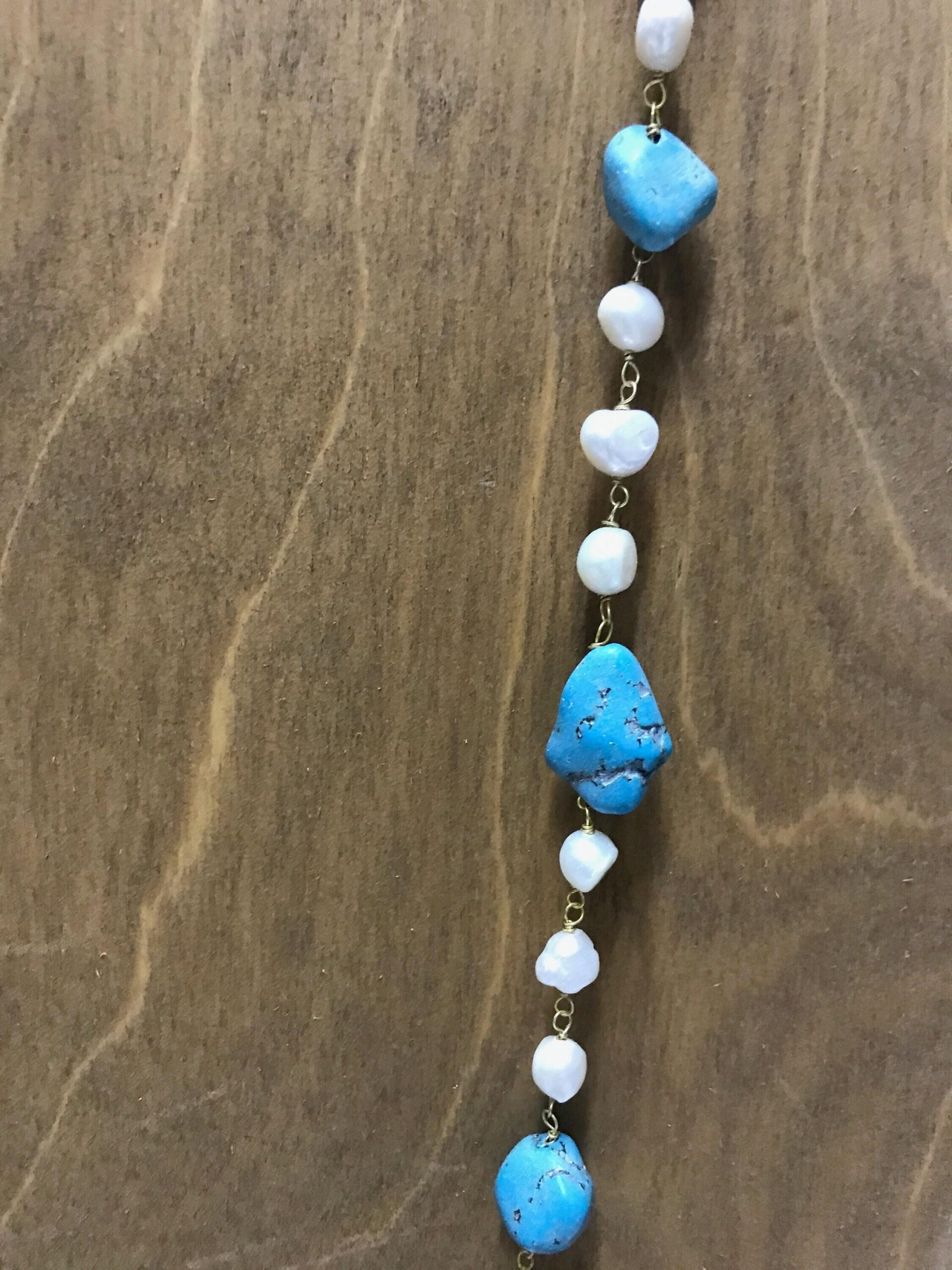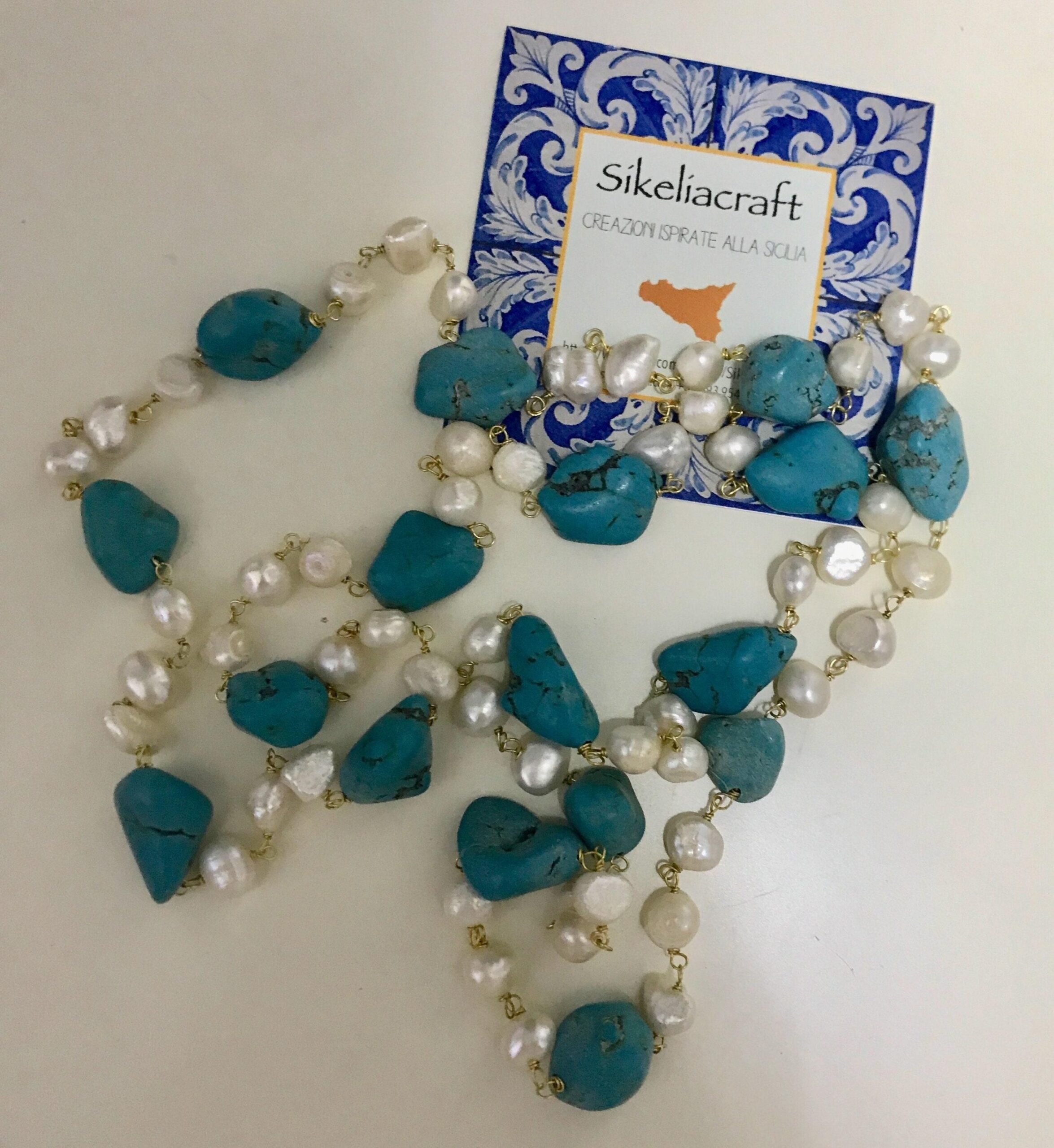 Realizzata con perle di fiume e perle irregolari di pasta di turchese, che ricordano il colore del Mediterraneo!