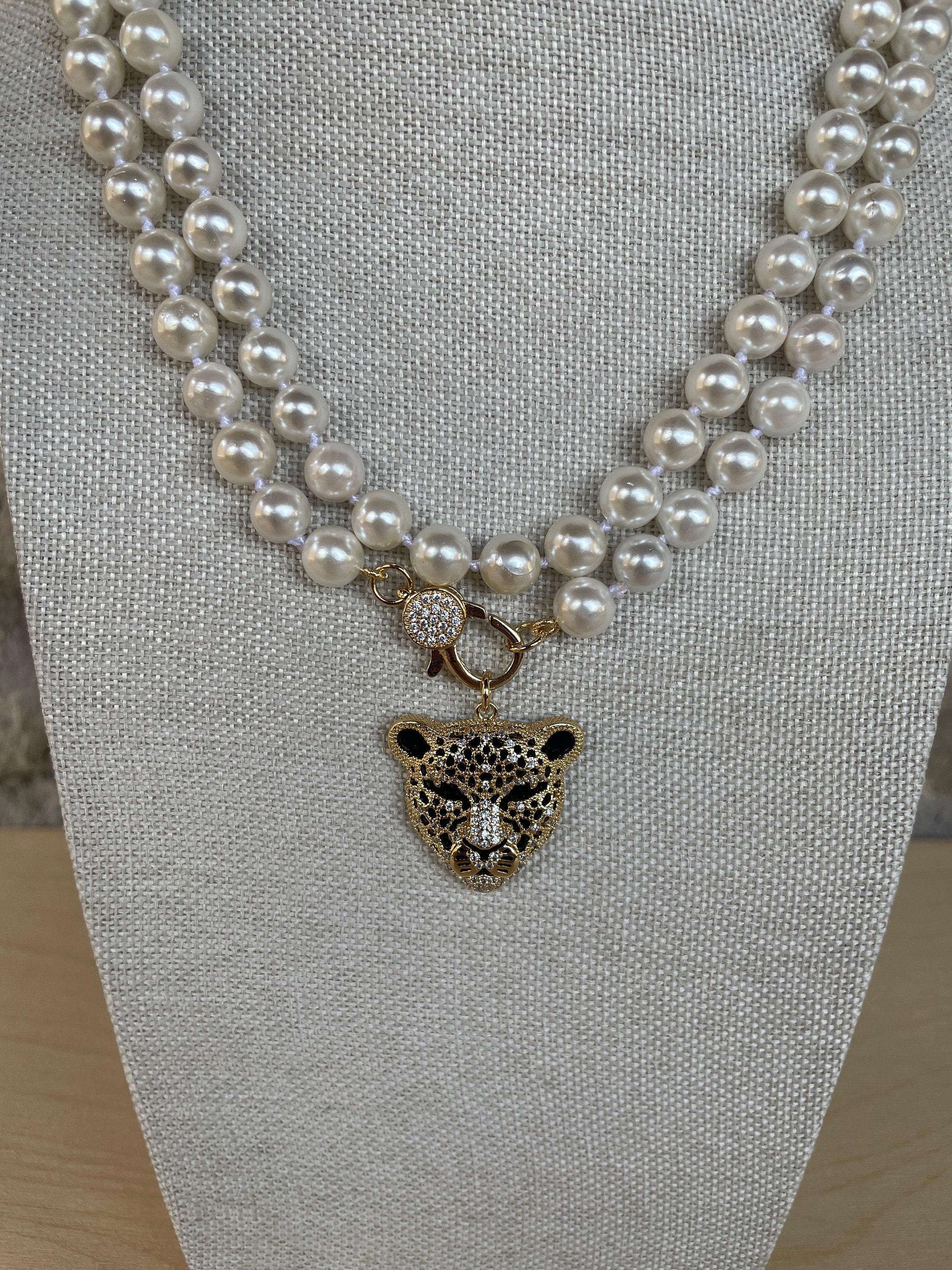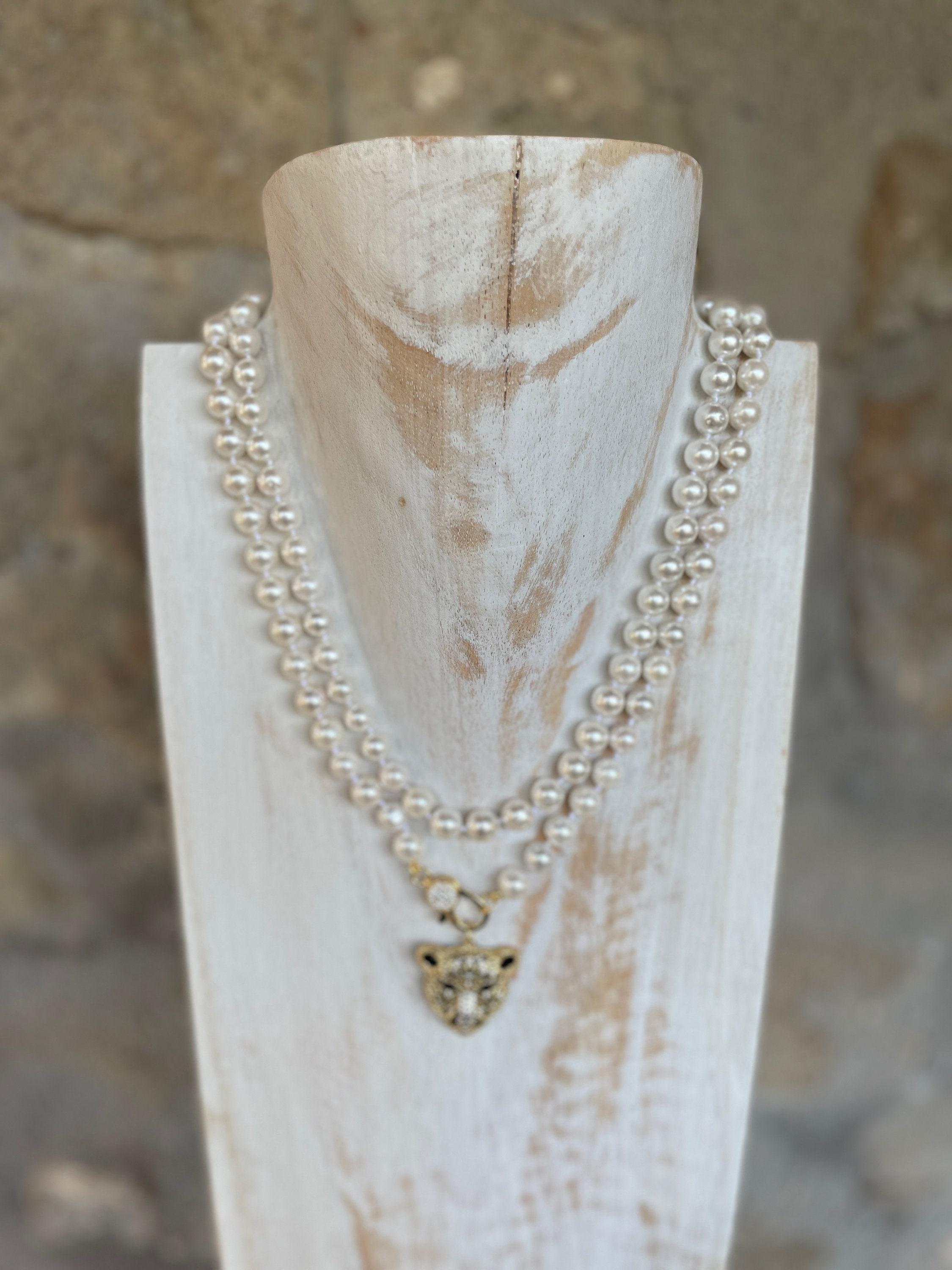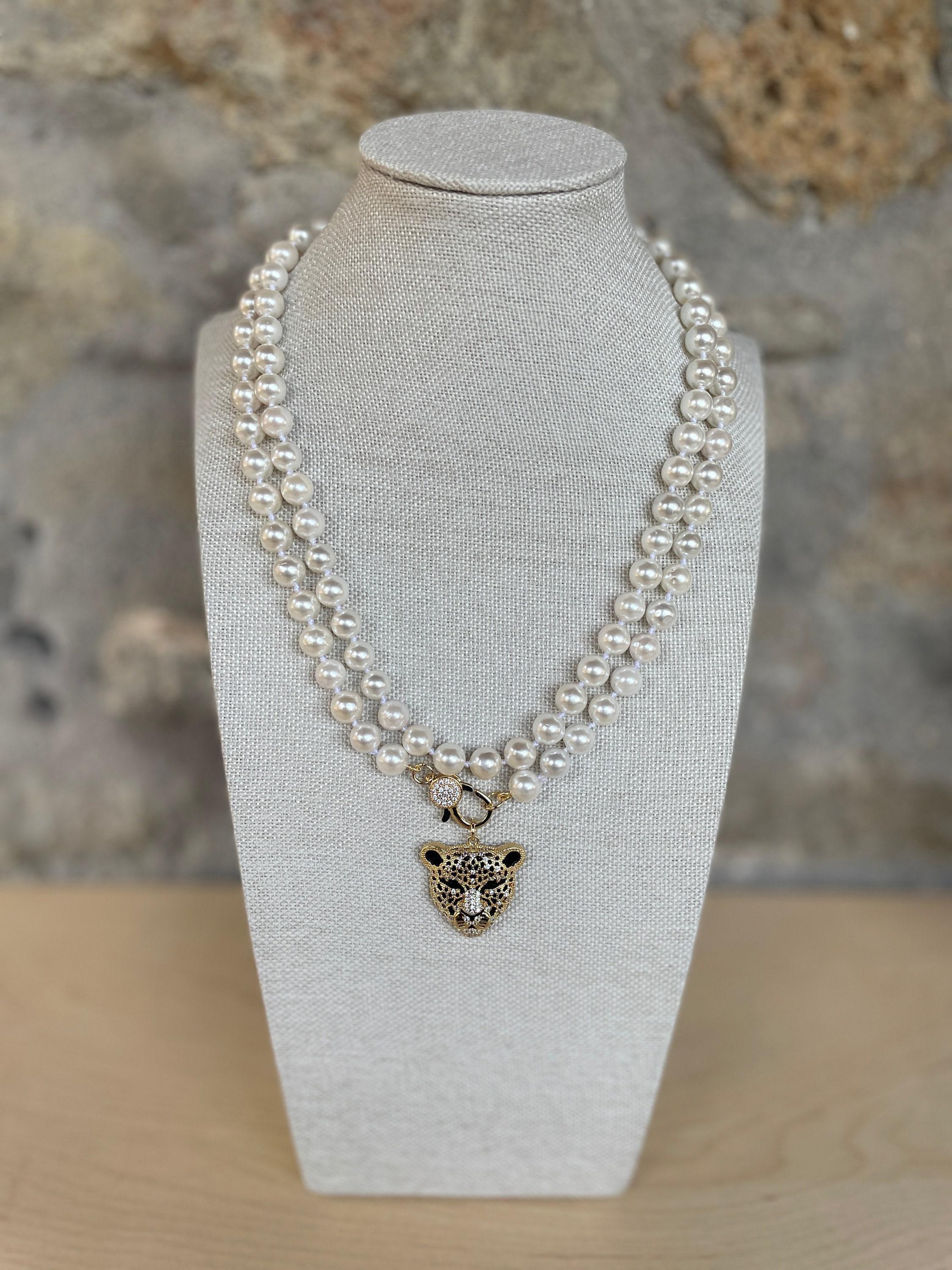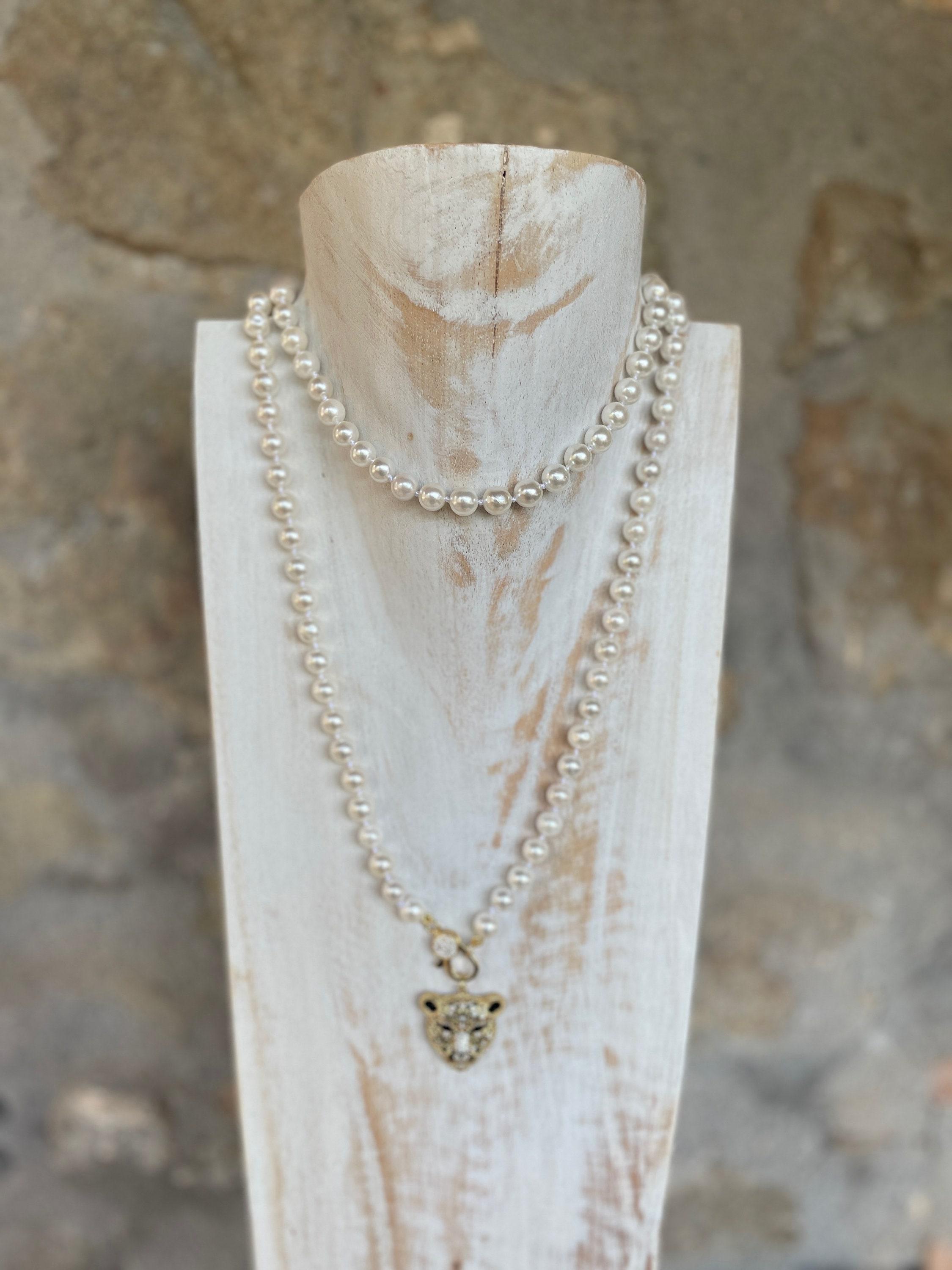 Un lungo filo di bellissime perle di Maiorca (8 mm), annodate a mano singolarmente, espressione di uno stile classico, abbinato ad una moderna chiusura gioiello a moschettone ricoperta di zirconi.