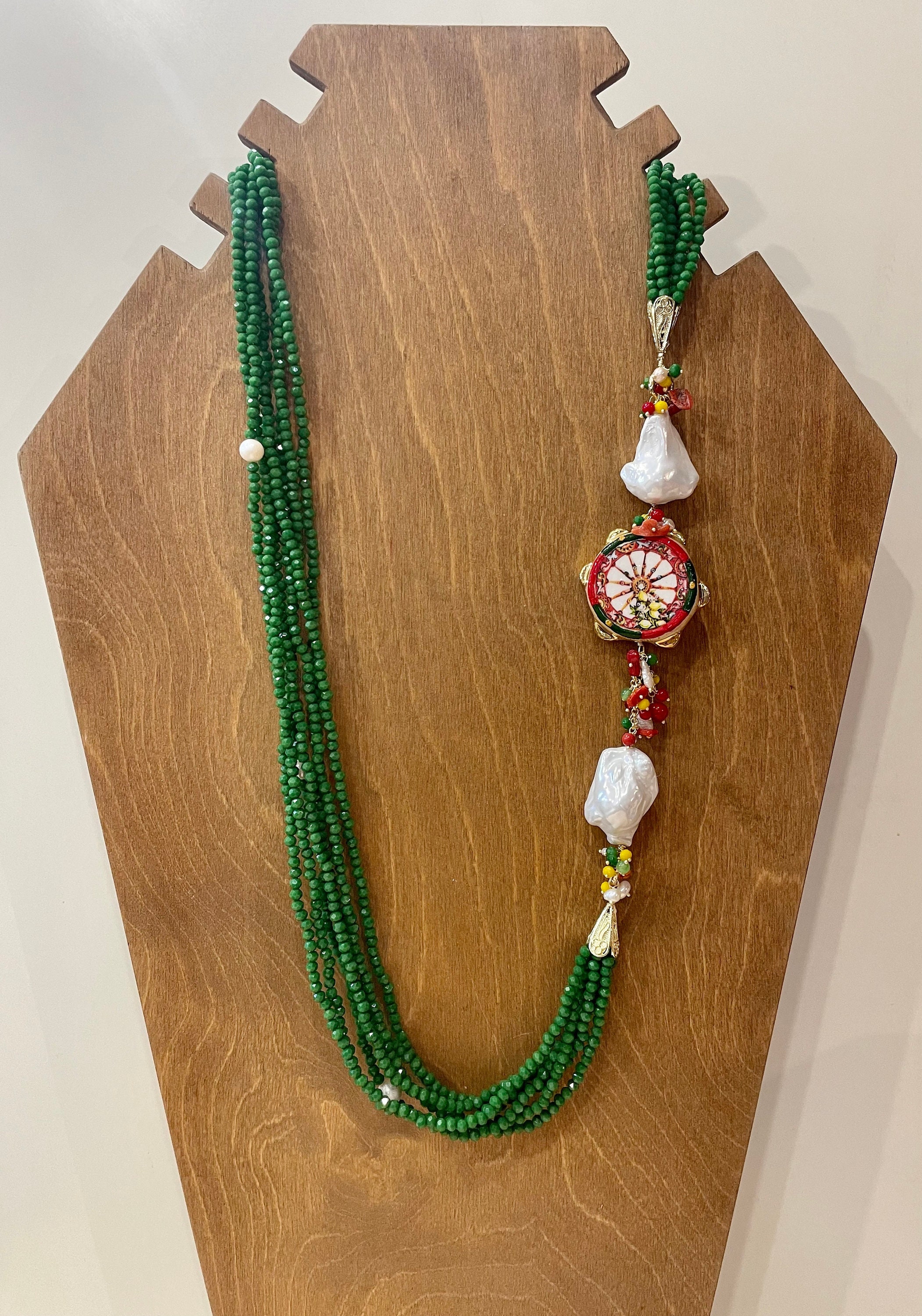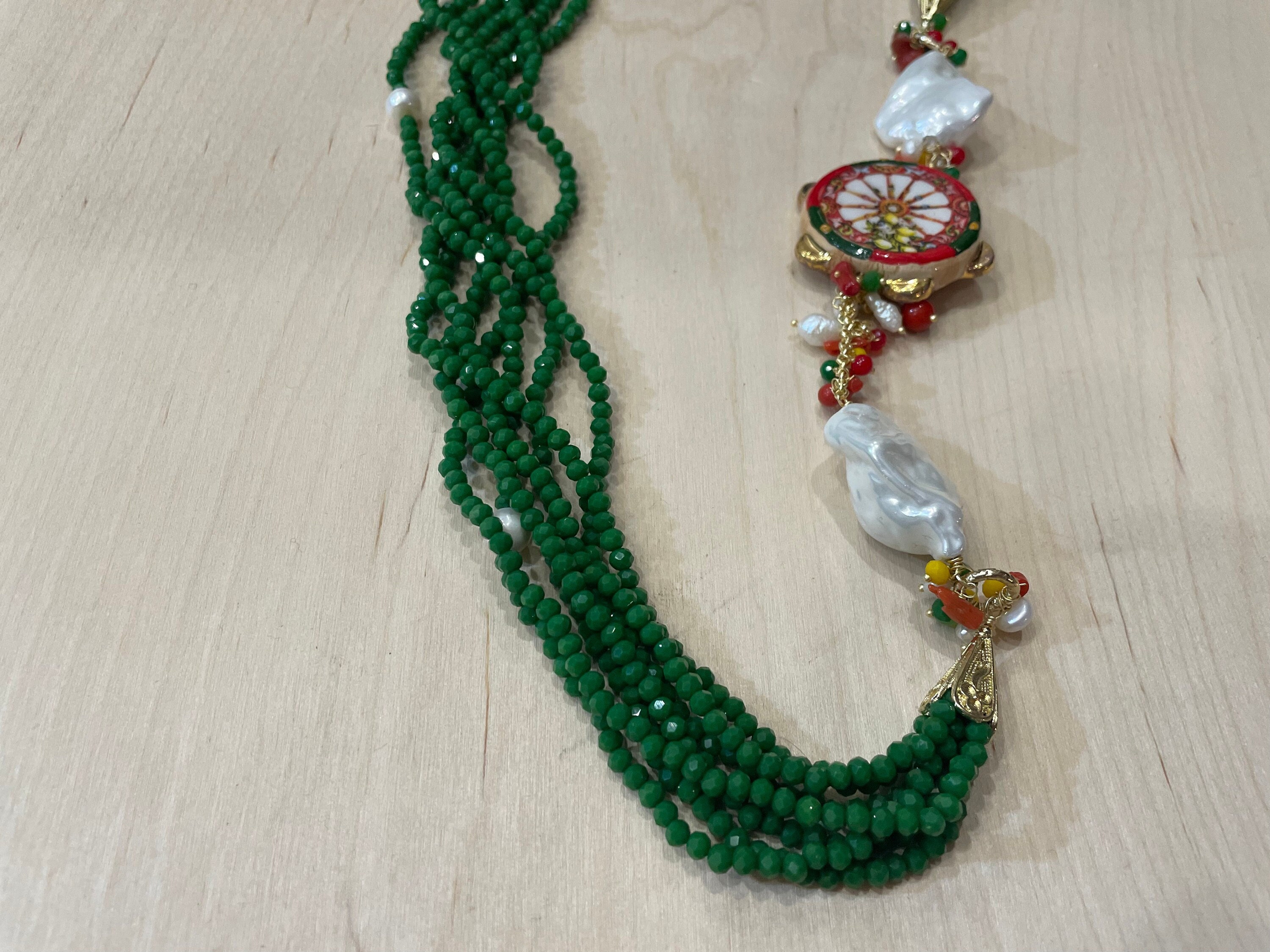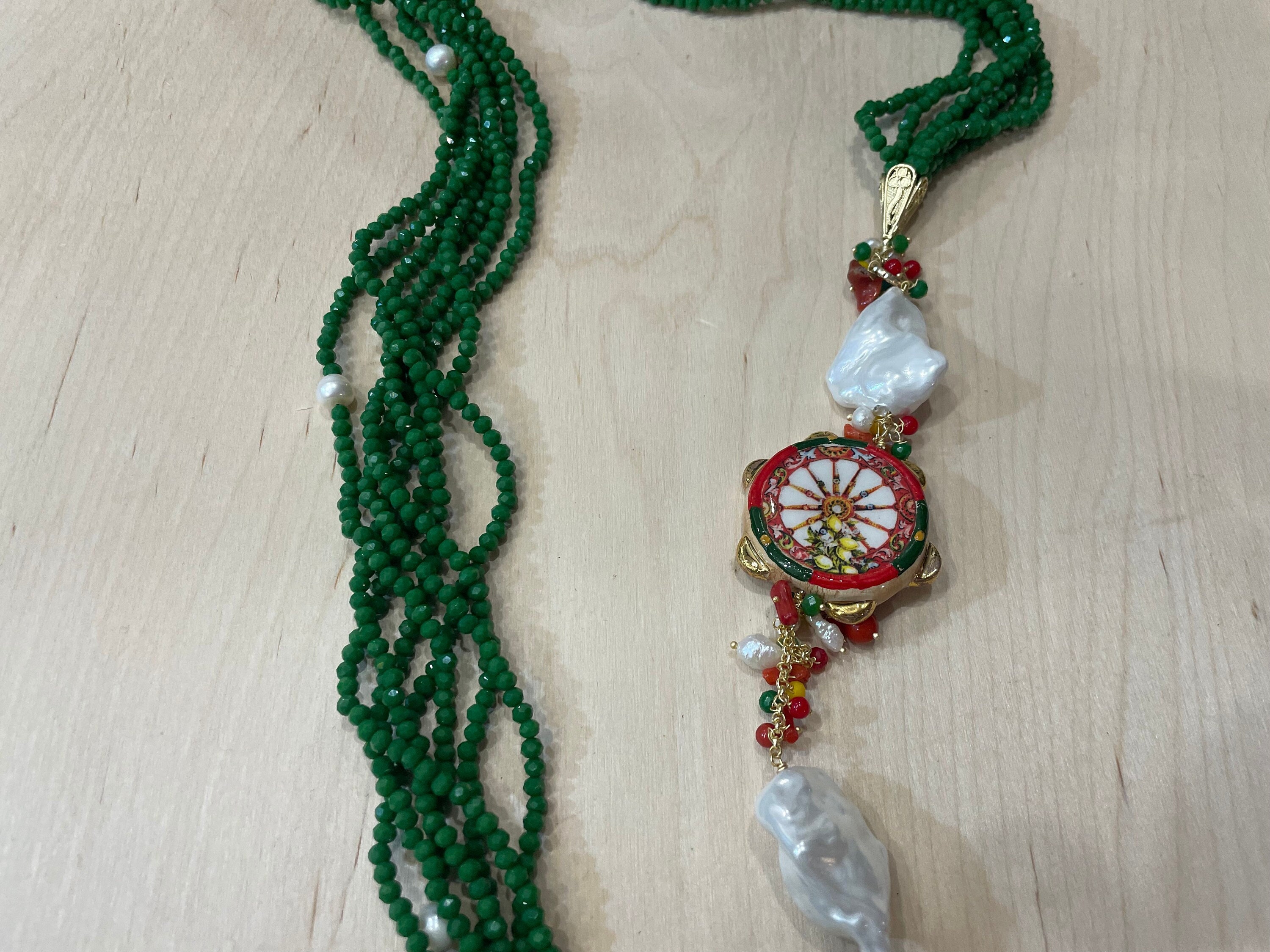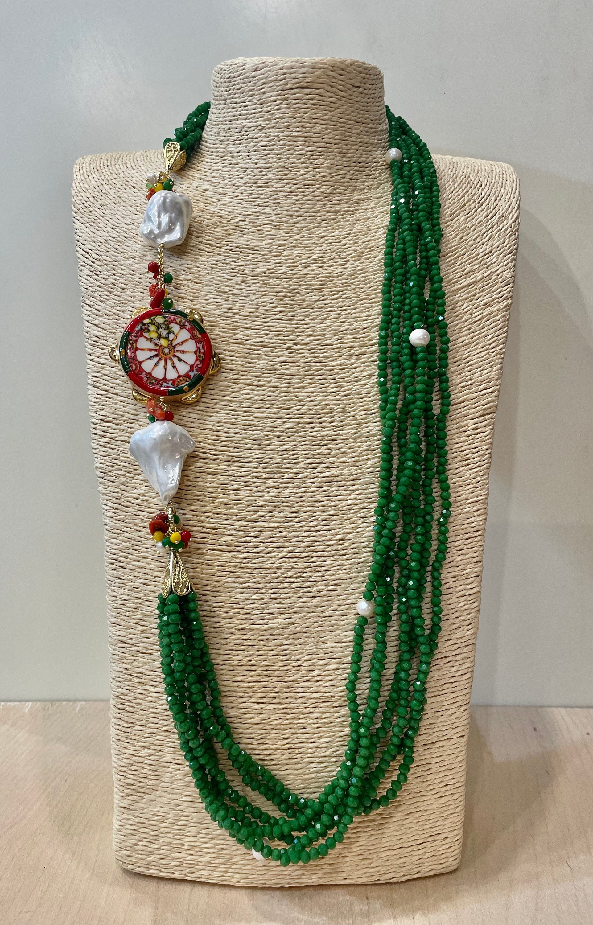 Collana lunga, multifilo con cristalli, tamburello di ceramica di Caltagirone, perle scaramazze e pietre dure.