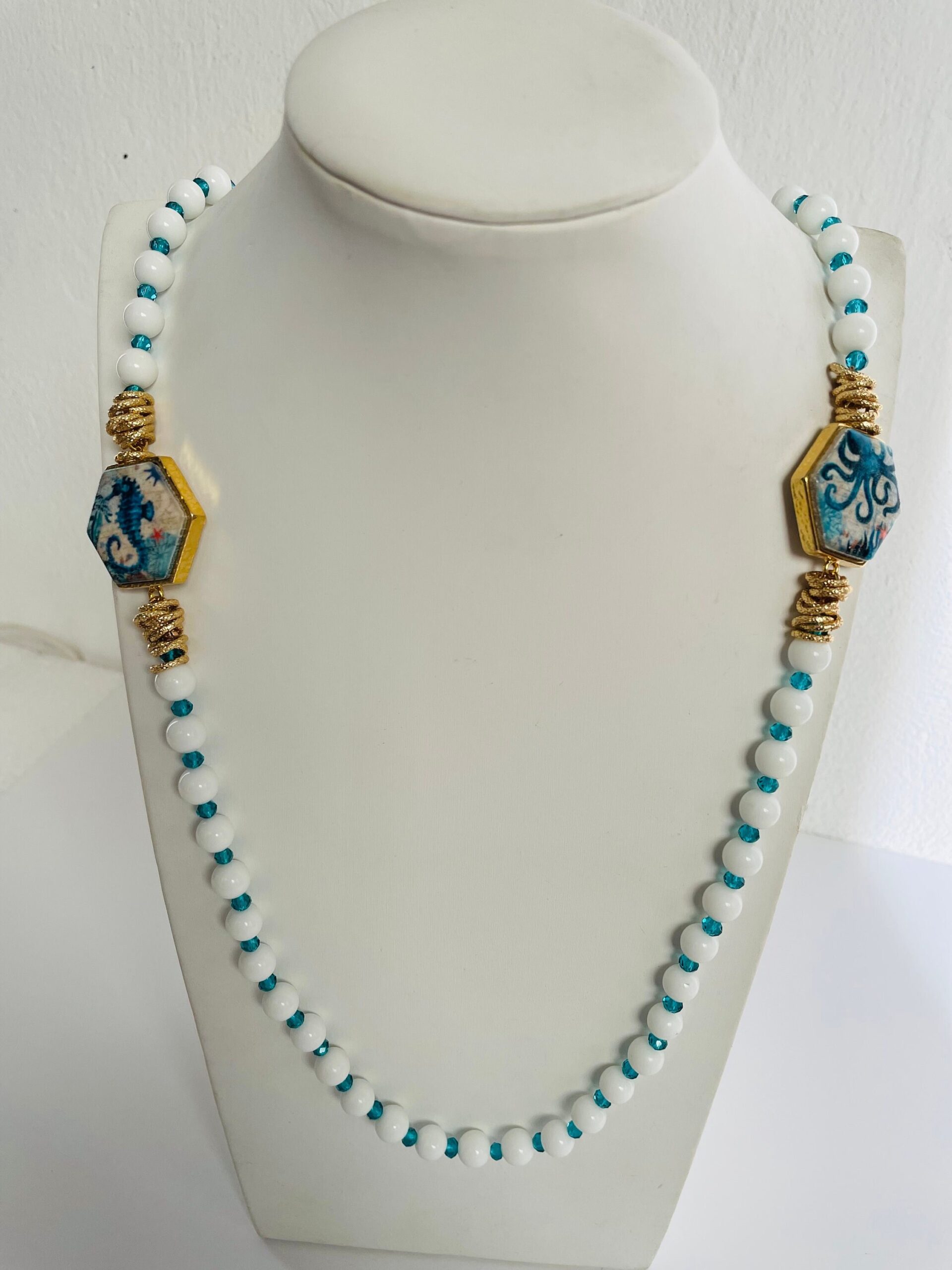 Collana originale fatta con perle di Agata bianca piccole e perle di cristallo turchesi.