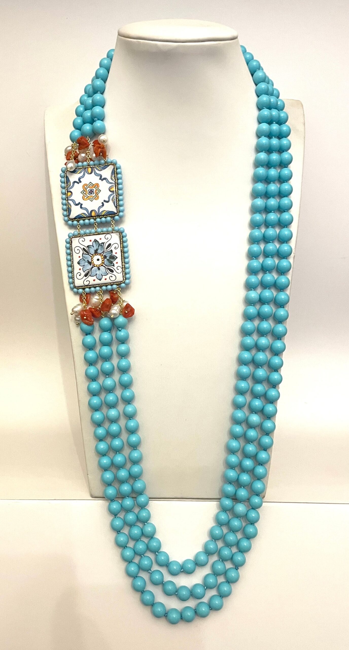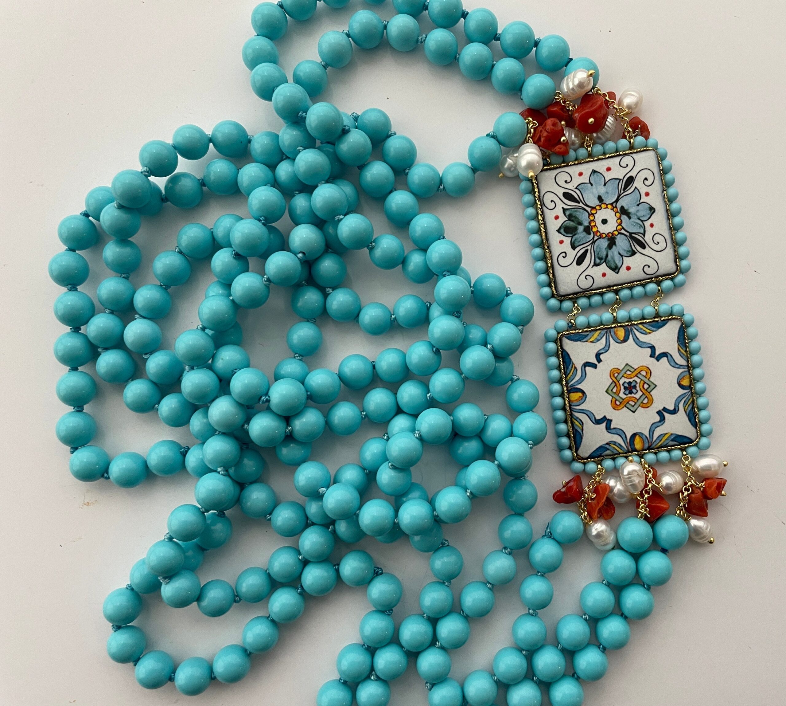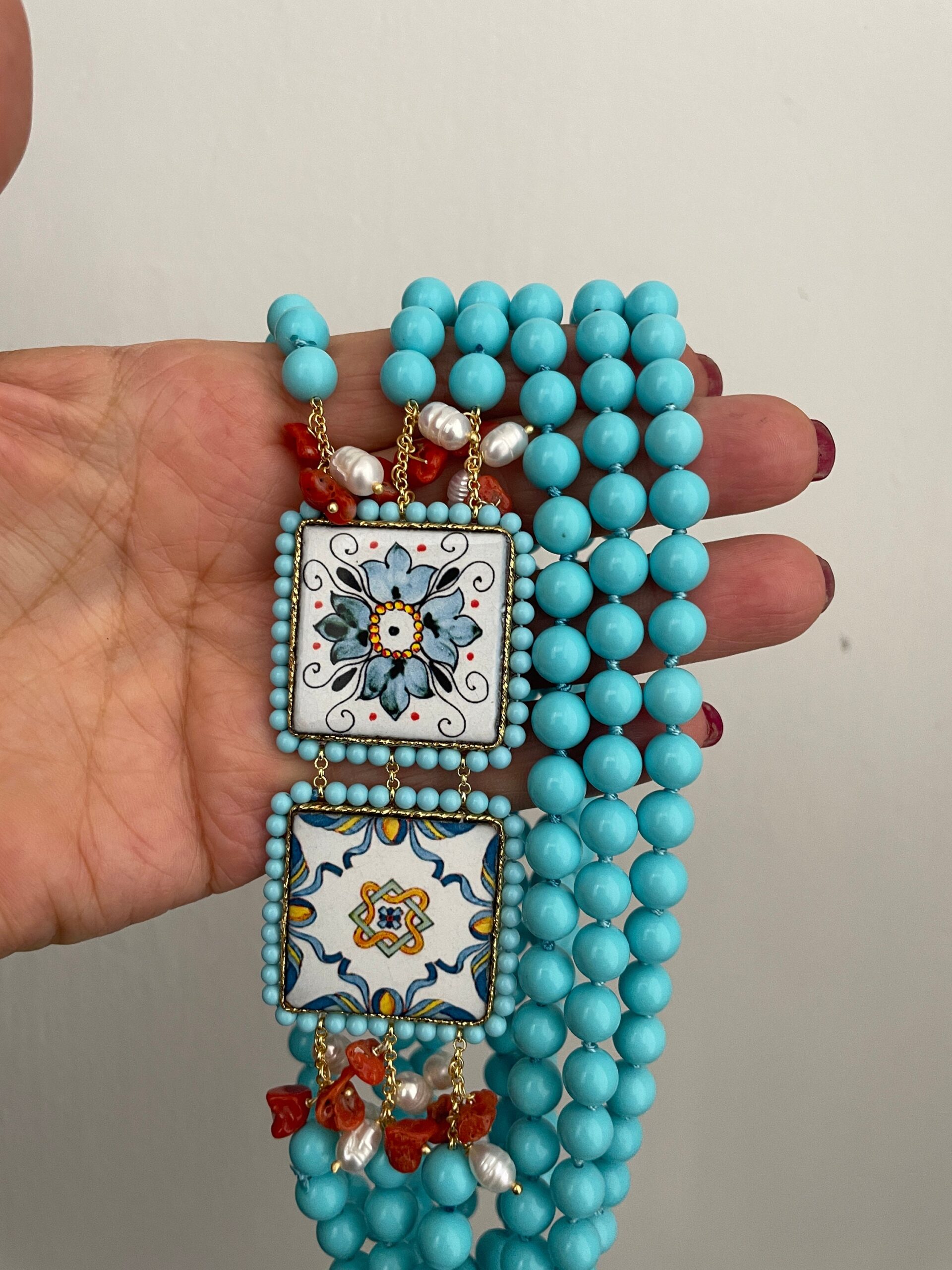 Realizzata con tre fili di perle di pasta di Turchese singolarmente annodate e due mattonelle in ceramica di Caltagirone, stampate in superficie.
