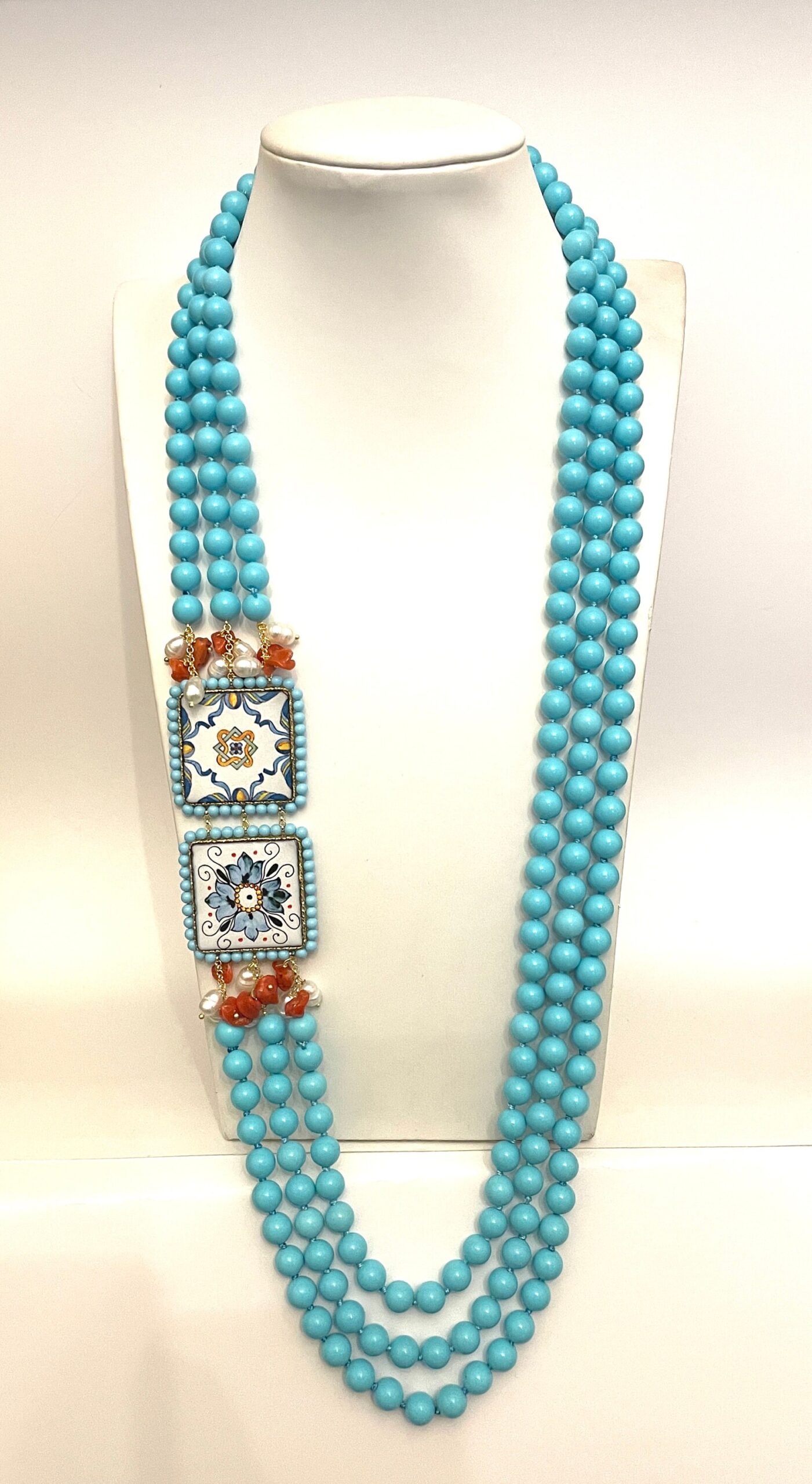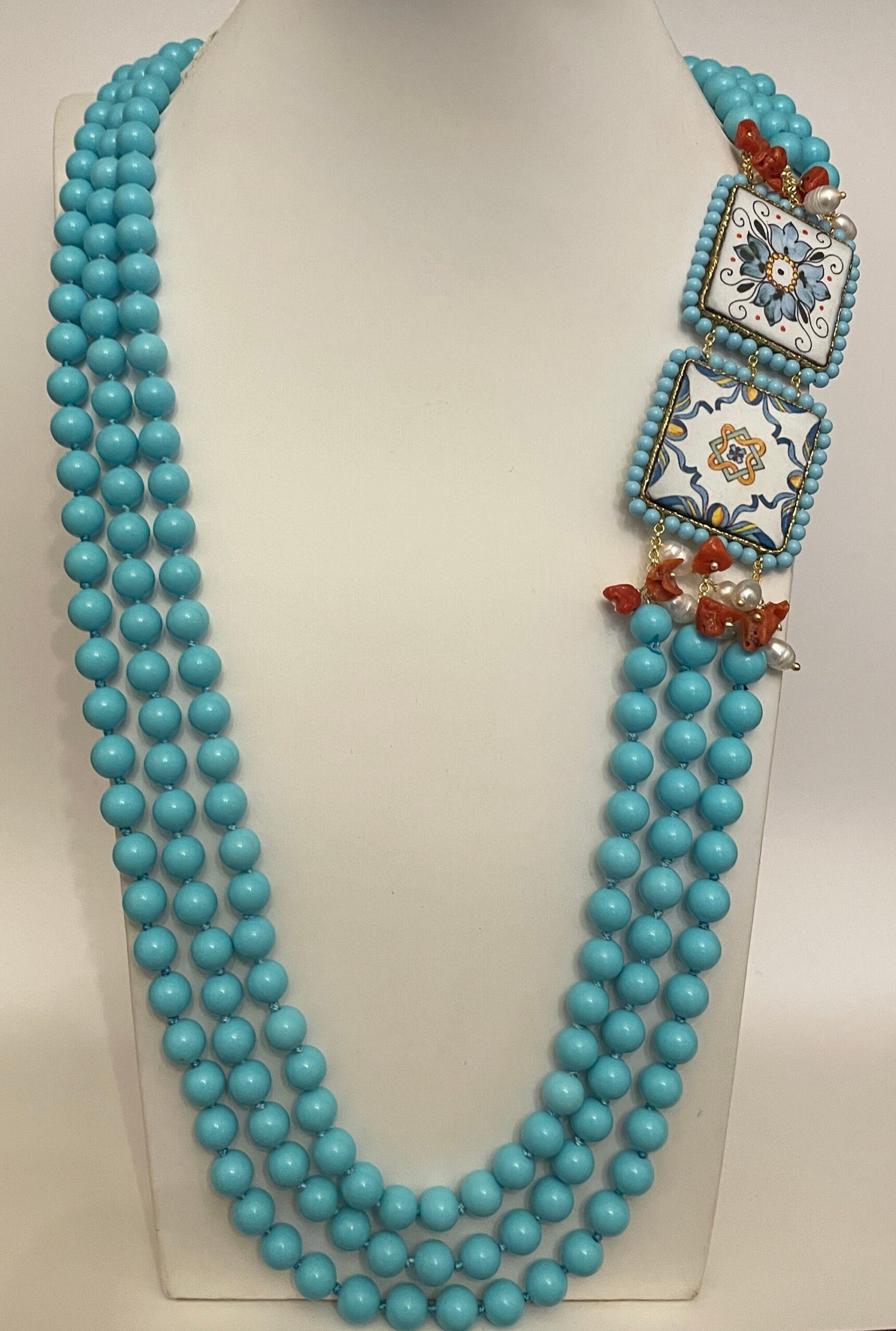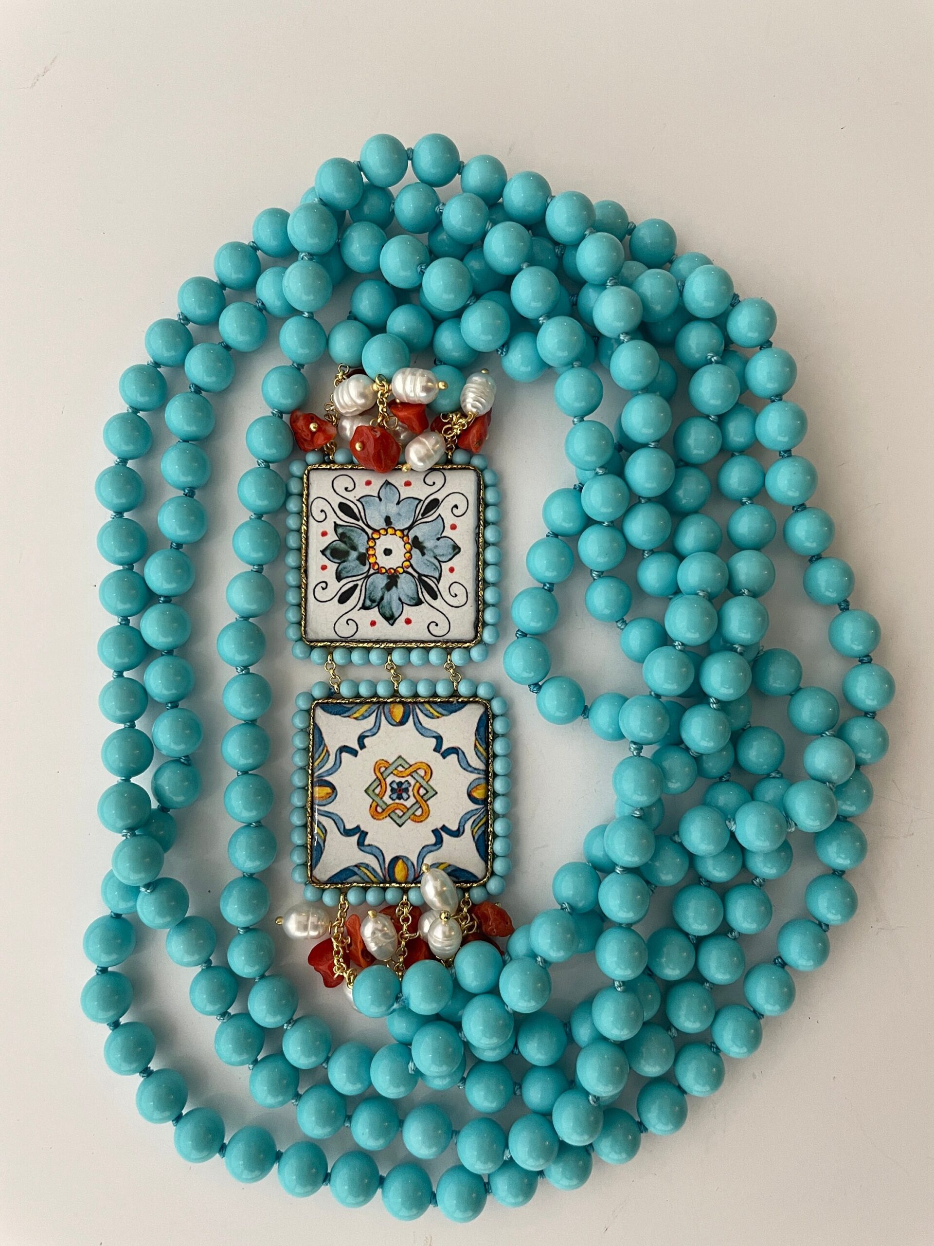 Realizzata con tre fili di perle di pasta di Turchese singolarmente annodate e due mattonelle in ceramica di Caltagirone, stampate in superficie.