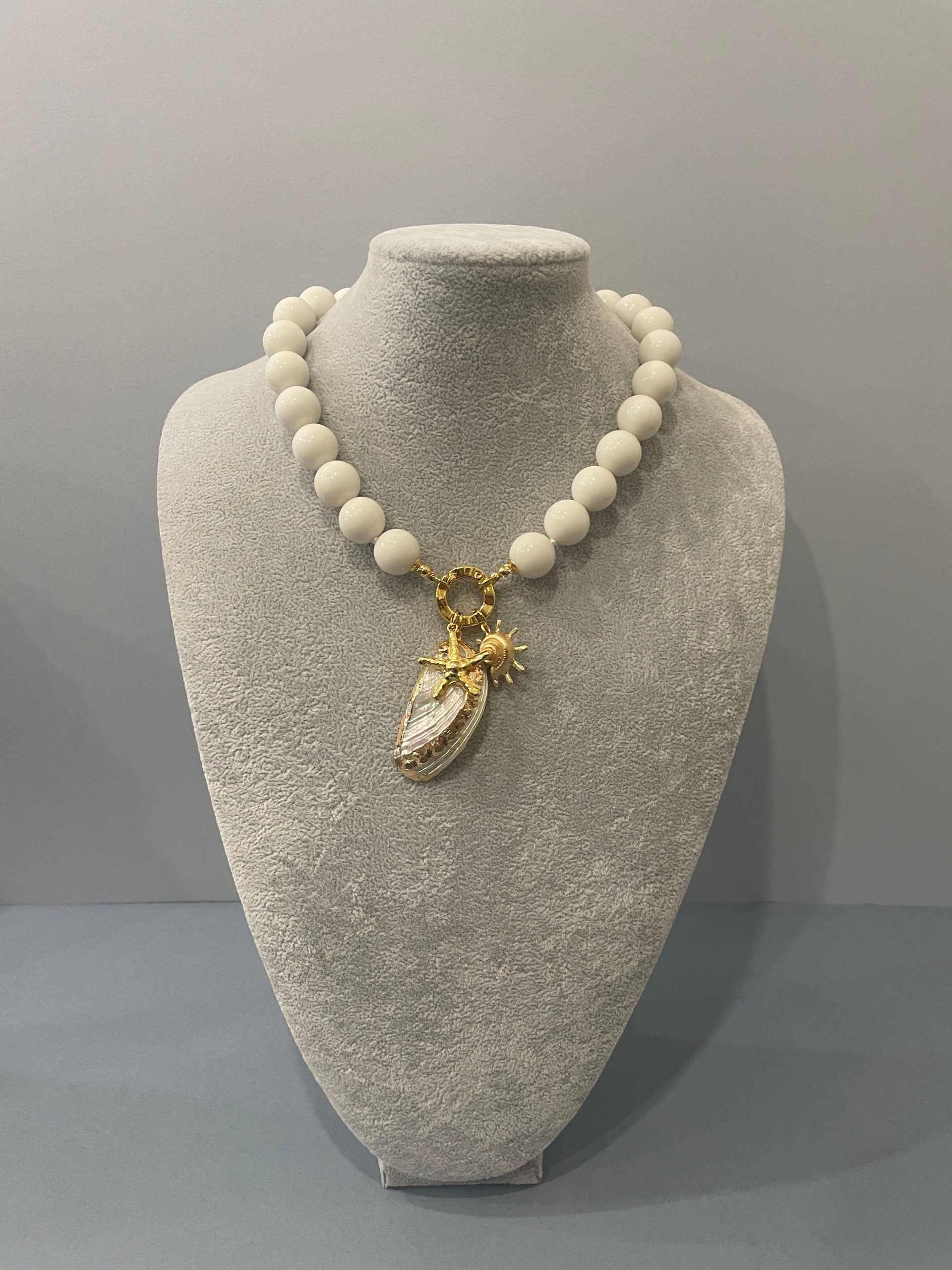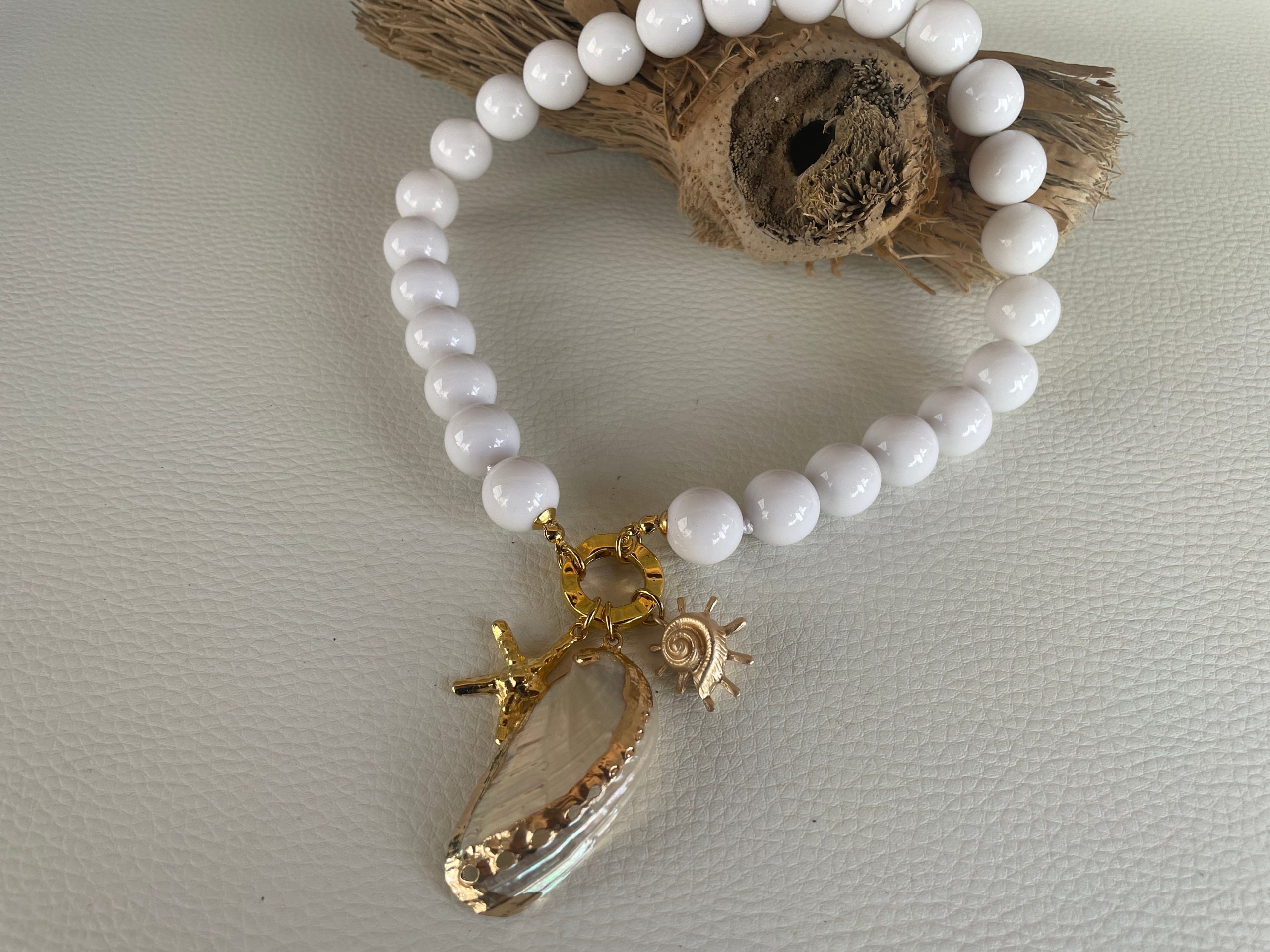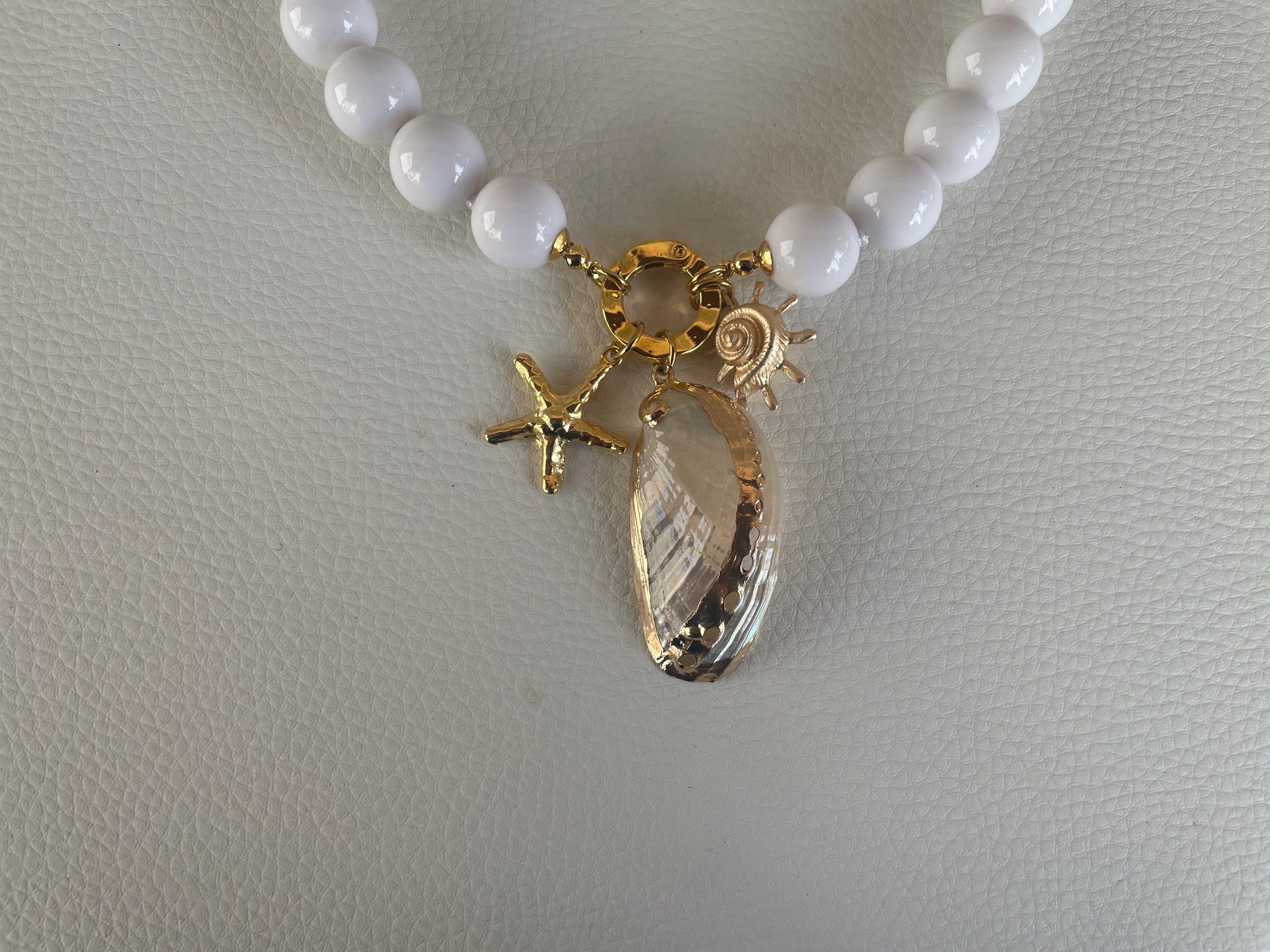 Chiusura gioiello in acciaio inox, placcato oro 14k, e pendenti centralmente 3 ciondoli marini: una grande conchiglia naturale, e altri due ciondoli in zama oro.