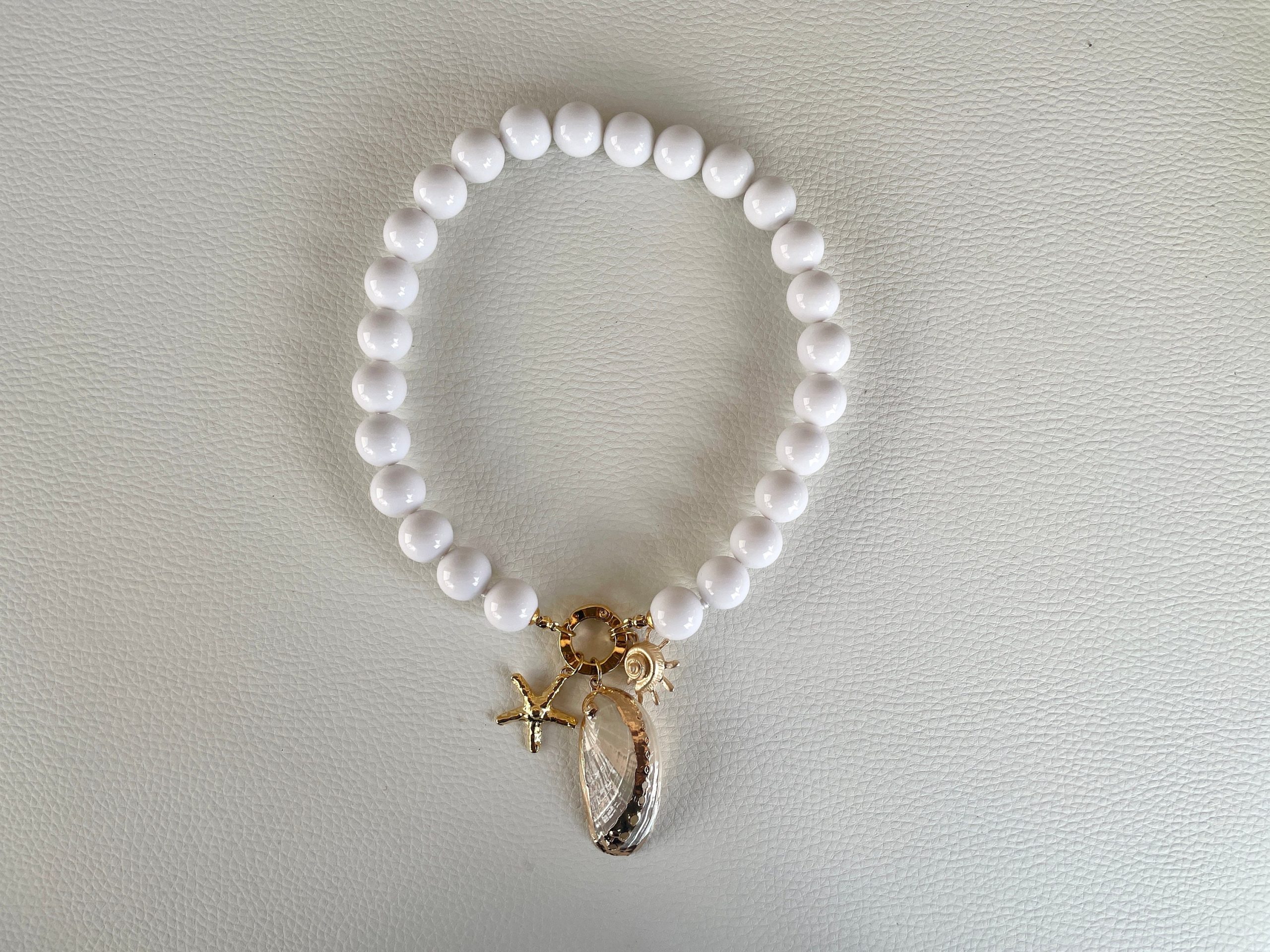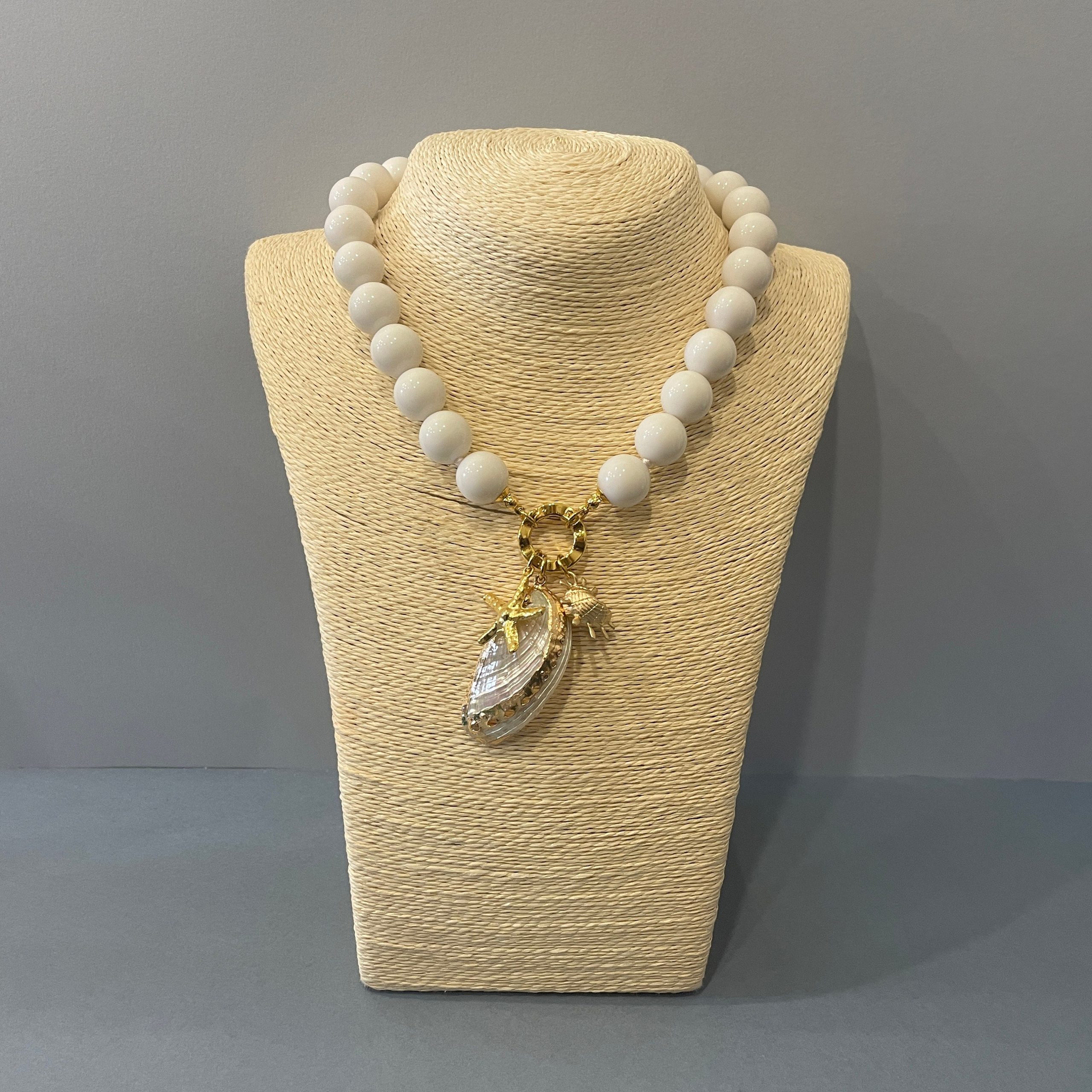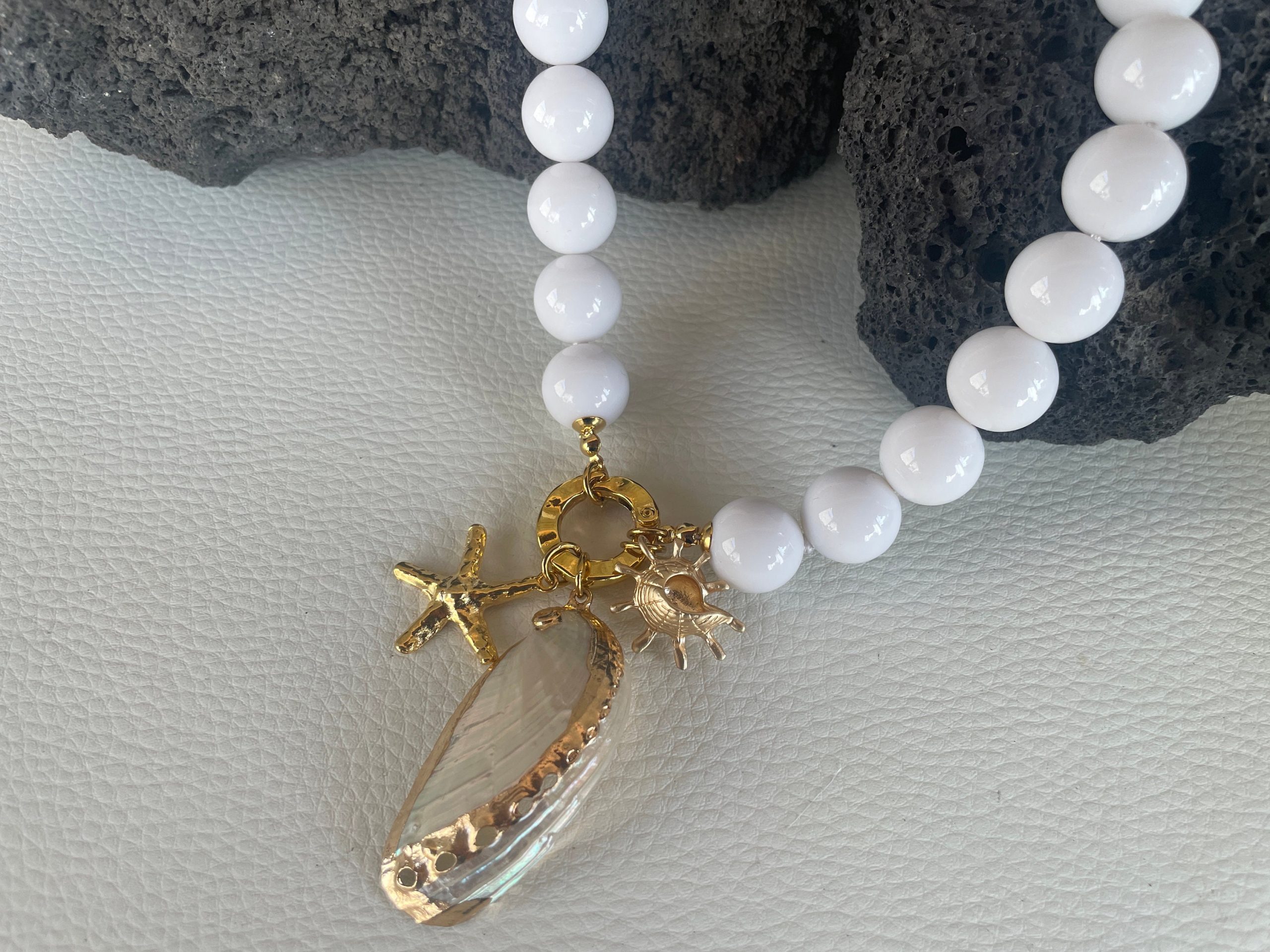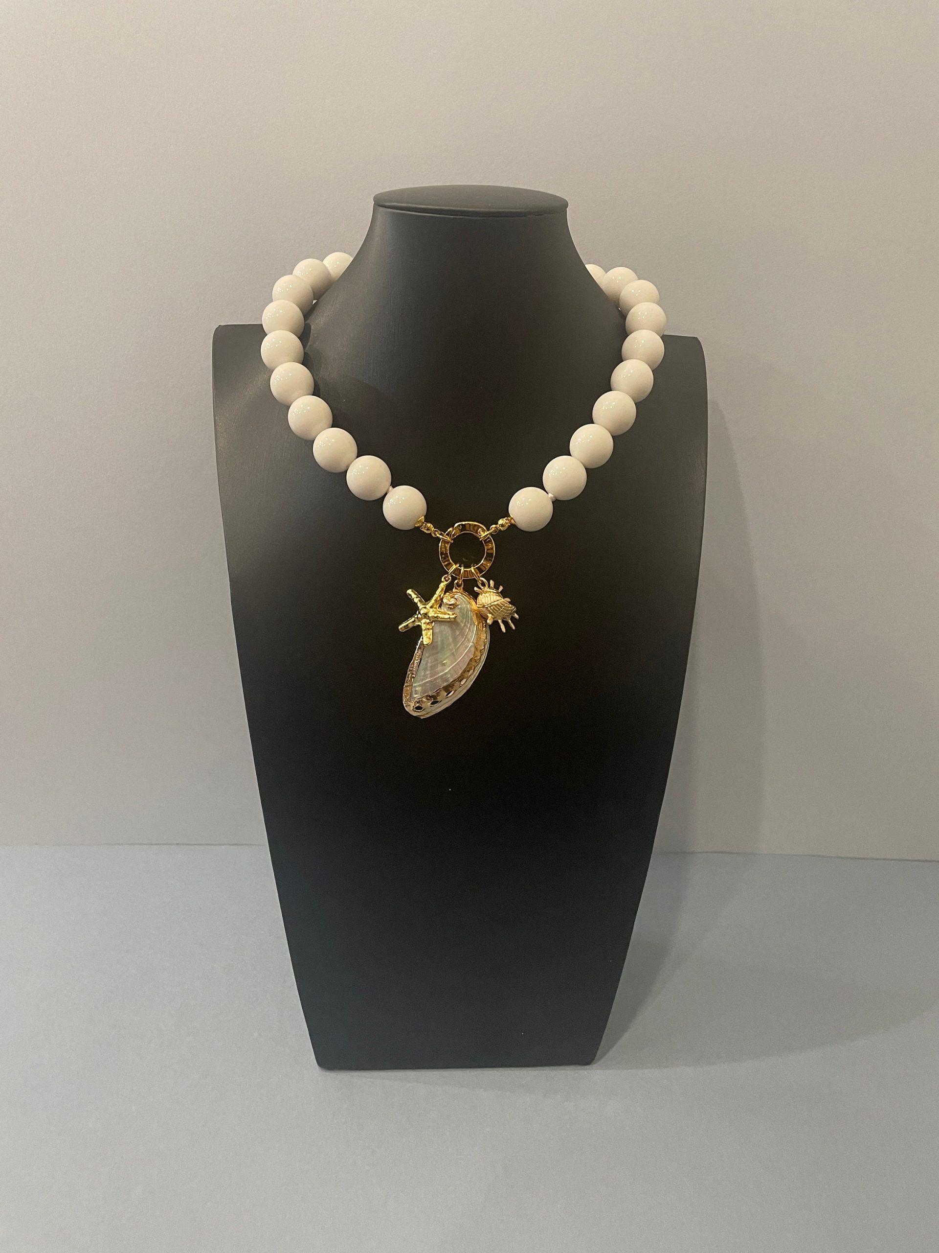 Chiusura gioiello in acciaio inox, placcato oro 14k, e pendenti centralmente 3 ciondoli marini: una grande conchiglia naturale, e altri due ciondoli in zama oro.