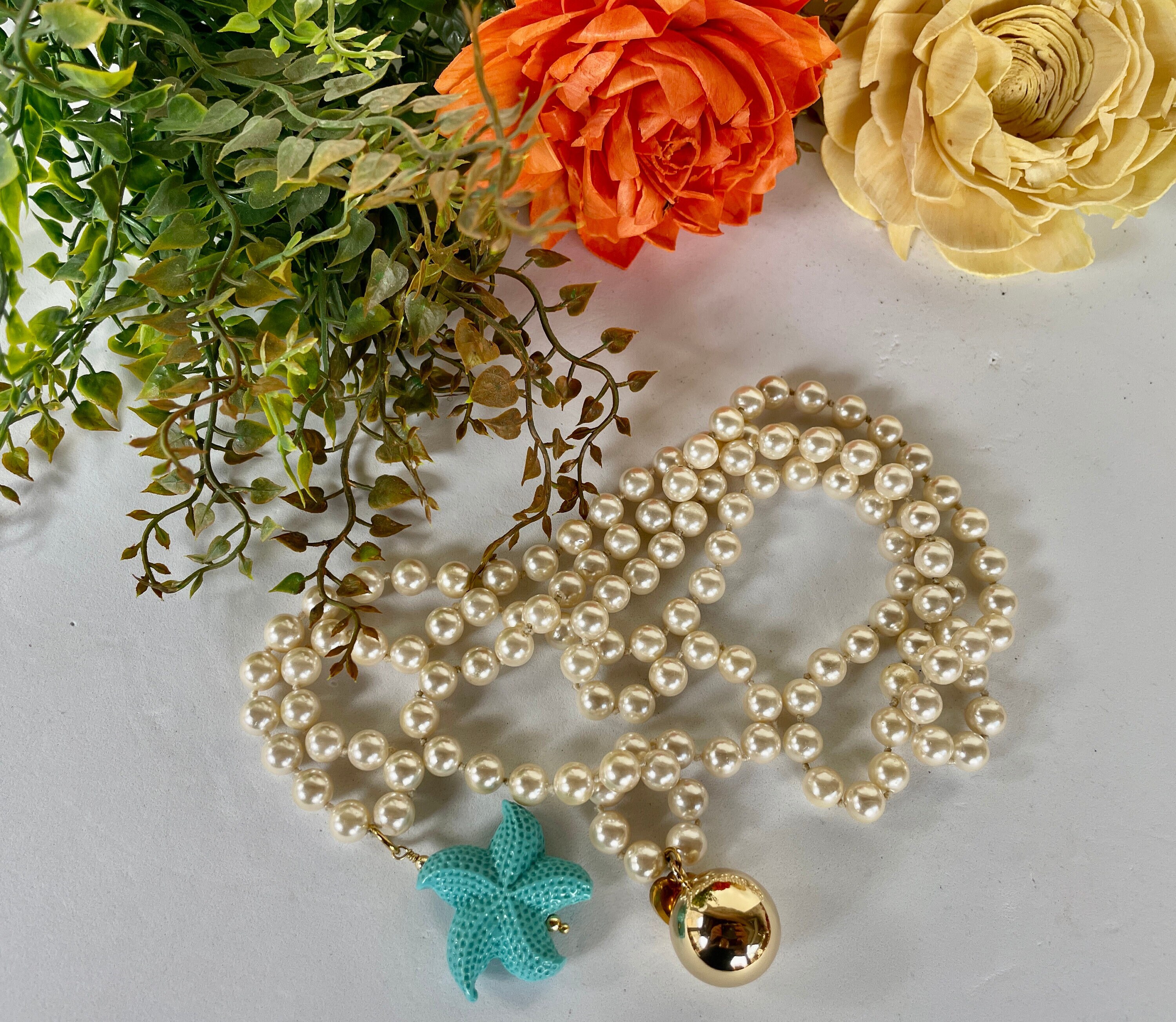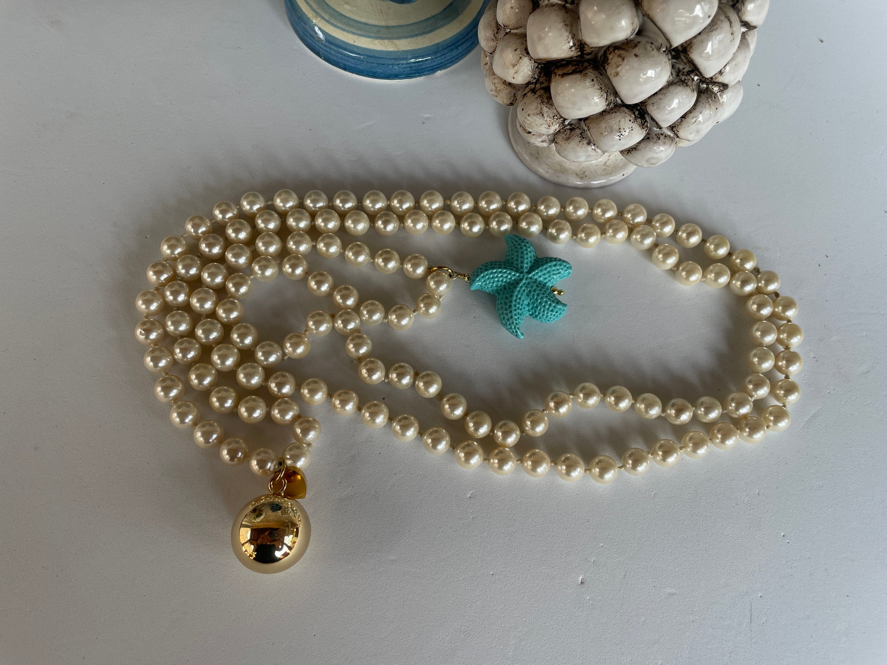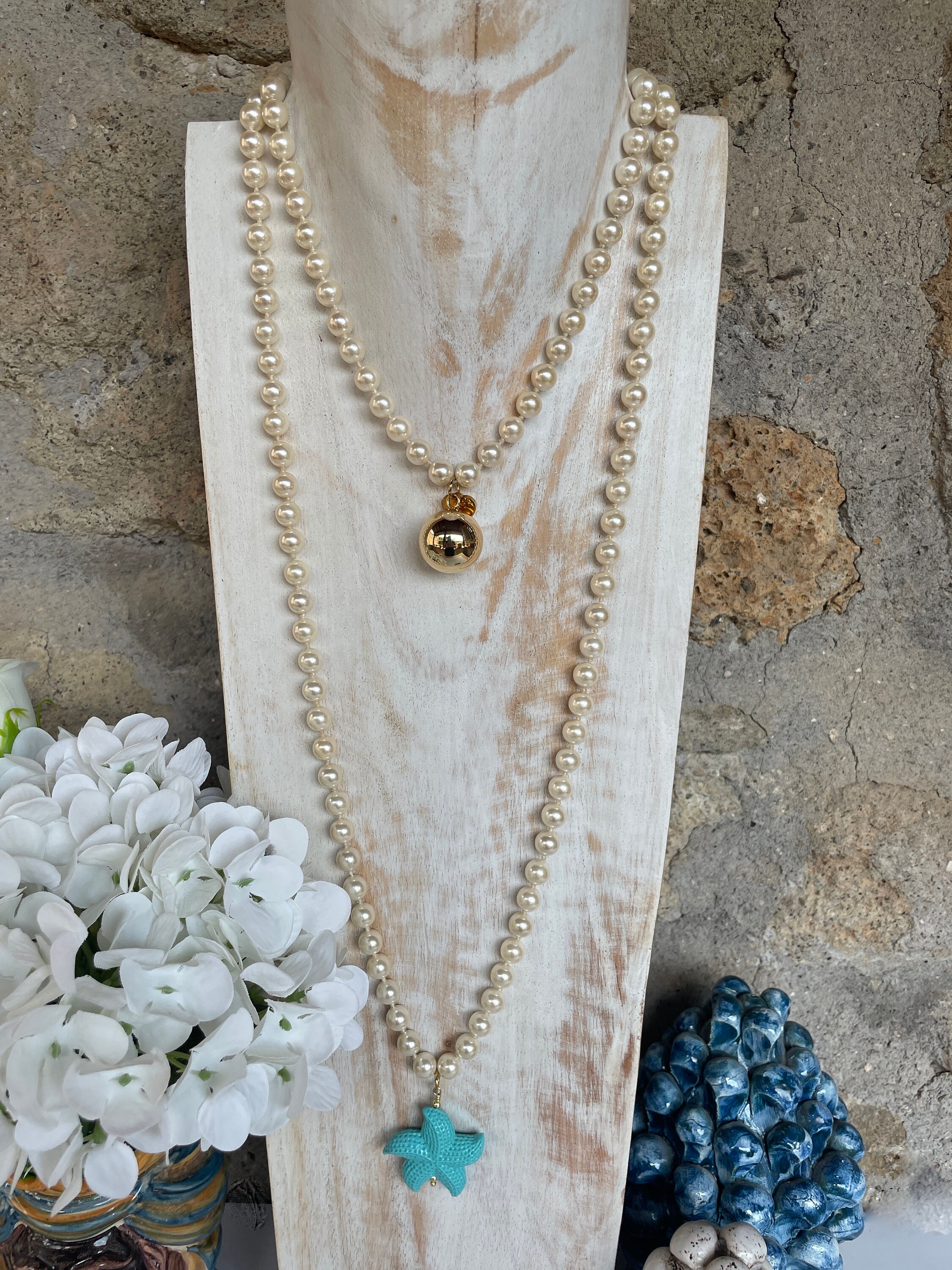 Splendida collana lunga da indossare in vari modi, annodata oppure doppia. E’ realizzata da un lungo filo di perle Maiorca bianche tutte singolarmente annodate.