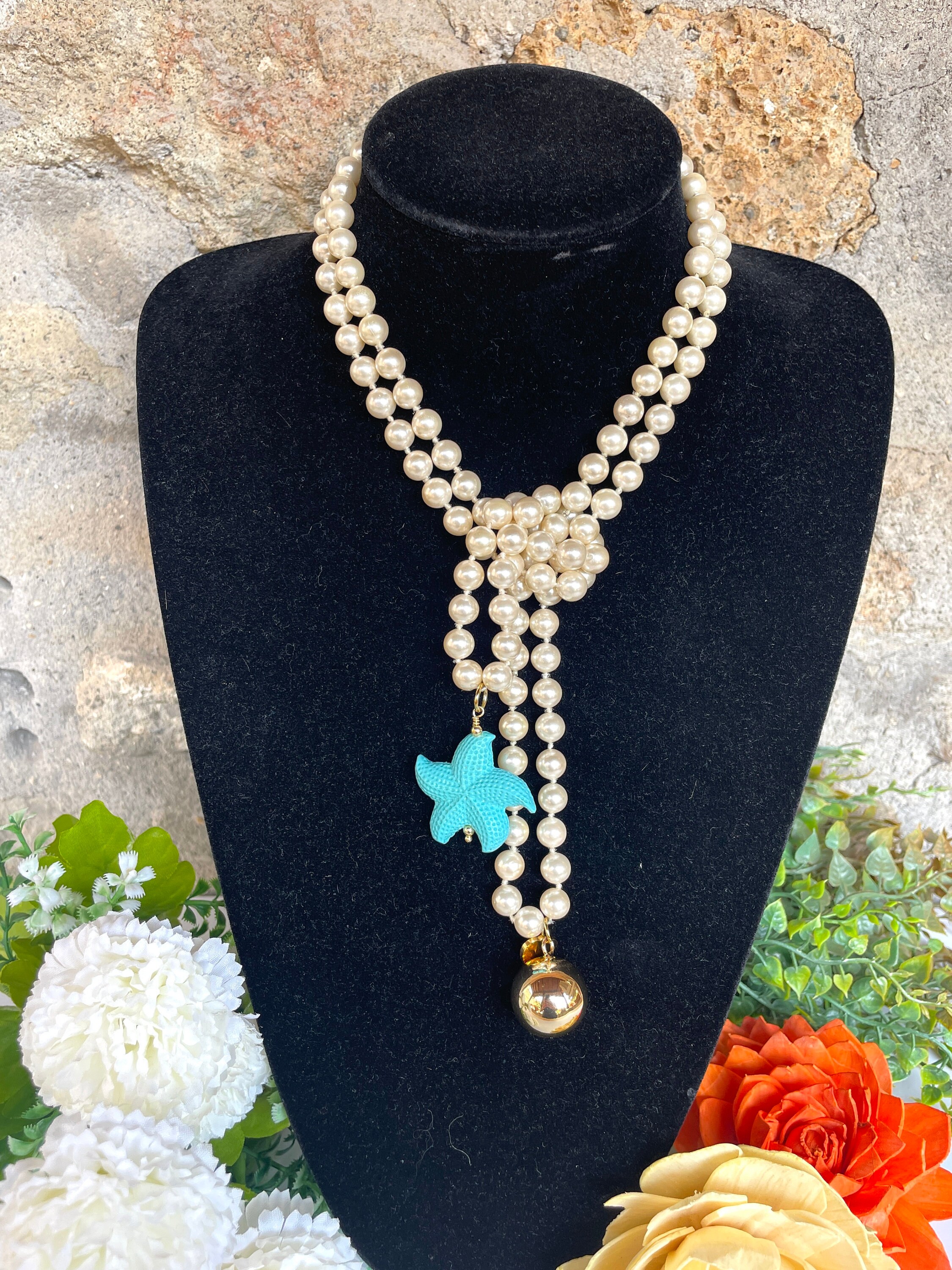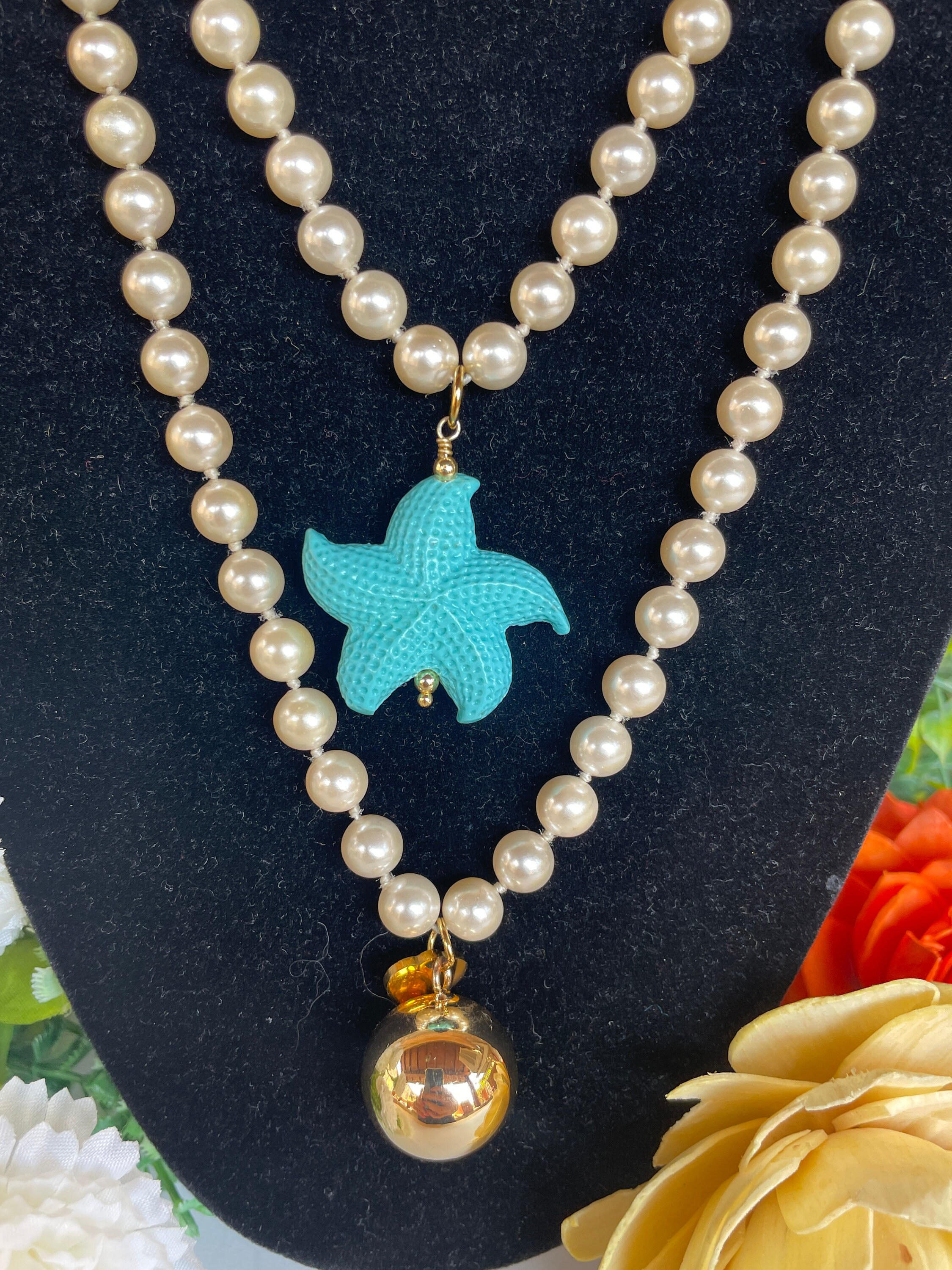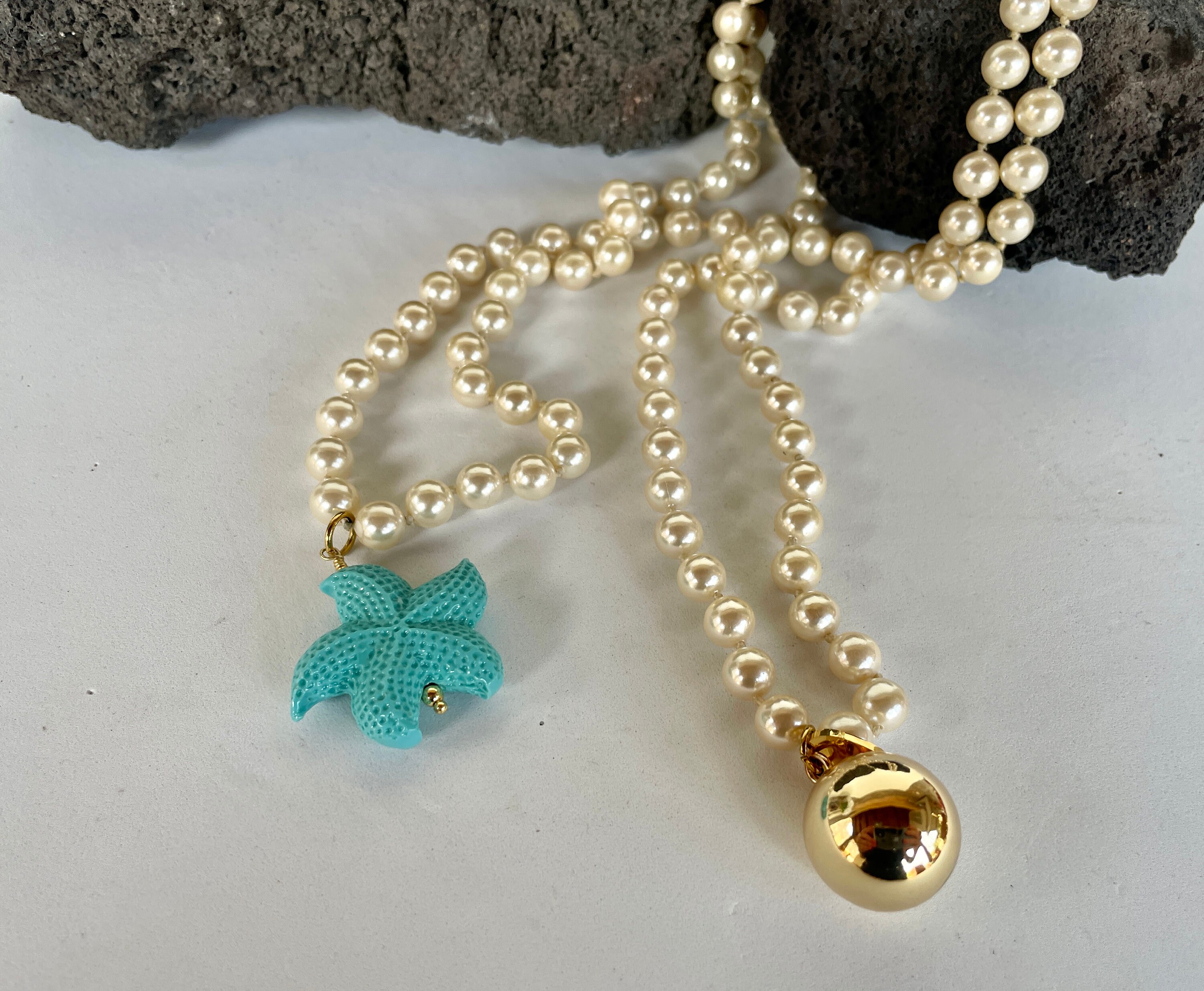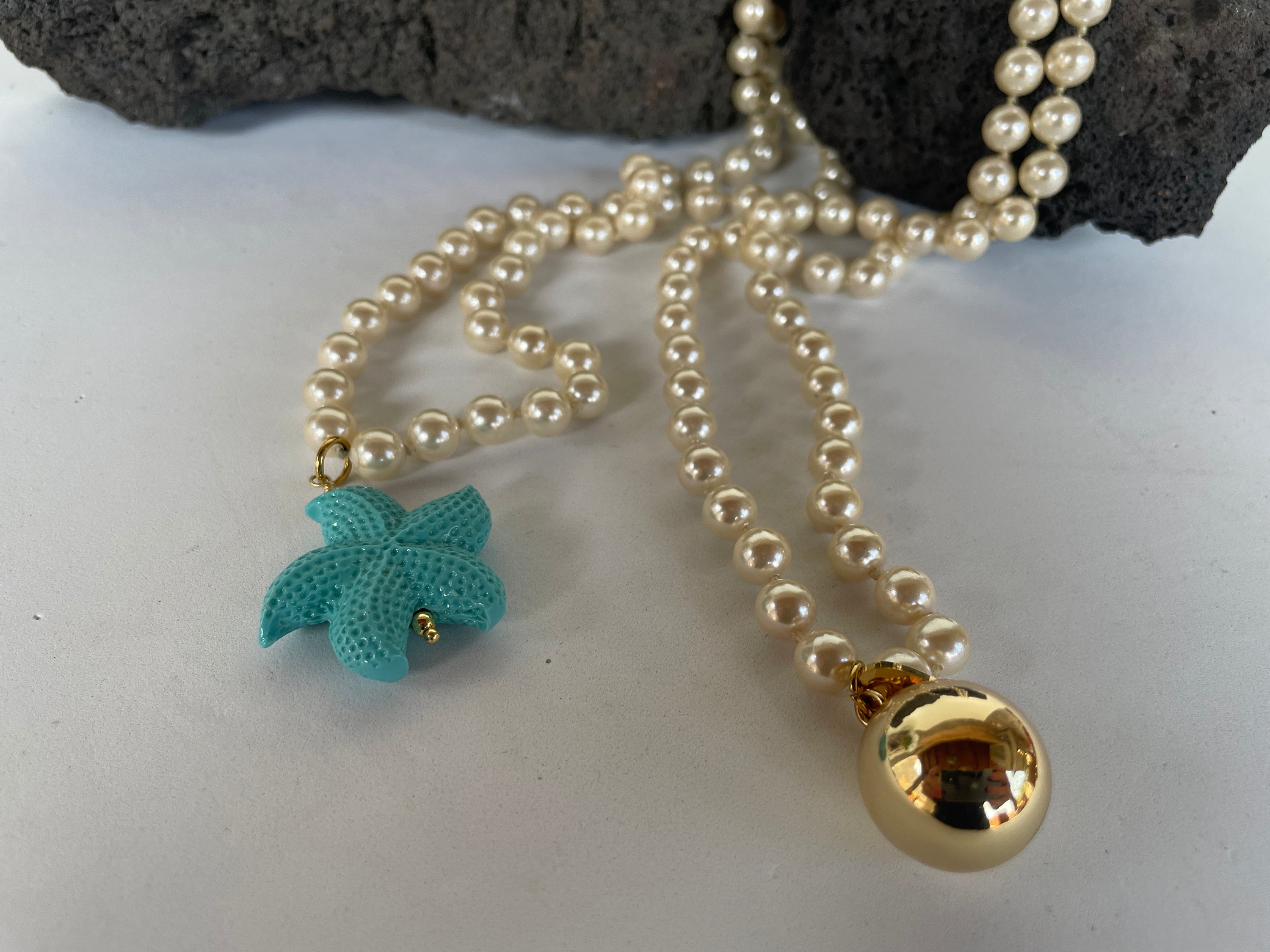 Alle estremità due ciondoli: una grande stella di resina celeste e una grande boule di acciaio placcato oro.