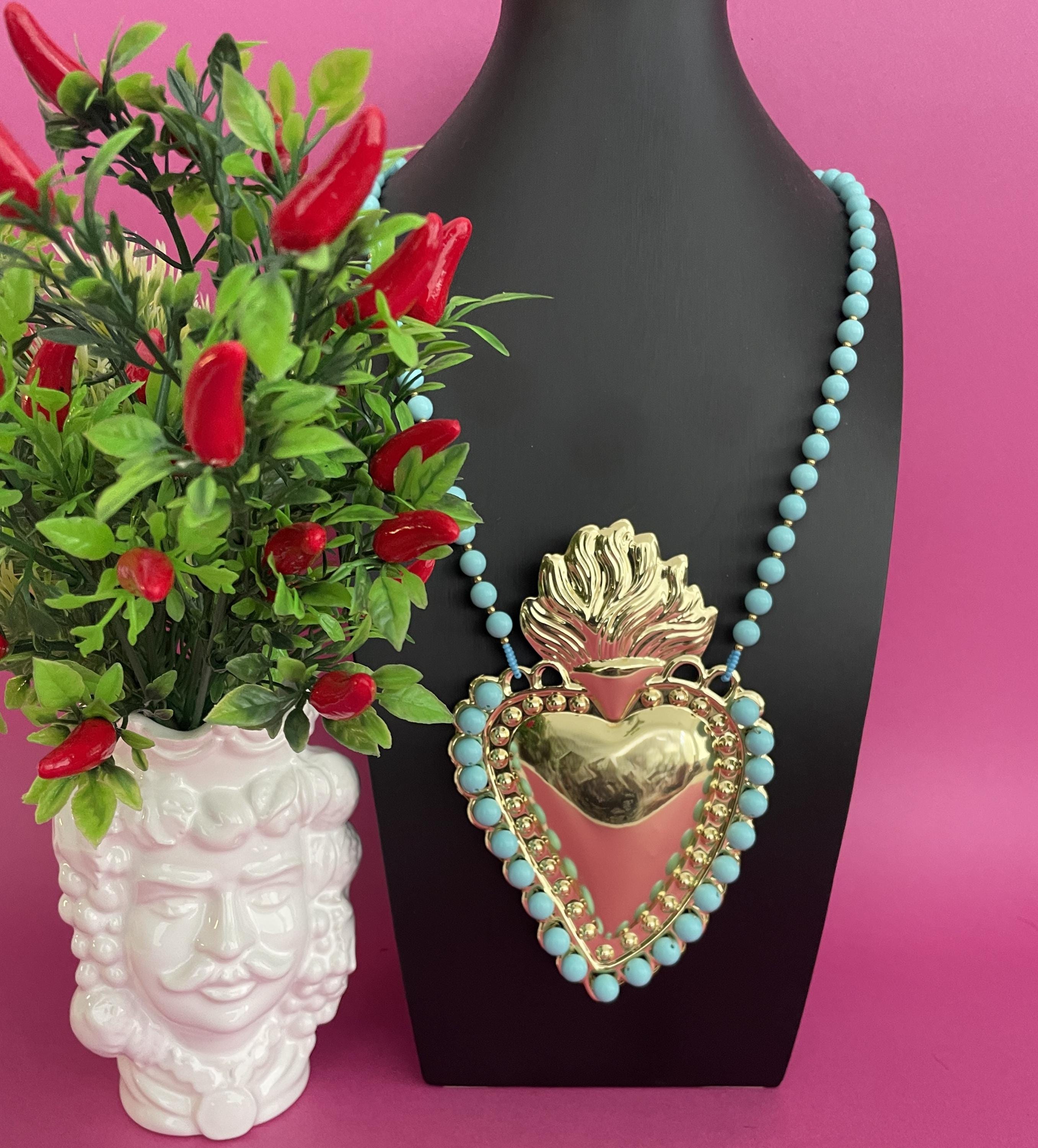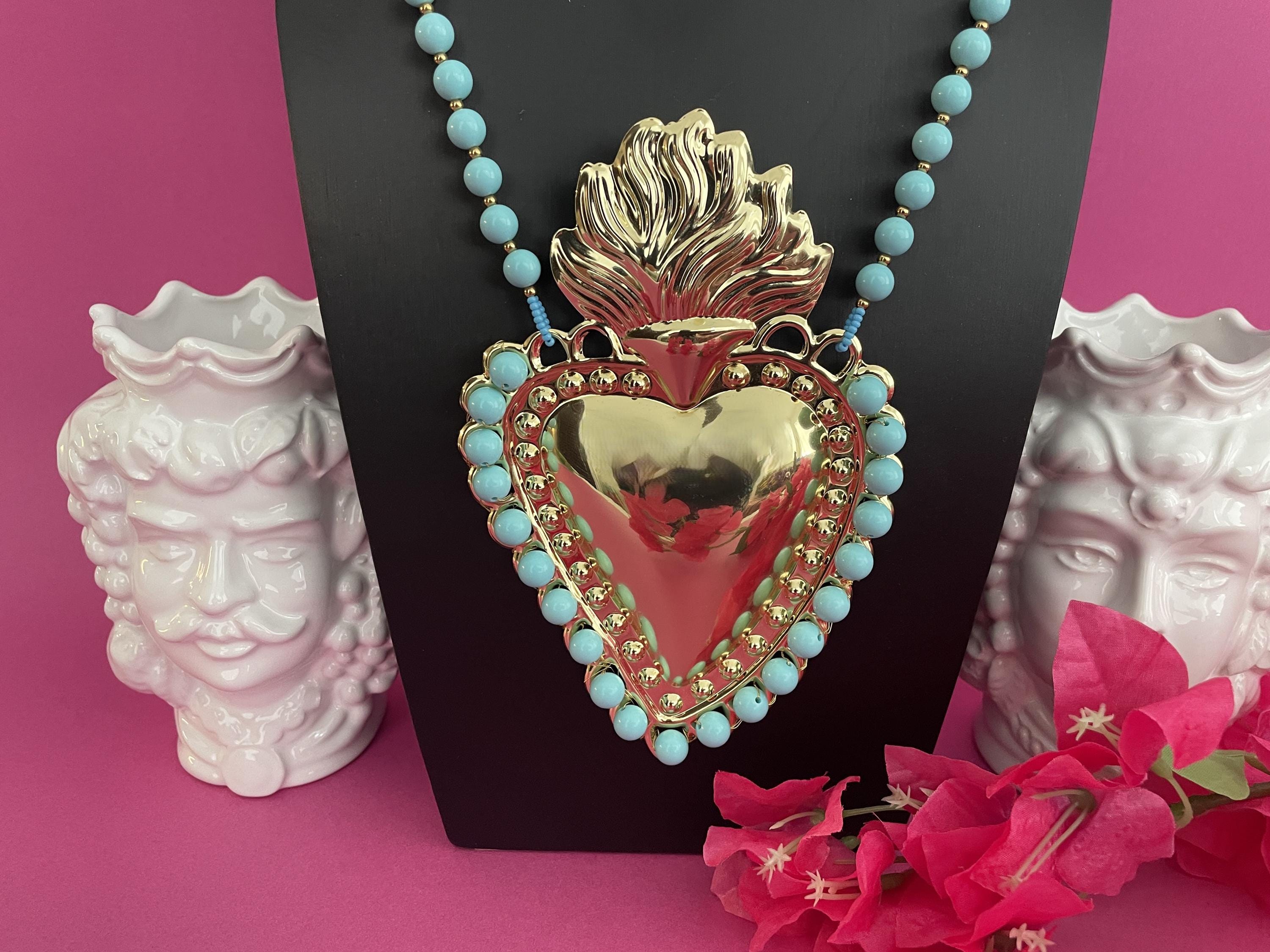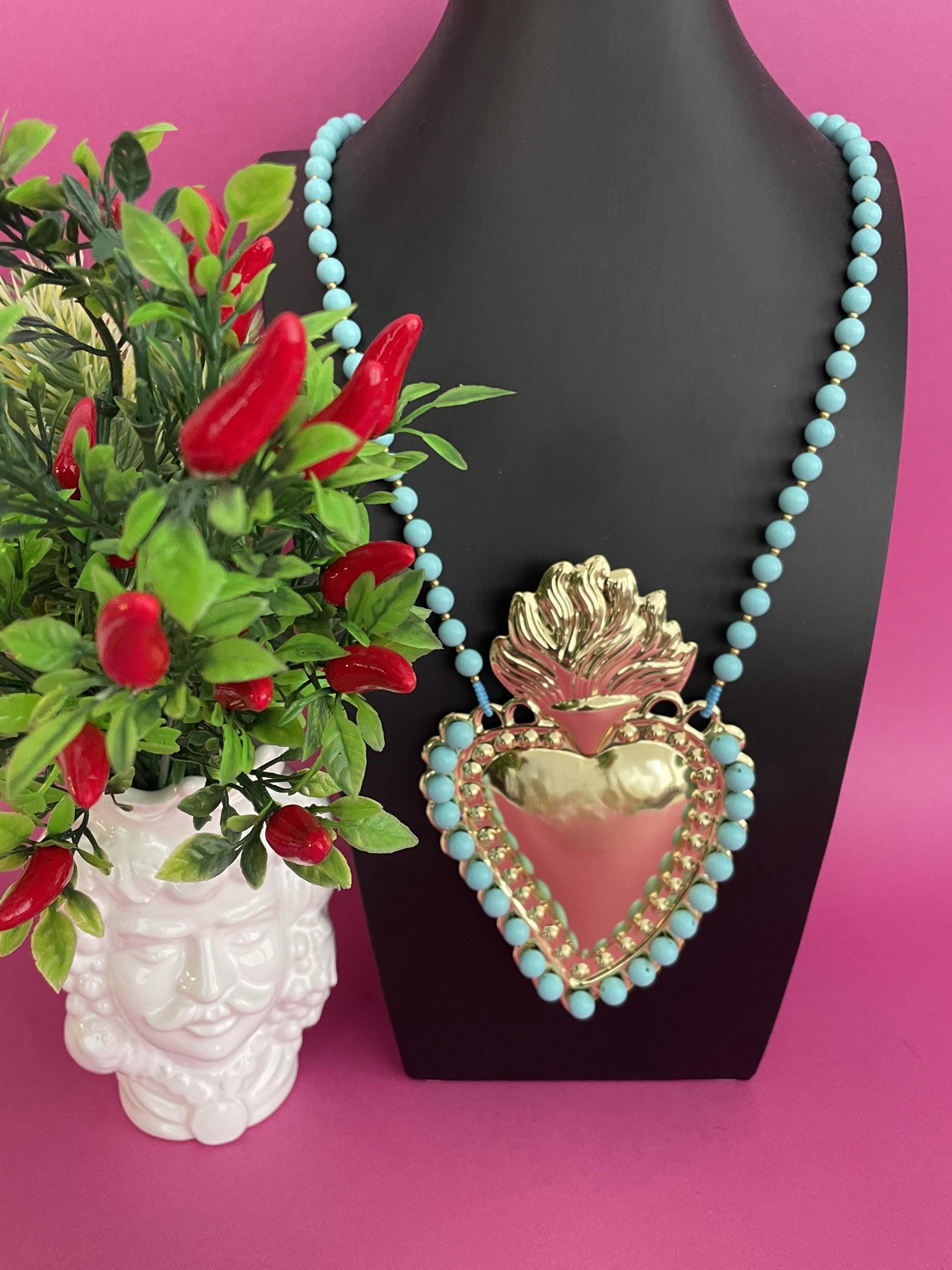 Collana molto scenografica con uno splendido Cuore Sacro centrale di ottone lucido dorato formato XXL incorniciato da Perle di Pasta di Turchese.