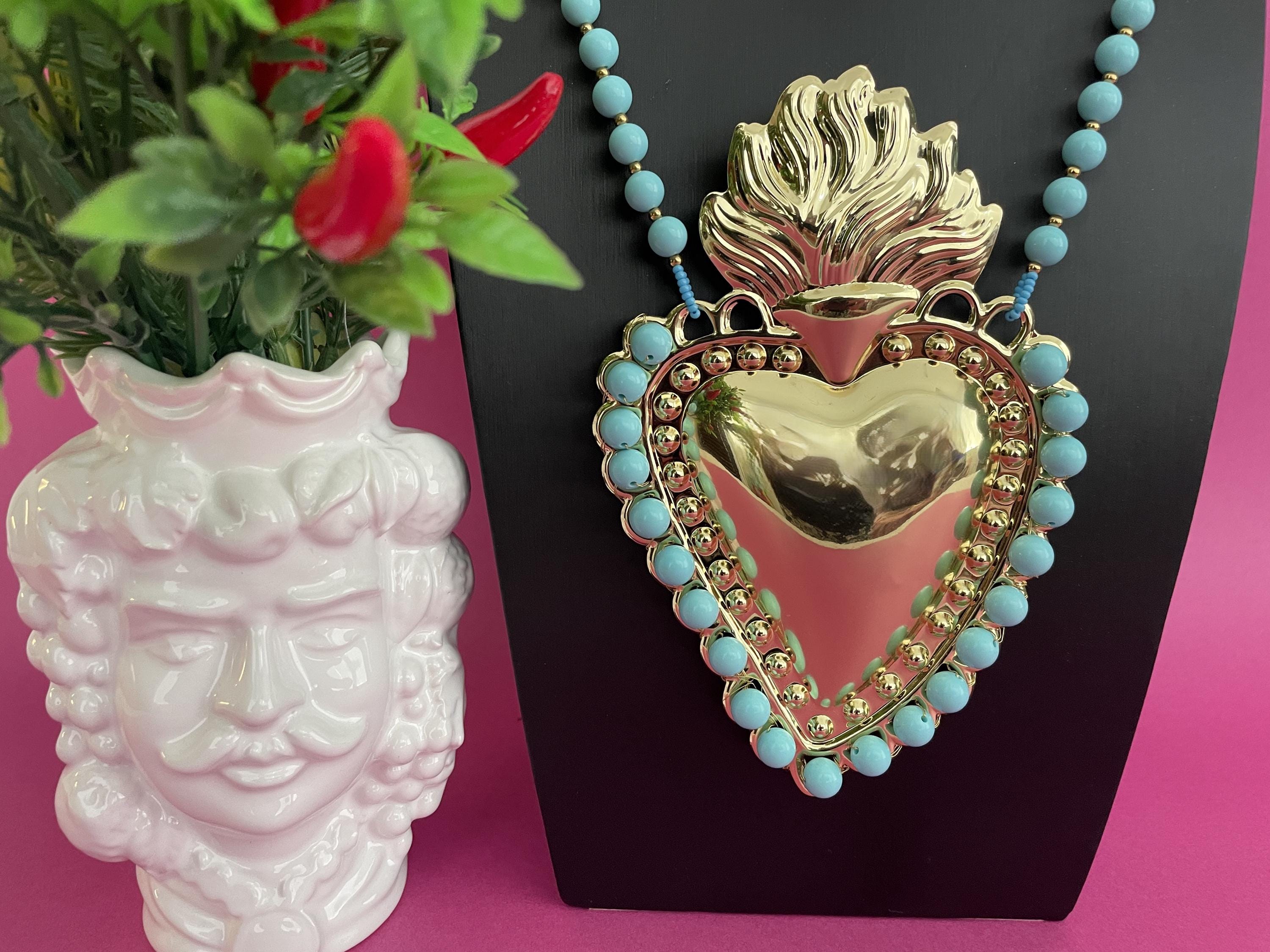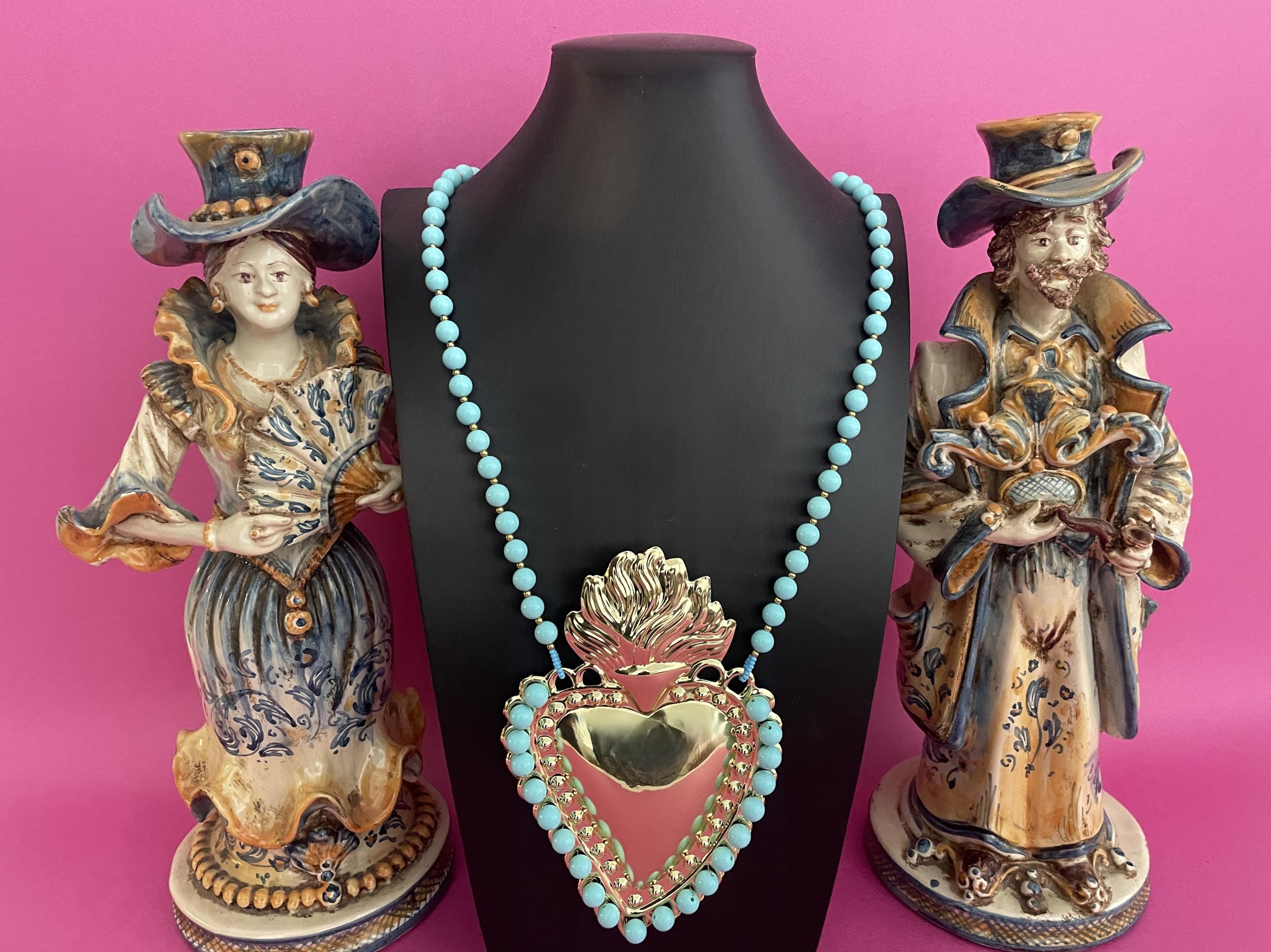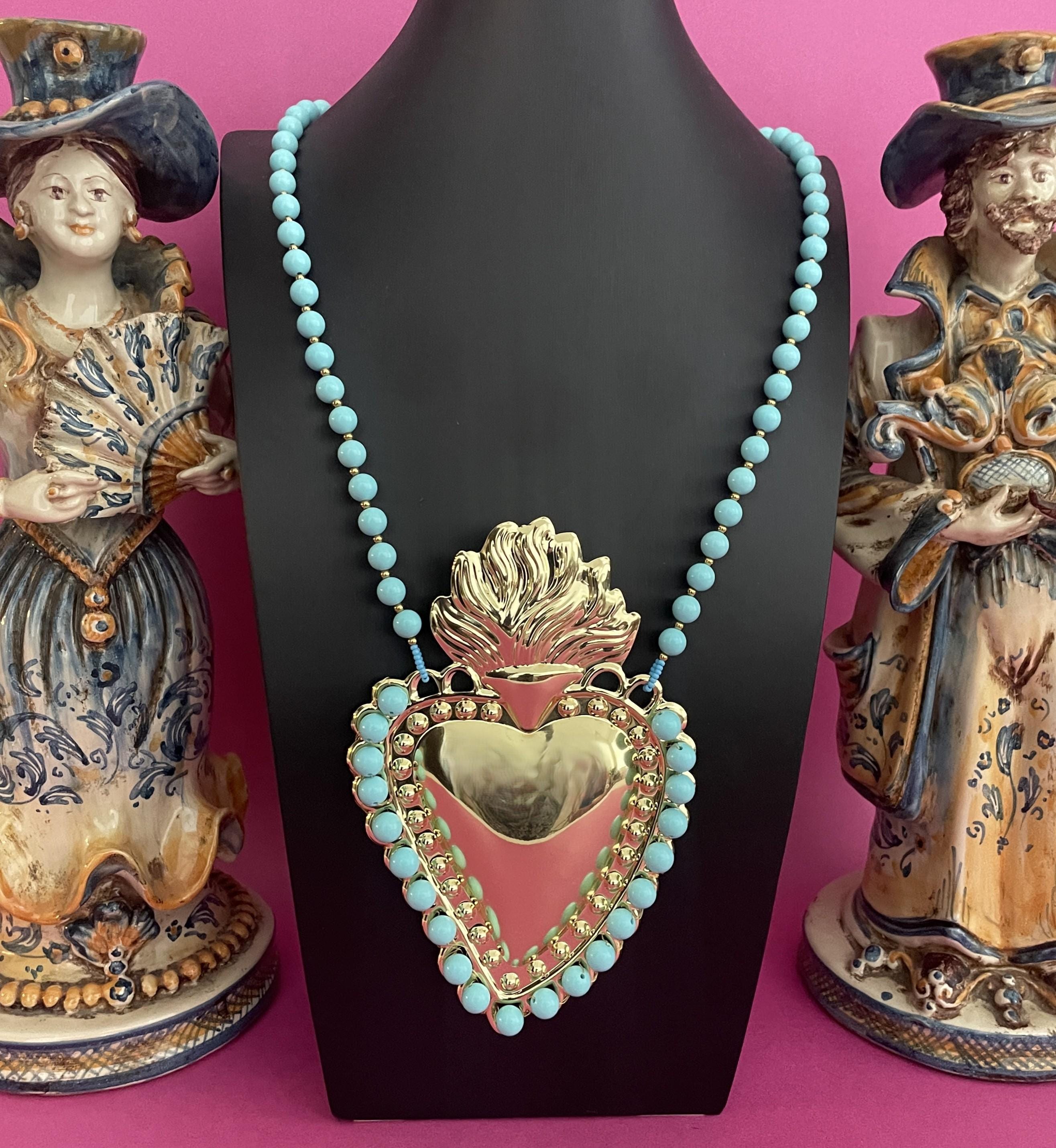 Collana molto scenografica con uno splendido Cuore Sacro centrale di ottone lucido dorato formato XXL incorniciato da Perle di Pasta di Turchese.