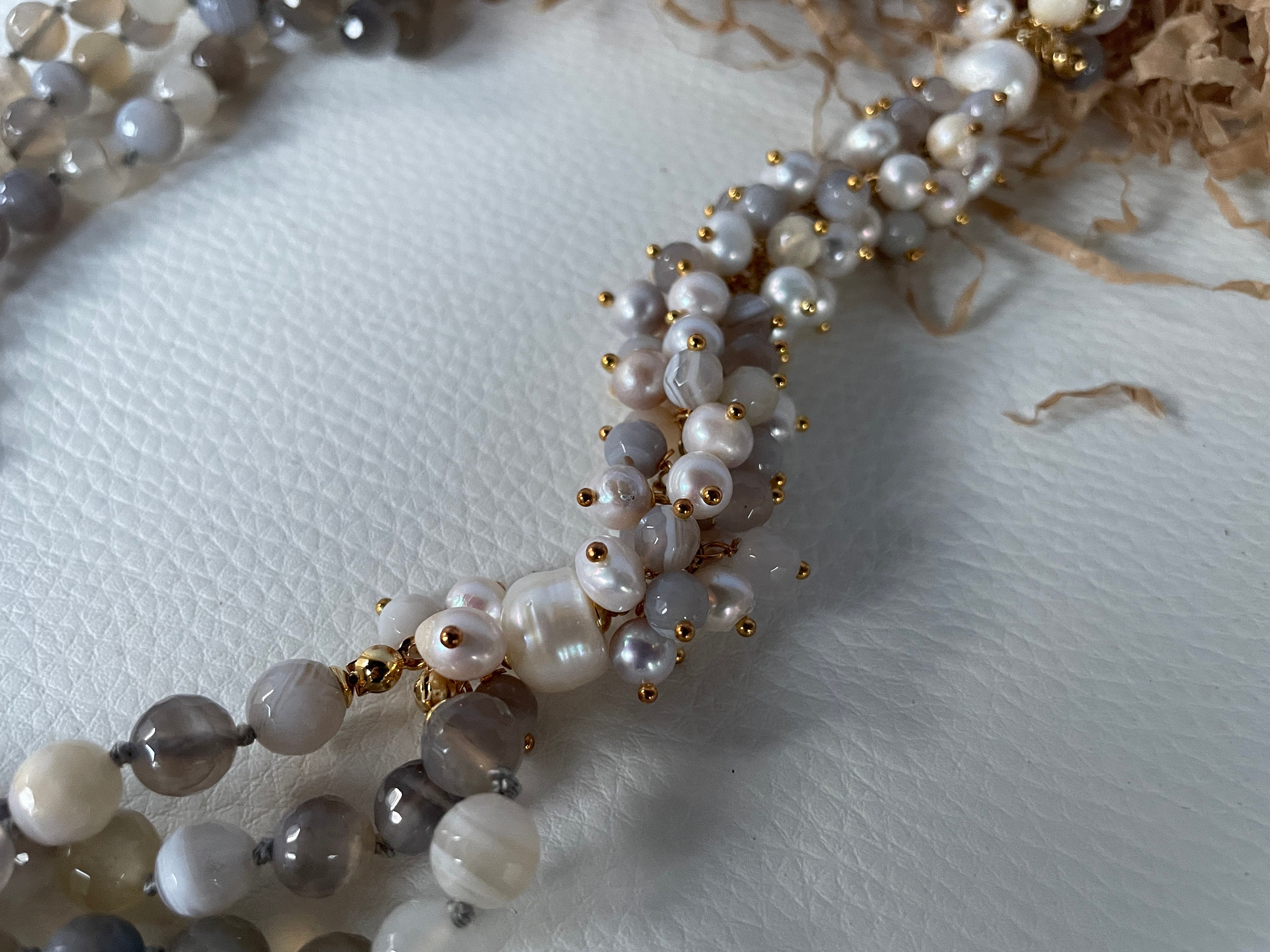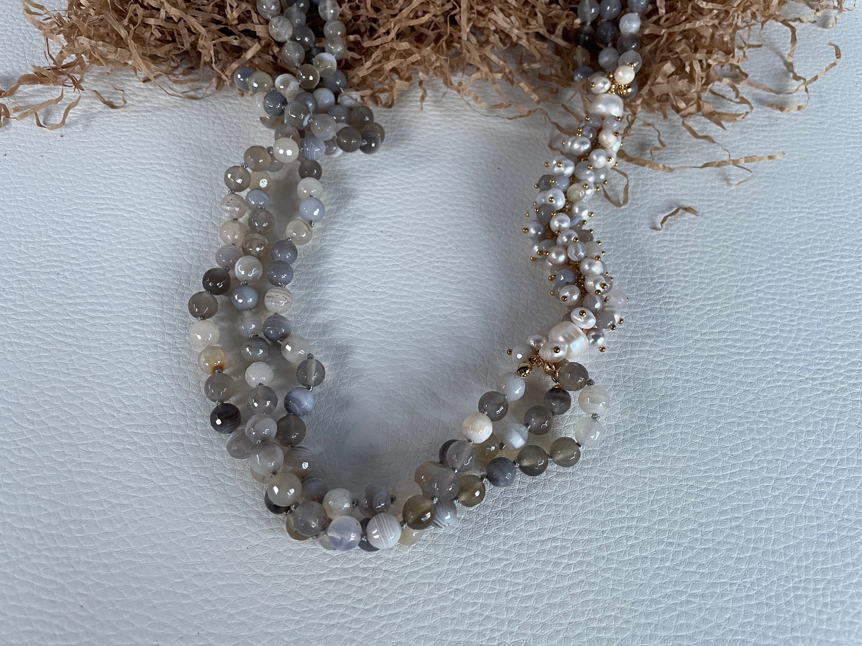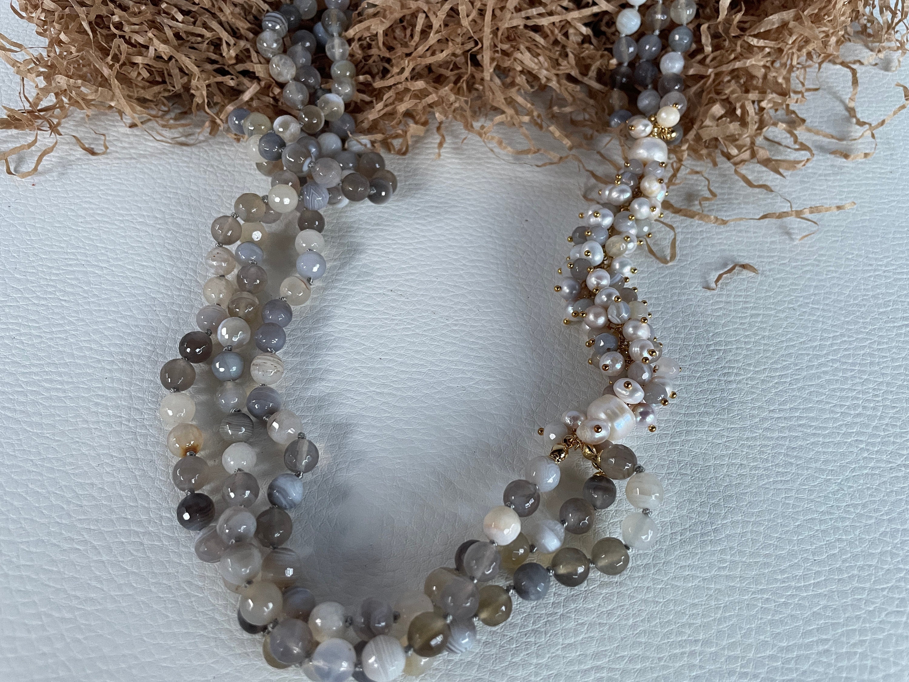 Bellissima collana dallo stile tutto mediterraneo realizzata con tre fili di perle di Agata brasiliana multicolor sui toni del grigio. Le perle sono singolarmente annodate.