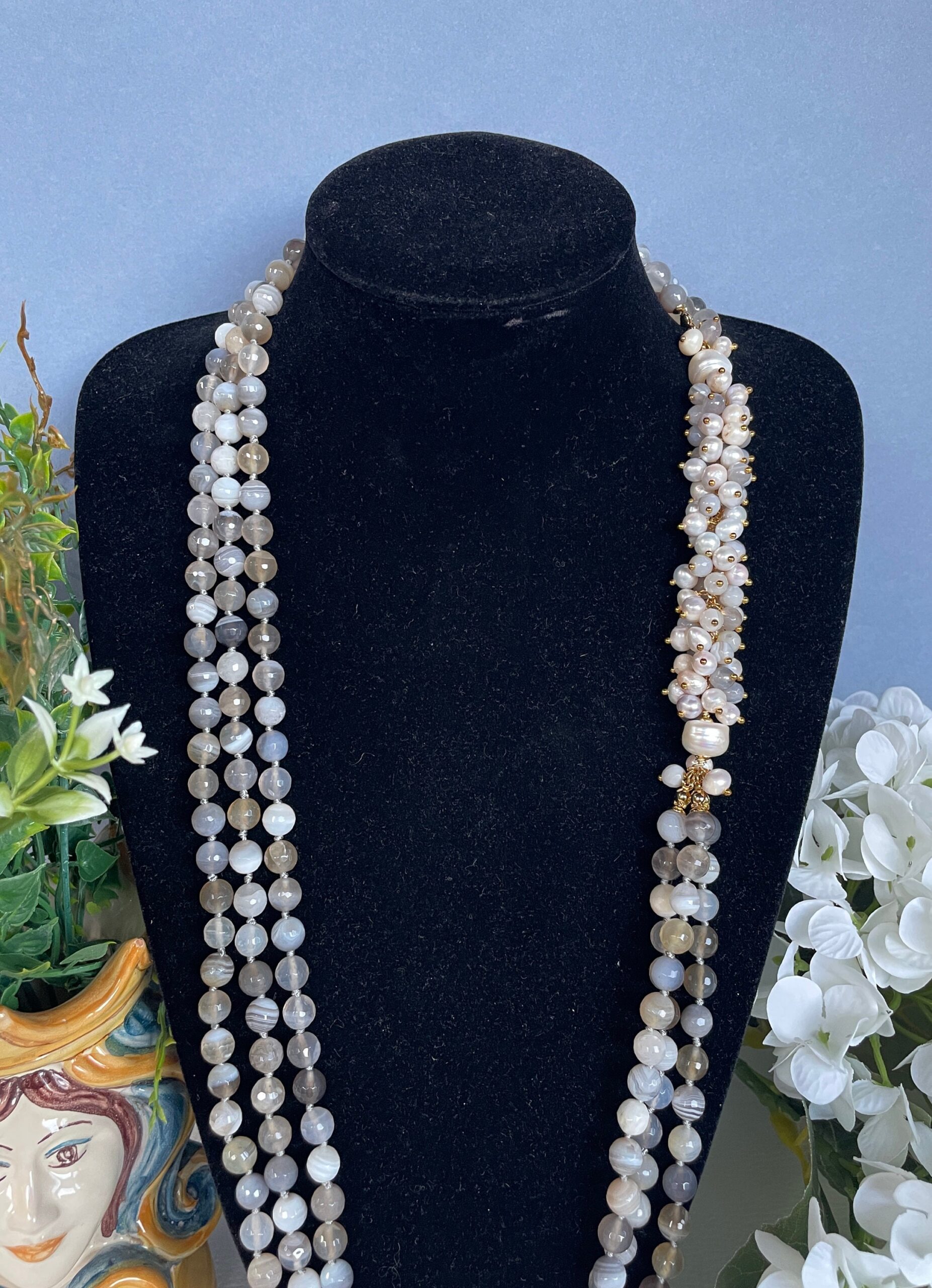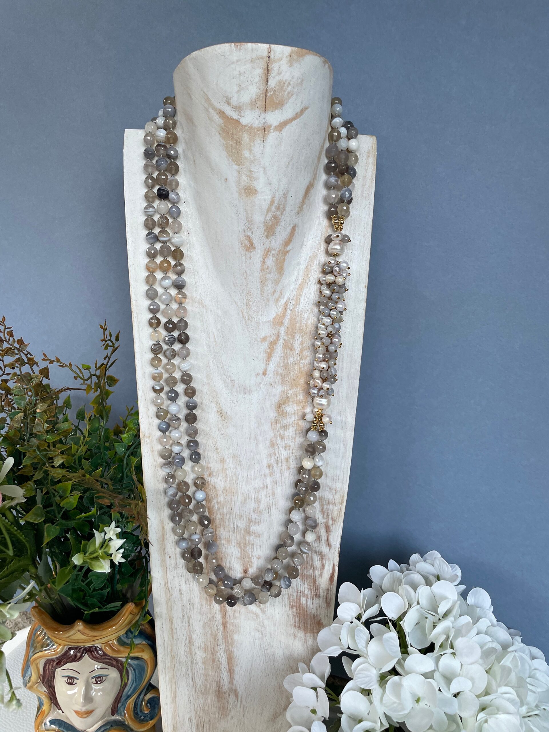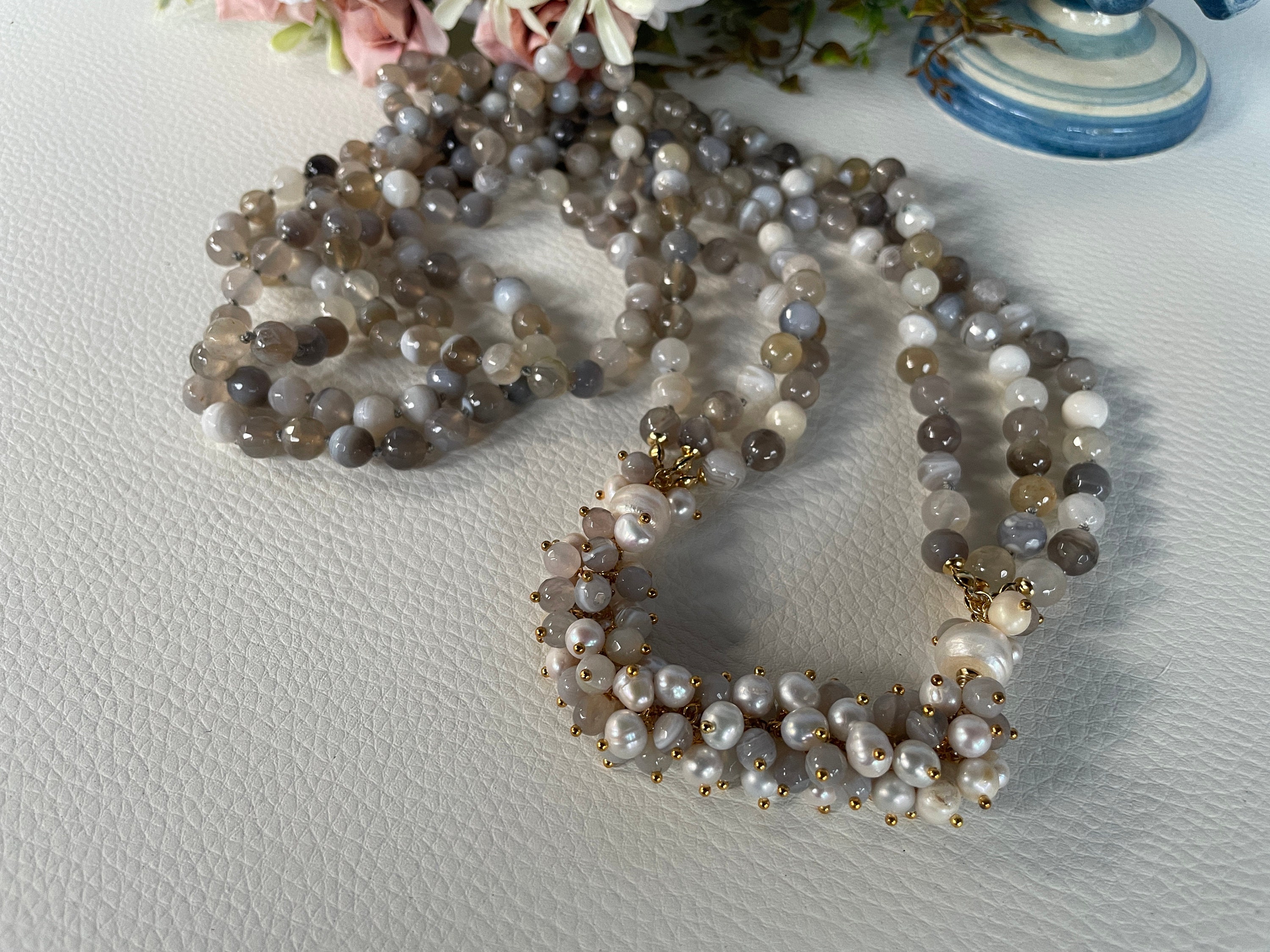 Bellissima collana dallo stile tutto mediterraneo realizzata con tre fili di perle di Agata brasiliana multicolor sui toni del grigio. Le perle sono singolarmente annodate.