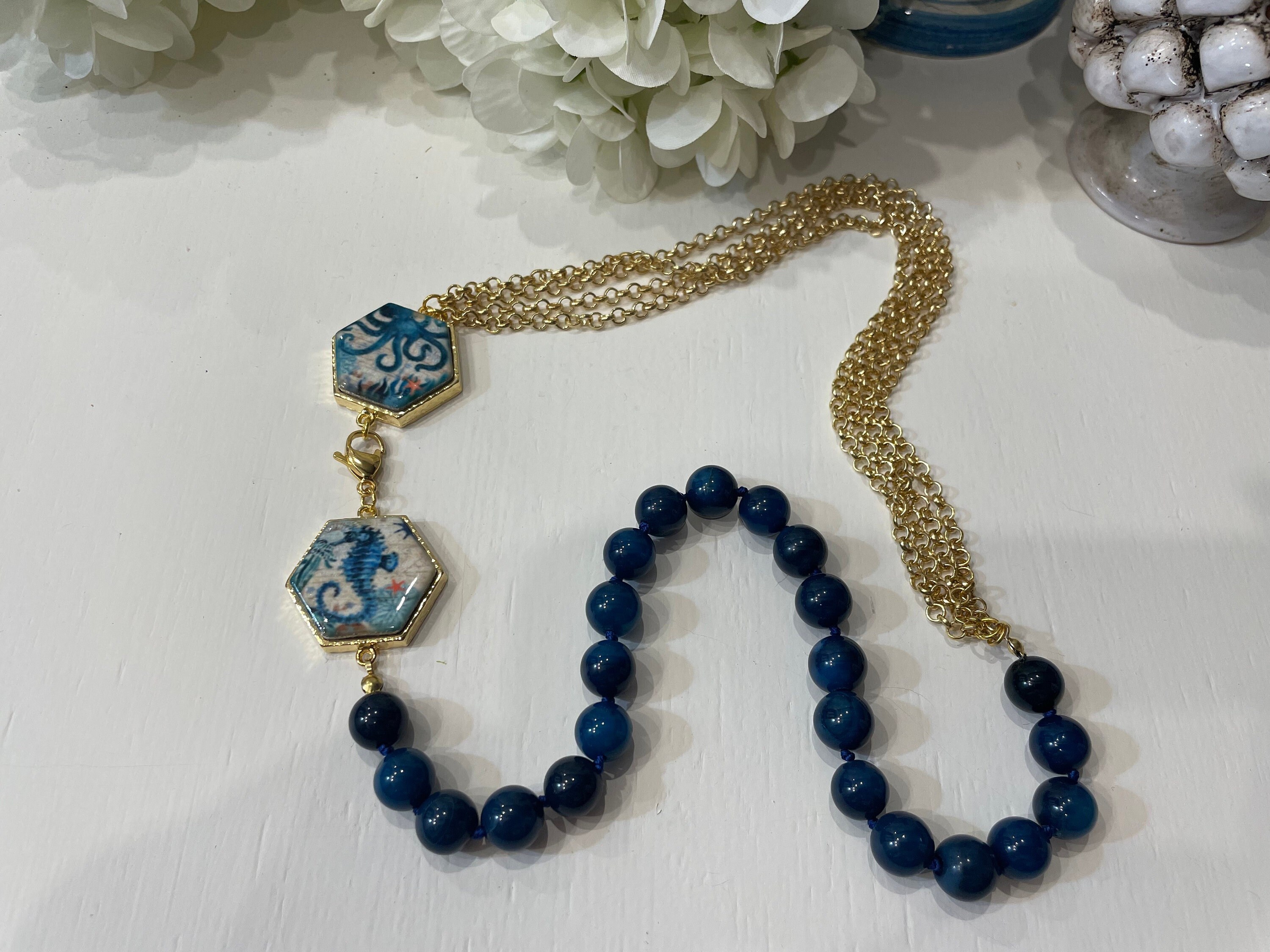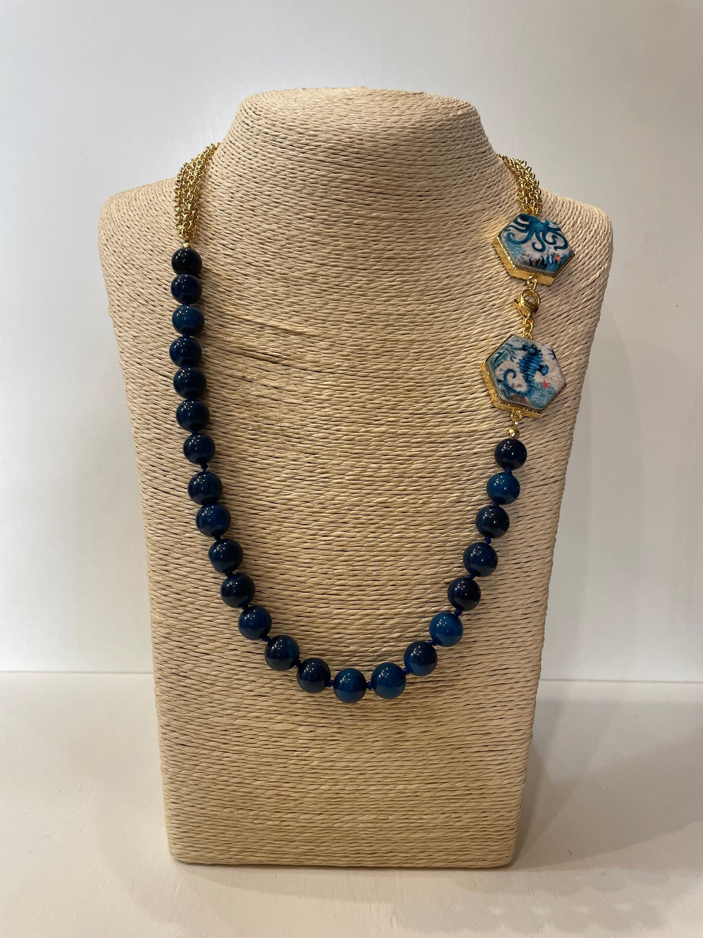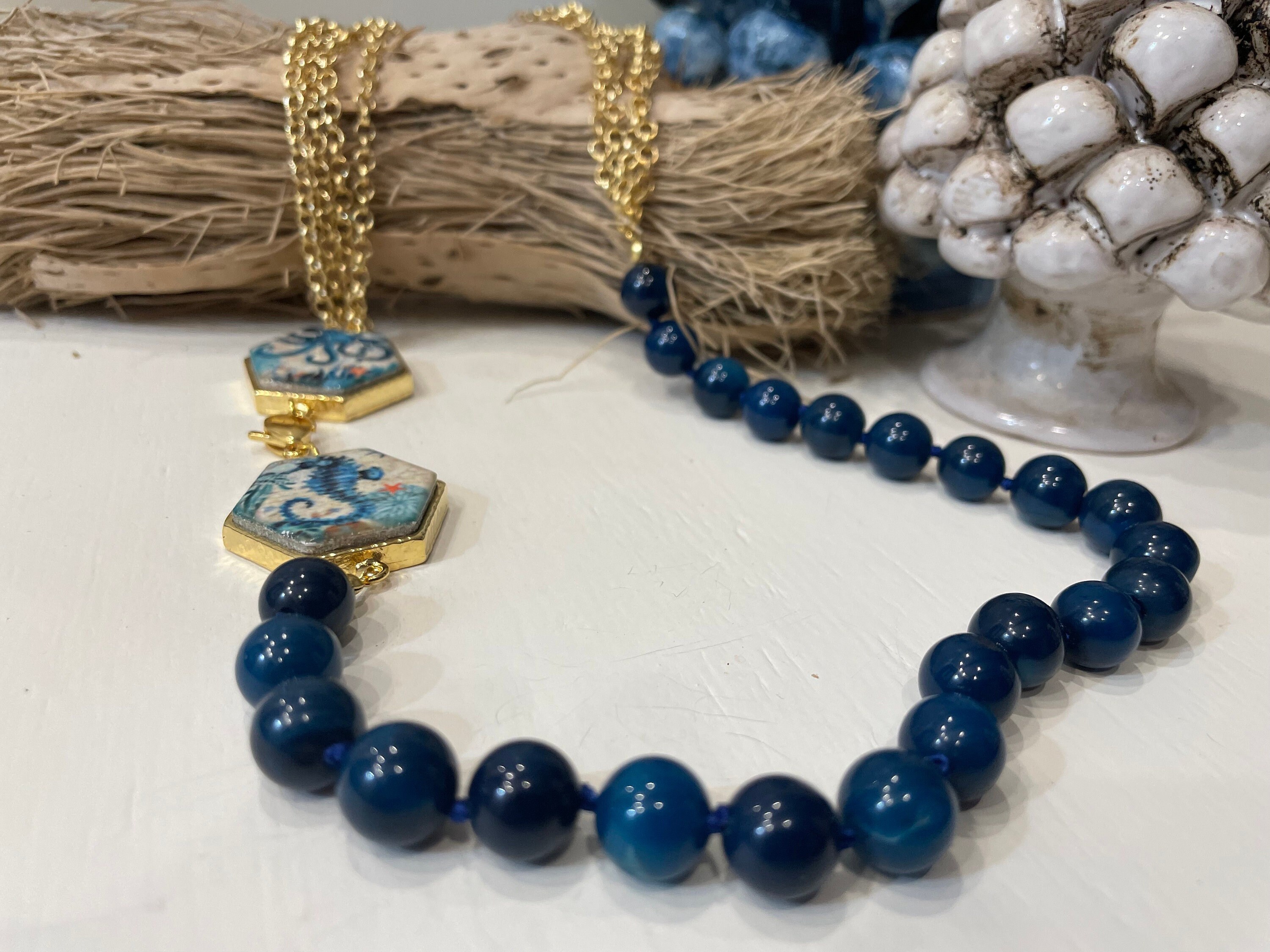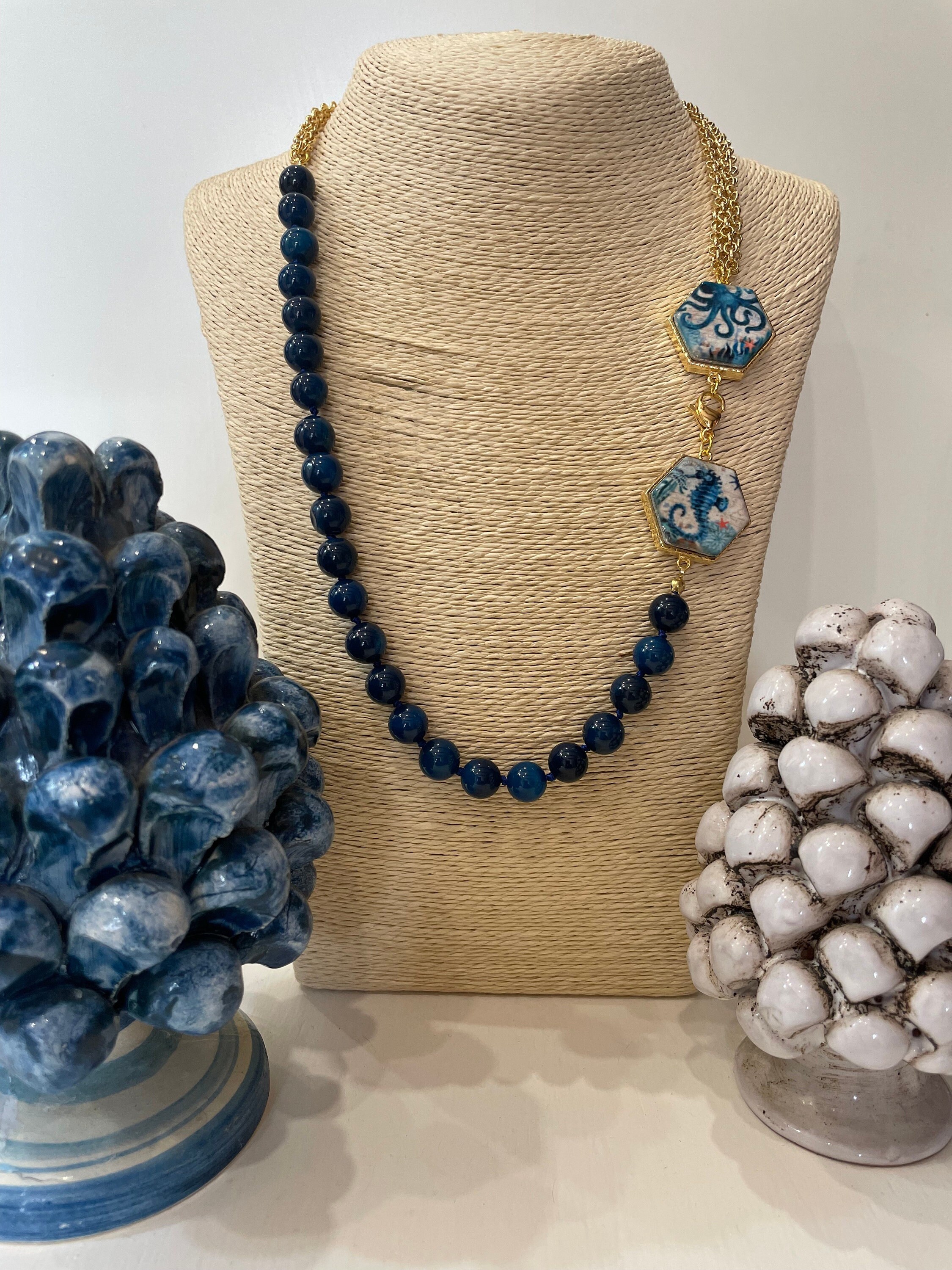 Collana multifilo con mattonelle di ceramica di Caltagirone, giada zaffiro blu e catene di ottone.