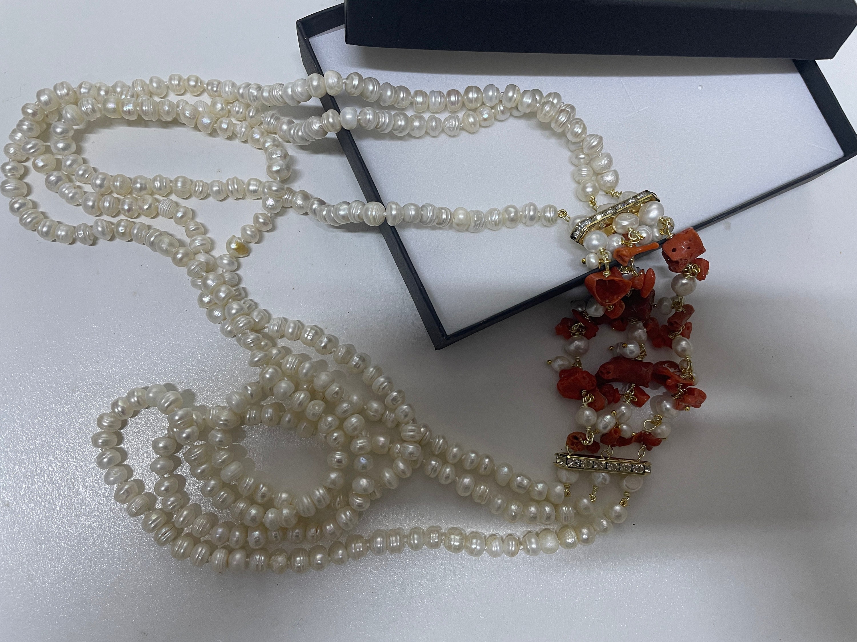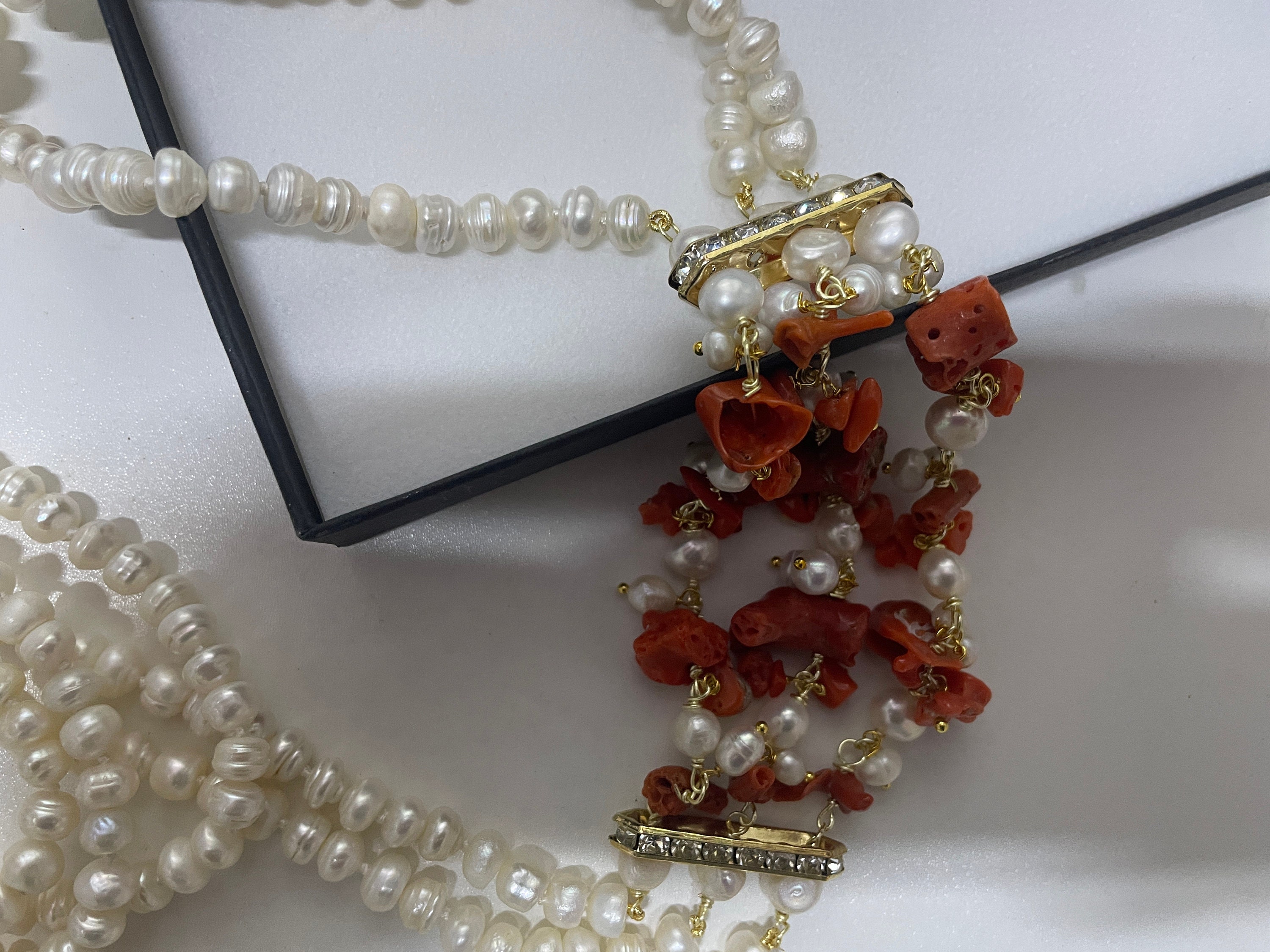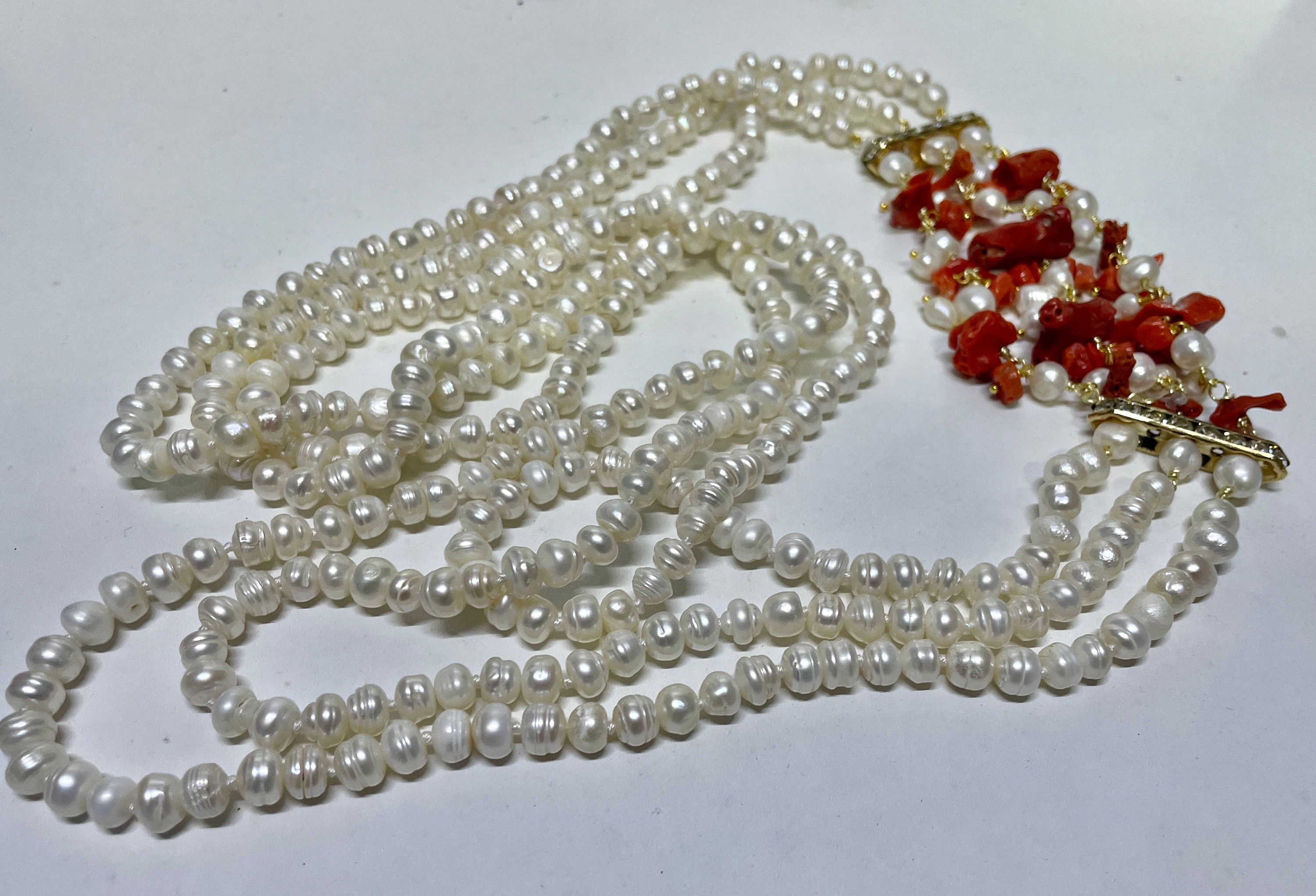 Collana maxi realizzata con 3 fili di perle di fiume, tutte singolarmente annodate, e con un connettore interamente realizzato a mano con grappoli di perle di fiume e pezzi di Corallo autentico del Mediterraneo.