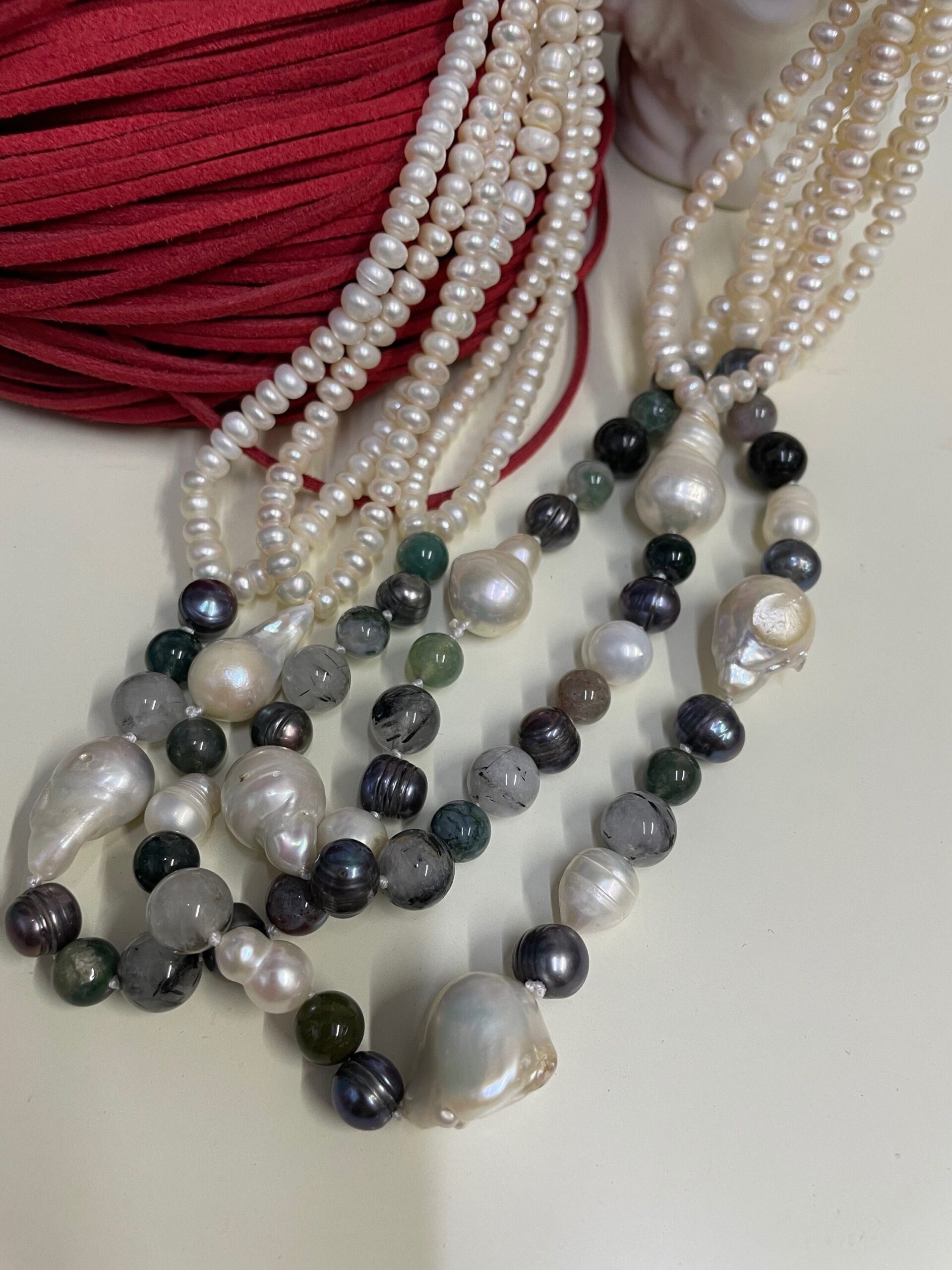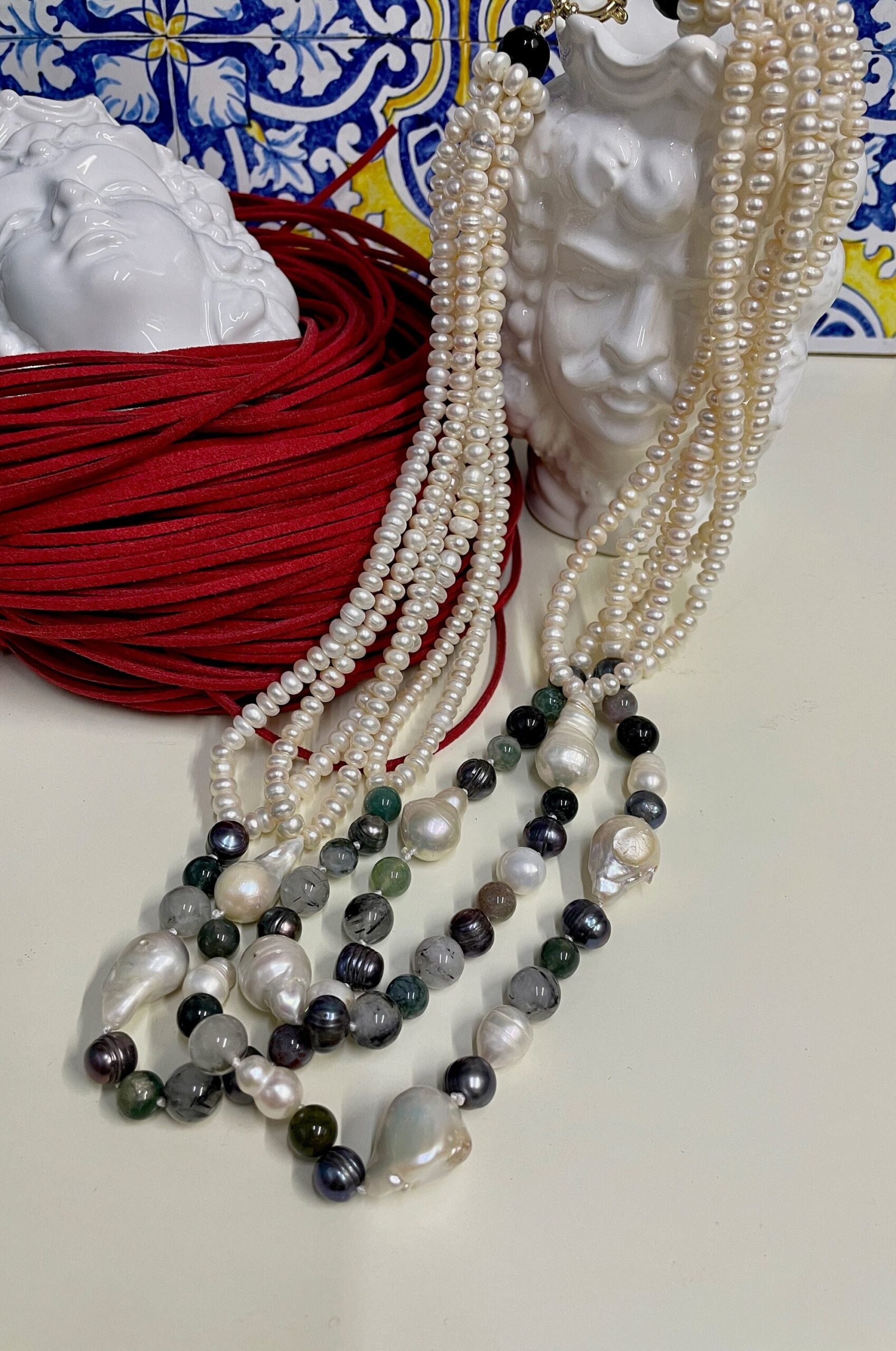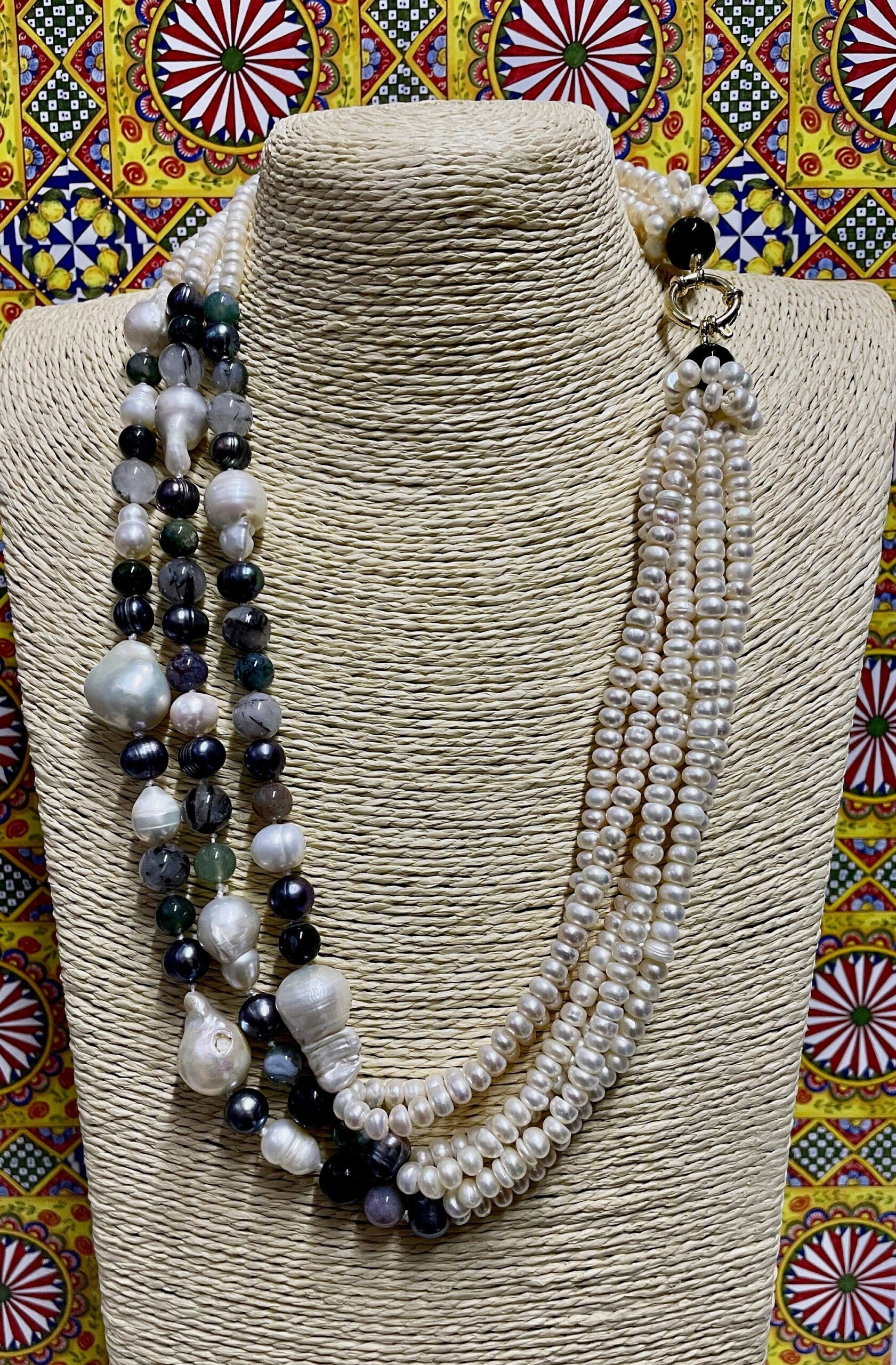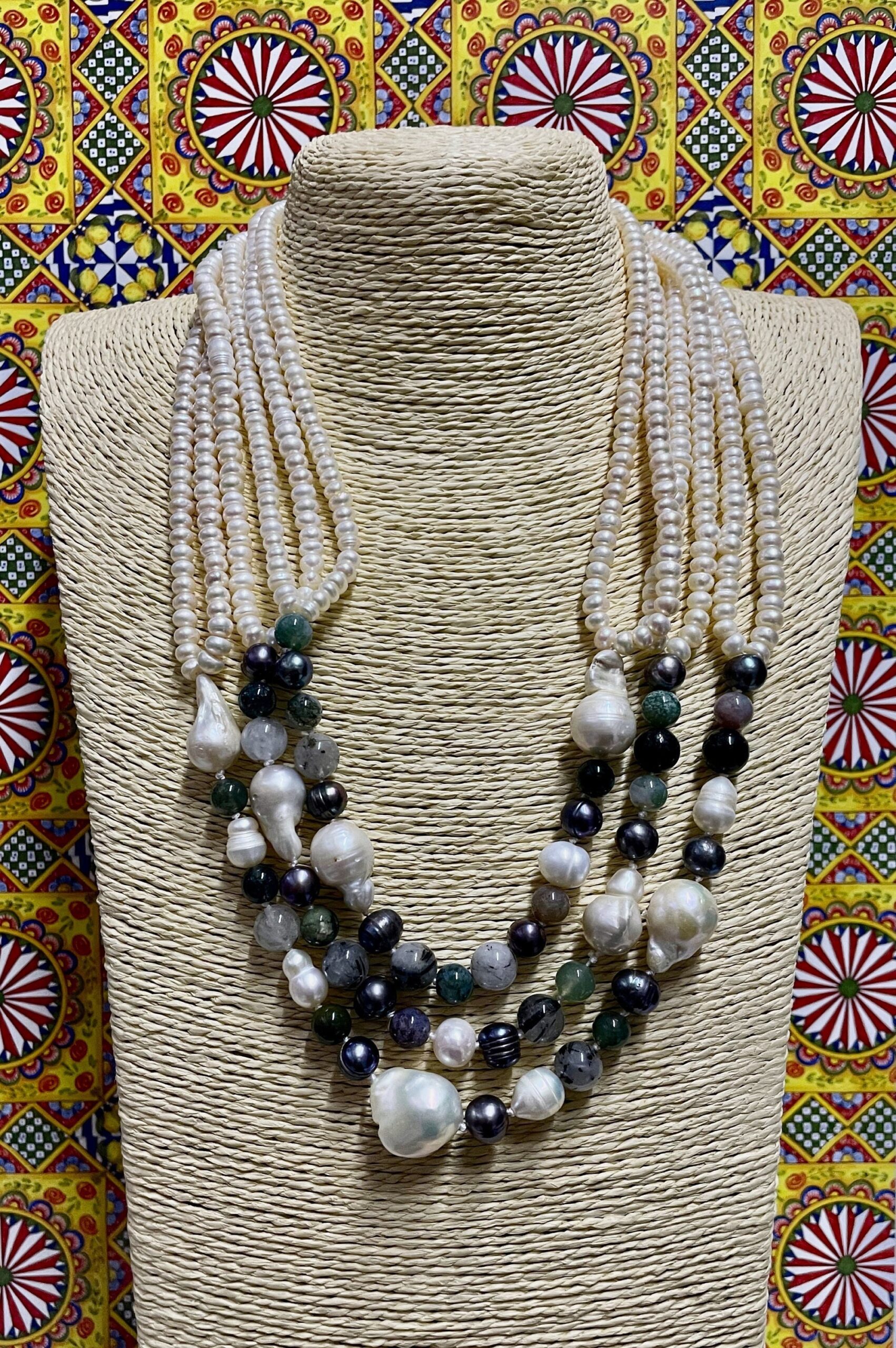 Realizzata con tre doppi fili di perle di fiume schiacciate, e tre fili di perle miste: scaramazze, perle grigie, ematite e pietre dure.