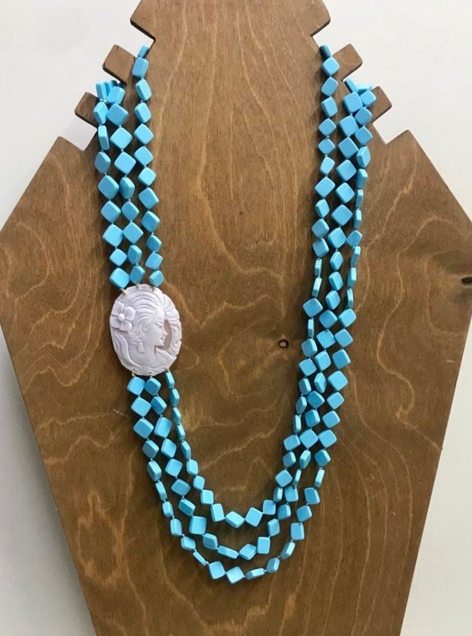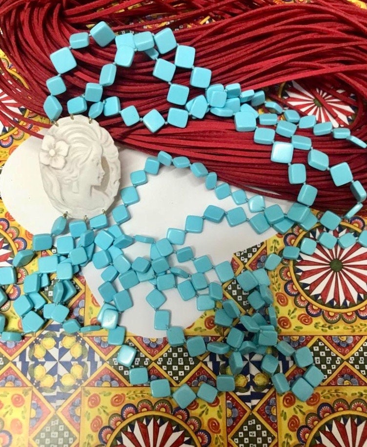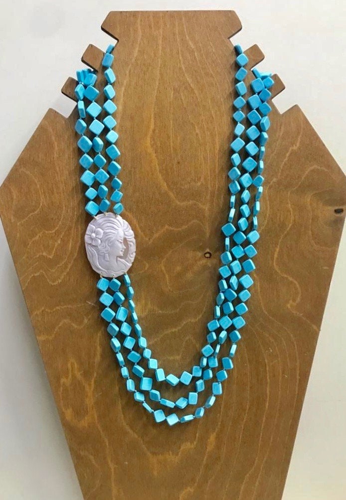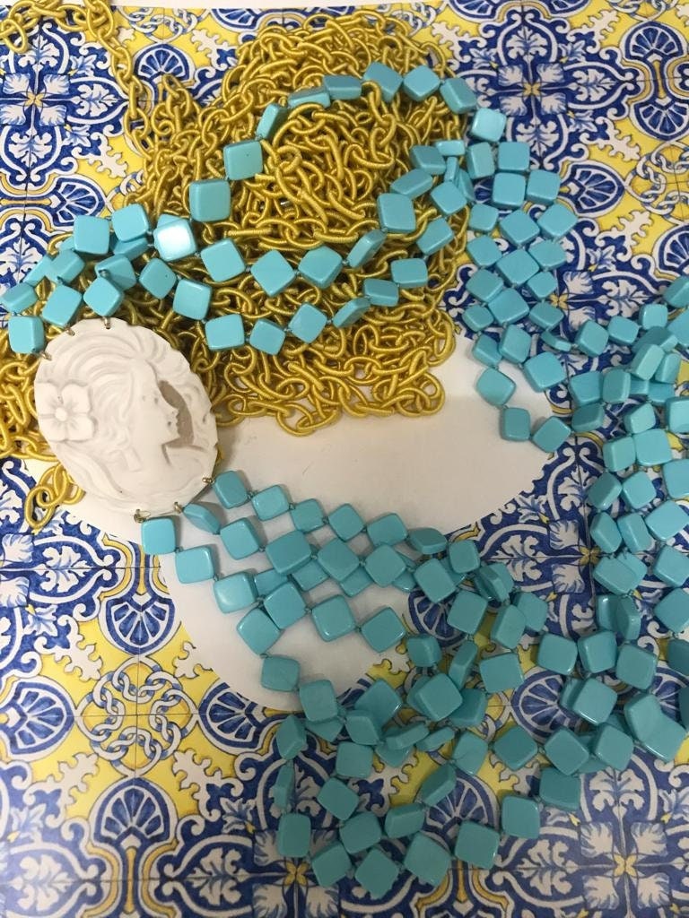 Composta da tre fili di perle a rombo di pasta di Turchese singolarmente annodate e cammeo ovale autentico di conchiglia.