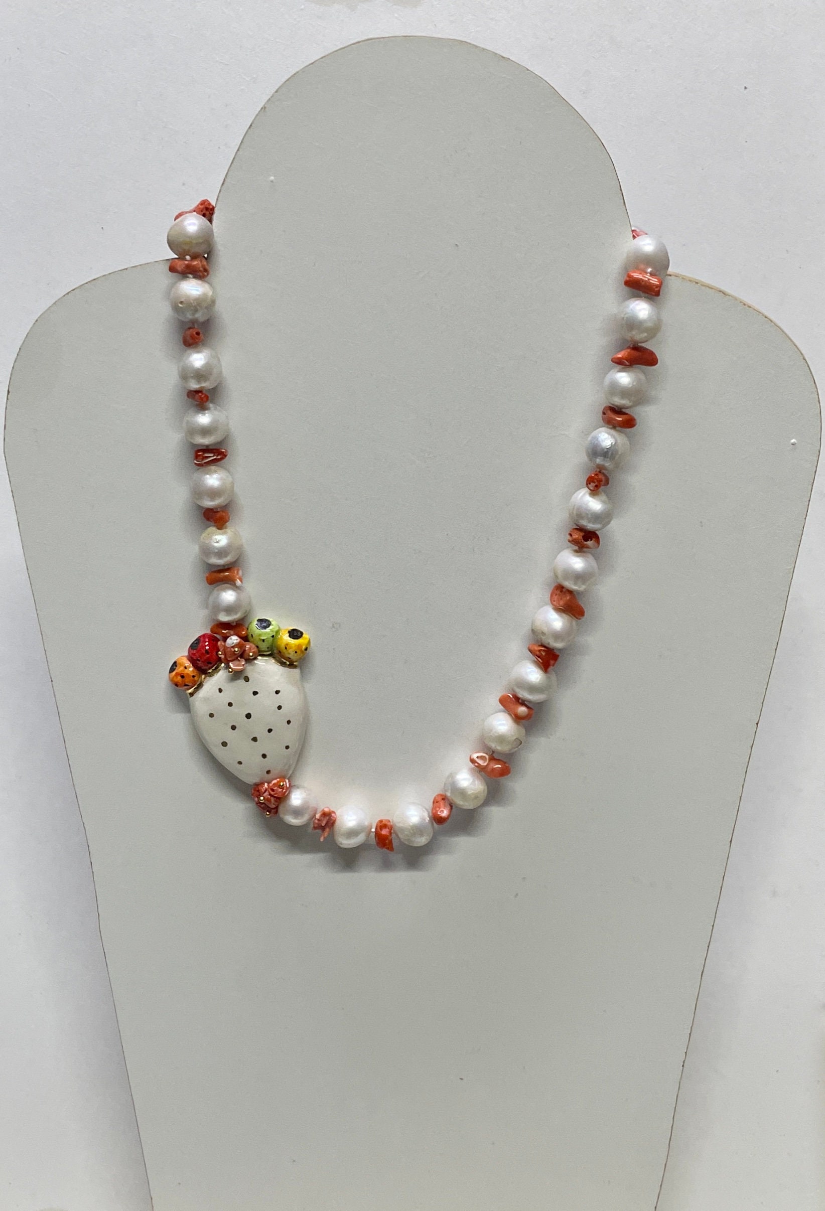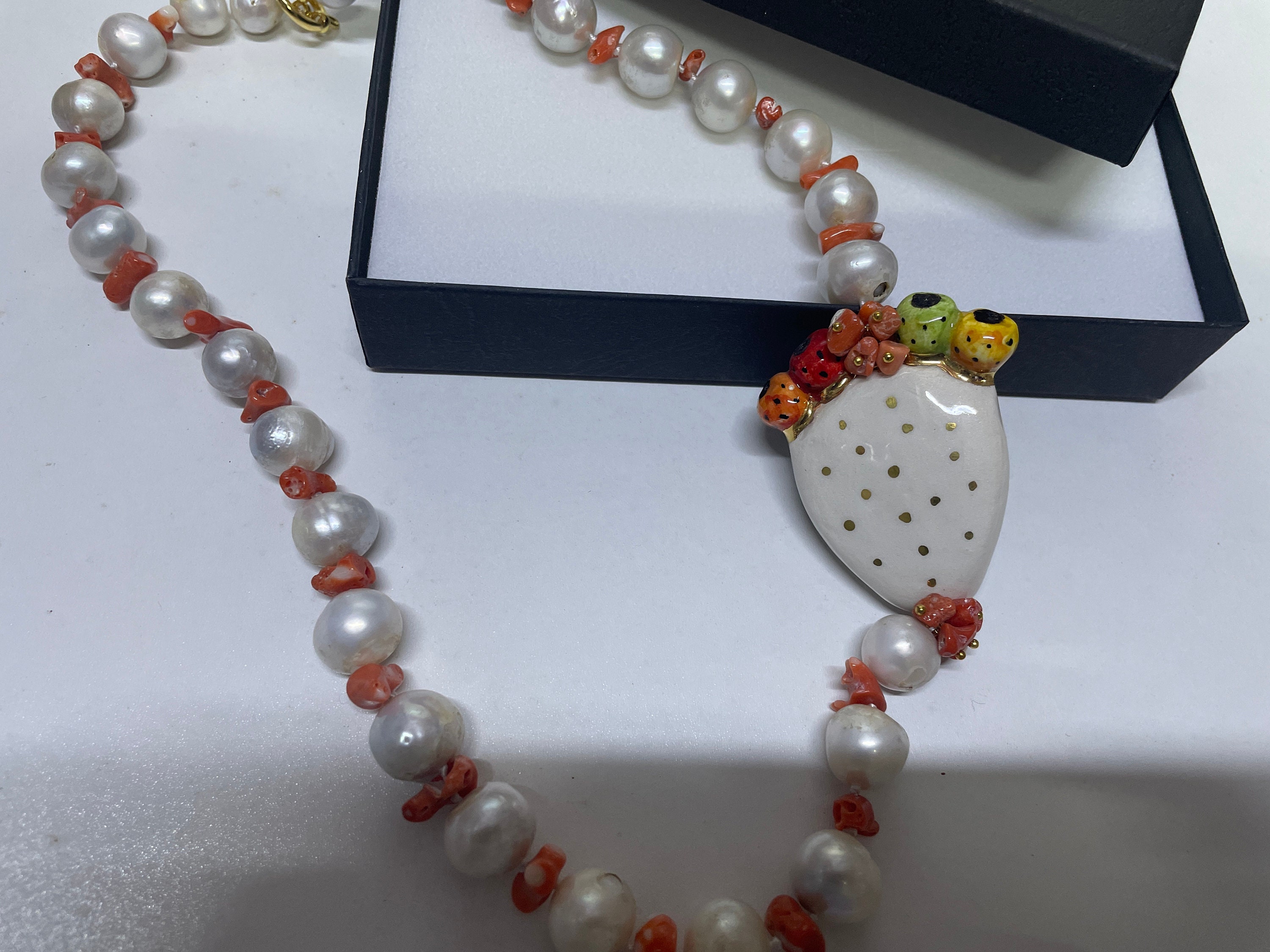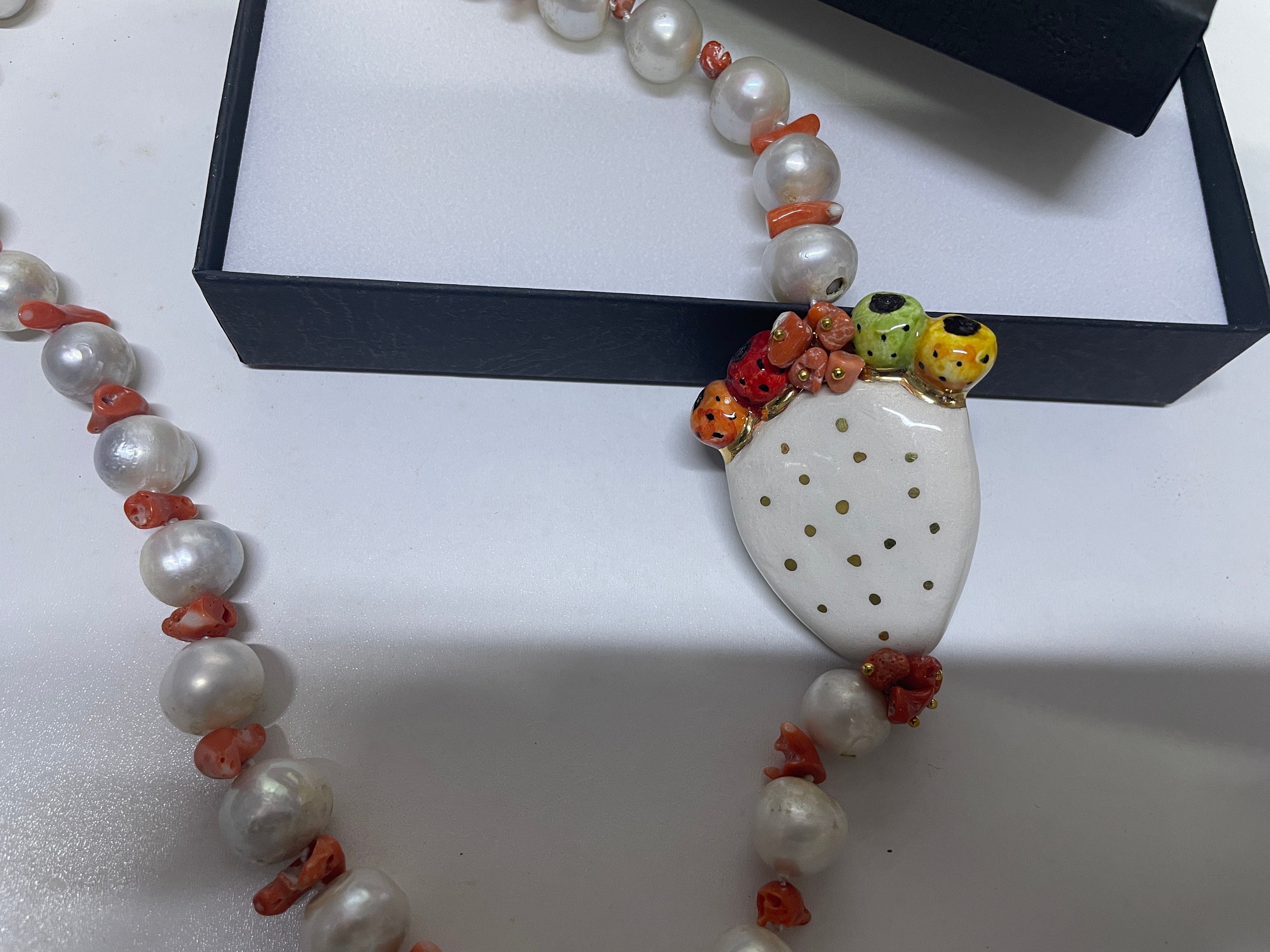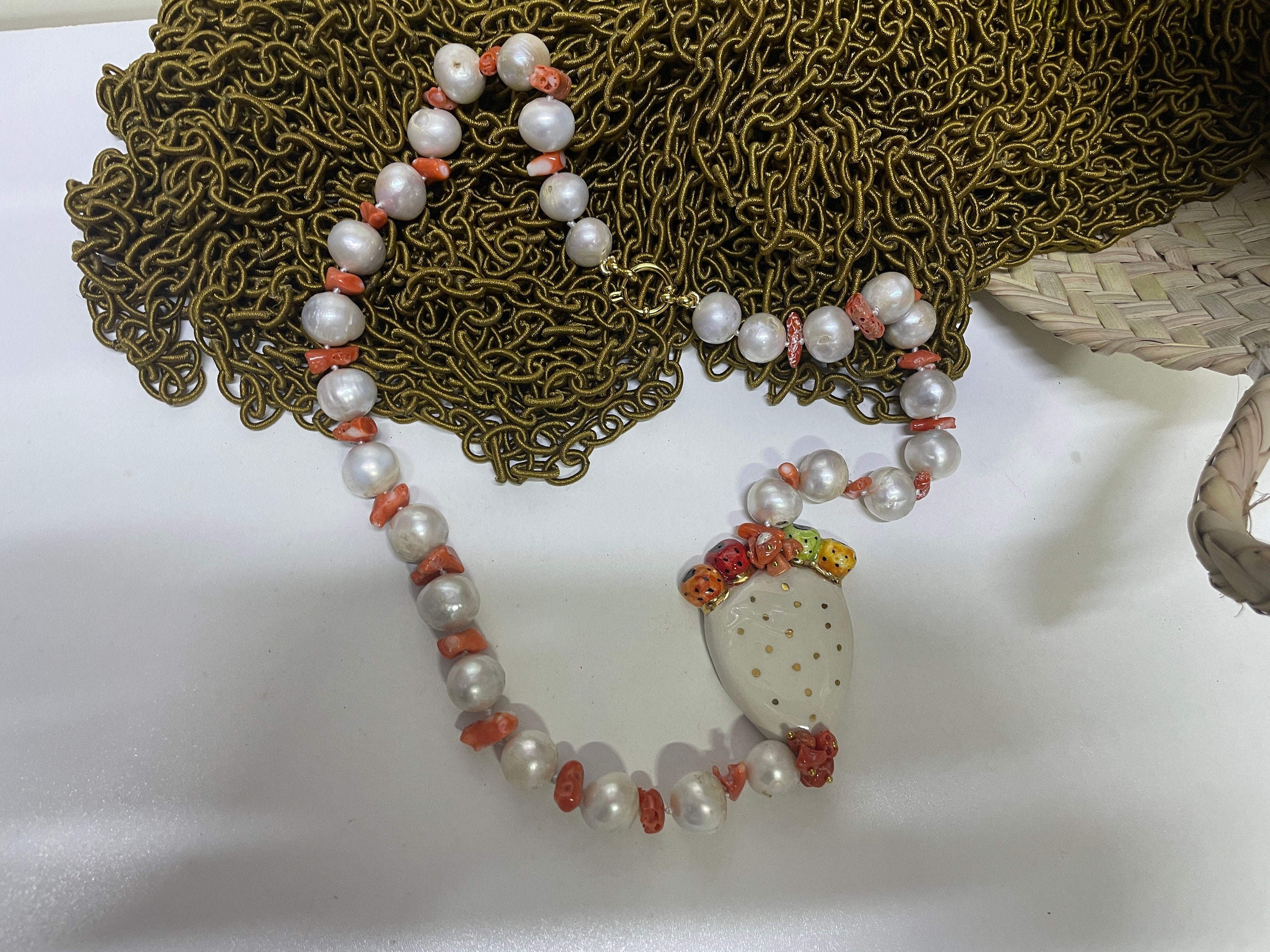 Un raffinatissimo Fico d’India di ceramica di Caltagirone, dipinto a mano, si inserisce nel filo di perle rendendo questa collana particolarmente unica nel suo genere.