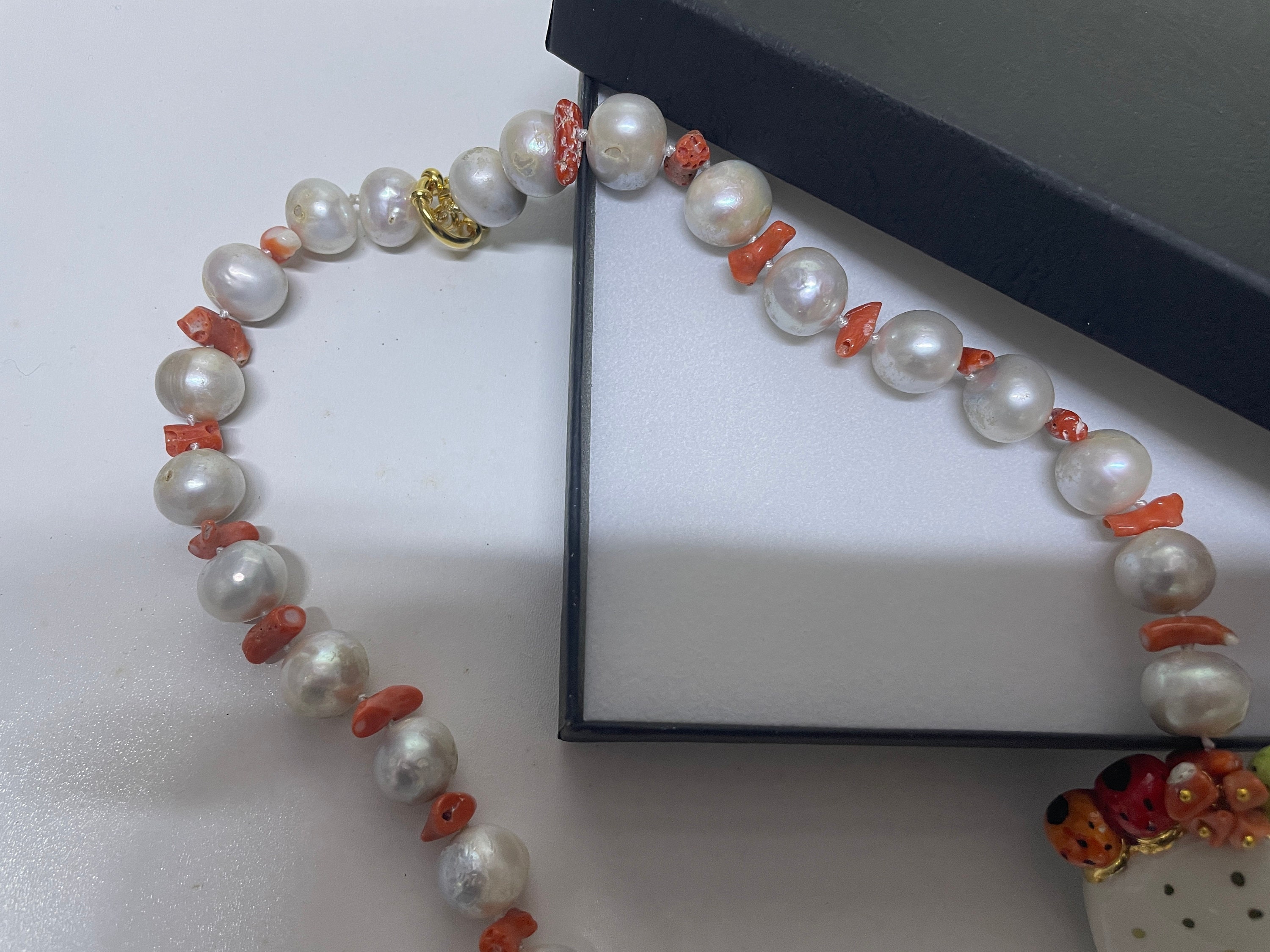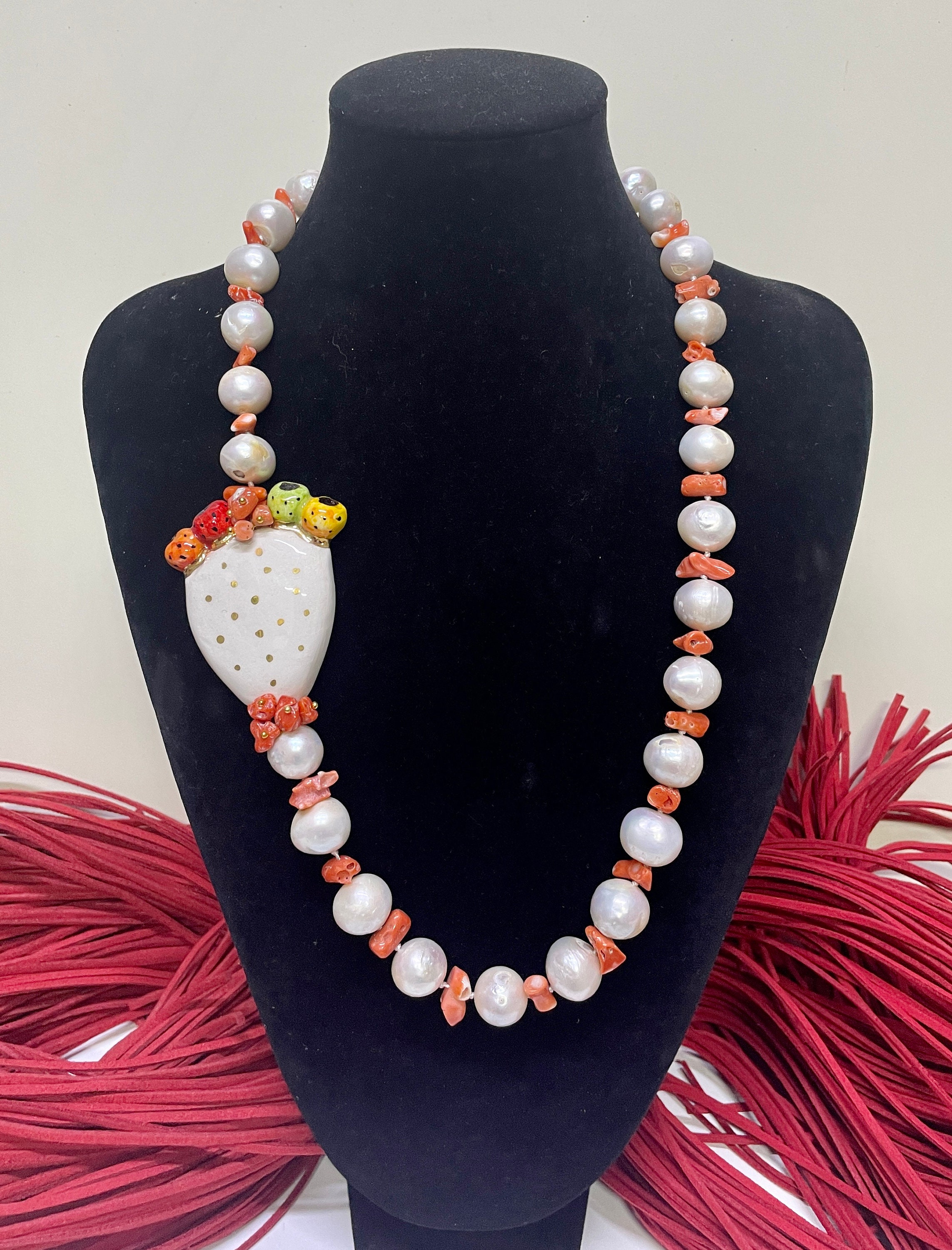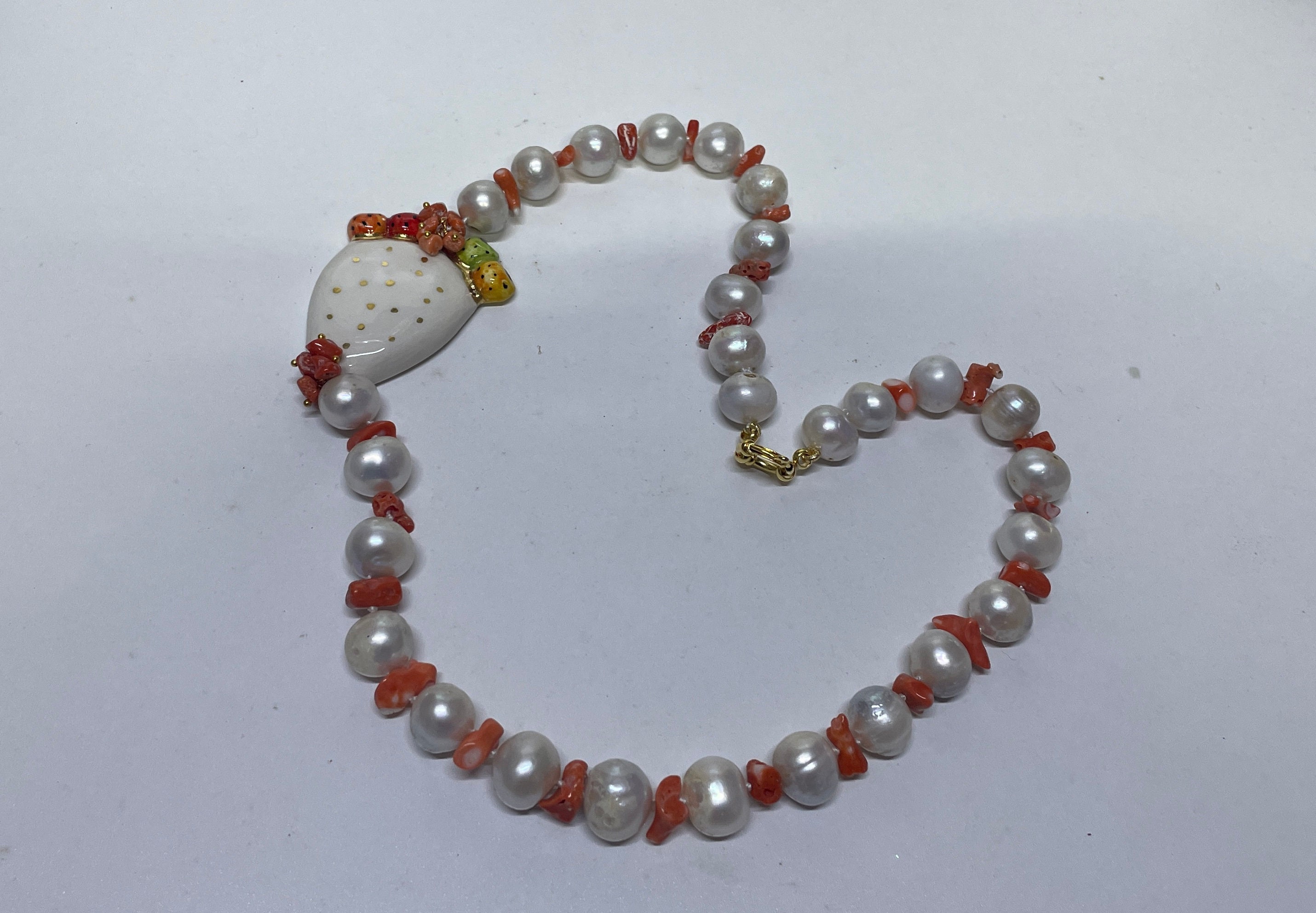 Un filo di perle barocche tutte annodate e separate fra loro da chips di Corallo.