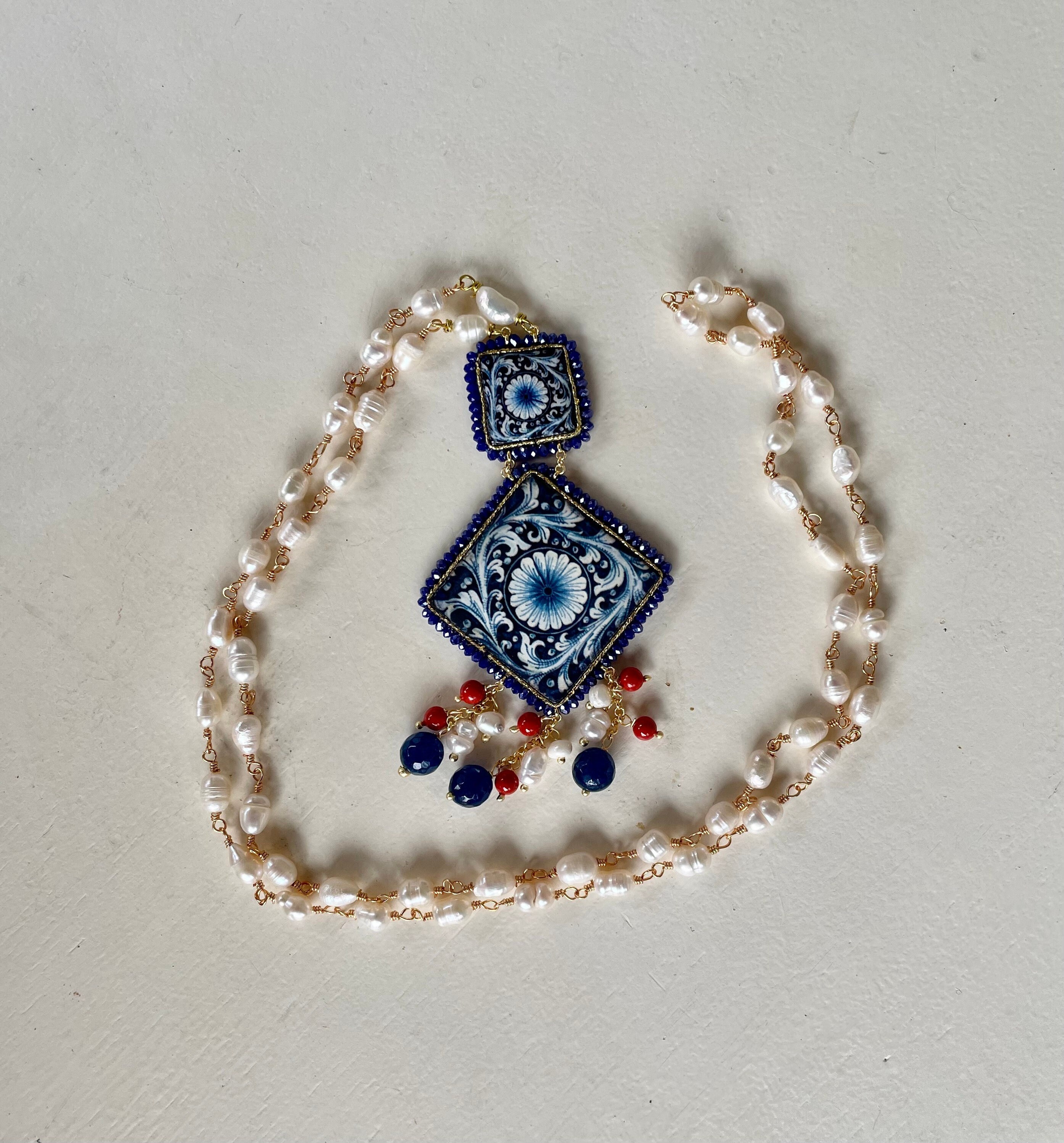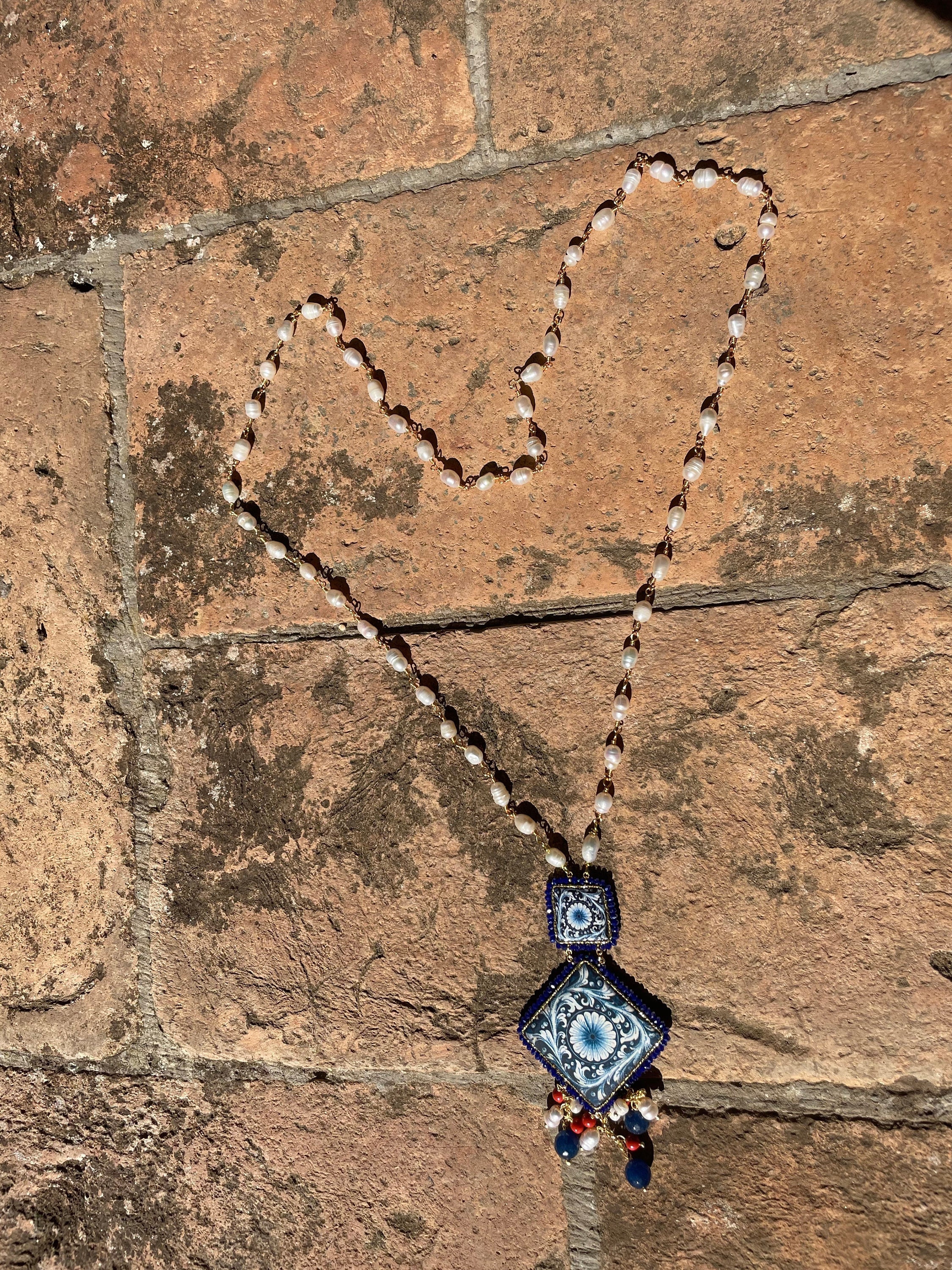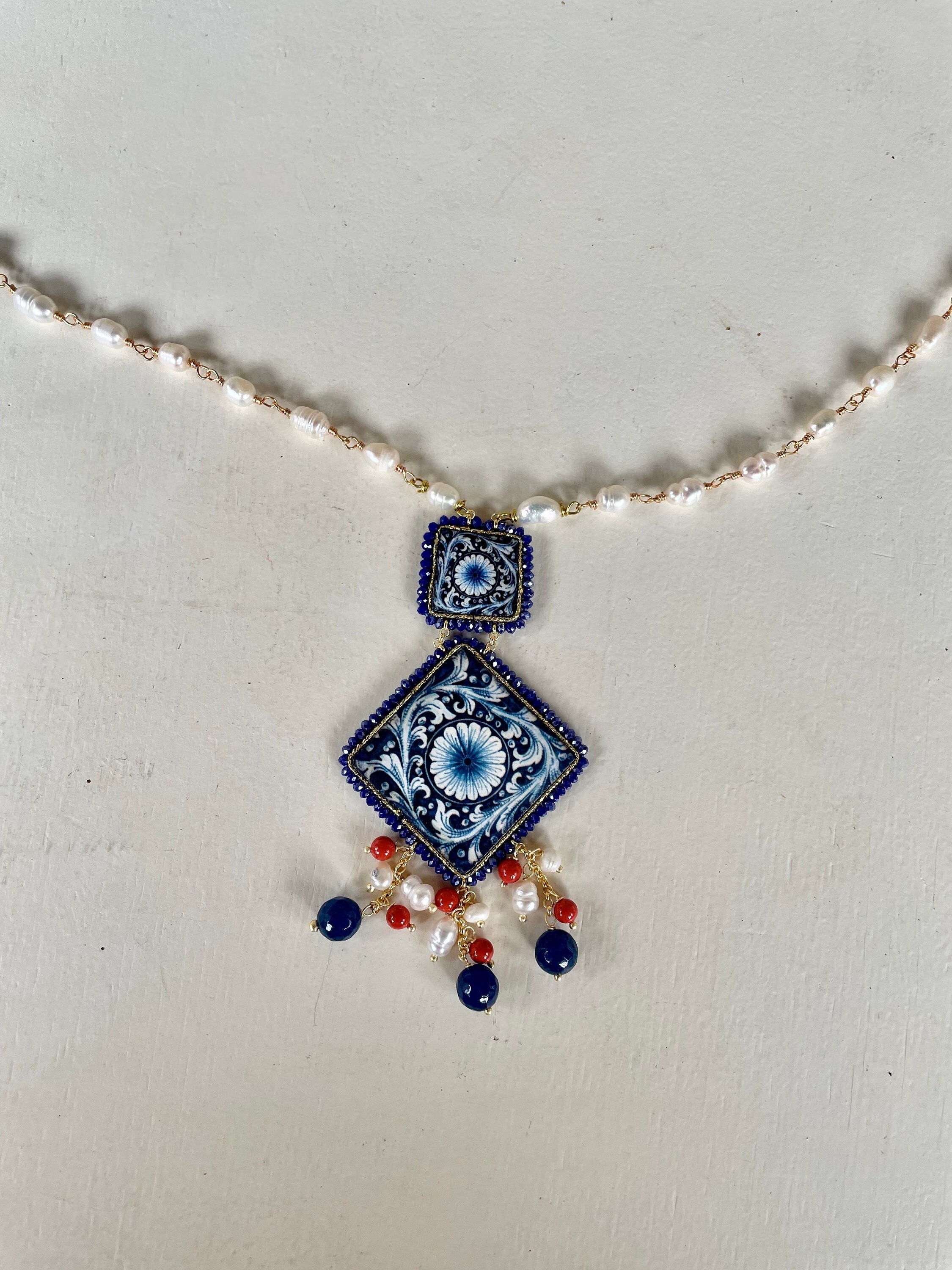 Realizzata con catena Rosario di perle di fiume e, pendente, un ciondolo di ceramica di Caltagirone.
