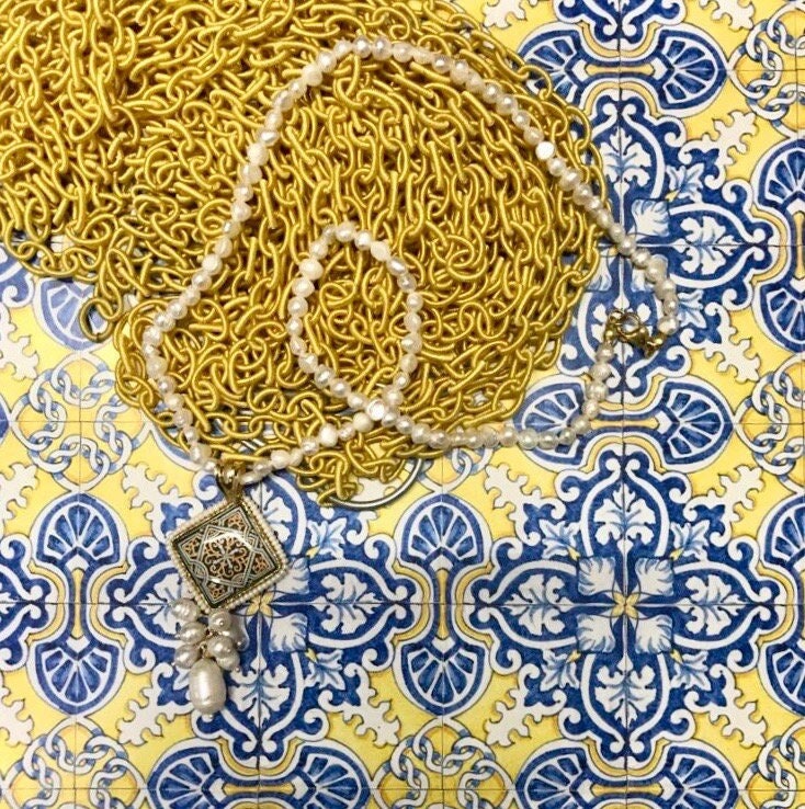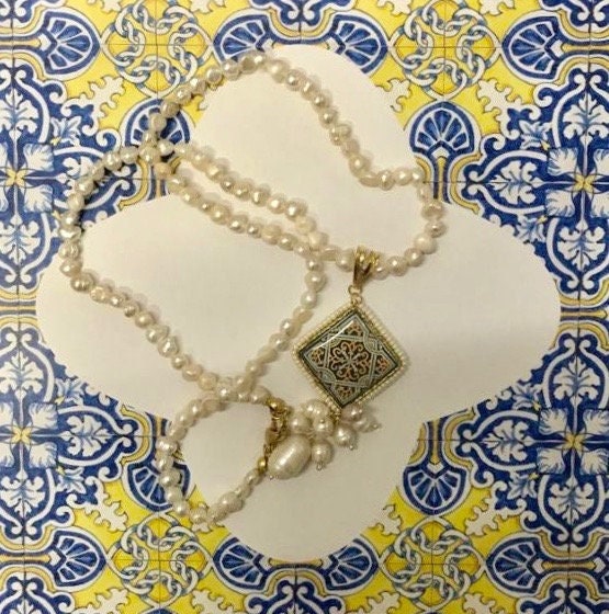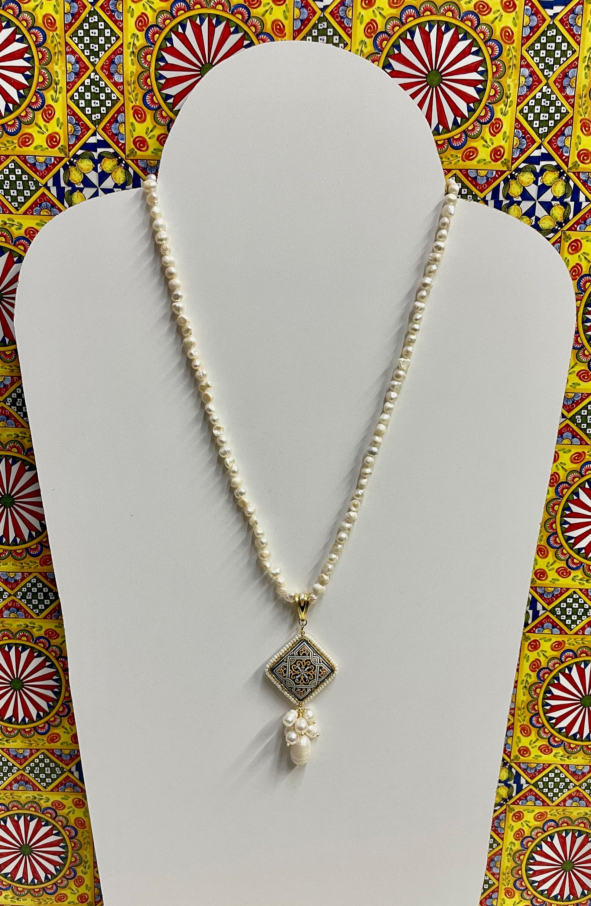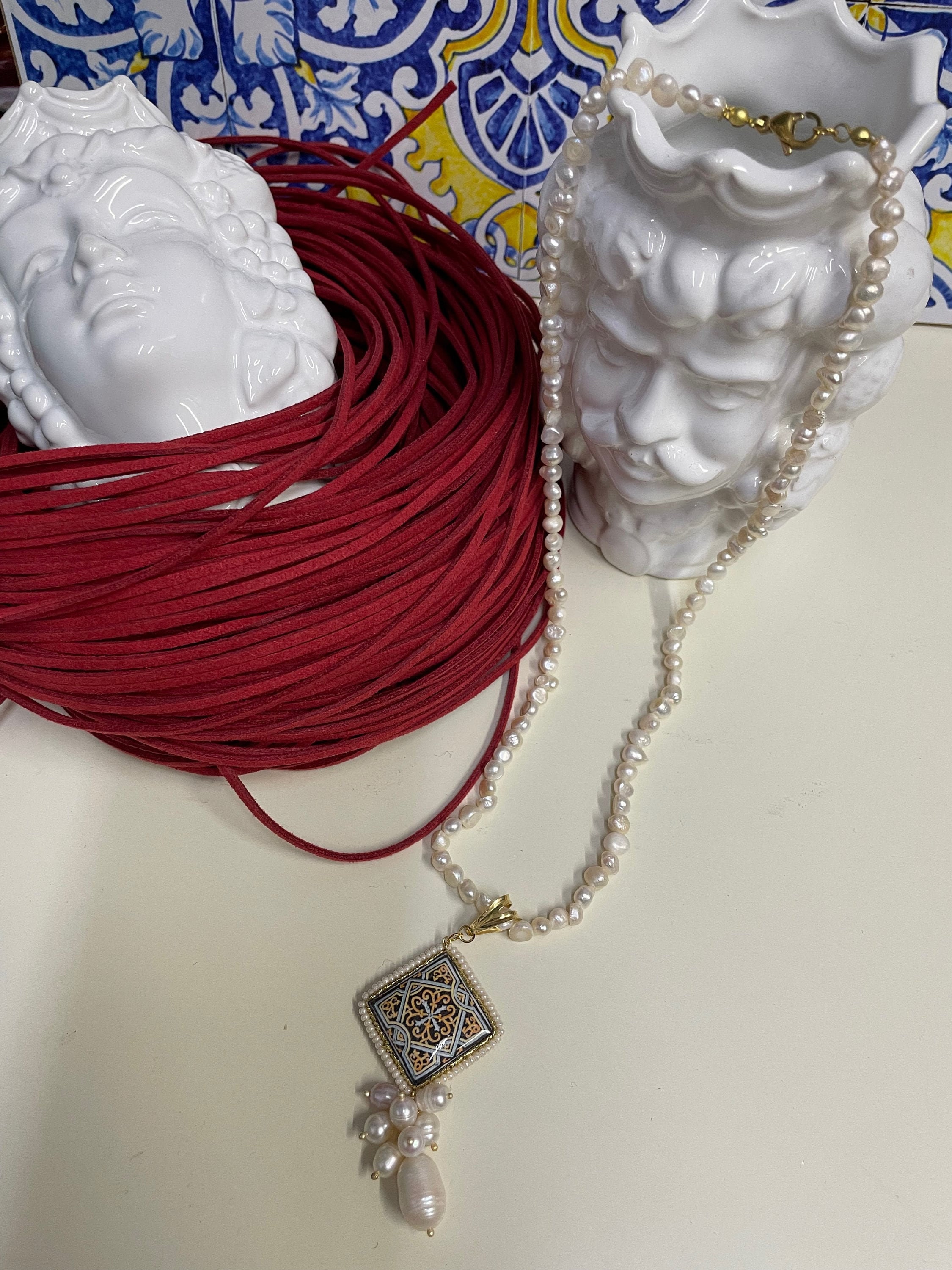 Collana dallo stile siciliano fatta a mano, realizzata con filo di perle di fiume.