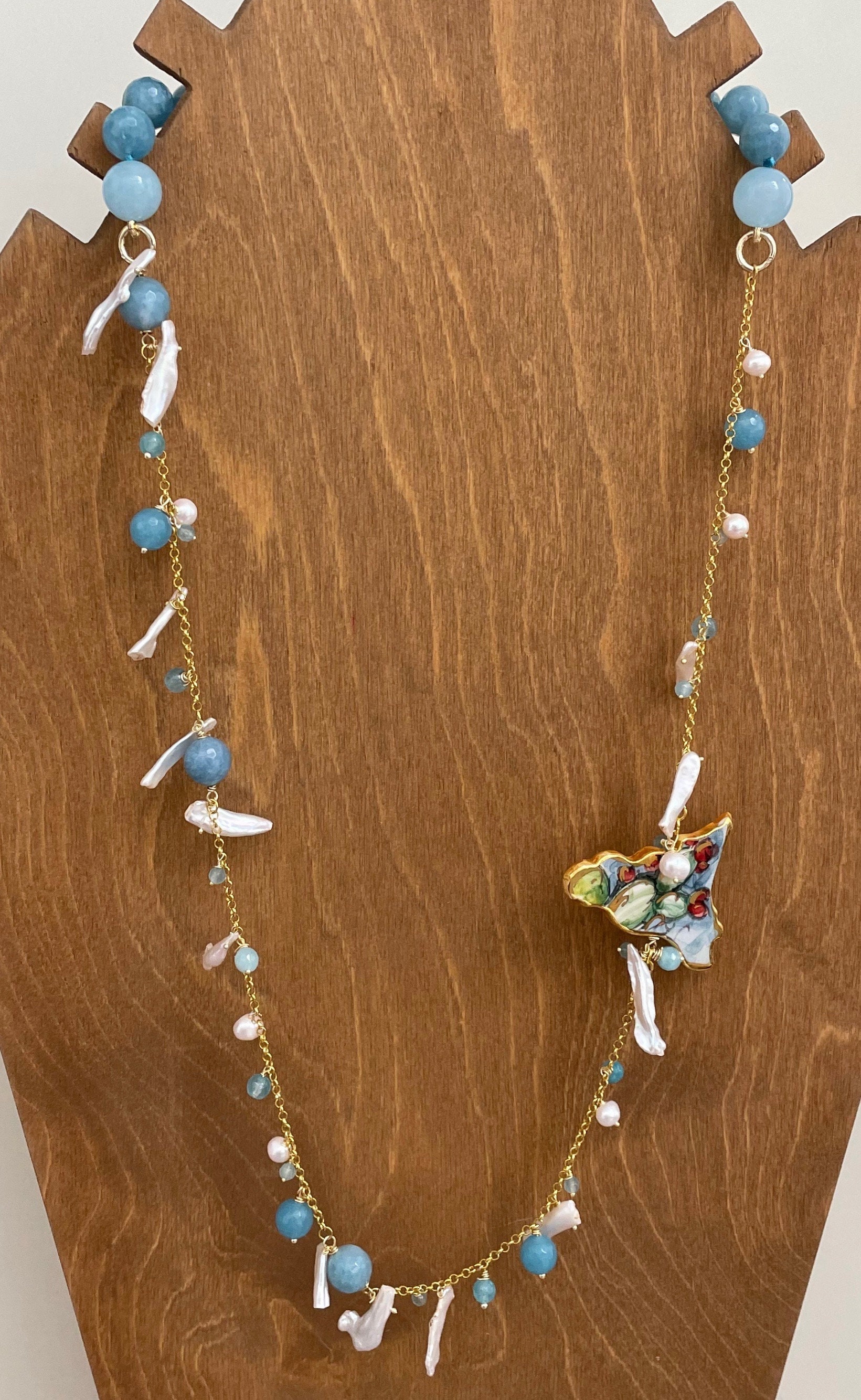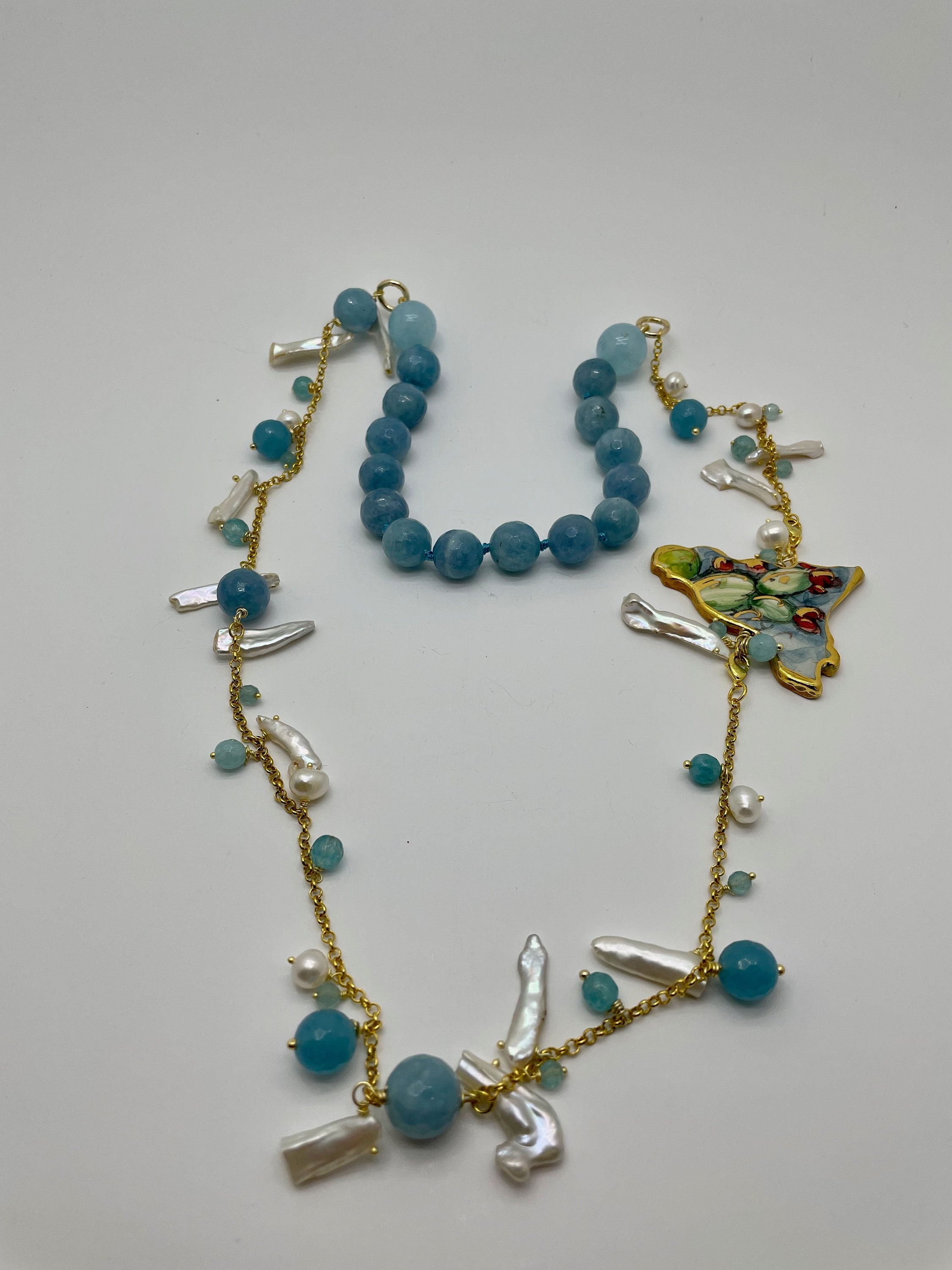 Realizzata con filo di perle sfaccettate di Angelite, singolarmente annodate, catena in acciaio inossidabile placcato oro, perle scaramazze oblunghe e perle di fiume.