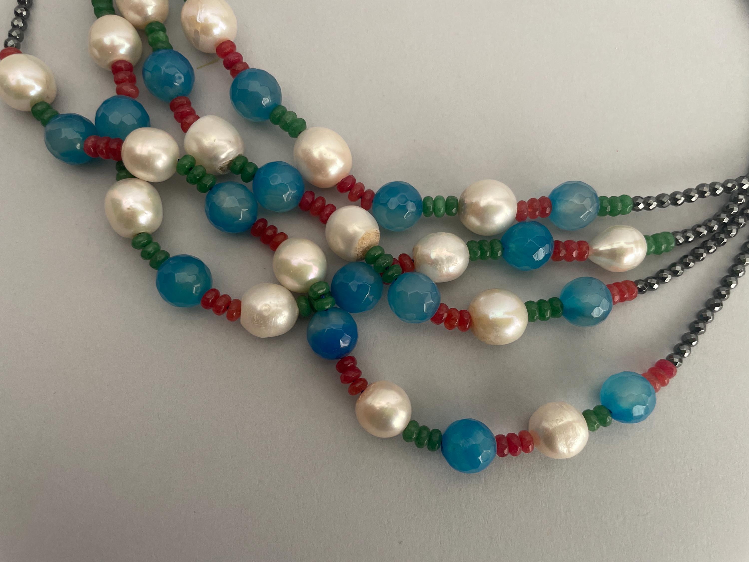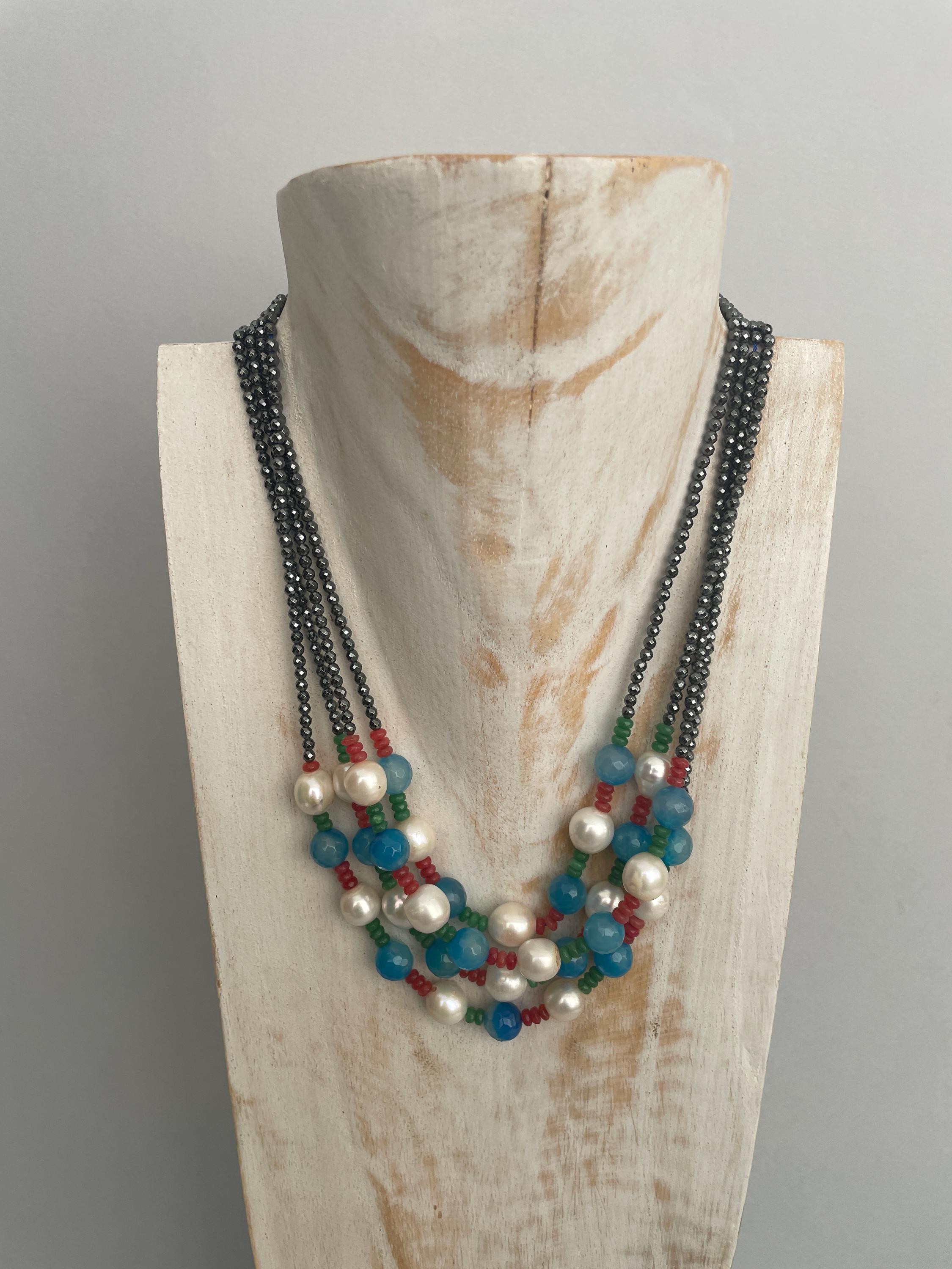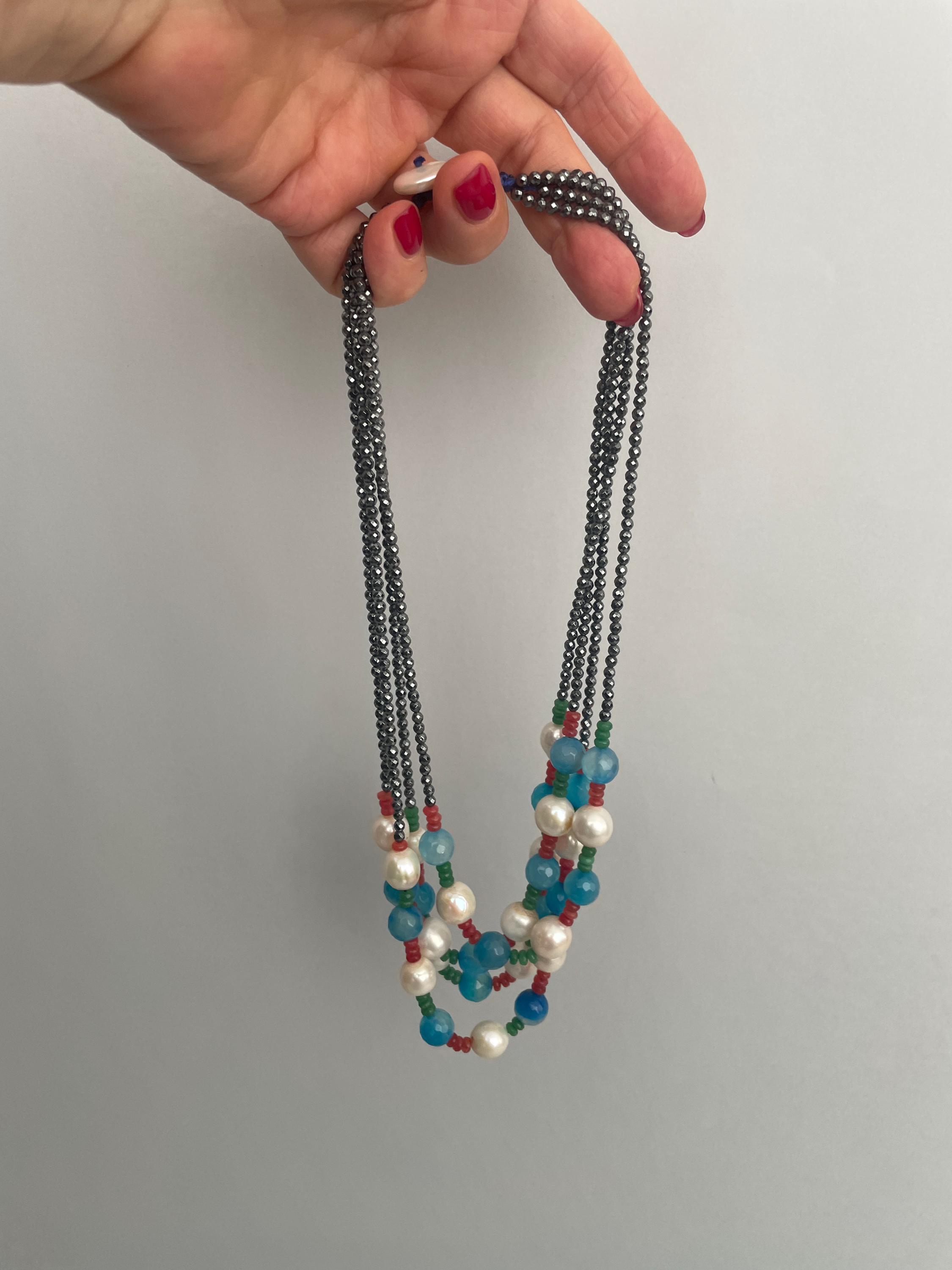 Collana multifilo con cristalli grigi nel sopragiro e perle assortite di Angelite e perle barocche nella parte inferiore.