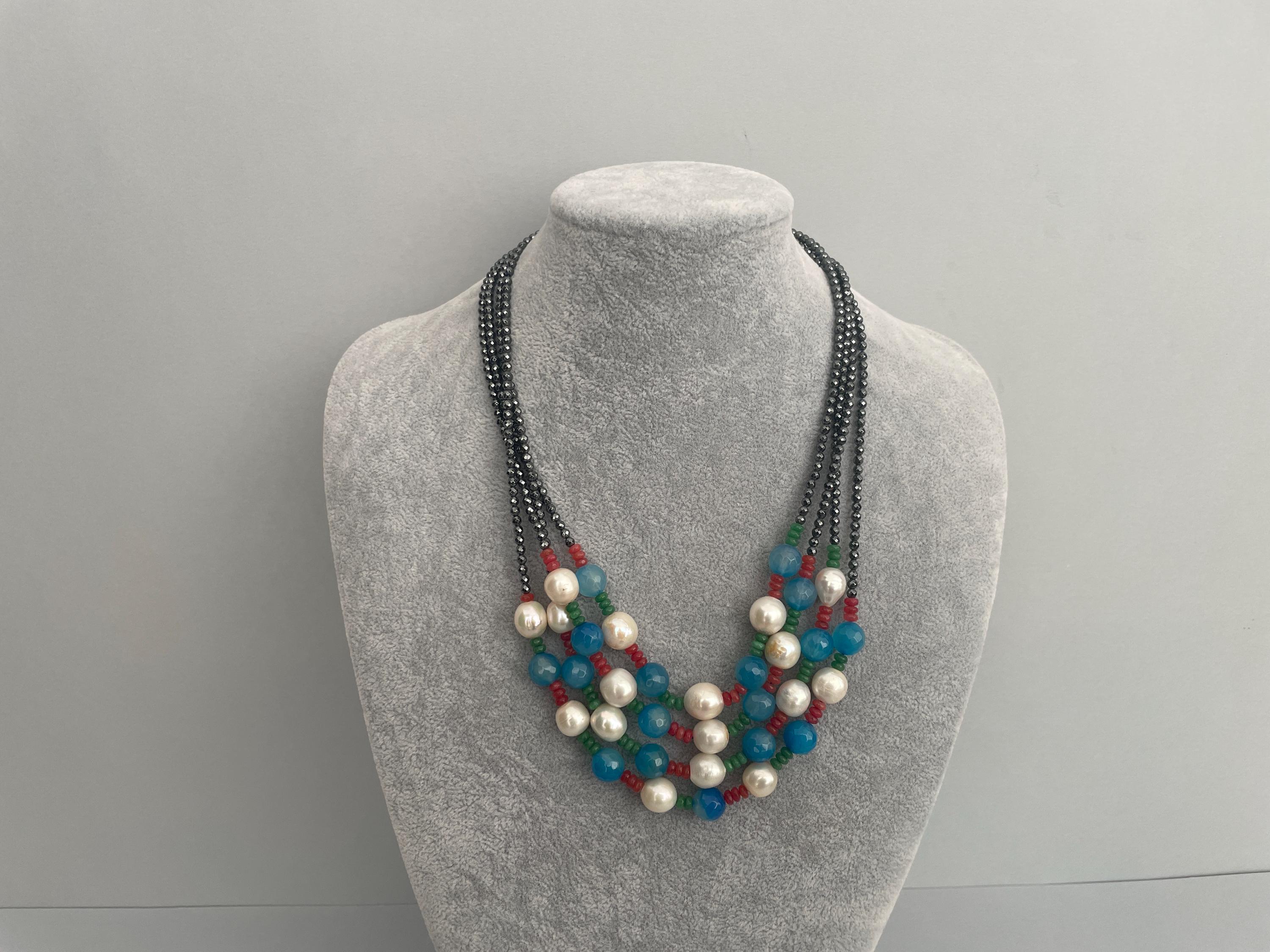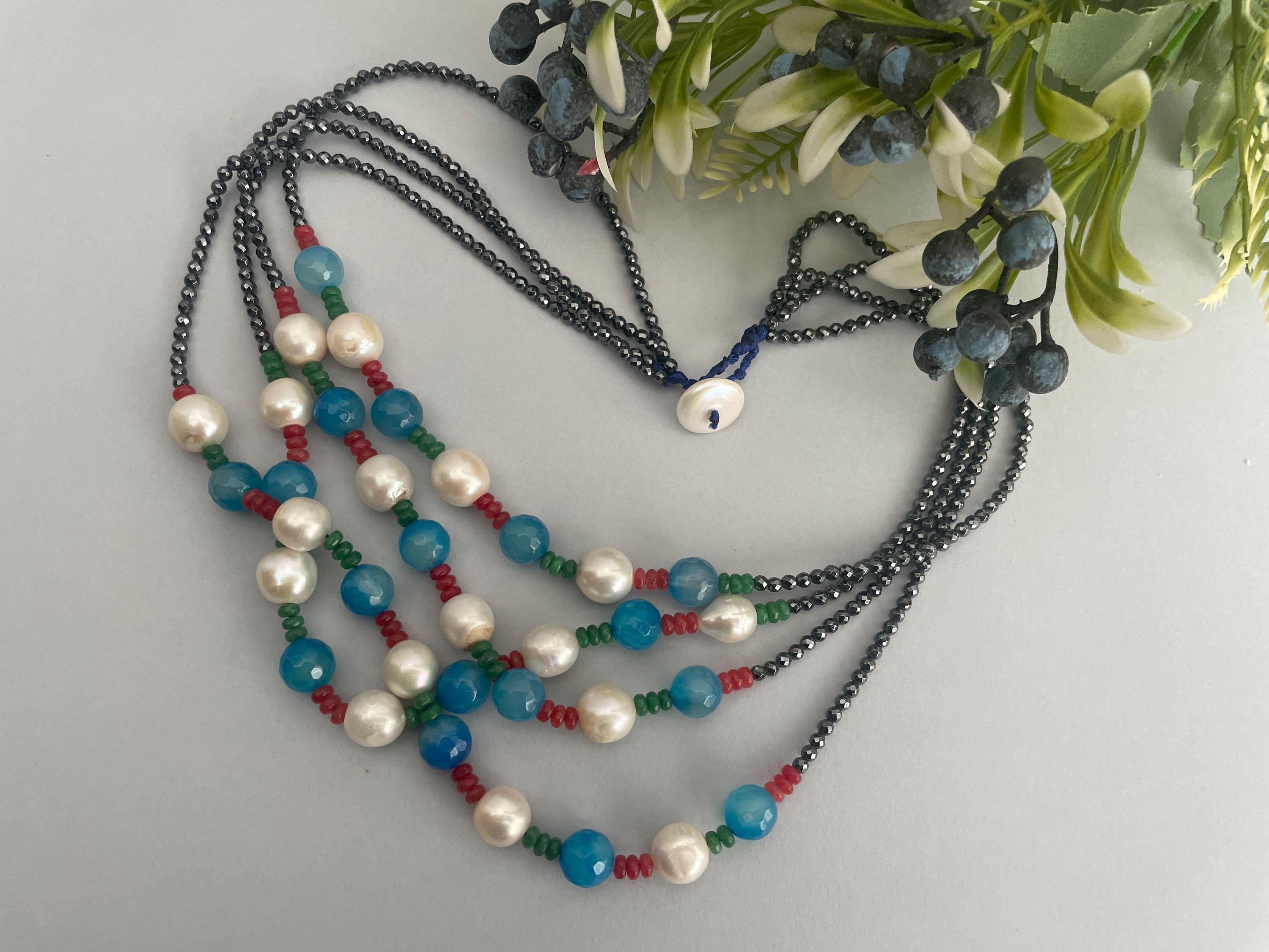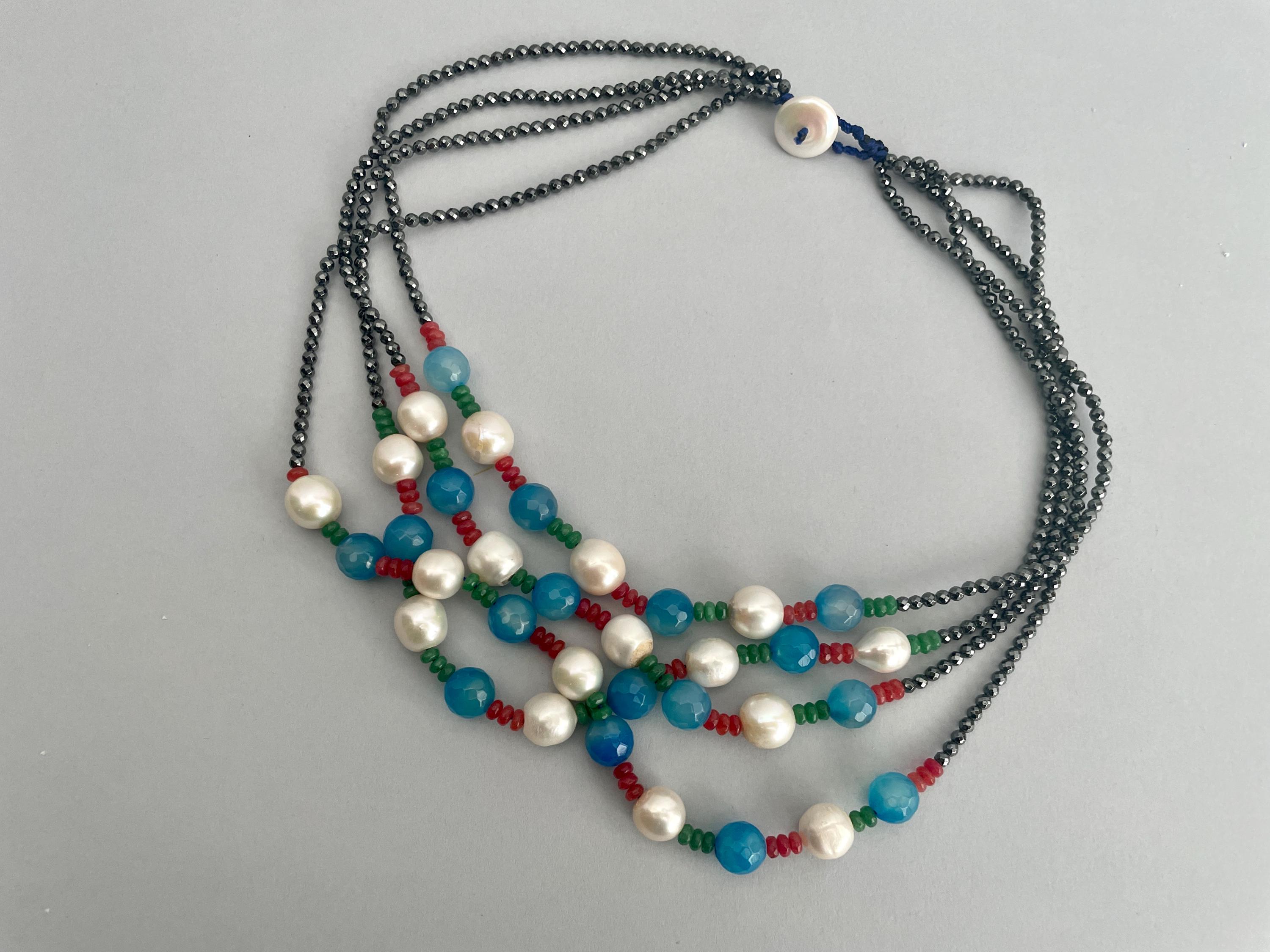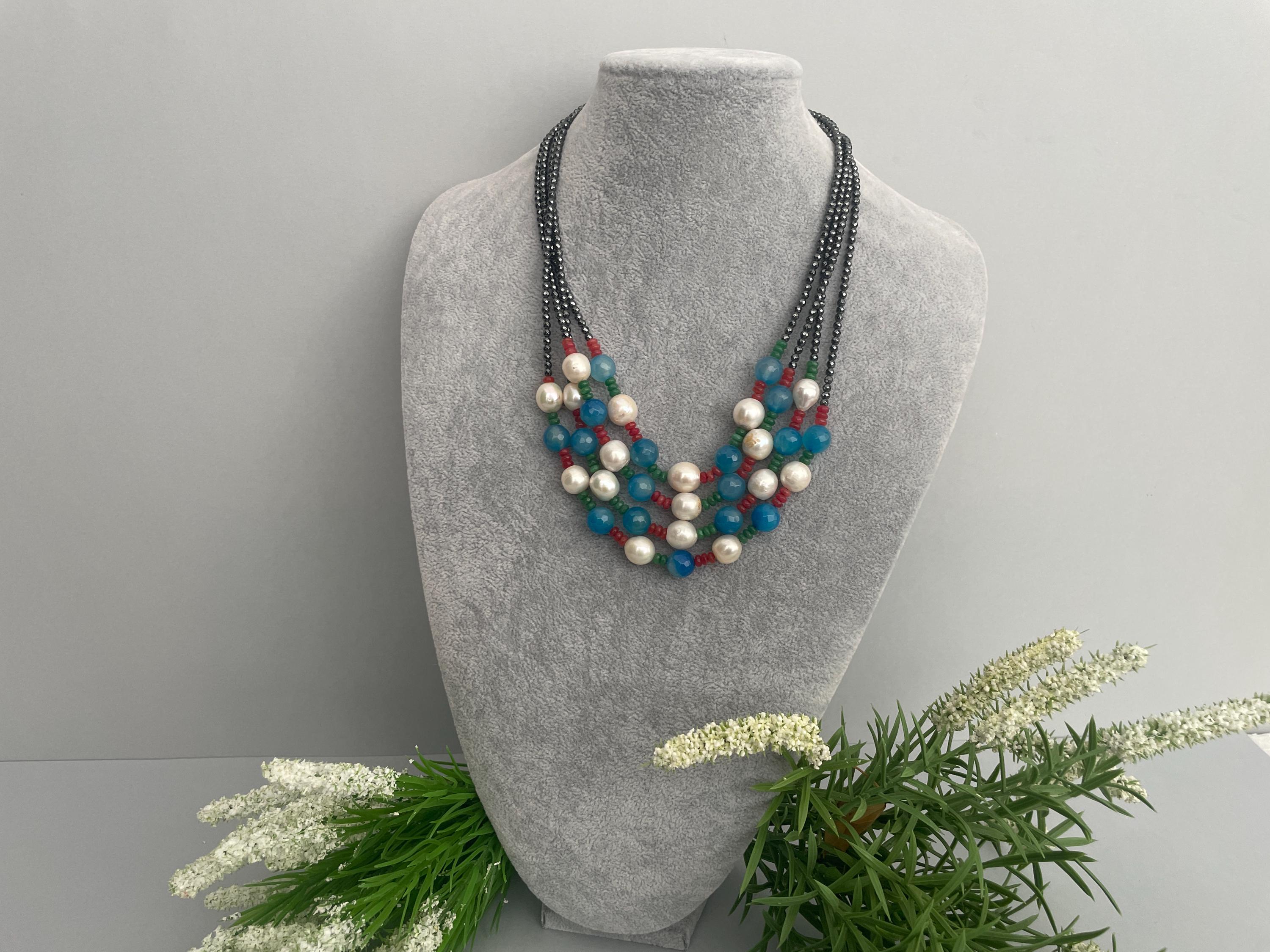 Collana multifilo con cristalli grigi nel sopragiro e perle assortite di Angelite e perle barocche nella parte inferiore.