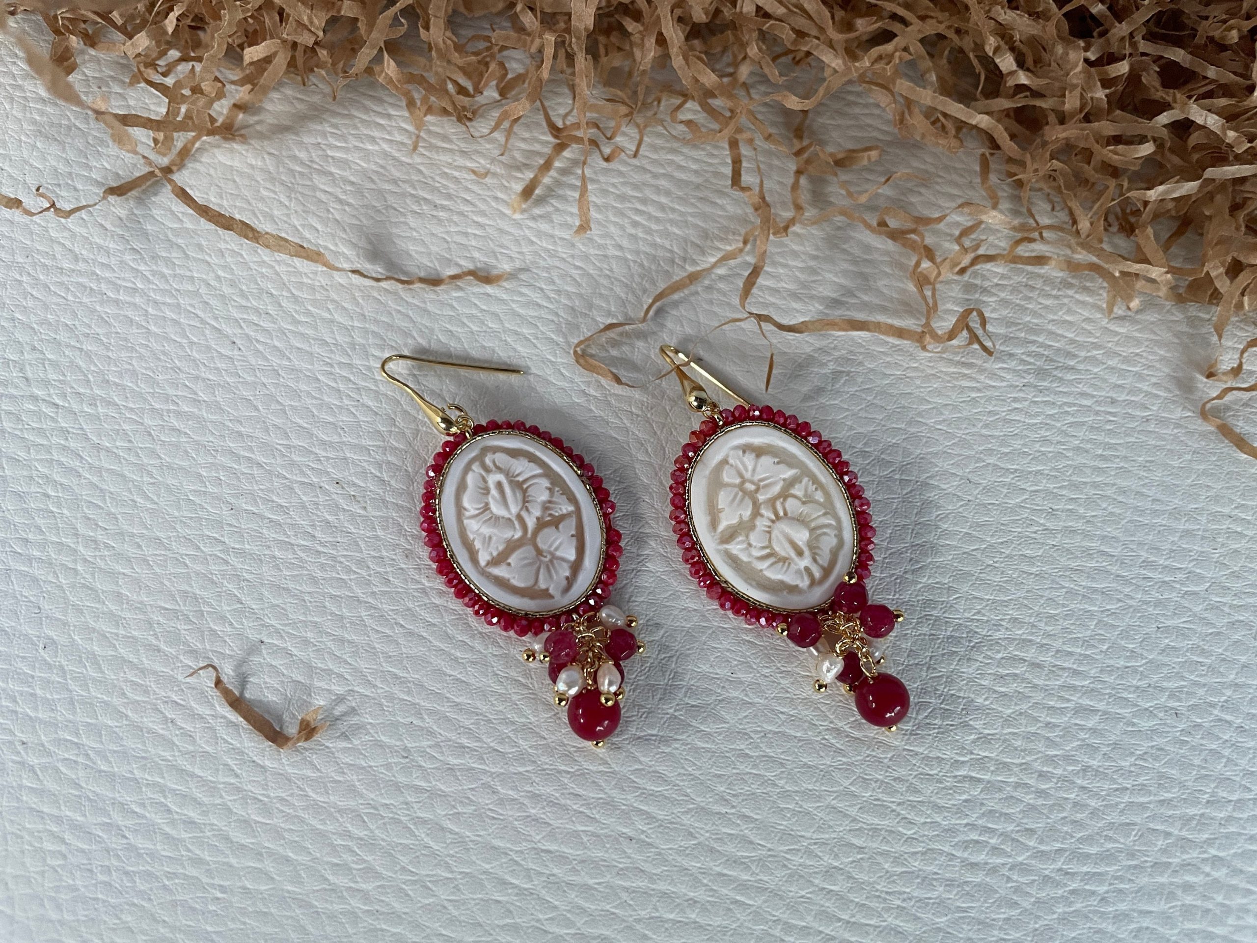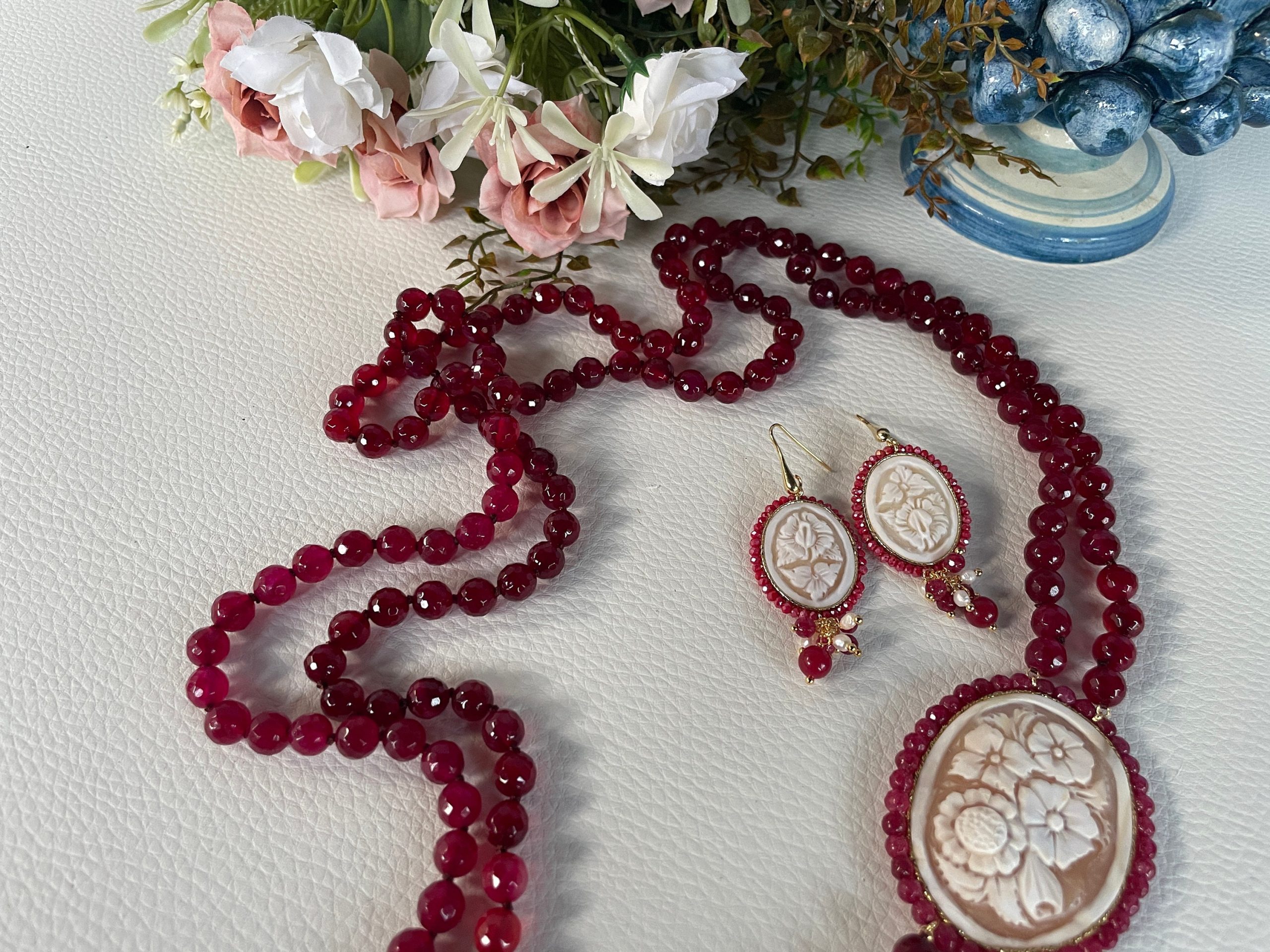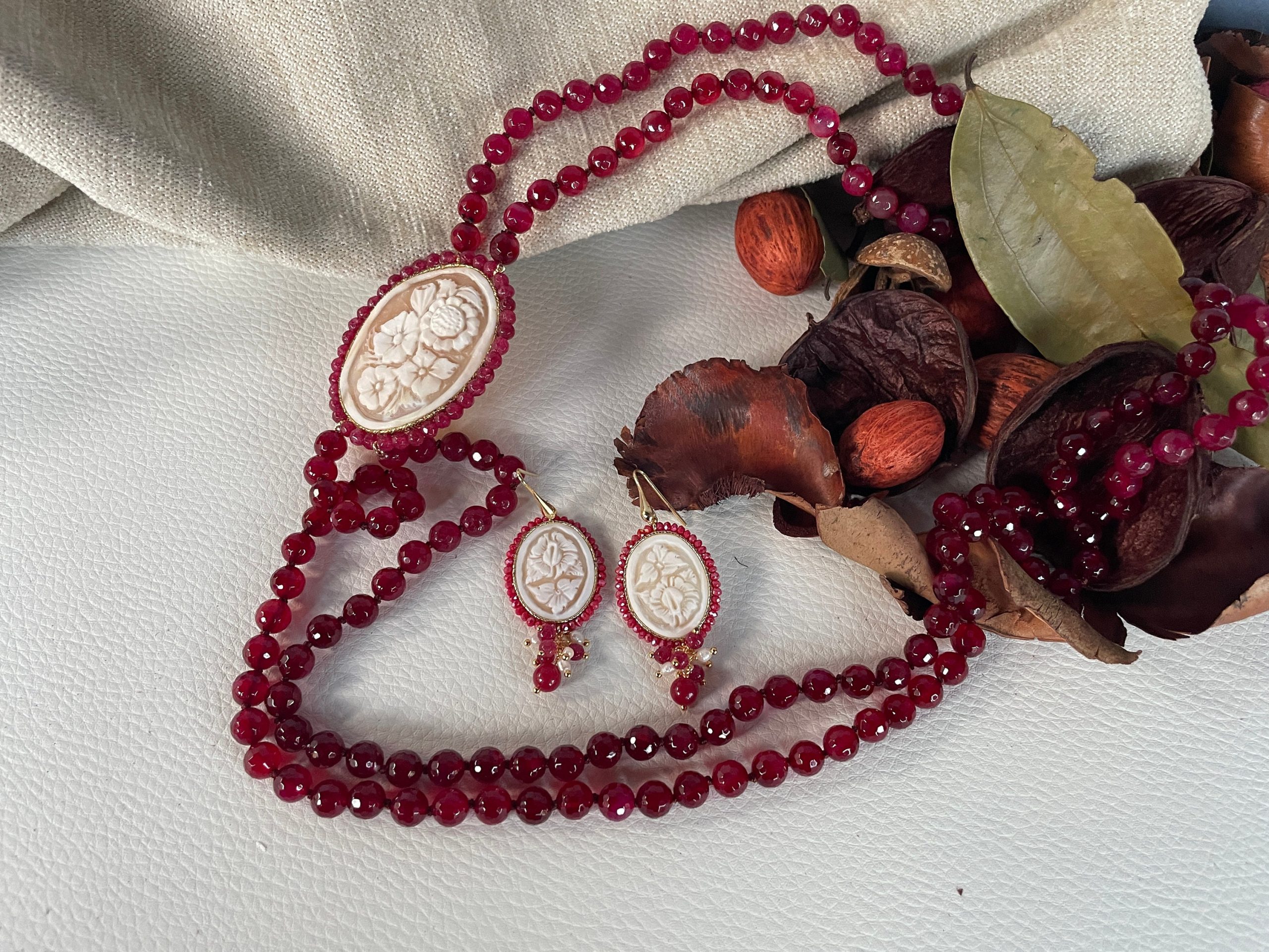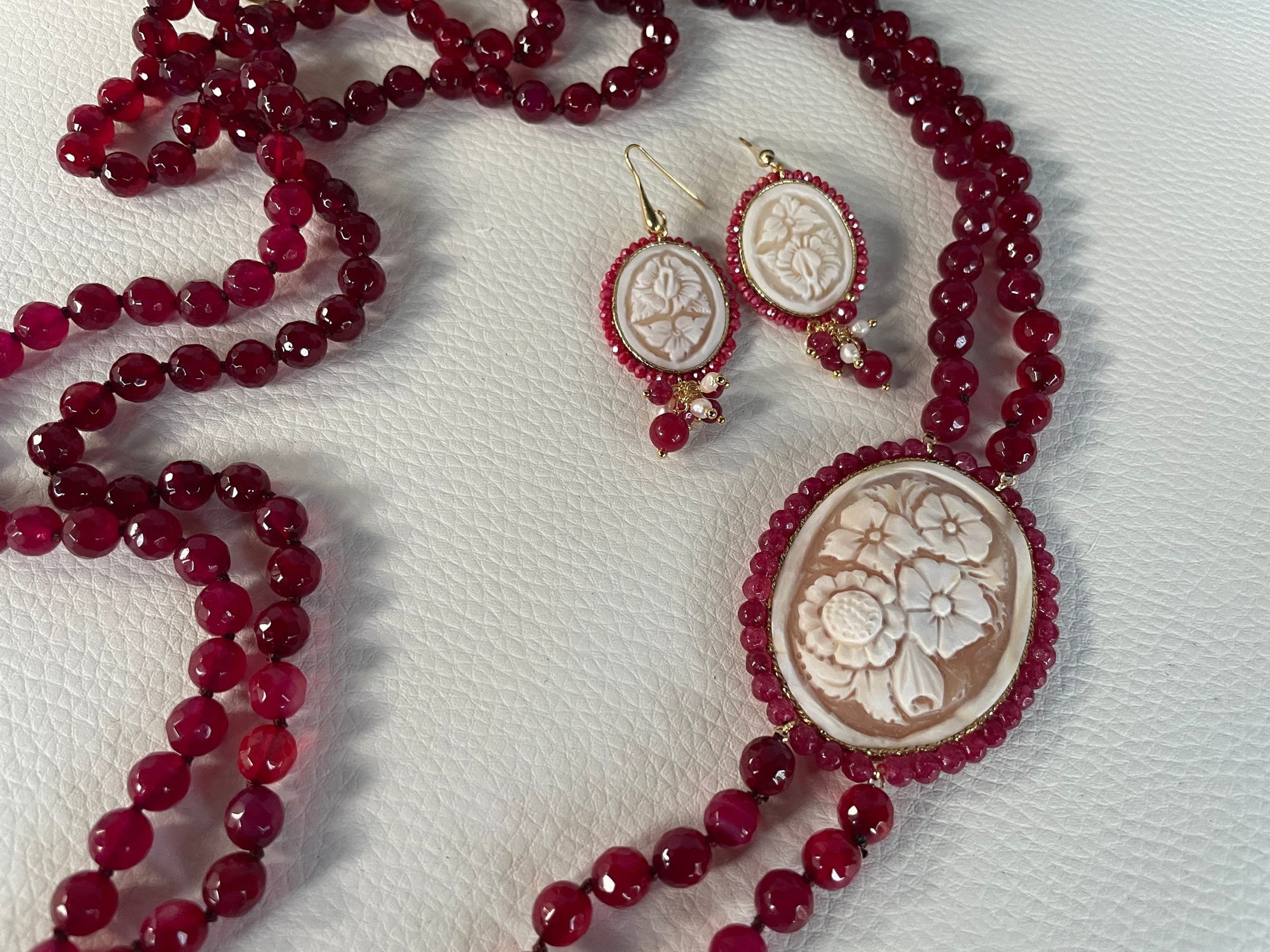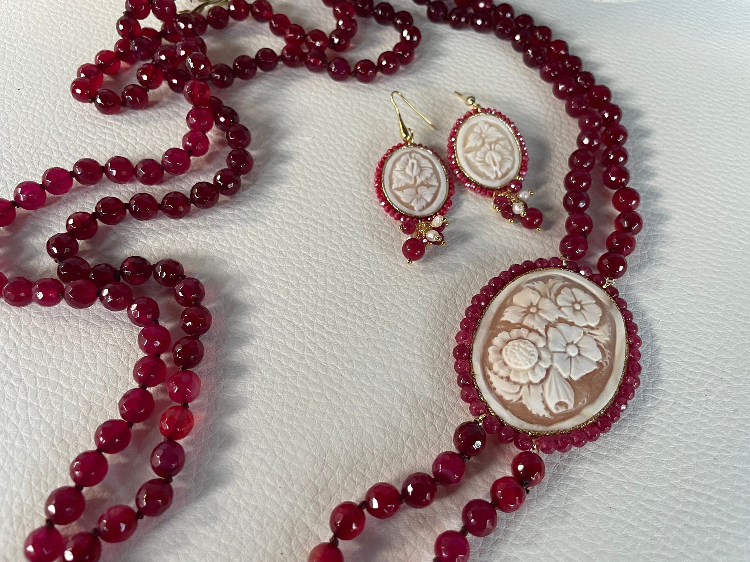Un prezioso Cammeo autentico di conchiglia sardonica di Torre del Greco, incorniciato da un filo di piccole perle di Giada Rossa, e a motivi floreali arricchisce la collana.
