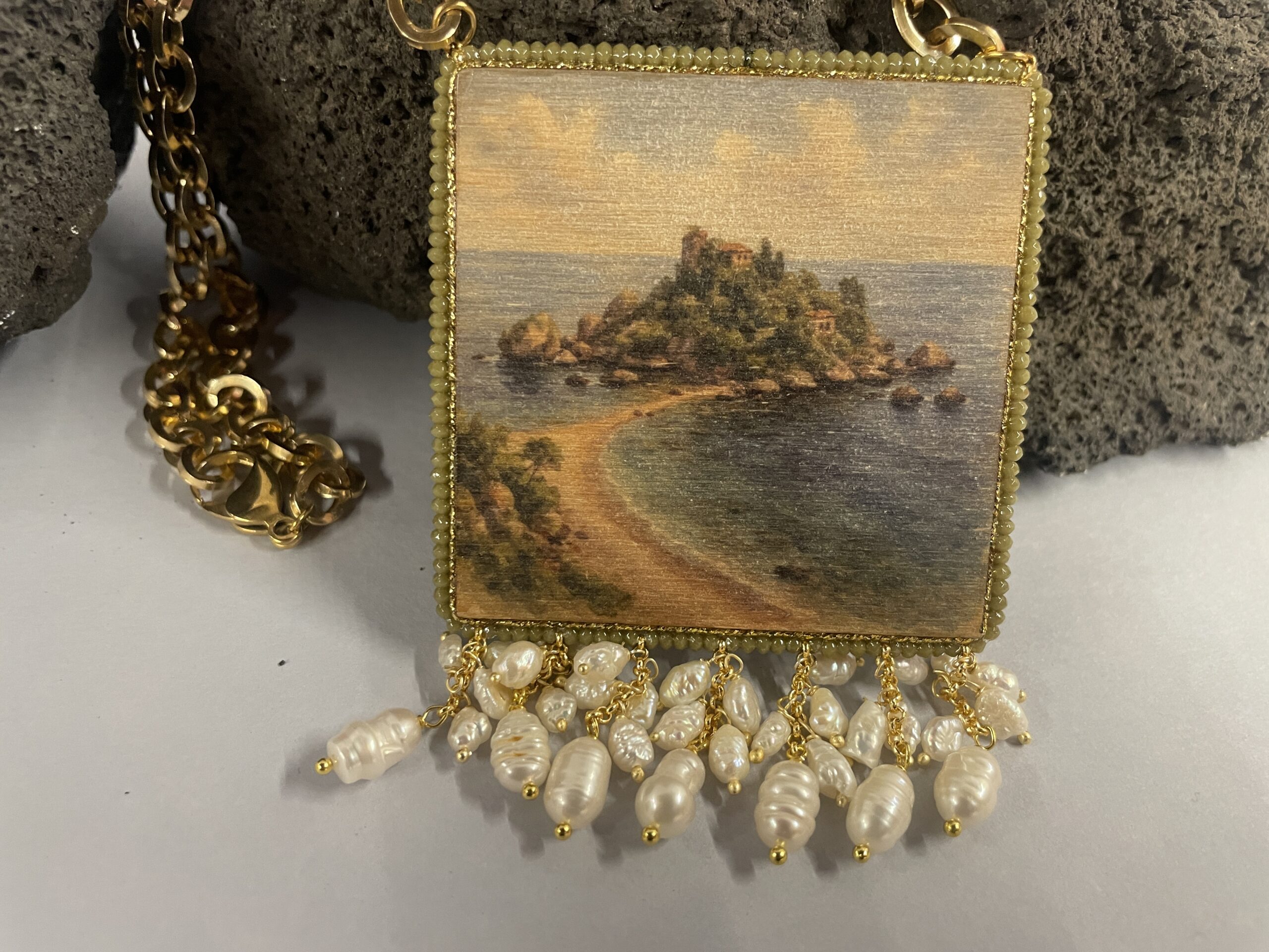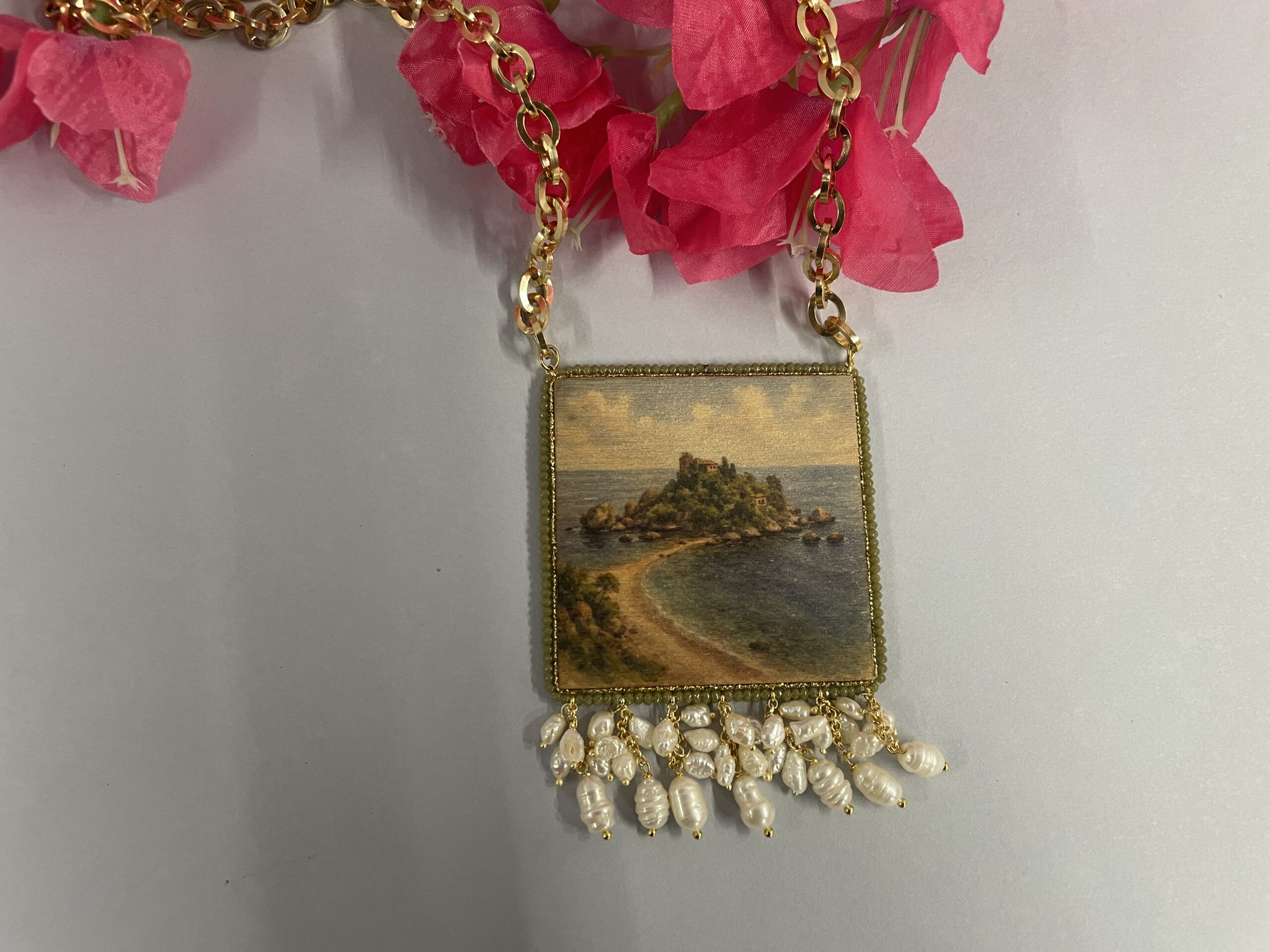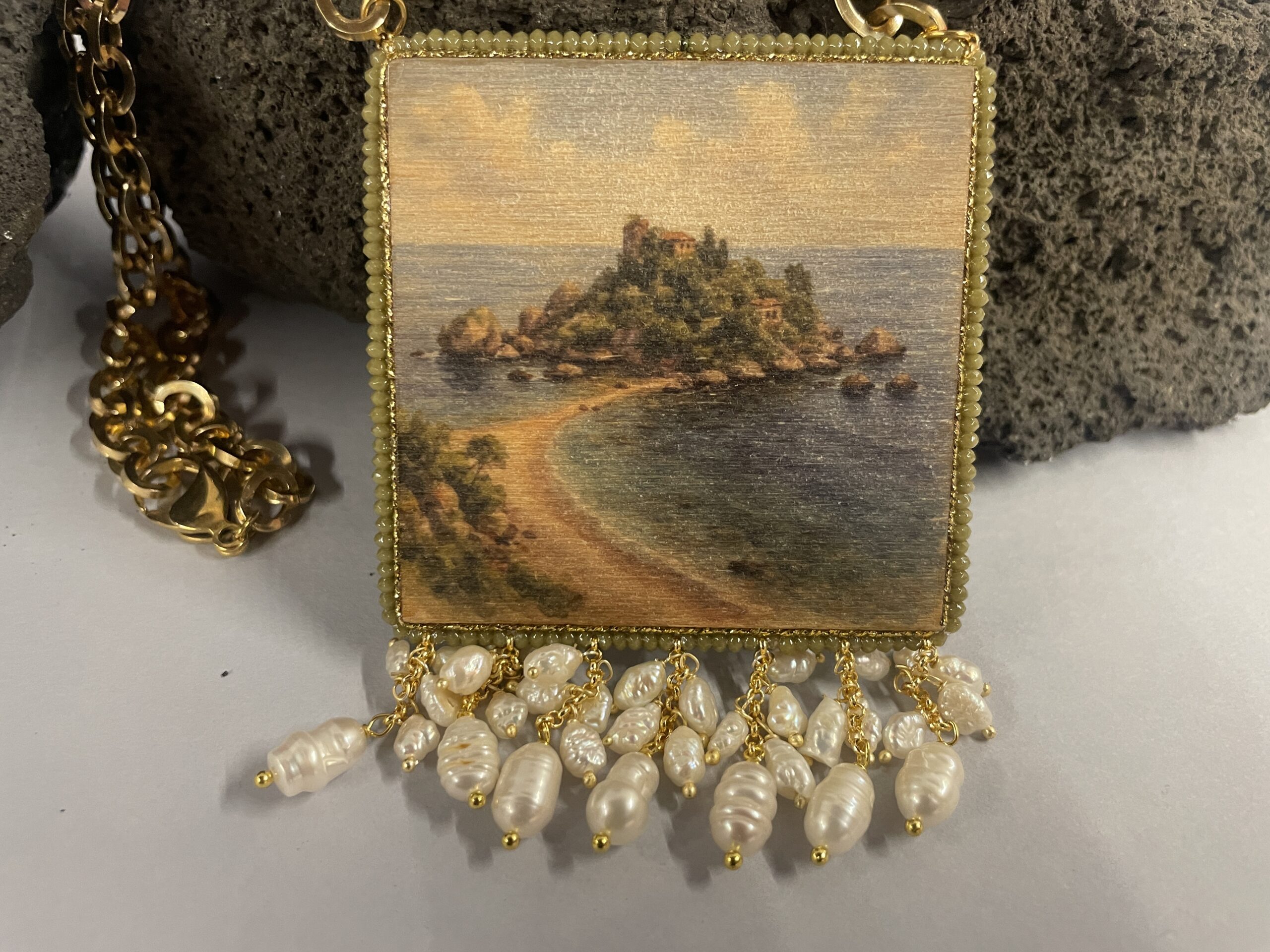 La collana siciliana artigianale “Vedute di Sicilia” è ispirata alla splendida Isola Bella di Taormina, uno dei paesaggi più iconici e amati della Sicilia. Un gioiello che racchiude il fascino del mare, della luce e della natura mediterranea.