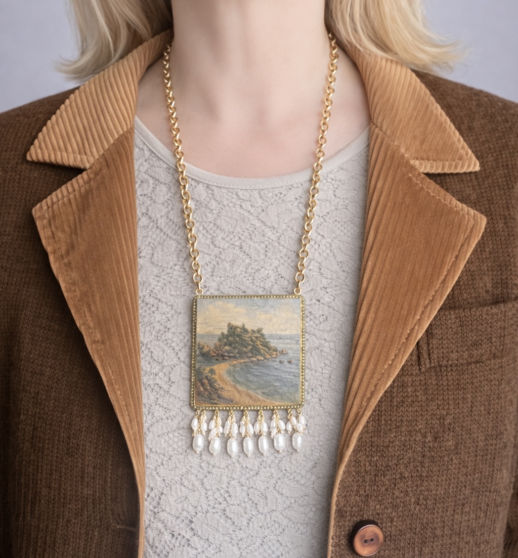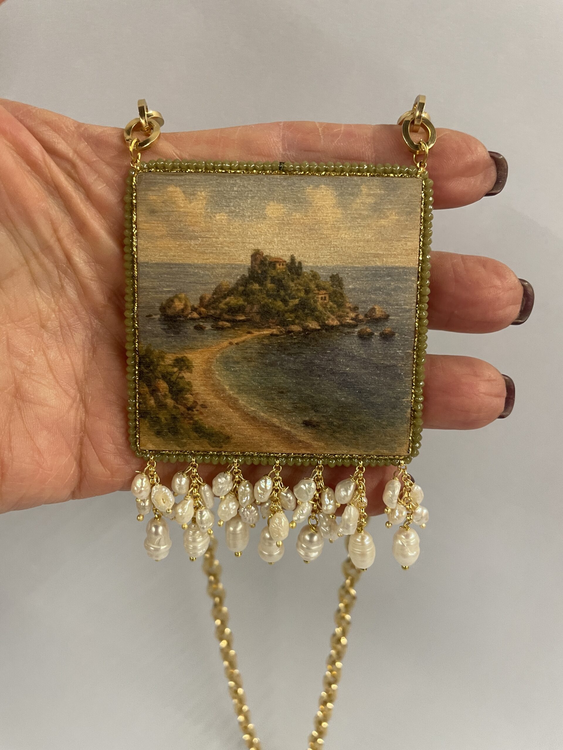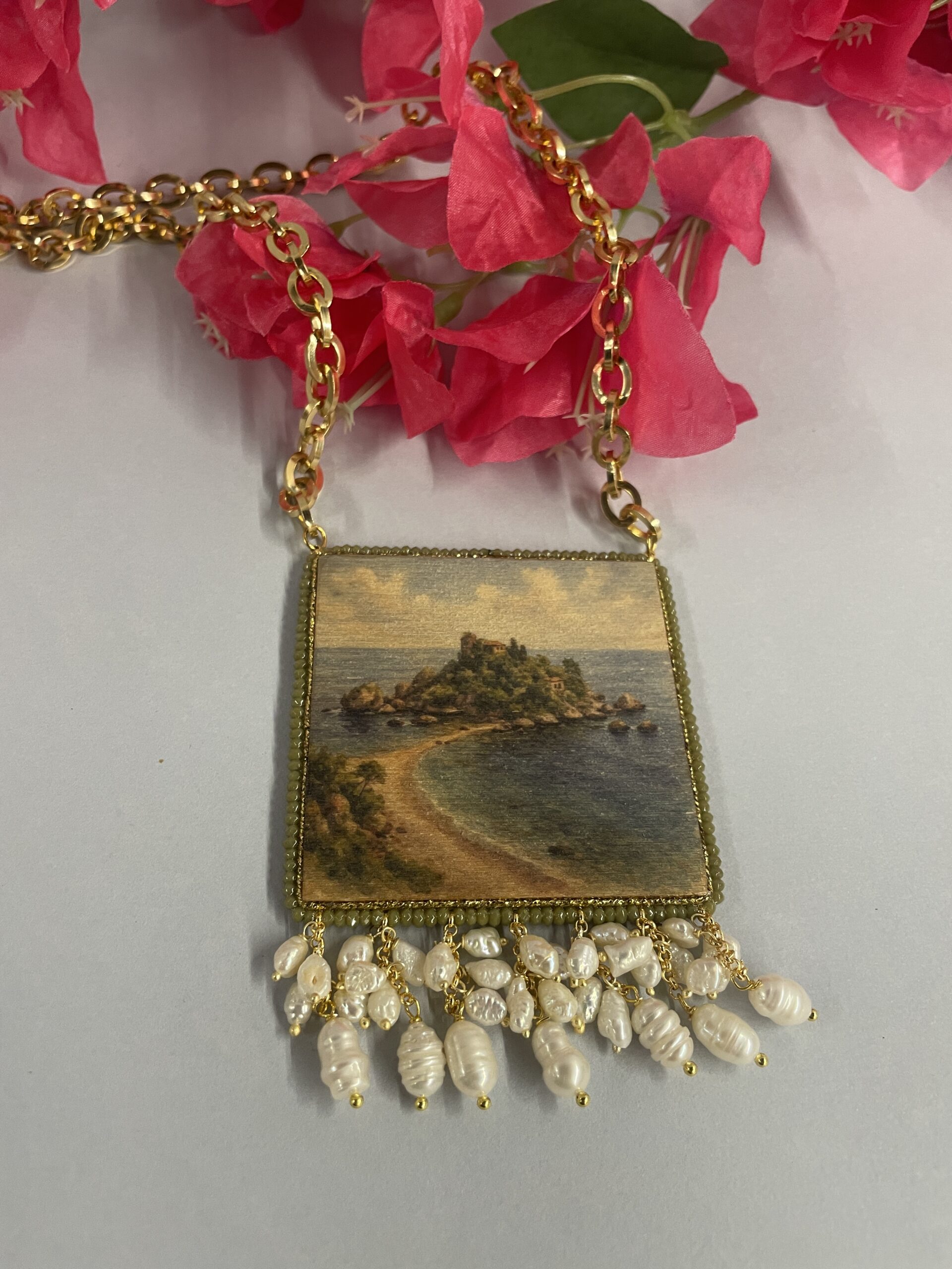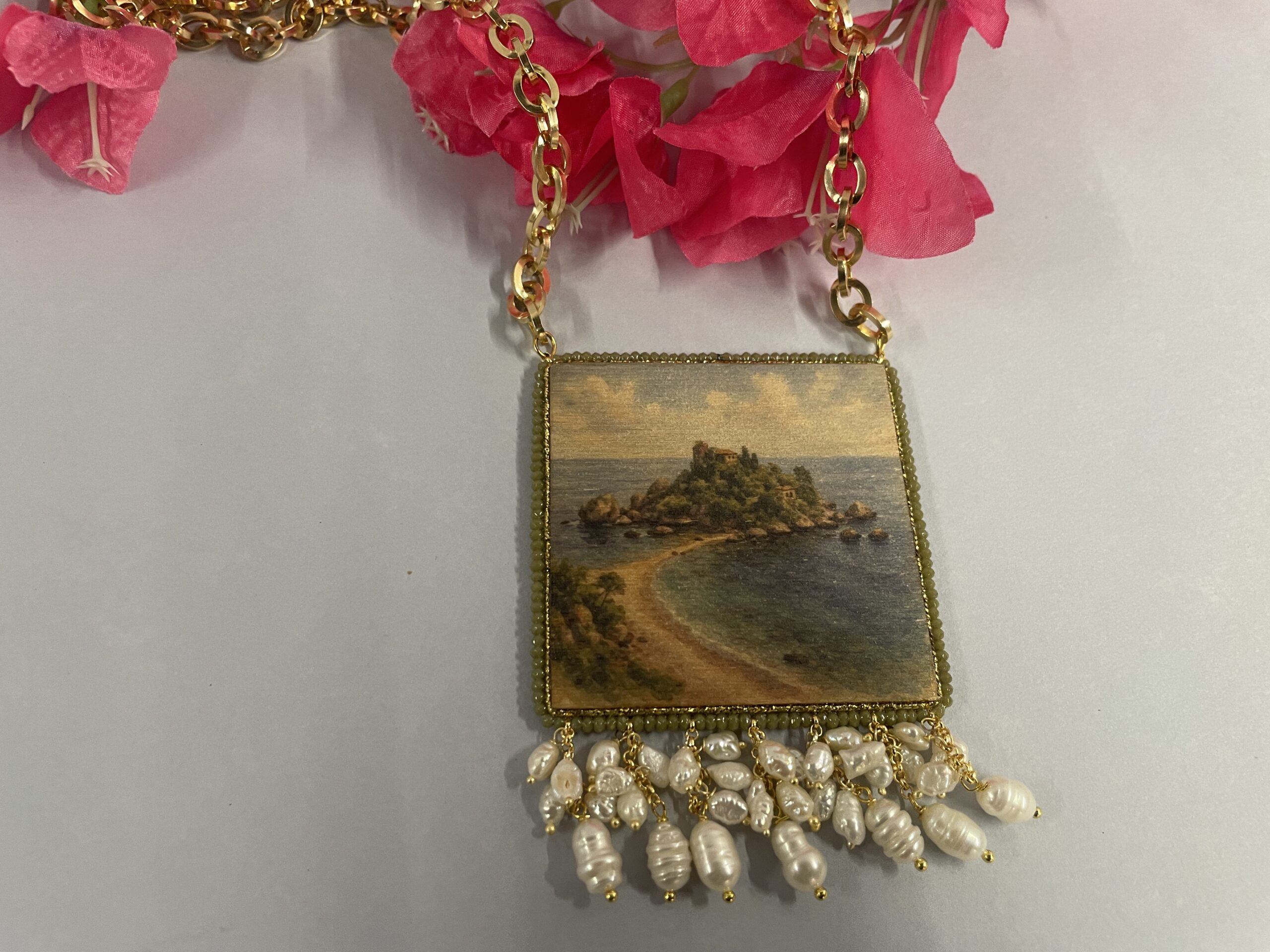 La collana siciliana artigianale “Vedute di Sicilia” è ispirata alla splendida Isola Bella di Taormina, uno dei paesaggi più iconici e amati della Sicilia. Un gioiello che racchiude il fascino del mare, della luce e della natura mediterranea.