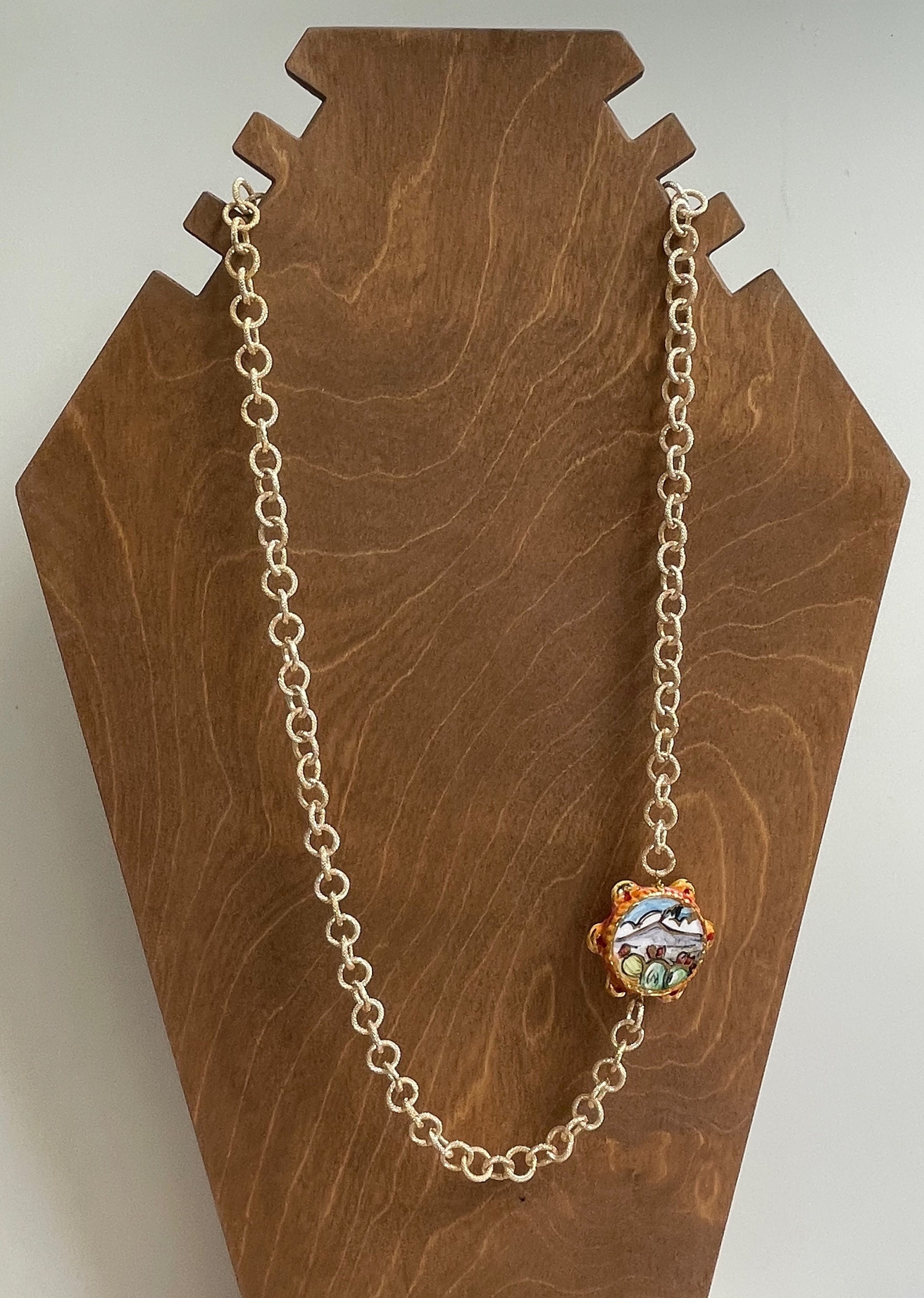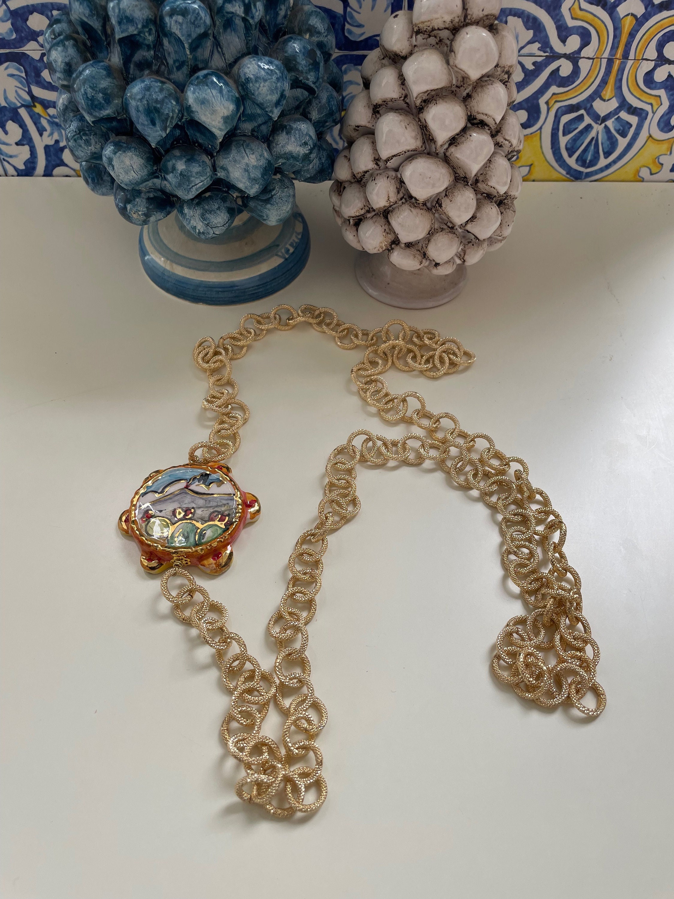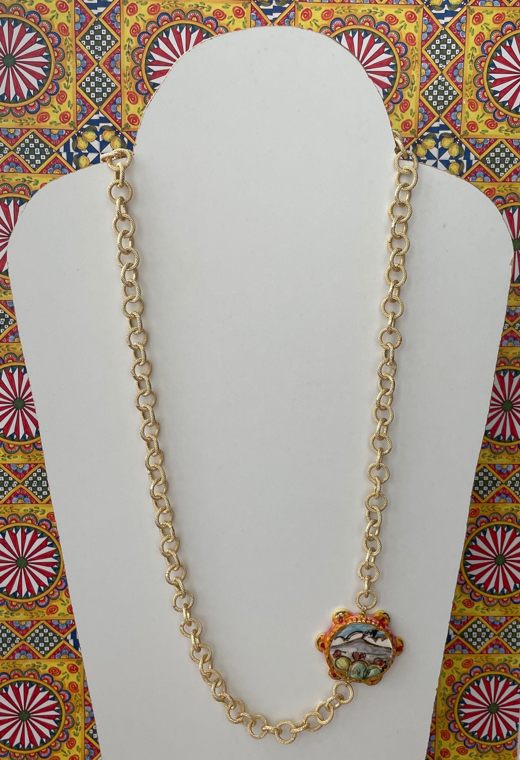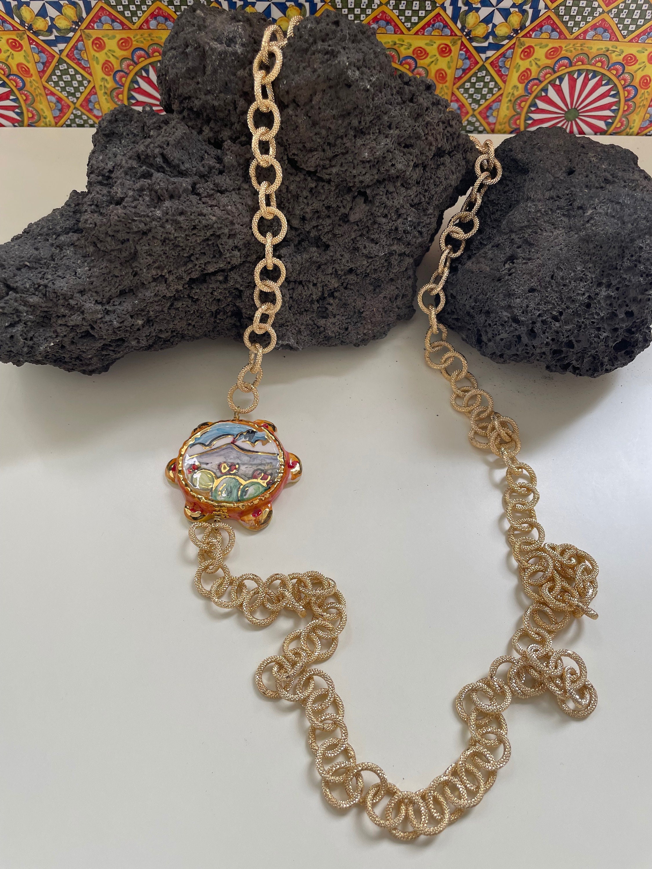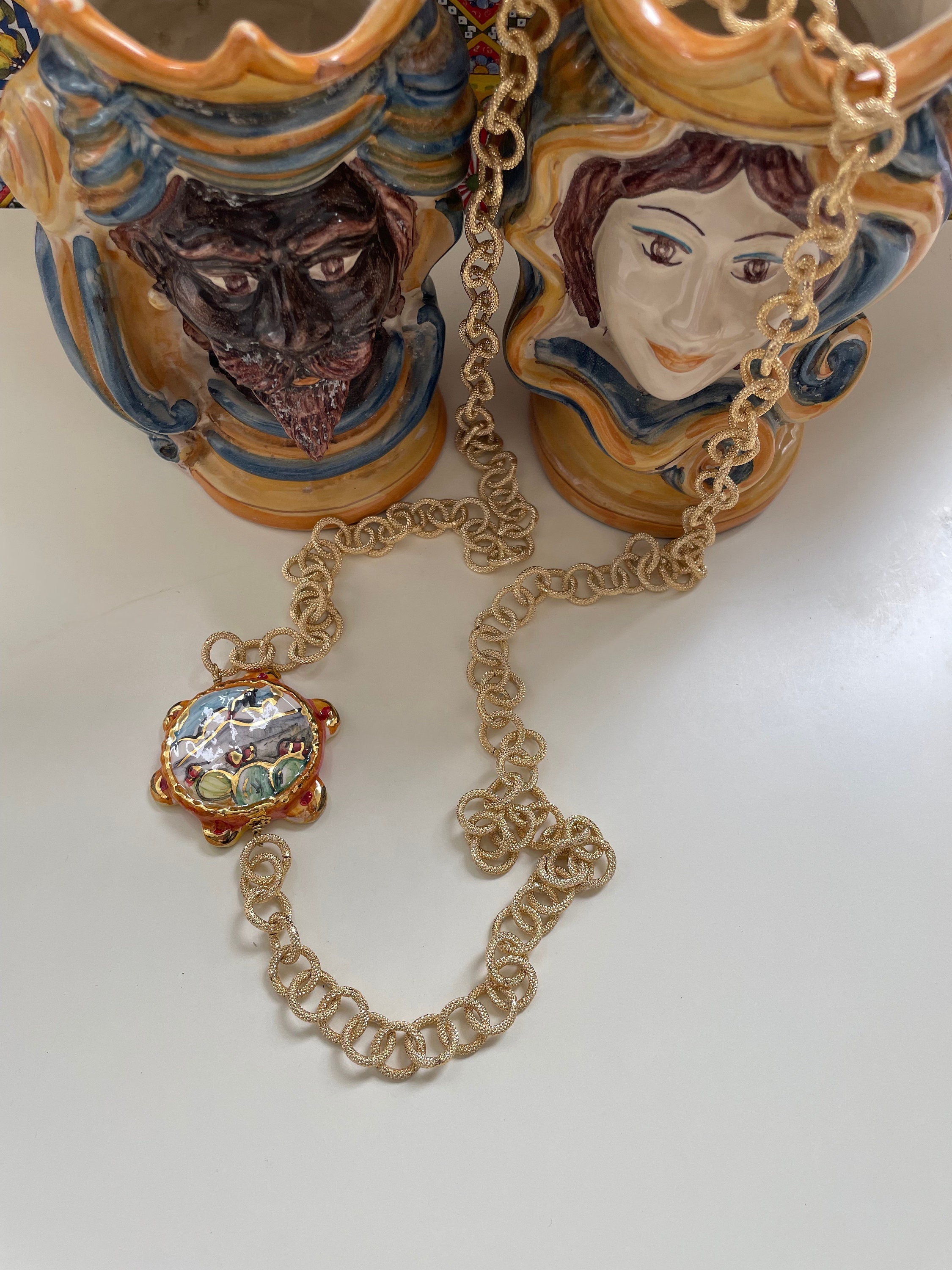 Collana siciliana con catena a maglia larga e caratteristico connettore di Ceramica di Caltagirone a forma di Tamburello interamente dipinto a mano.